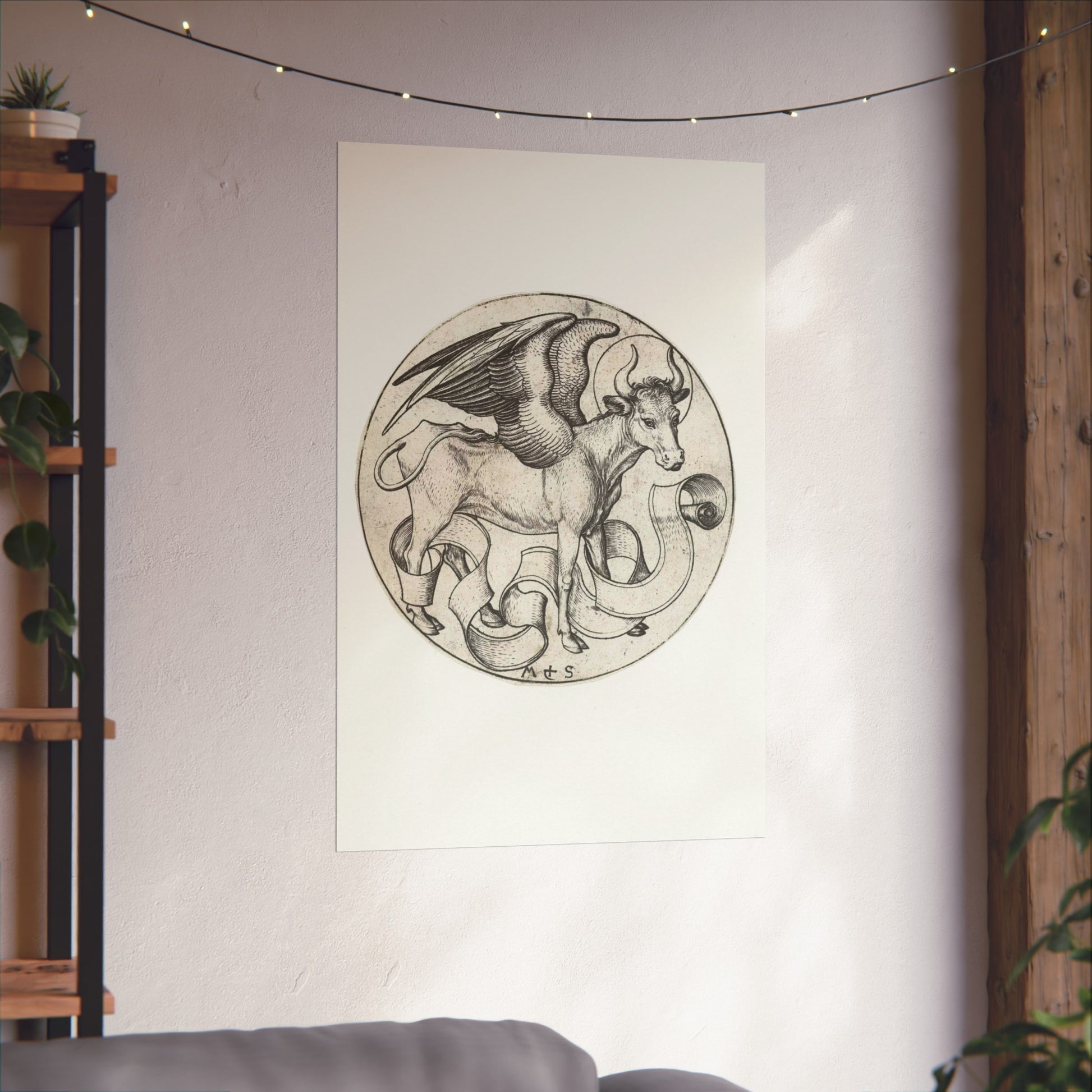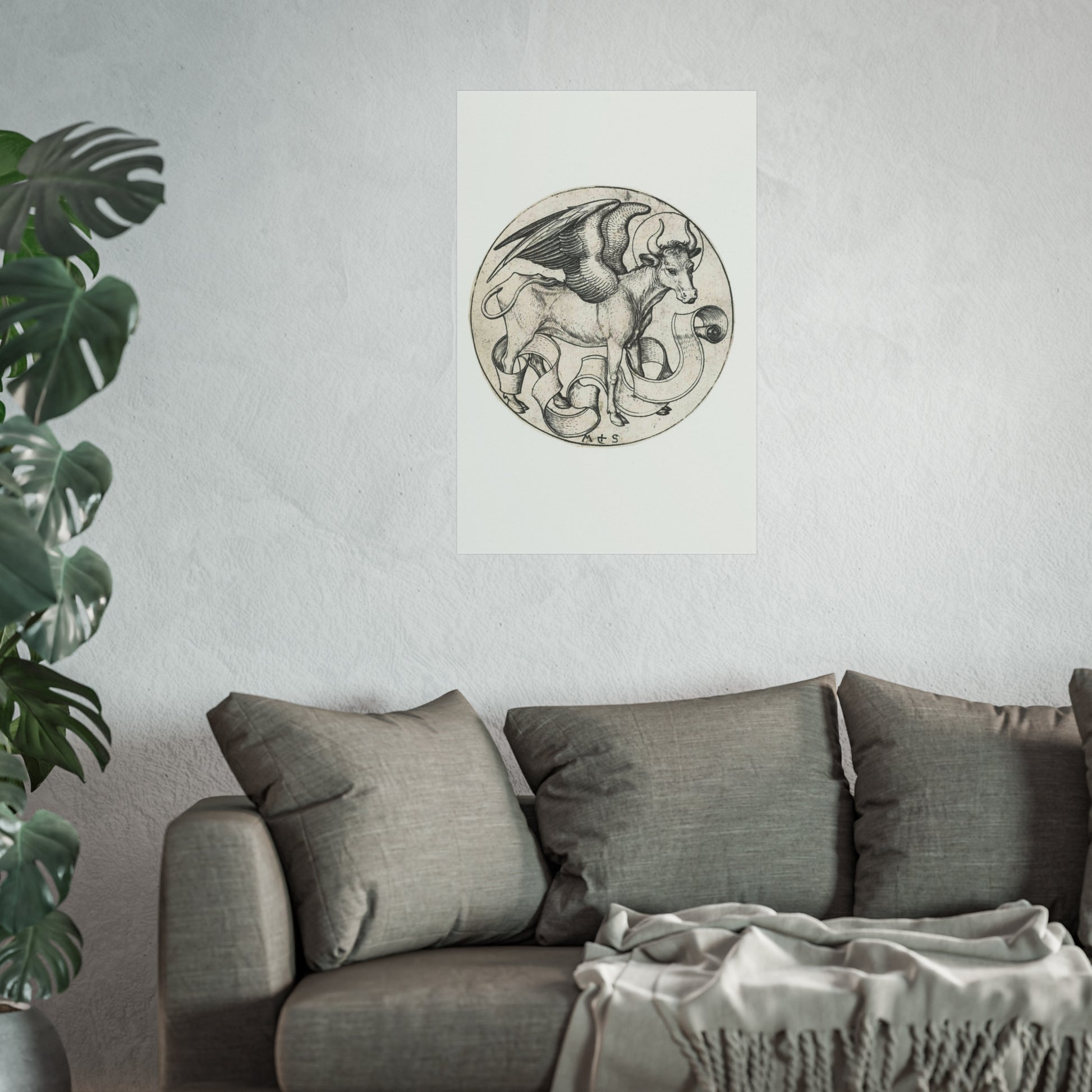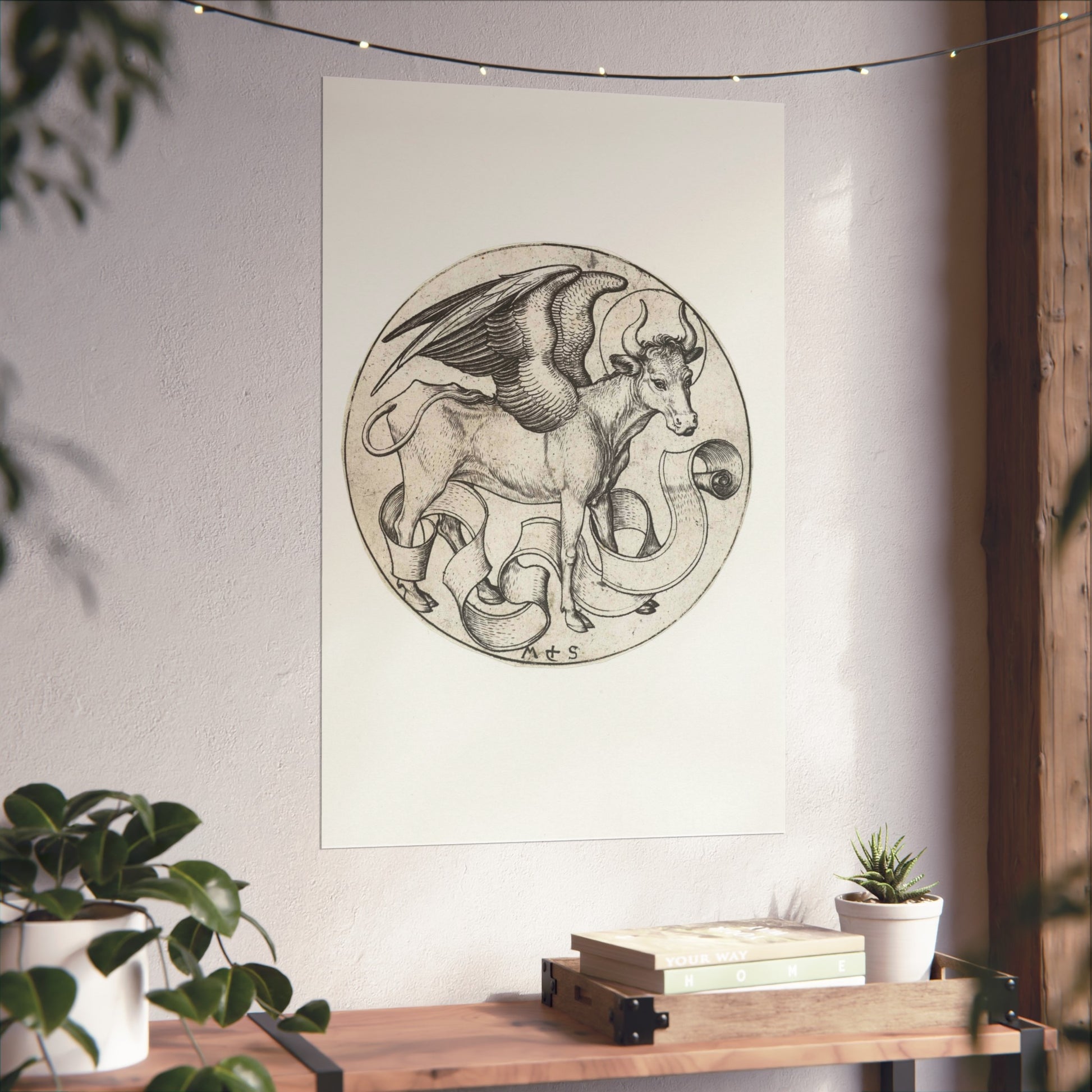 Behold a winged ox, adorned with a banner between its legs, symbolizing the evangelist Luke. This captivating print is part of a series of four circular prints, each representing the symbols of the Evangelists. A splendid work from the masterful hands of Martin Schongauer.