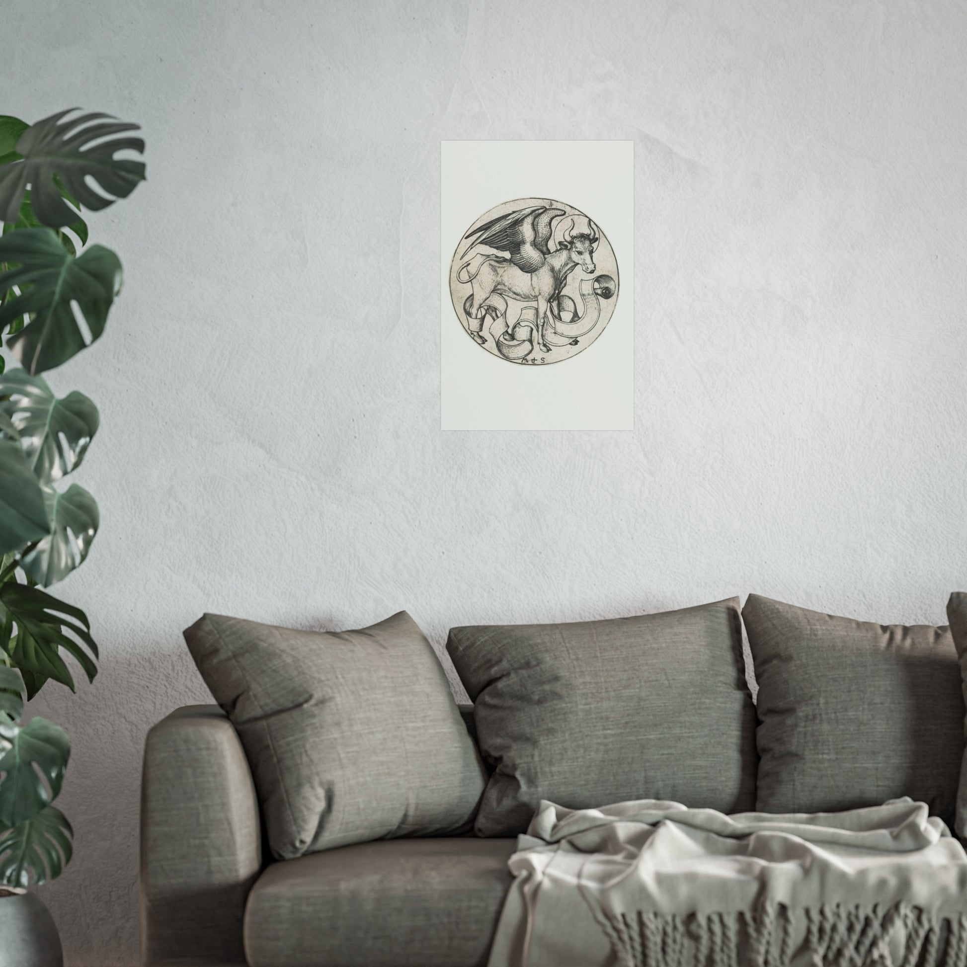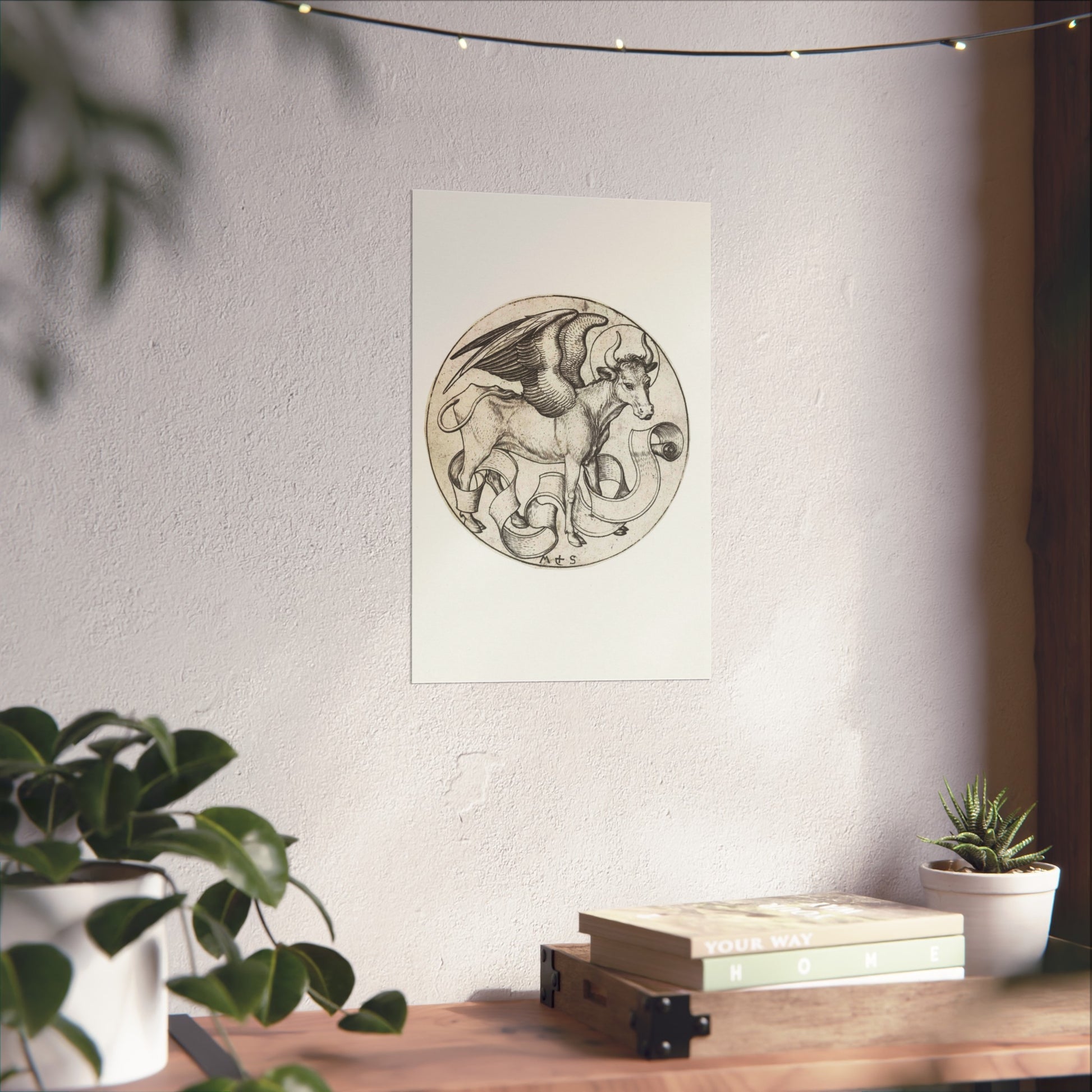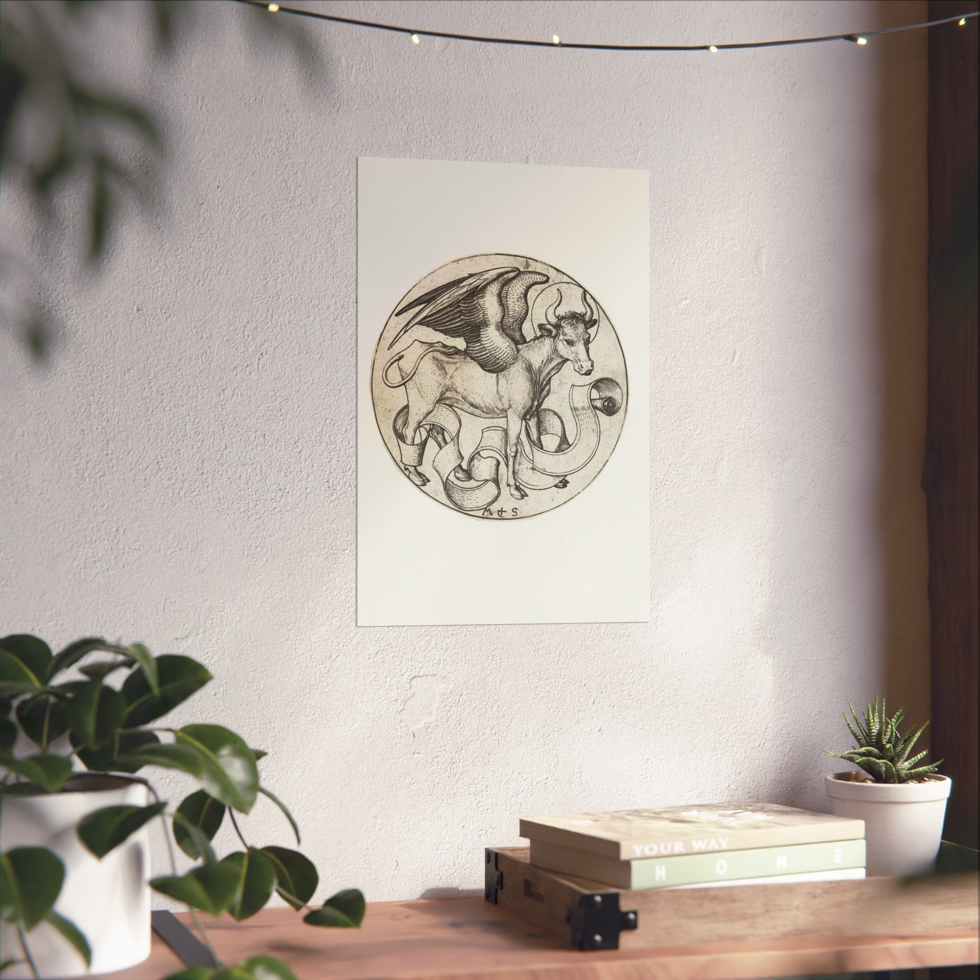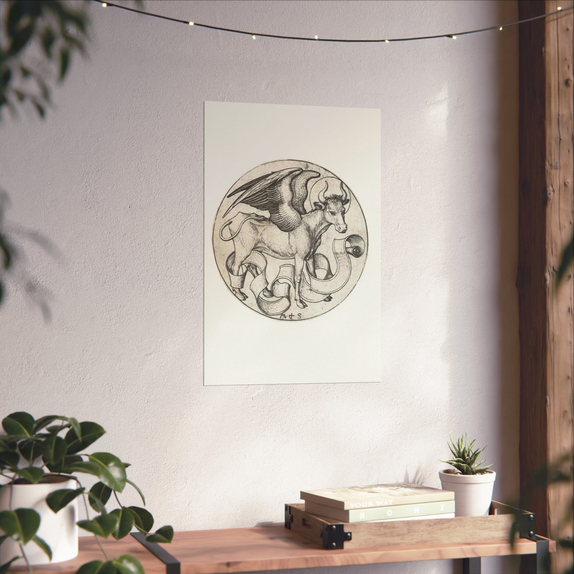 Behold a winged ox, adorned with a banner between its legs, symbolizing the evangelist Luke. This captivating print is part of a series of four circular prints, each representing the symbols of the Evangelists. A splendid work from the masterful hands of Martin Schongauer.
