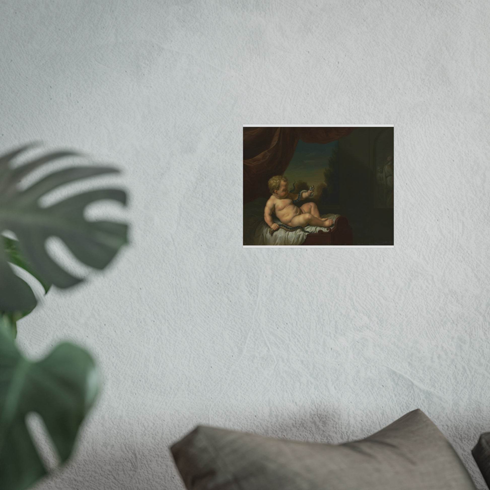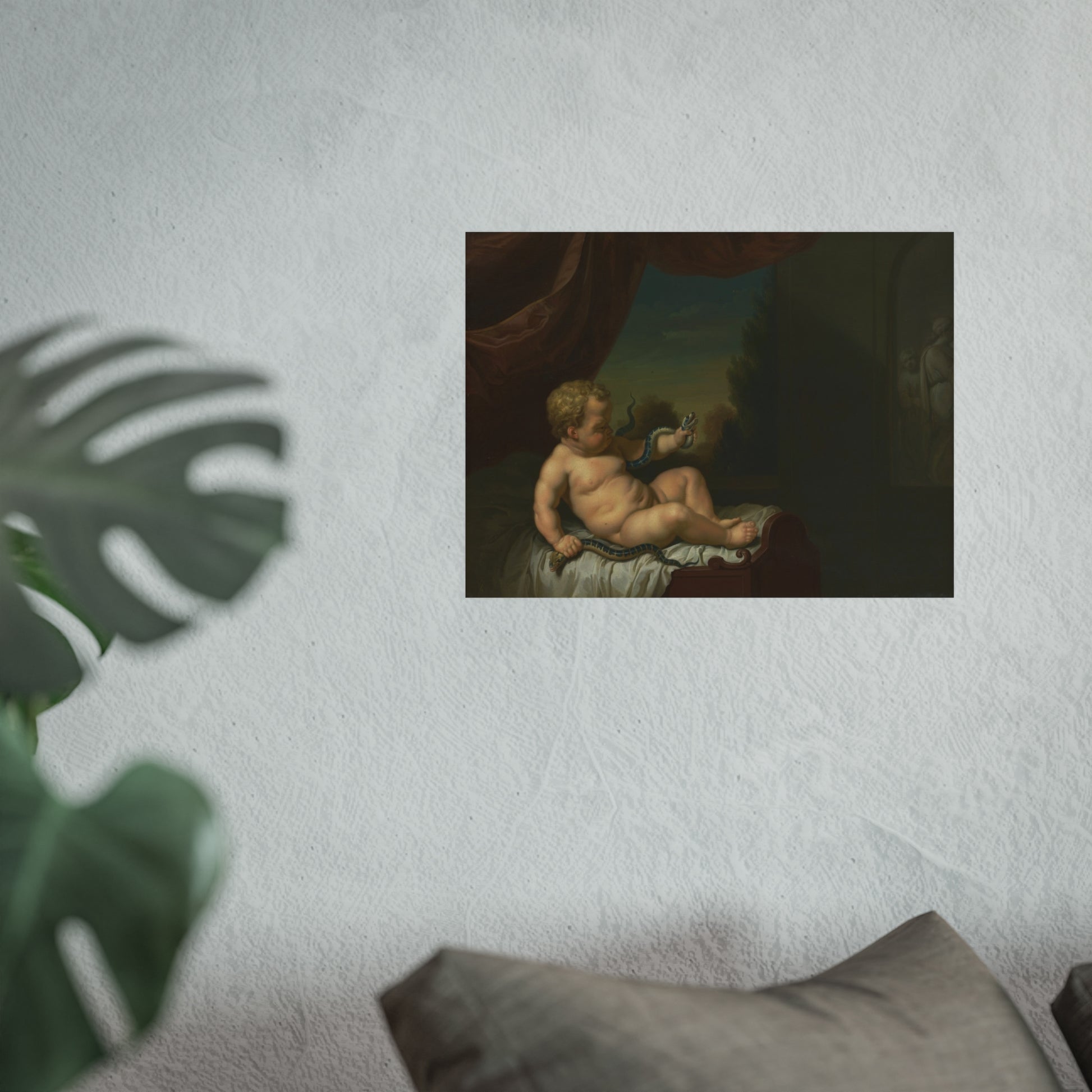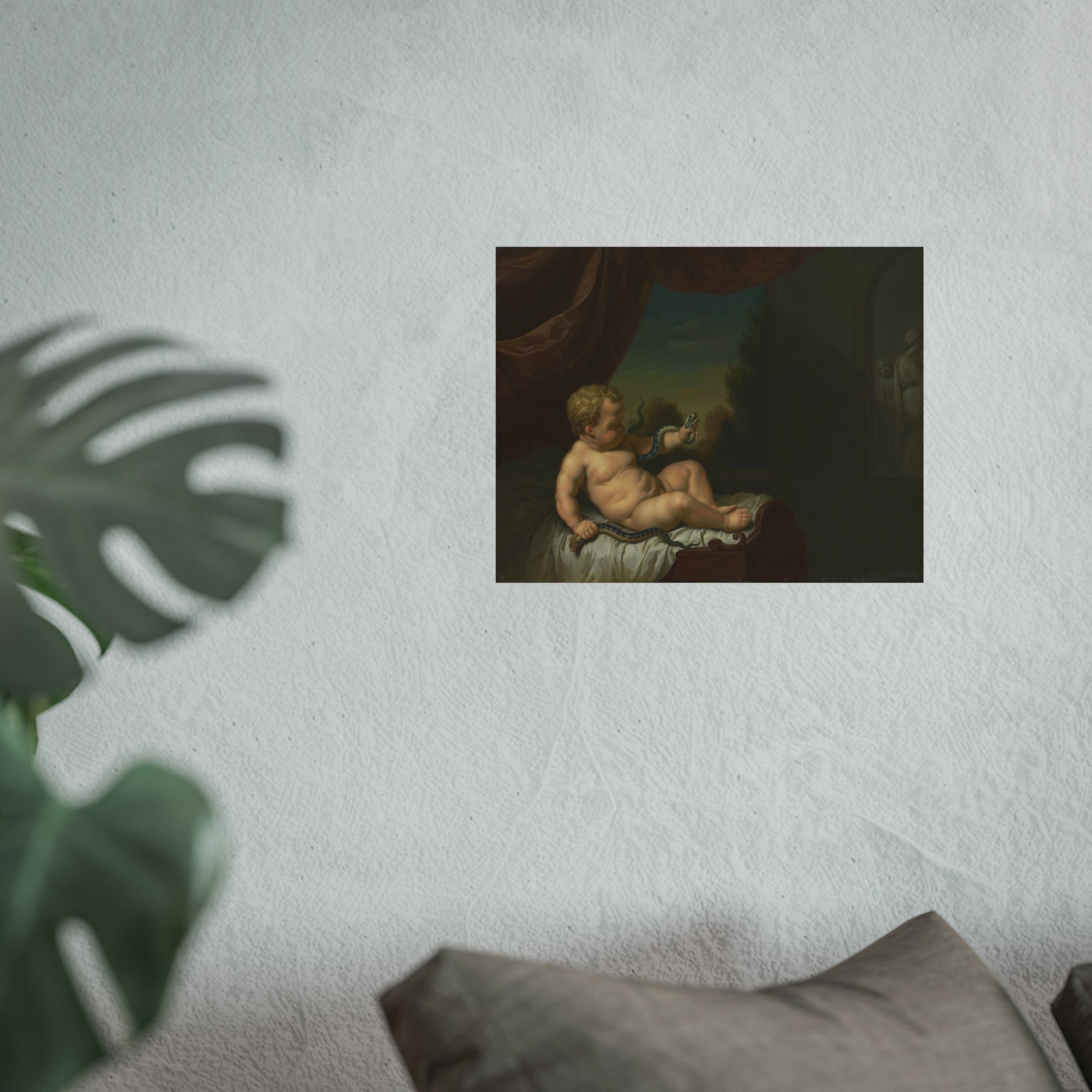 This captivating artwork captures the moment when young Hercules, still in his cradle, slays two serpents. The scene unfolds in a room with a window on the left, offering a glimpse of a picturesque landscape beyond. On the right, there's either a painting or a relief adding depth to the scene. This piece is a pendant of SK-C-268.