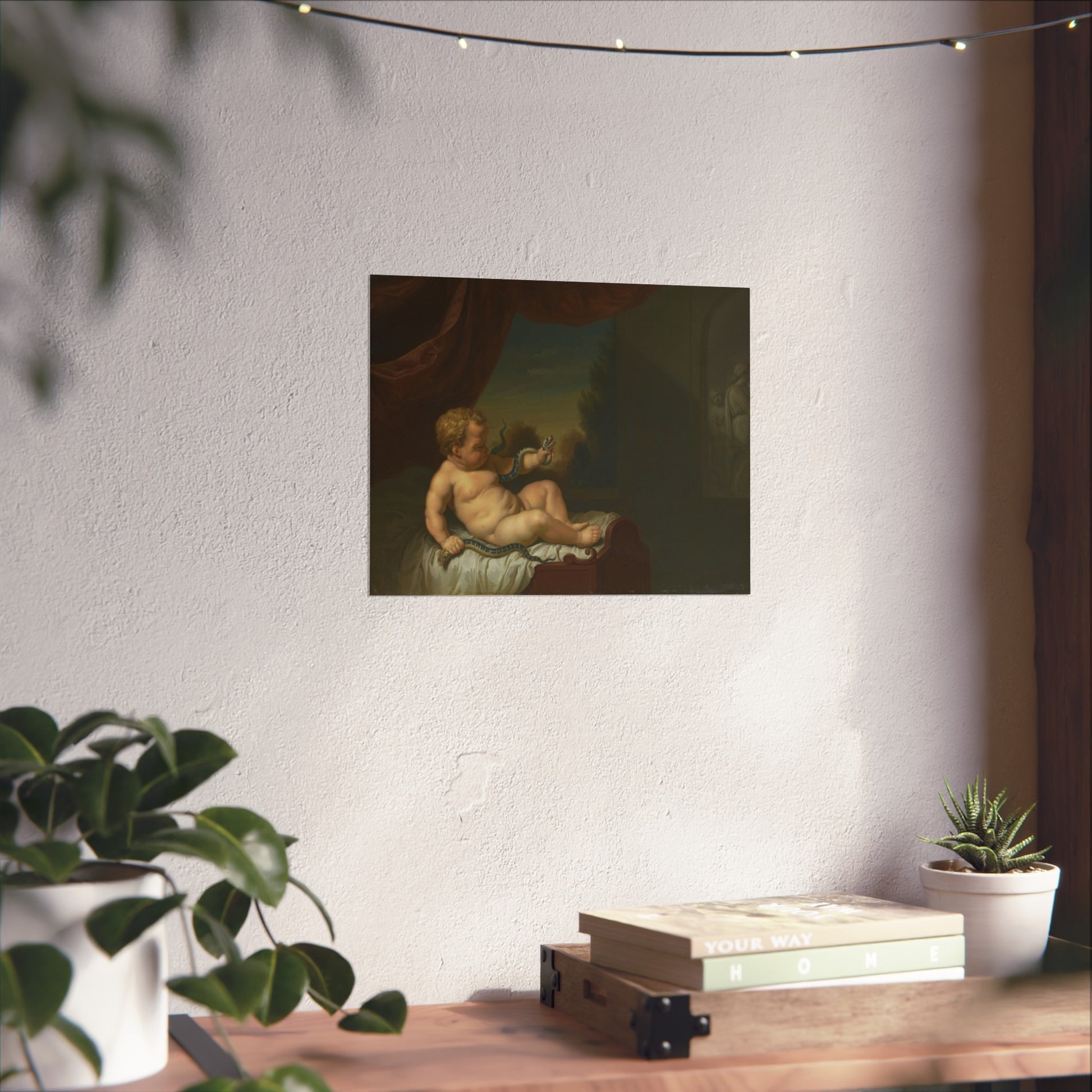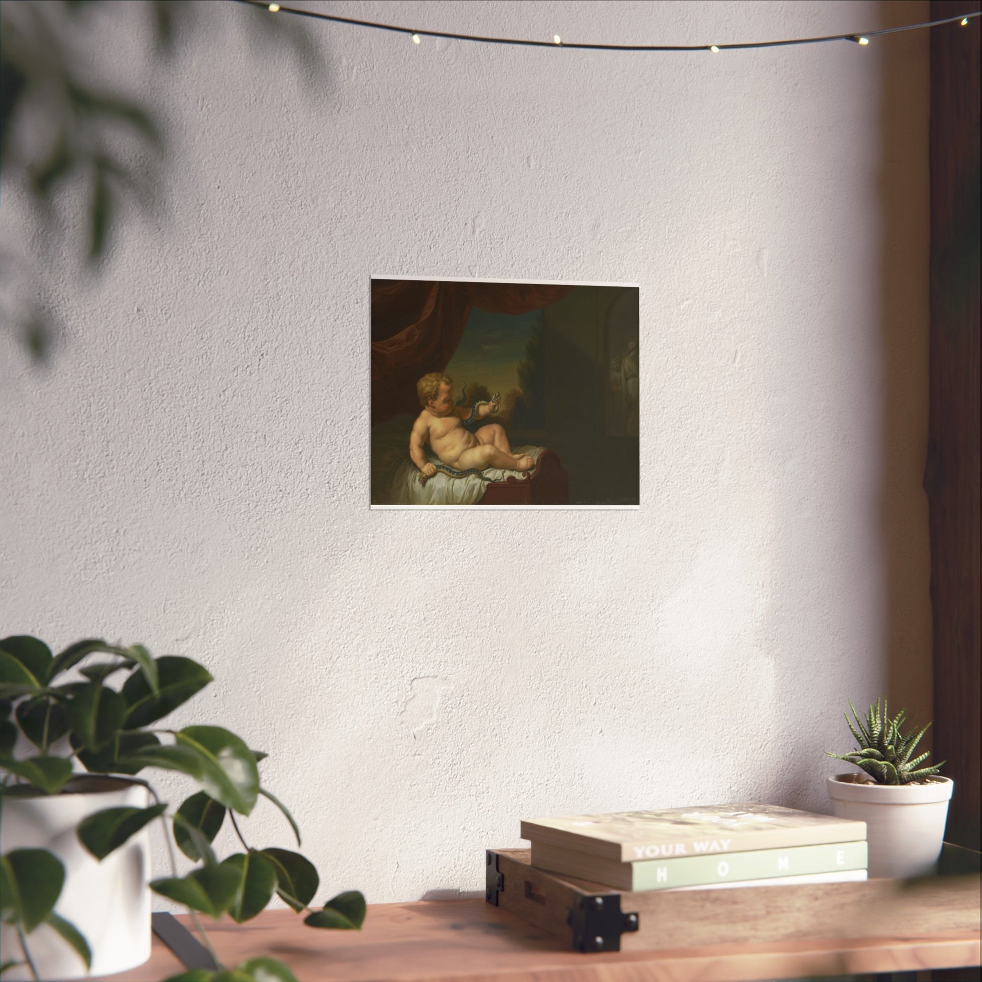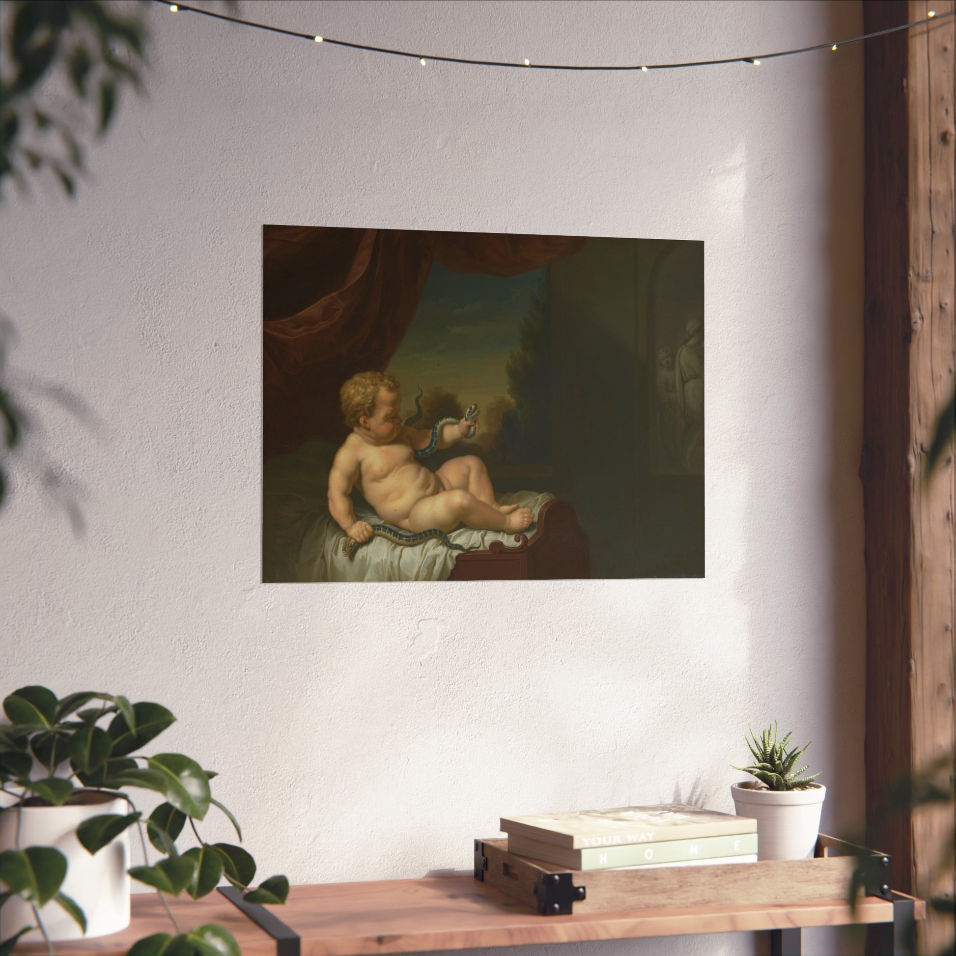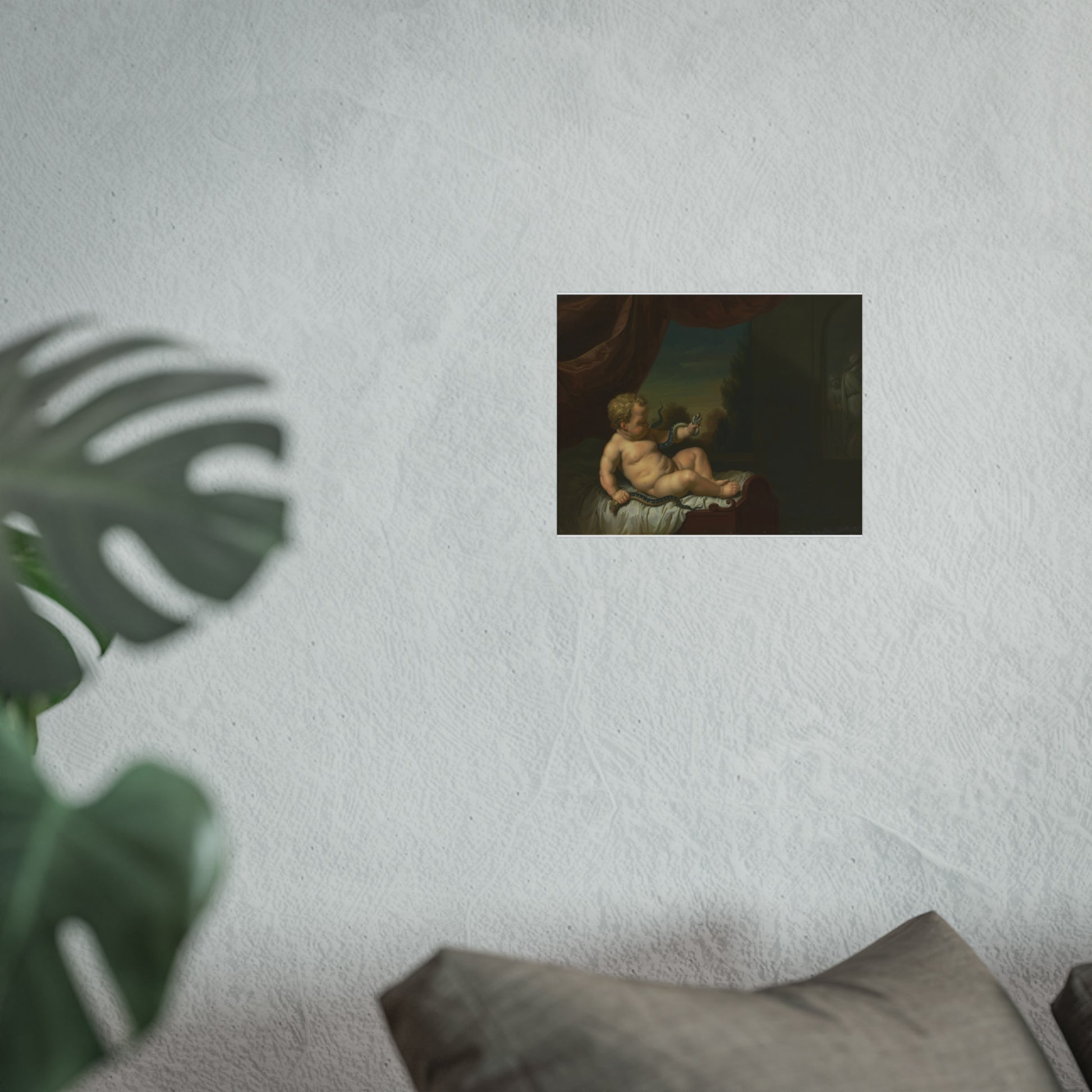 This captivating artwork captures the moment when young Hercules, still in his cradle, slays two serpents. The scene unfolds in a room with a window on the left, offering a glimpse of a picturesque landscape beyond. On the right, there's either a painting or a relief adding depth to the scene. This piece is a pendant of SK-C-268.