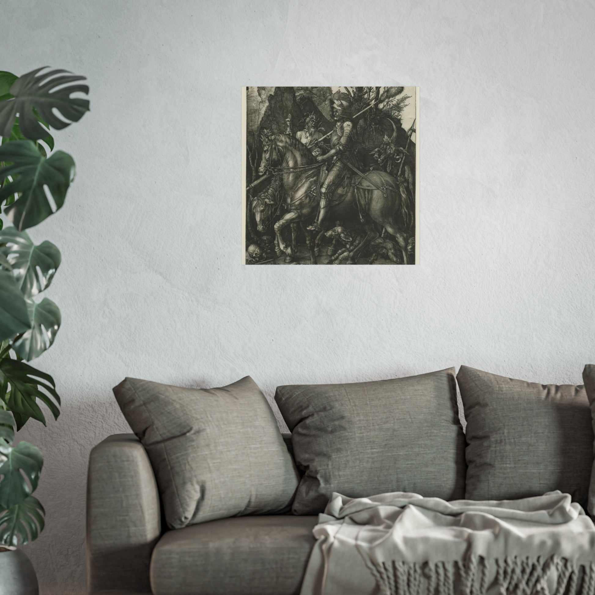 A knight on horseback, riding along a rocky path with his loyal dog by his side, encounters Death, also on horseback, and the Devil. In the background, a city looms under a foreboding sky.