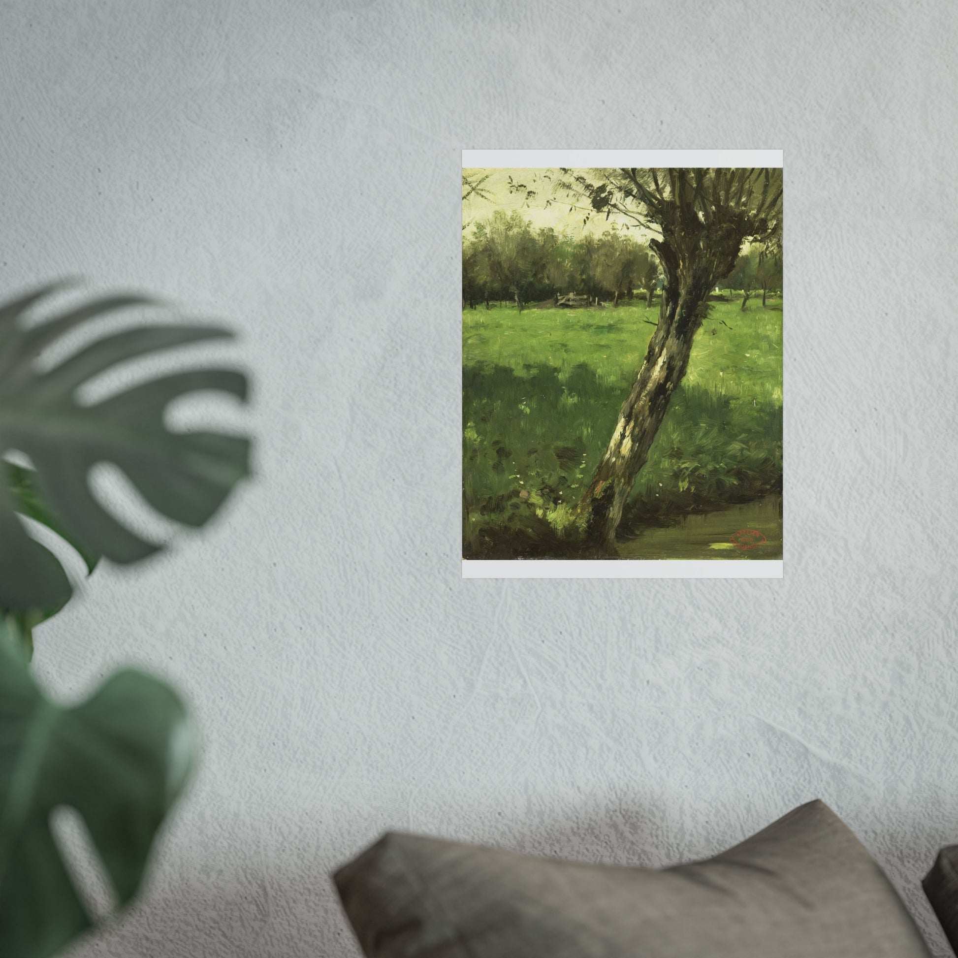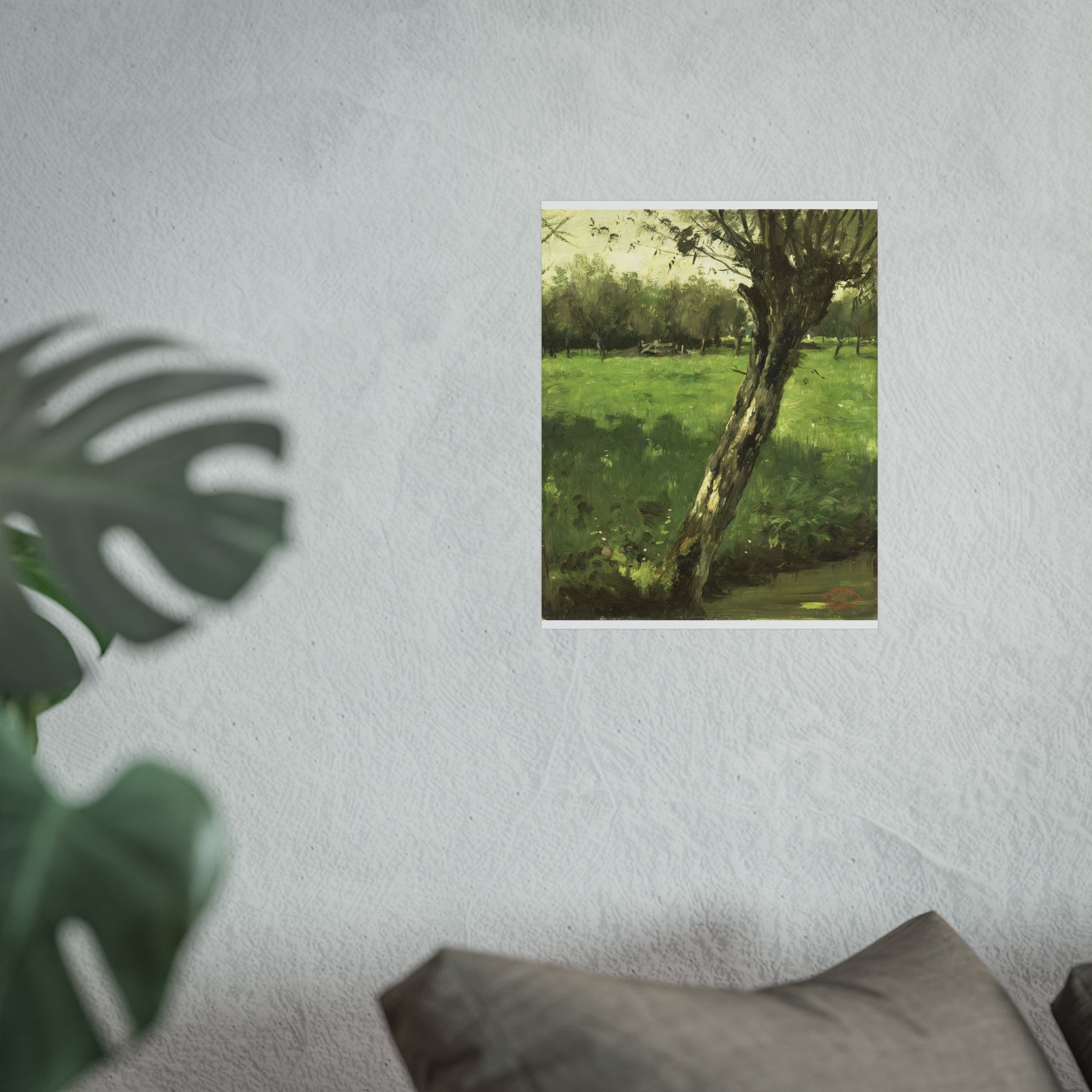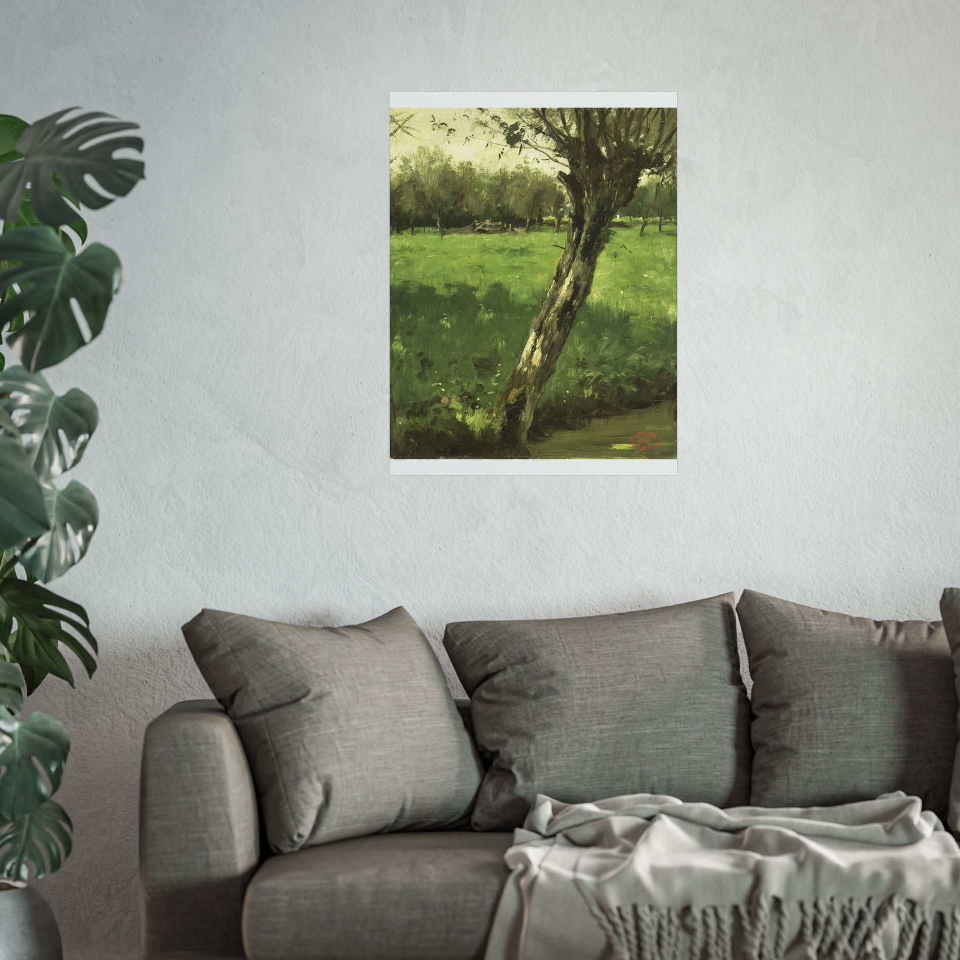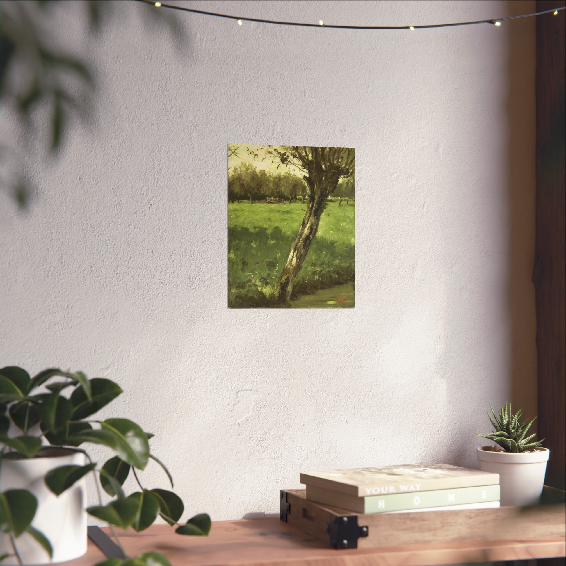 Witness the striking image of a leaning pollard willow tree gracefully standing at the edge of a meadow's ditch. This scenic representation, with its vibrant hues and masterful strokes, captures the serene beauty of nature in all its glory.