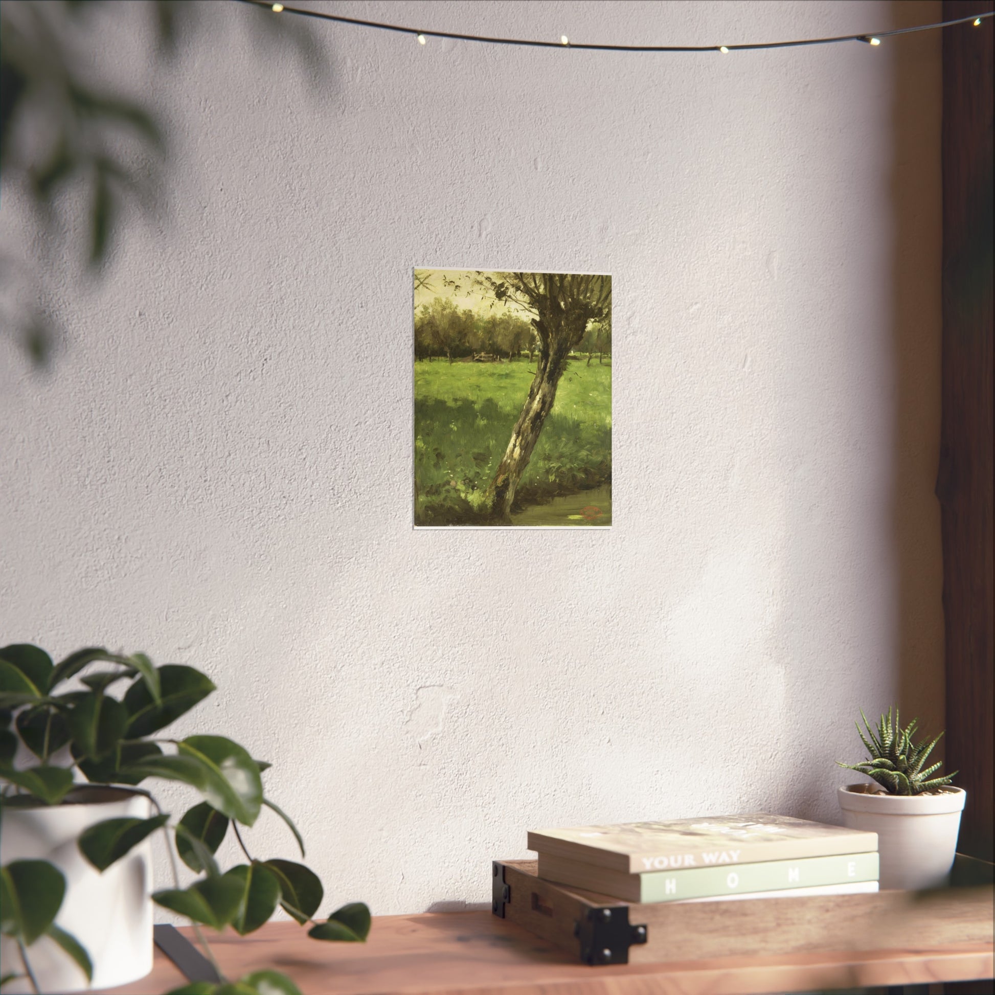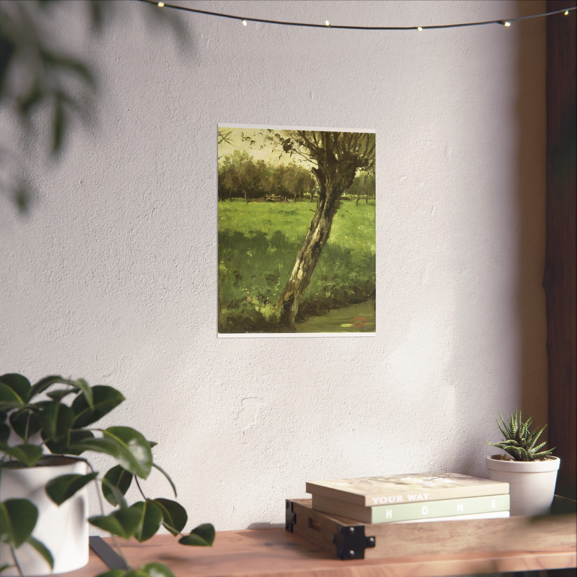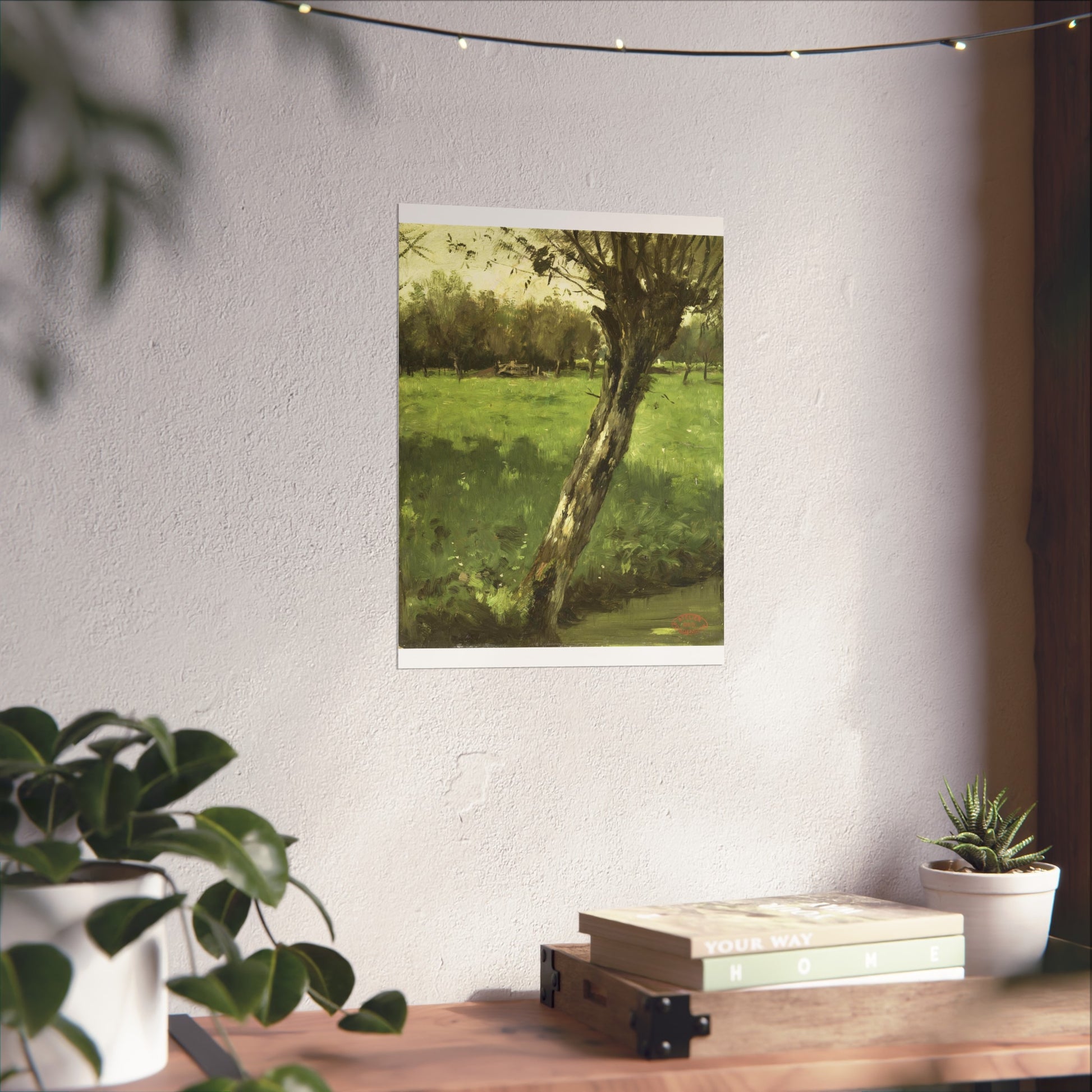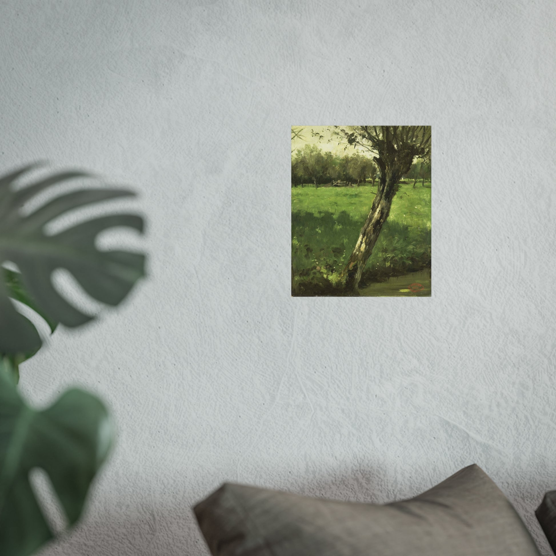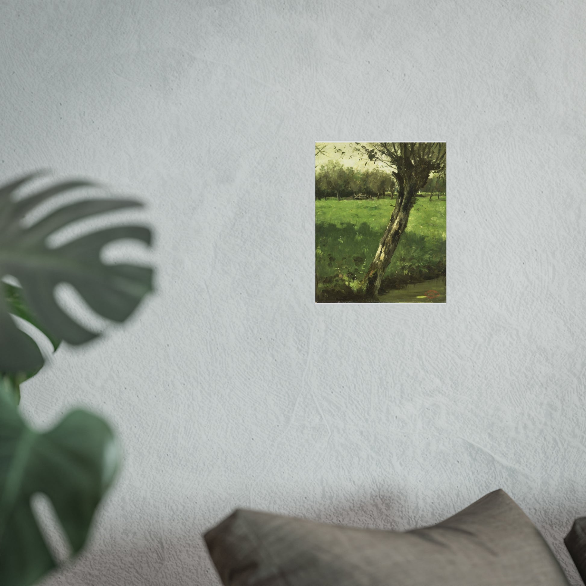 Witness the striking image of a leaning pollard willow tree gracefully standing at the edge of a meadow's ditch. This scenic representation, with its vibrant hues and masterful strokes, captures the serene beauty of nature in all its glory.