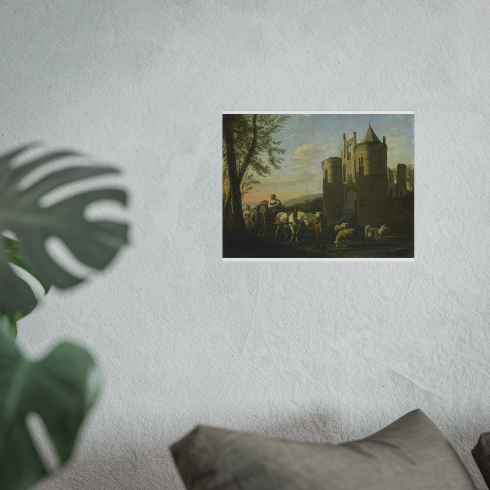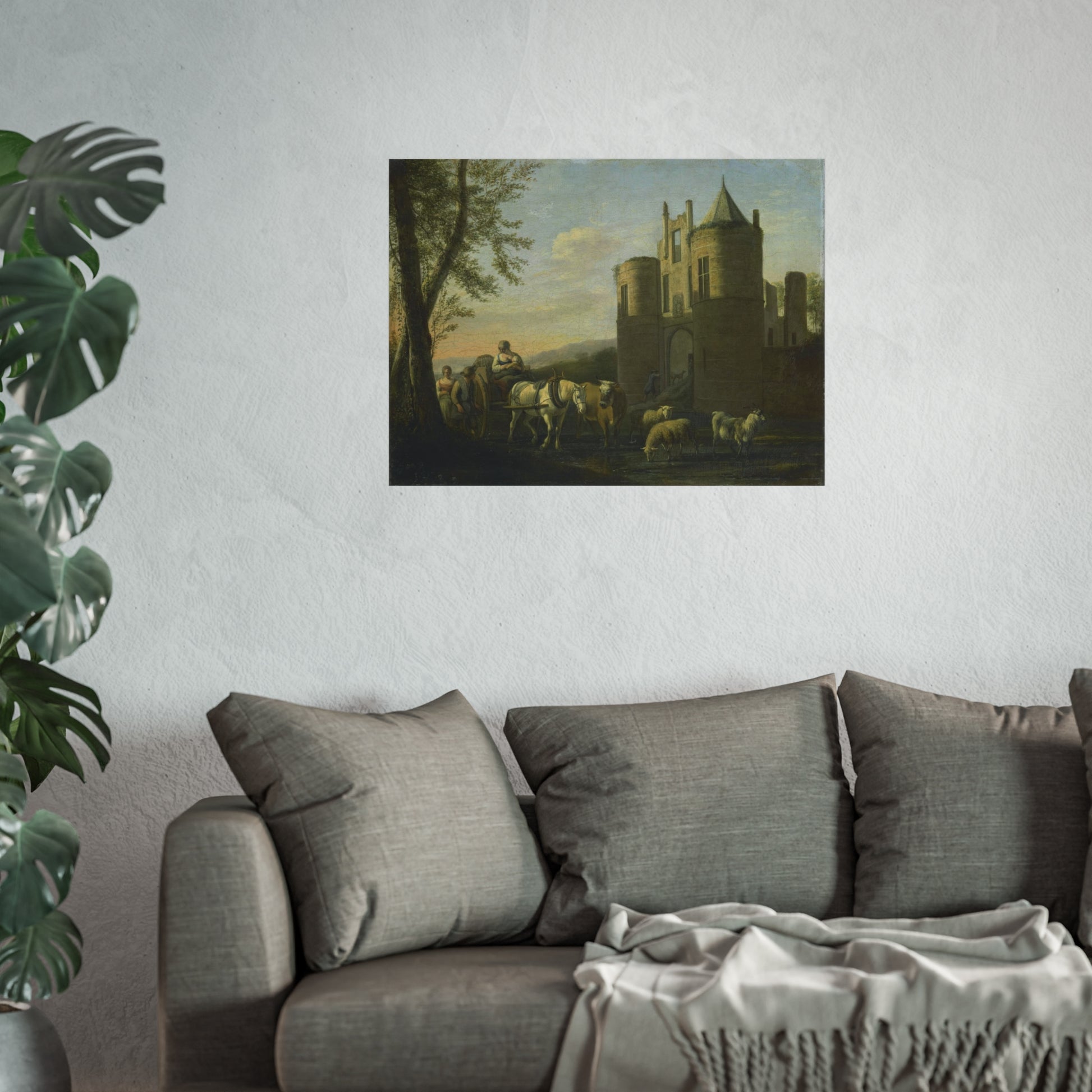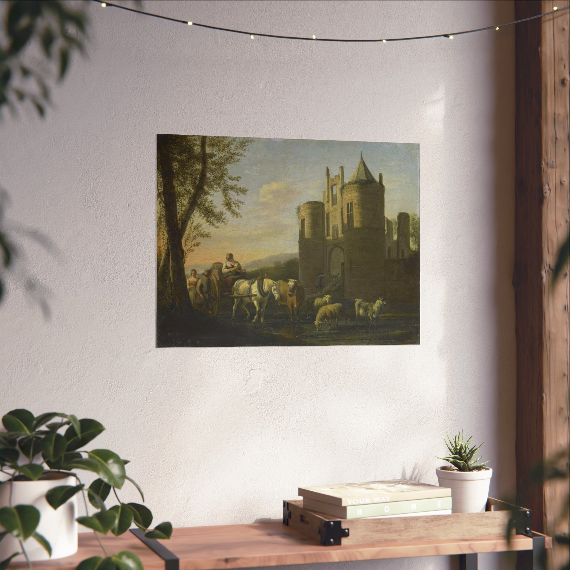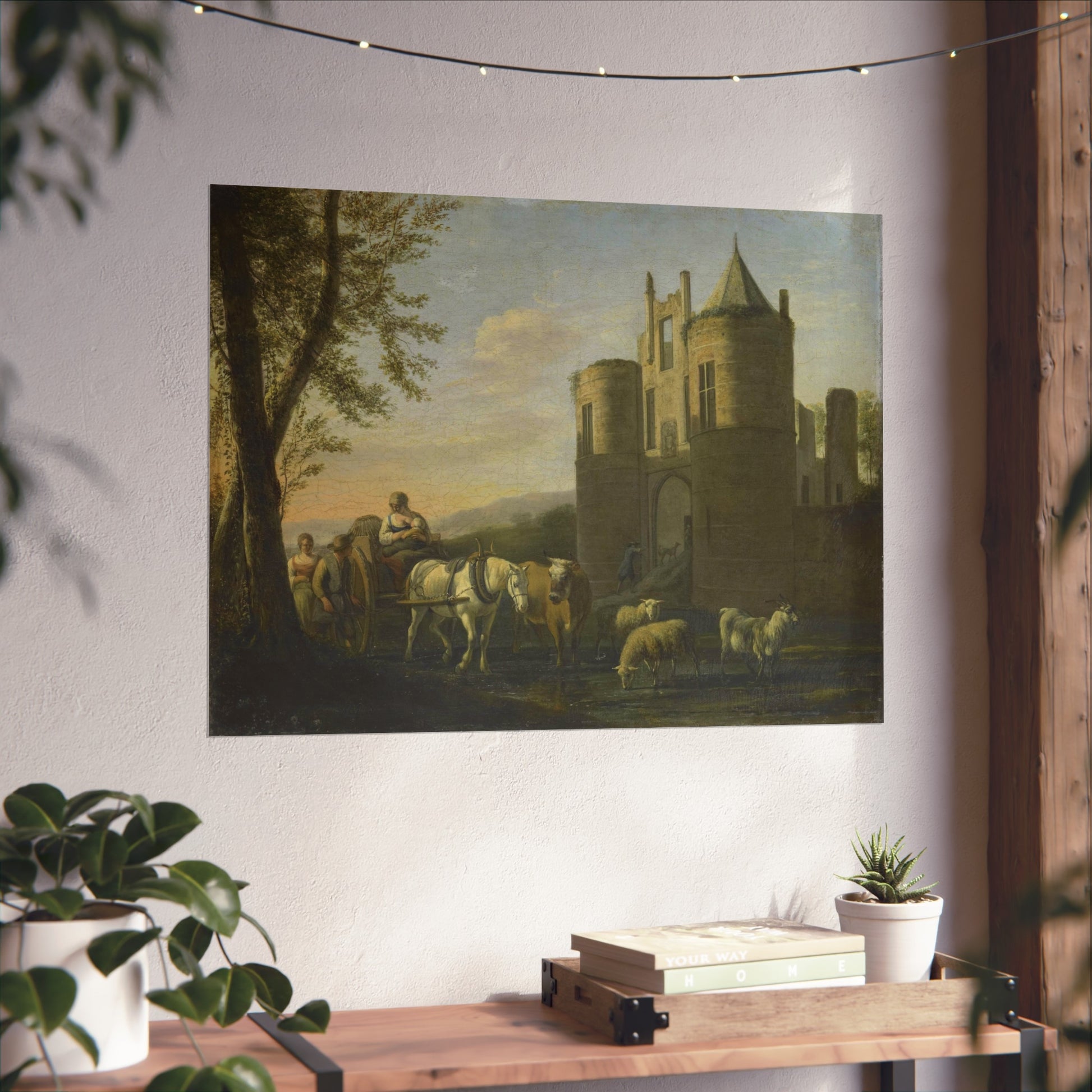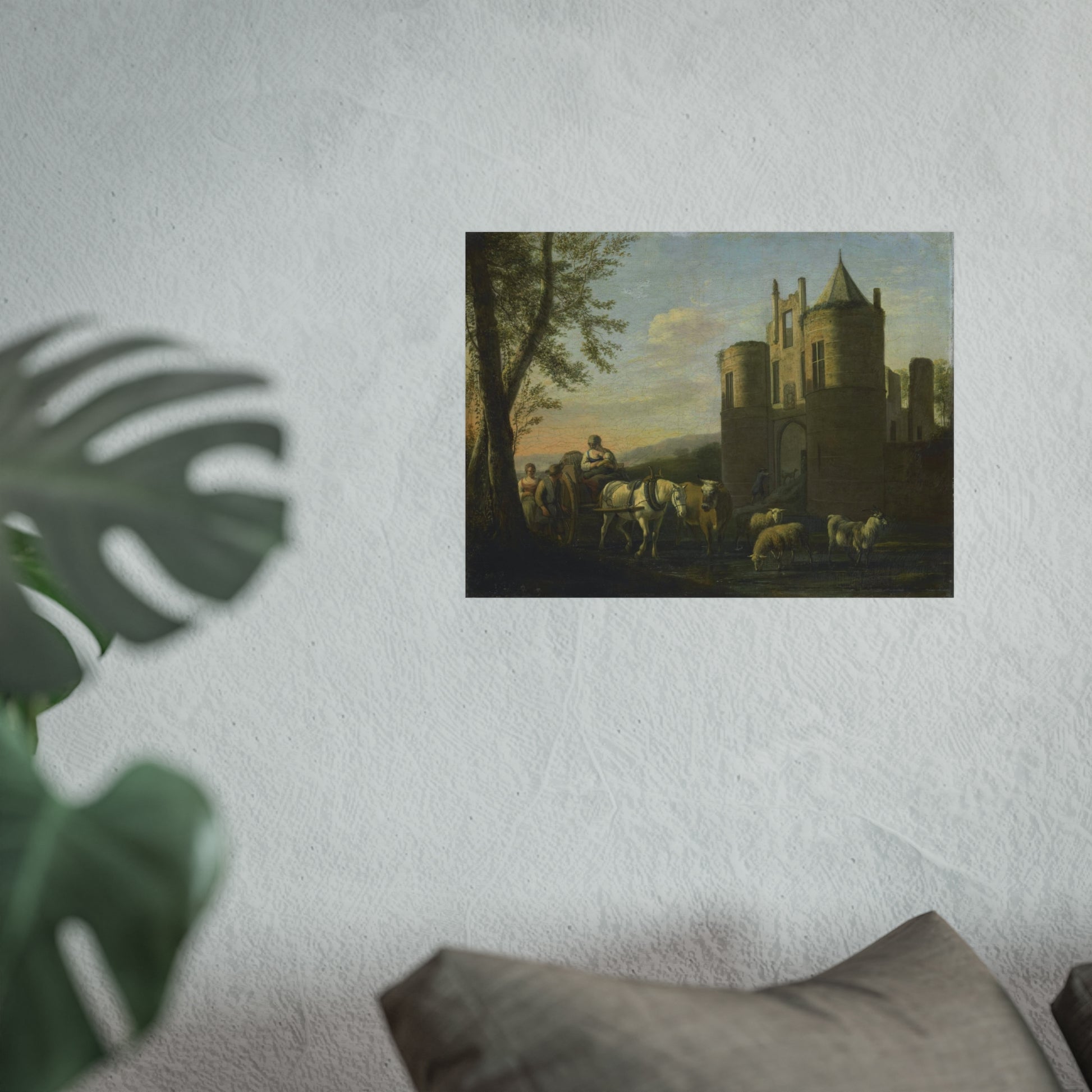 Behold the dilapidated main gate of the Egmond Castle, located in Egmond aan den Hoef. In the foreground, a woman nurses her child atop a cart while nearby, shepherds tend to their livestock.