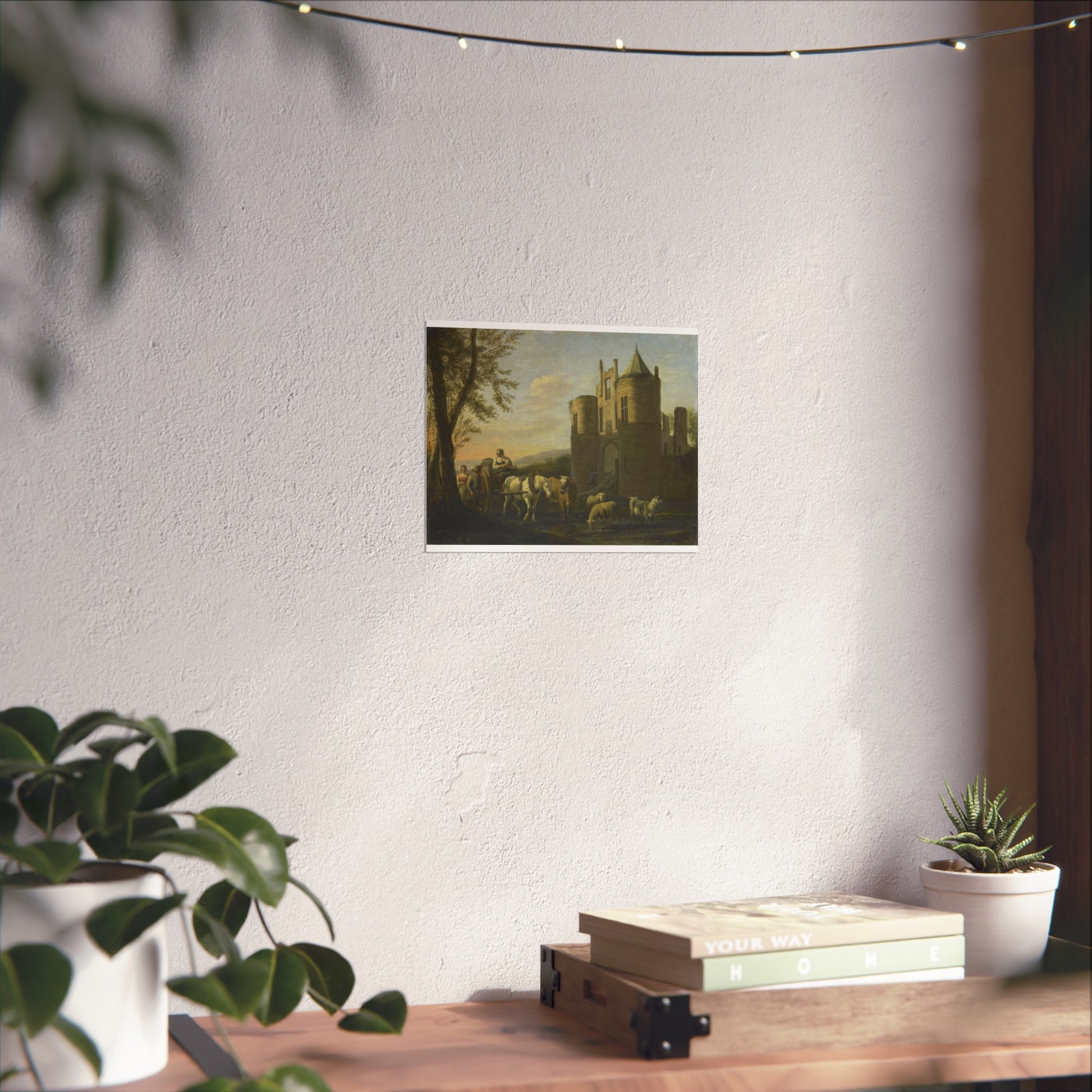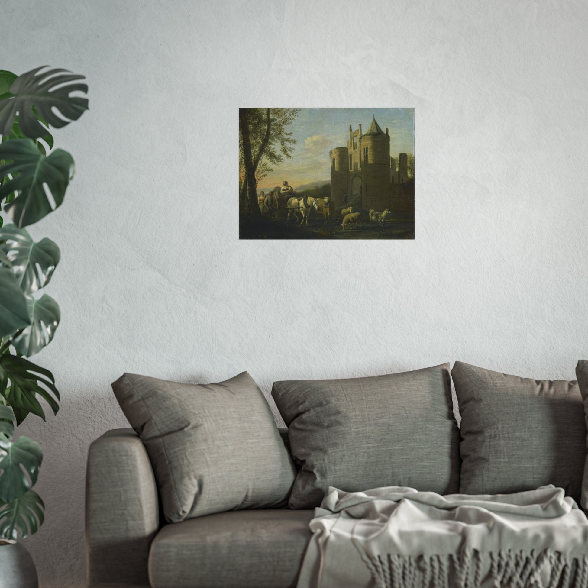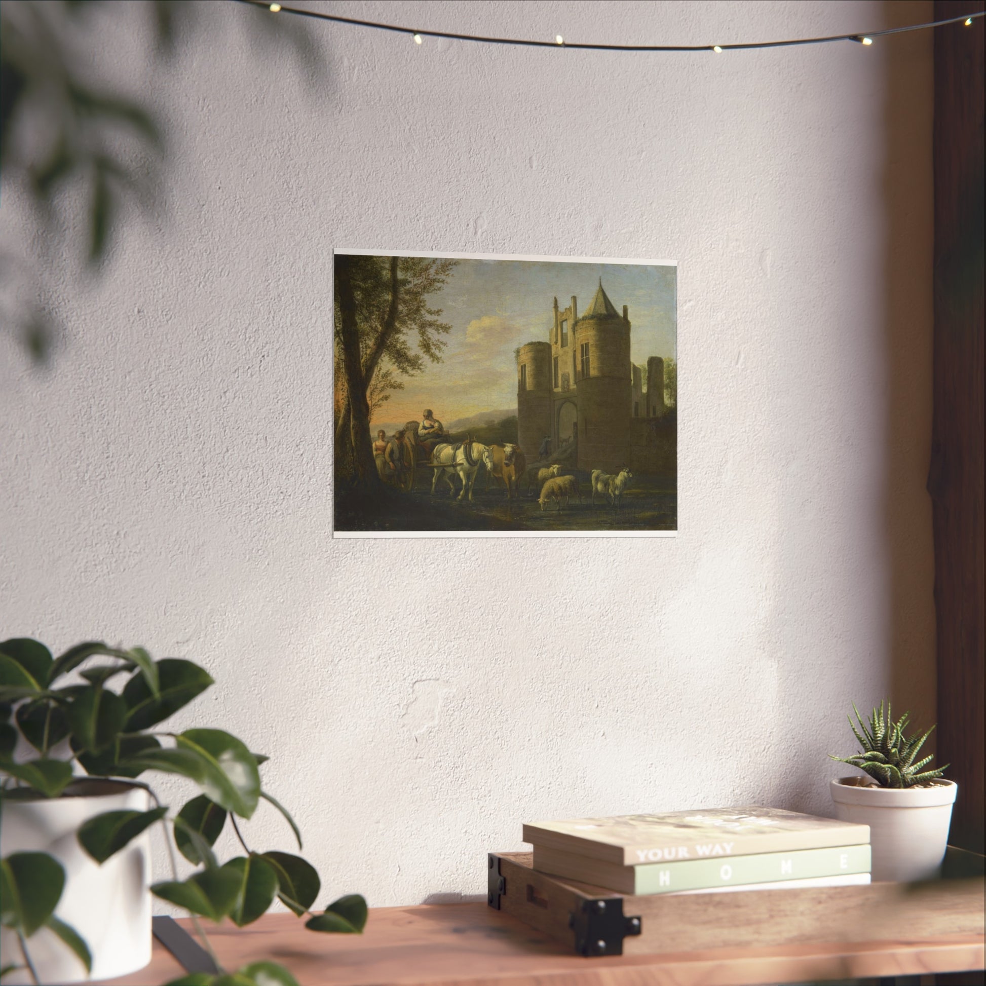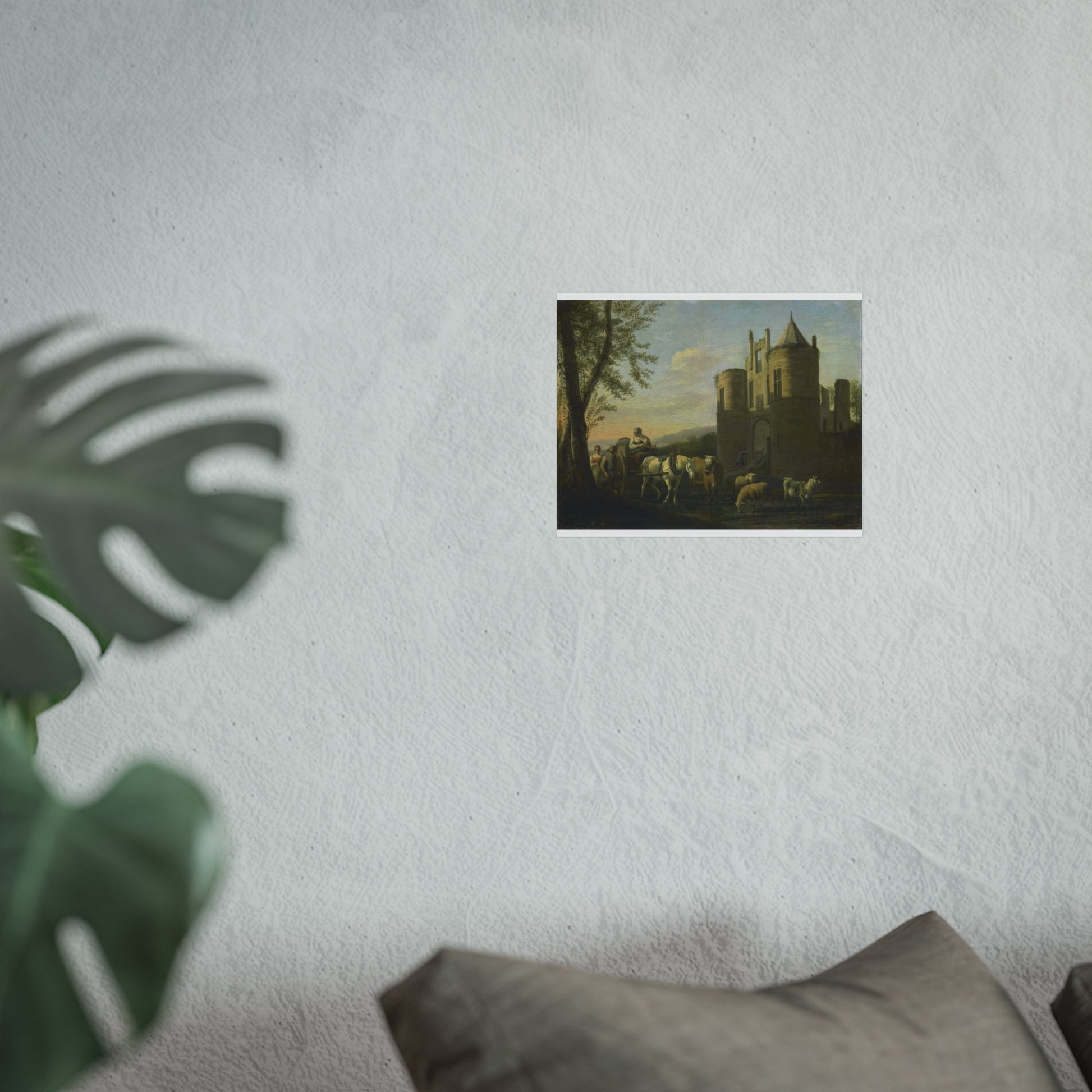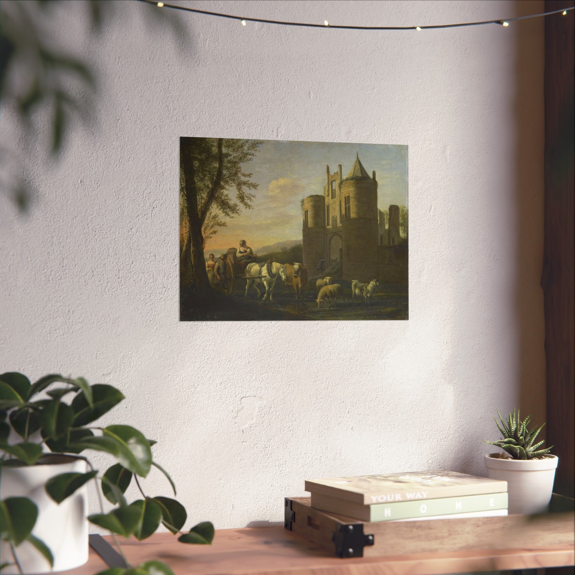 Behold the dilapidated main gate of the Egmond Castle, located in Egmond aan den Hoef. In the foreground, a woman nurses her child atop a cart while nearby, shepherds tend to their livestock.