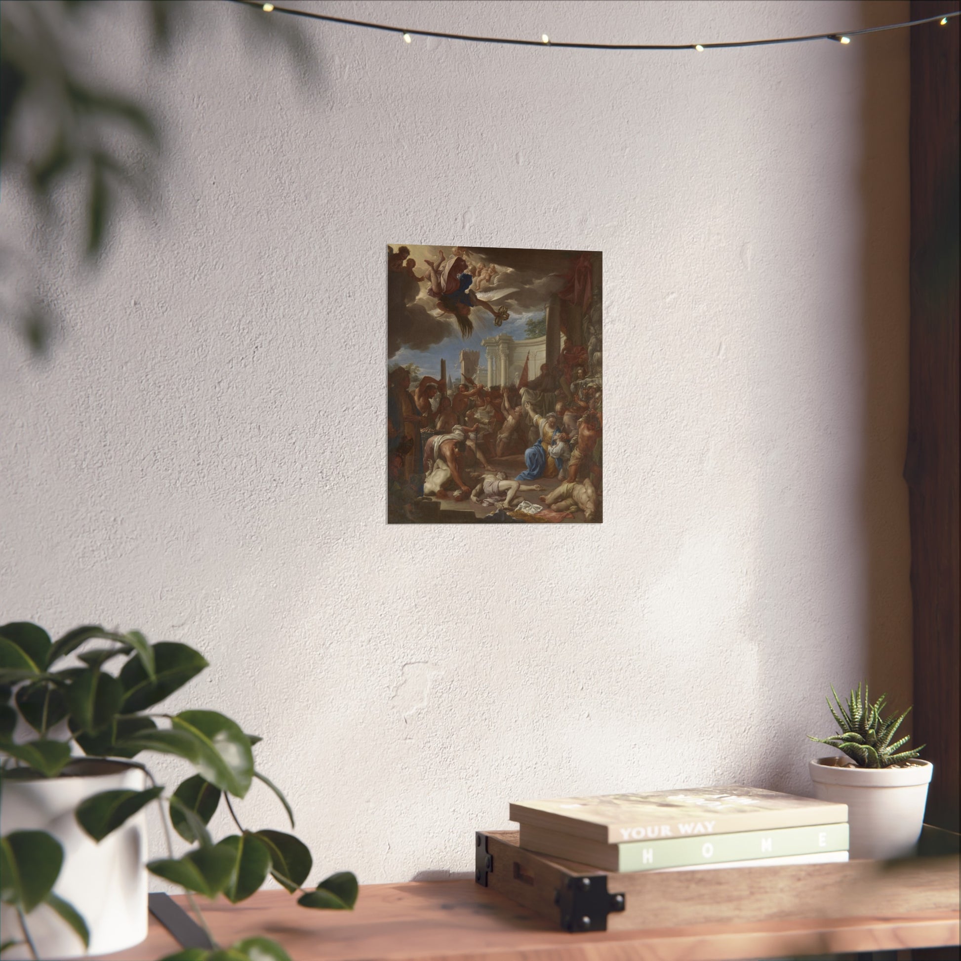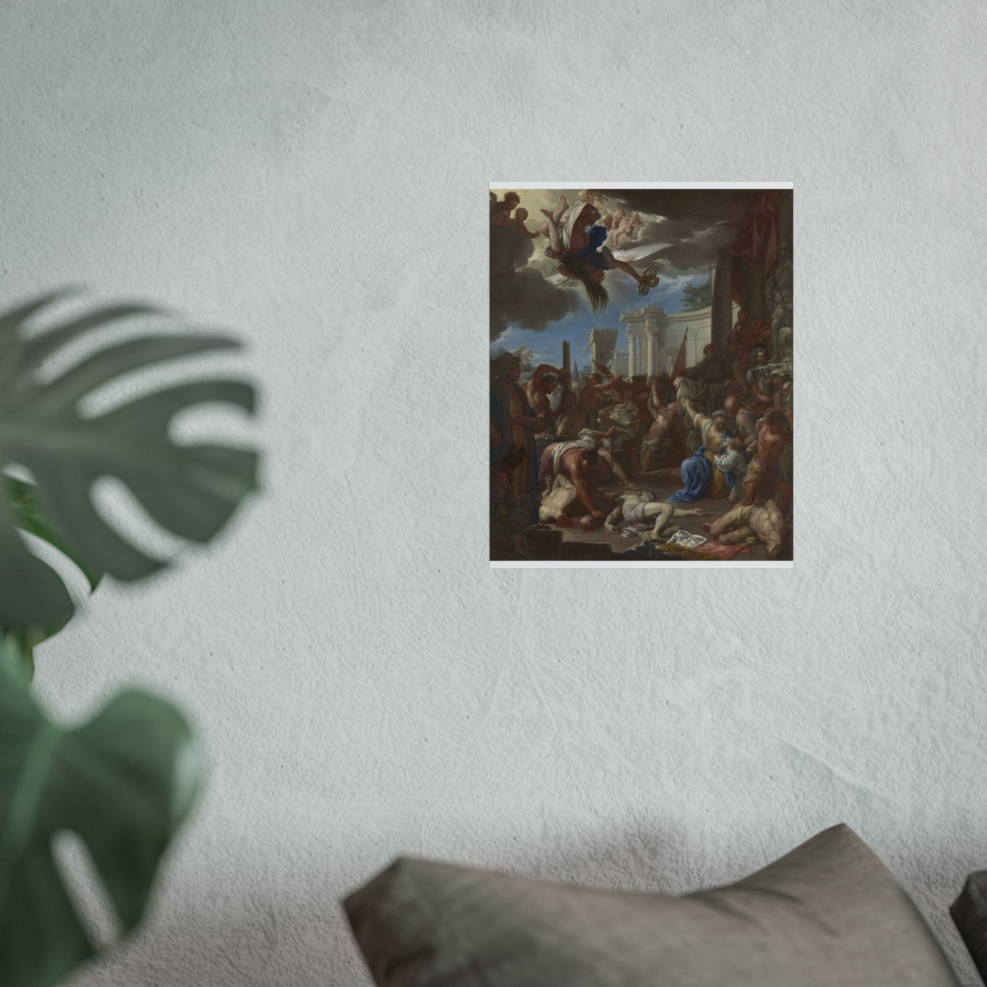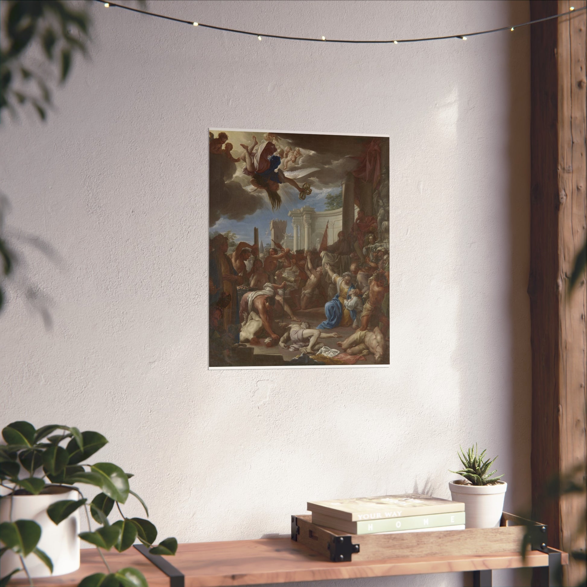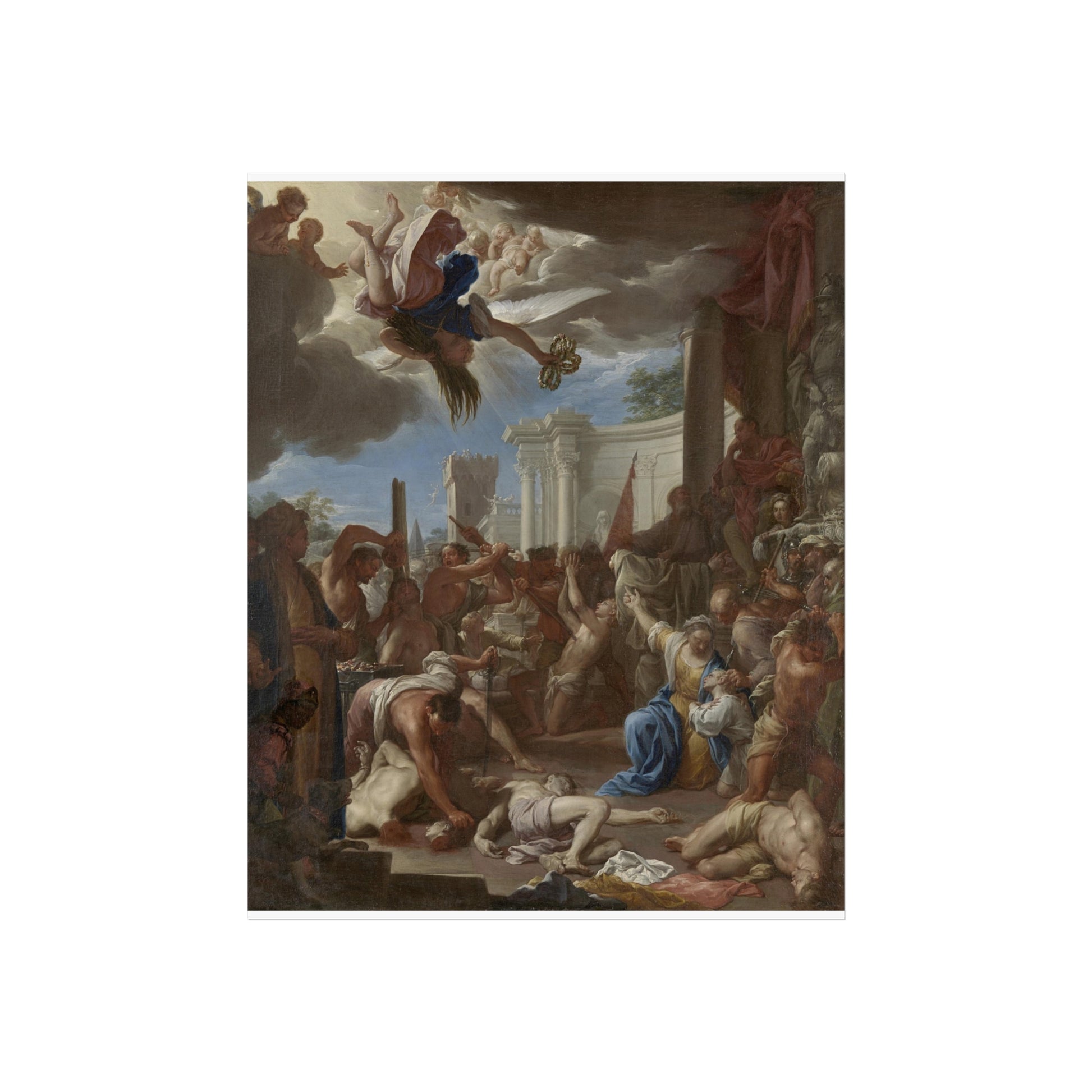 The painting vividly portrays the martyrdom of the seven sons of Saint Felicity. Kneeling to the right of the center, Saint Felicity comforts her youngest son, Martialis, pointing towards an angel descending from above with seven crowns and palm branches symbolizing martyrdom. The statue of Mars behind her signifies the Roman gods she, as an early Christian widow, refused to worship. To the left of the statue, Roman Emperor Antoninus Pius sits on his throne, having ordered Felicity to witness her sons' execution before her own. On the right foreground is Saint Januarius, being flogged with lead balls; in the middle and left foreground are Saint Alexander and the beheaded Vitalis; seated and kneeling in the middle are Saints Phillippus and Felix; while in the background, Saint Silvanus is being thrown from a tower. The painting also features a crowd of spectators and a statue of one of the Vestal Virgins. The artist, Francesco Trevisani, included two self-portraits: one next to Mars' pedestal and another in full length at the extreme left. The coats of arms and crown on the pedestal reference Jean-Baptiste Colbert, Marquis de Torcy, and his wife Cathérine-Félicité Arnauld de Pomponne, who were gifted this painting by Cardinal Pietro Ottoboni in 1709.