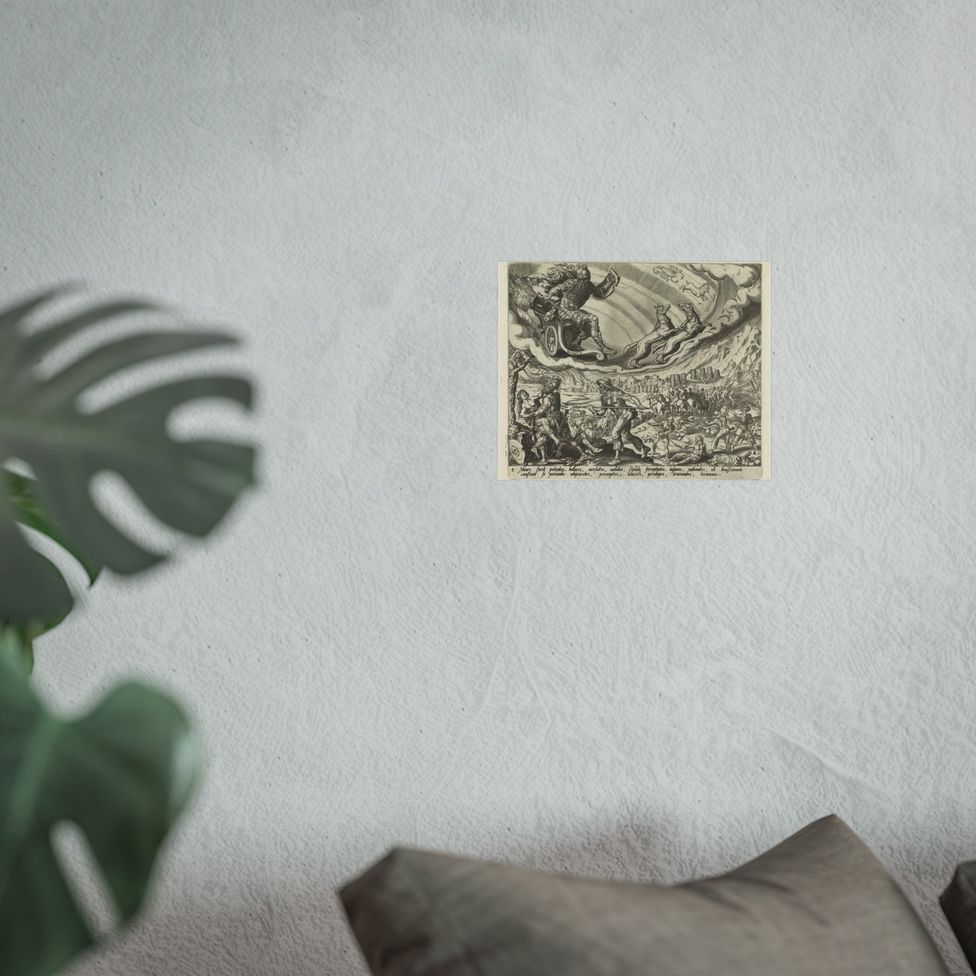 Mars, the Roman god of war, majestically rides across the sky in his chariot, drawn by two fierce dogs. The symbols of Scorpio and Aries indicate the people under Mars' influence - individuals born under these signs are often rough and aggressive. Below on Earth, scenes of chaos unfold with theft, murder, and arson running rampant. At the bottom of the artwork, a Latin text discusses the children of Mars.
