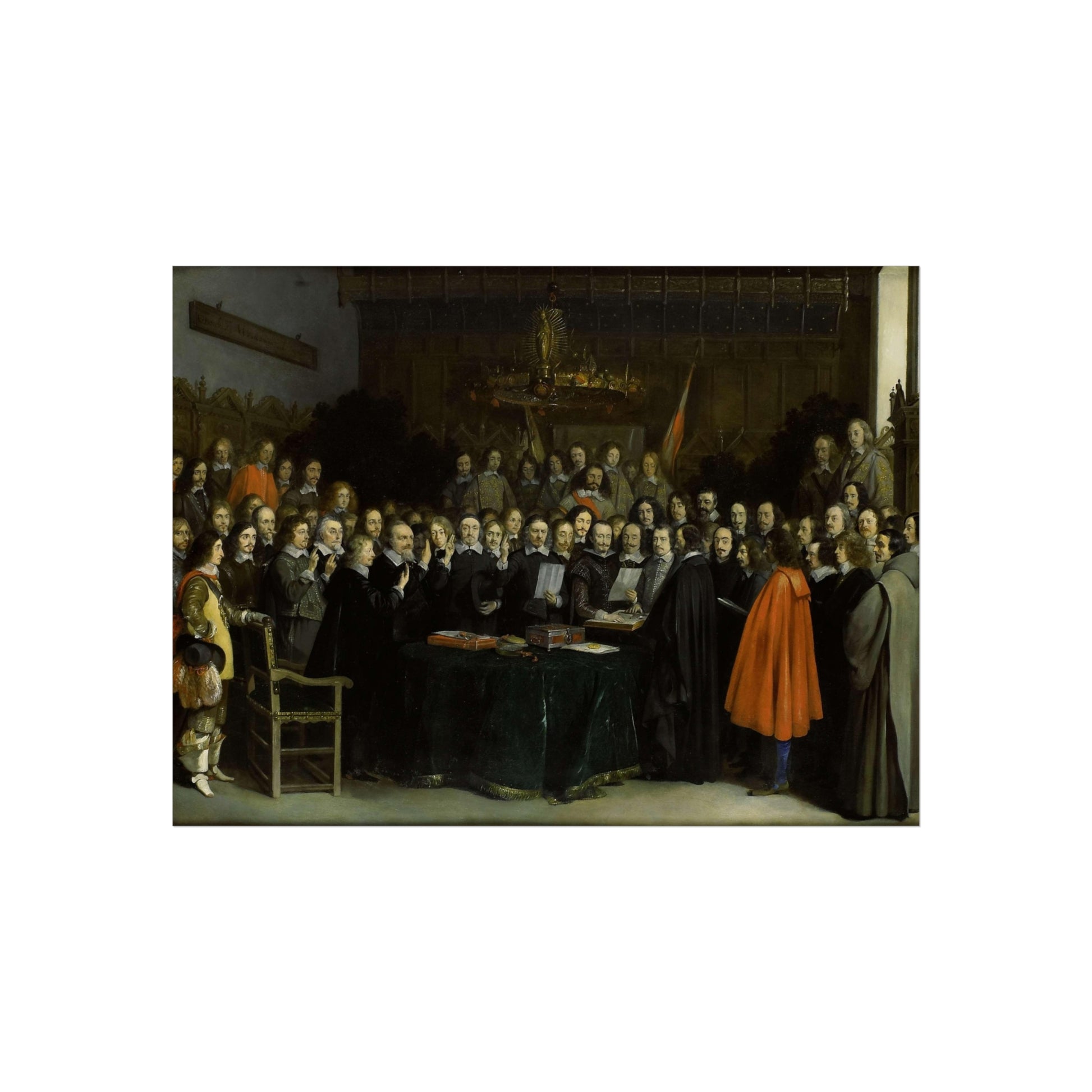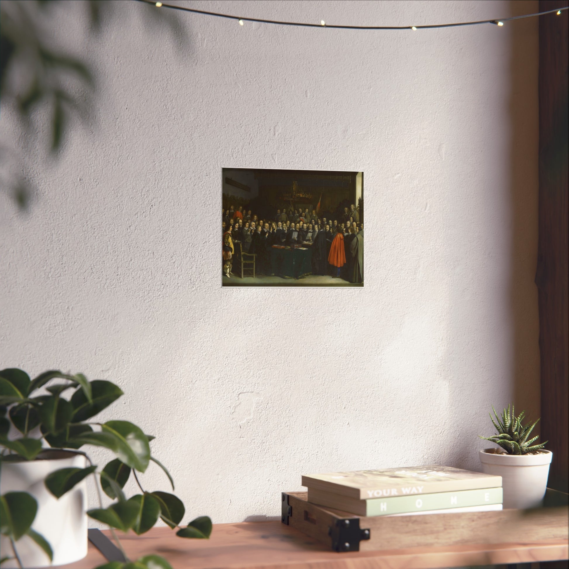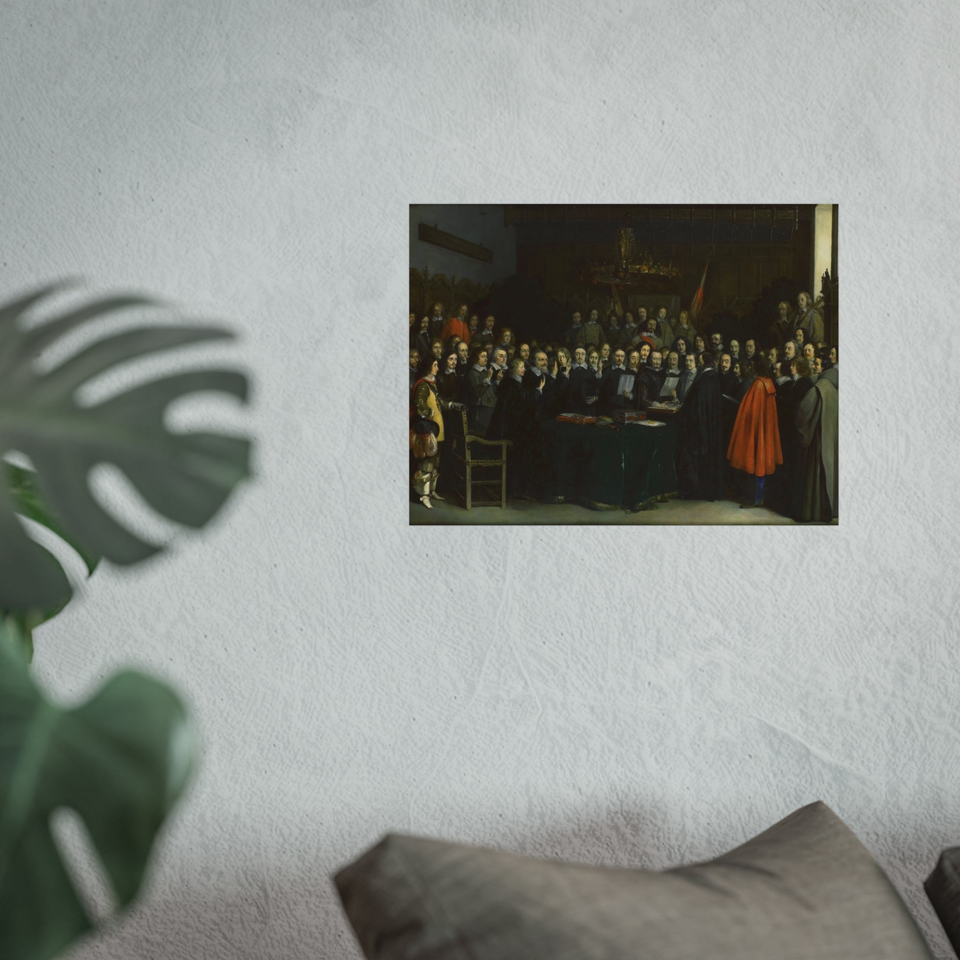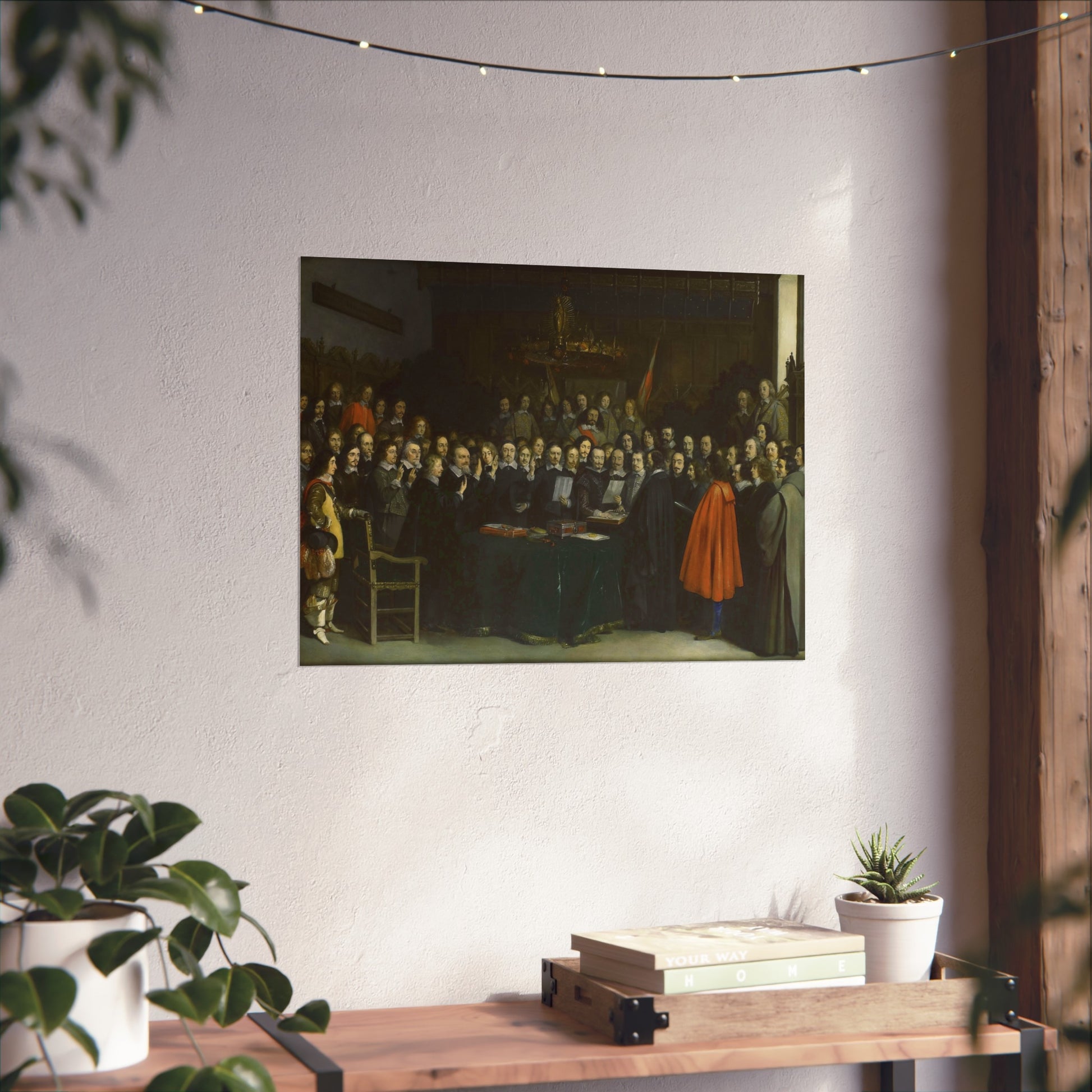 This momentous painting depicts the signing of the peace treaty between Spain and the United Netherlands in the town hall of Münster on May 15, 1648. The scene is centered around a table where the representatives from both nations stand. These include notable figures such as Gaspar de Bracamonte y Guzman, Count of Peñaranda, Antoine Brun, Barthold van Gent, Lord of Meynerswijck, Johan van Mathenes, Adriaen Pauw, Frans van Donia, Willem van Ripperda, and Adriaen Clant. Interestingly, the artist has included a self-portrait on the far left of the painting.