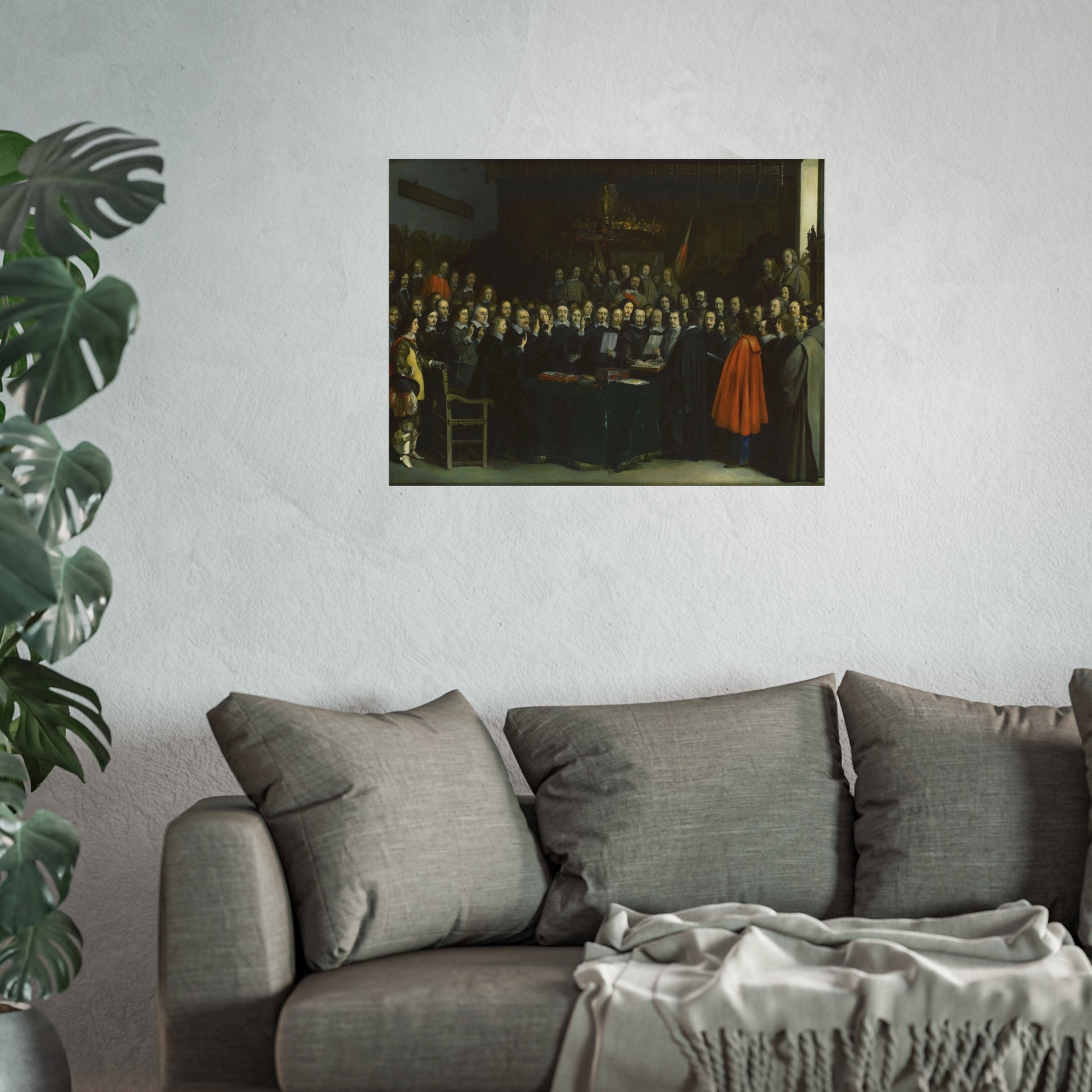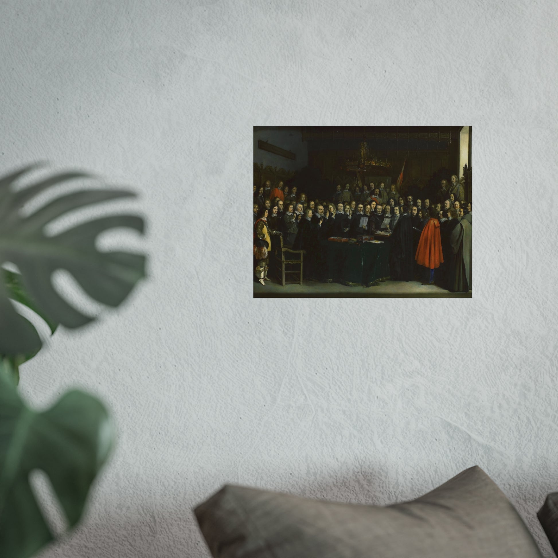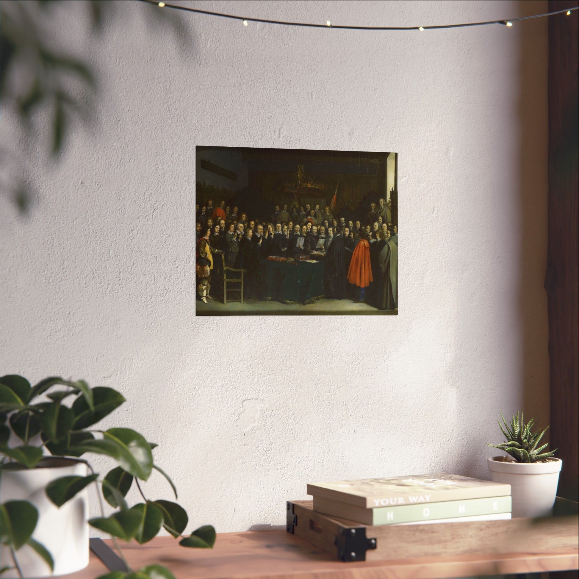 This momentous painting depicts the signing of the peace treaty between Spain and the United Netherlands in the town hall of Münster on May 15, 1648. The scene is centered around a table where the representatives from both nations stand. These include notable figures such as Gaspar de Bracamonte y Guzman, Count of Peñaranda, Antoine Brun, Barthold van Gent, Lord of Meynerswijck, Johan van Mathenes, Adriaen Pauw, Frans van Donia, Willem van Ripperda, and Adriaen Clant. Interestingly, the artist has included a self-portrait on the far left of the painting.