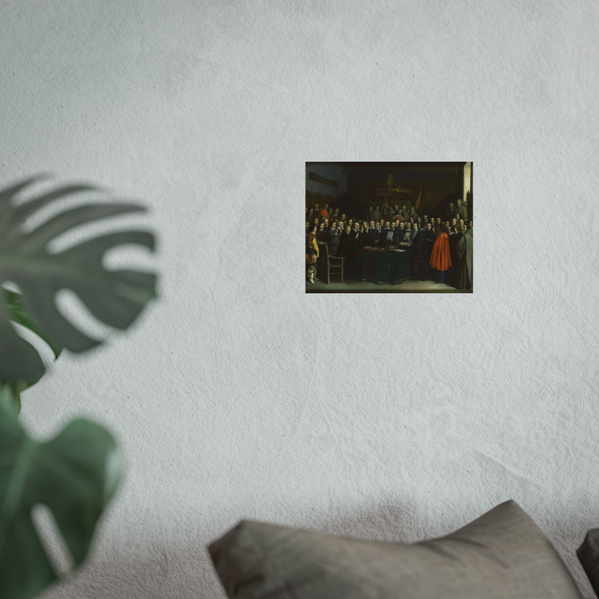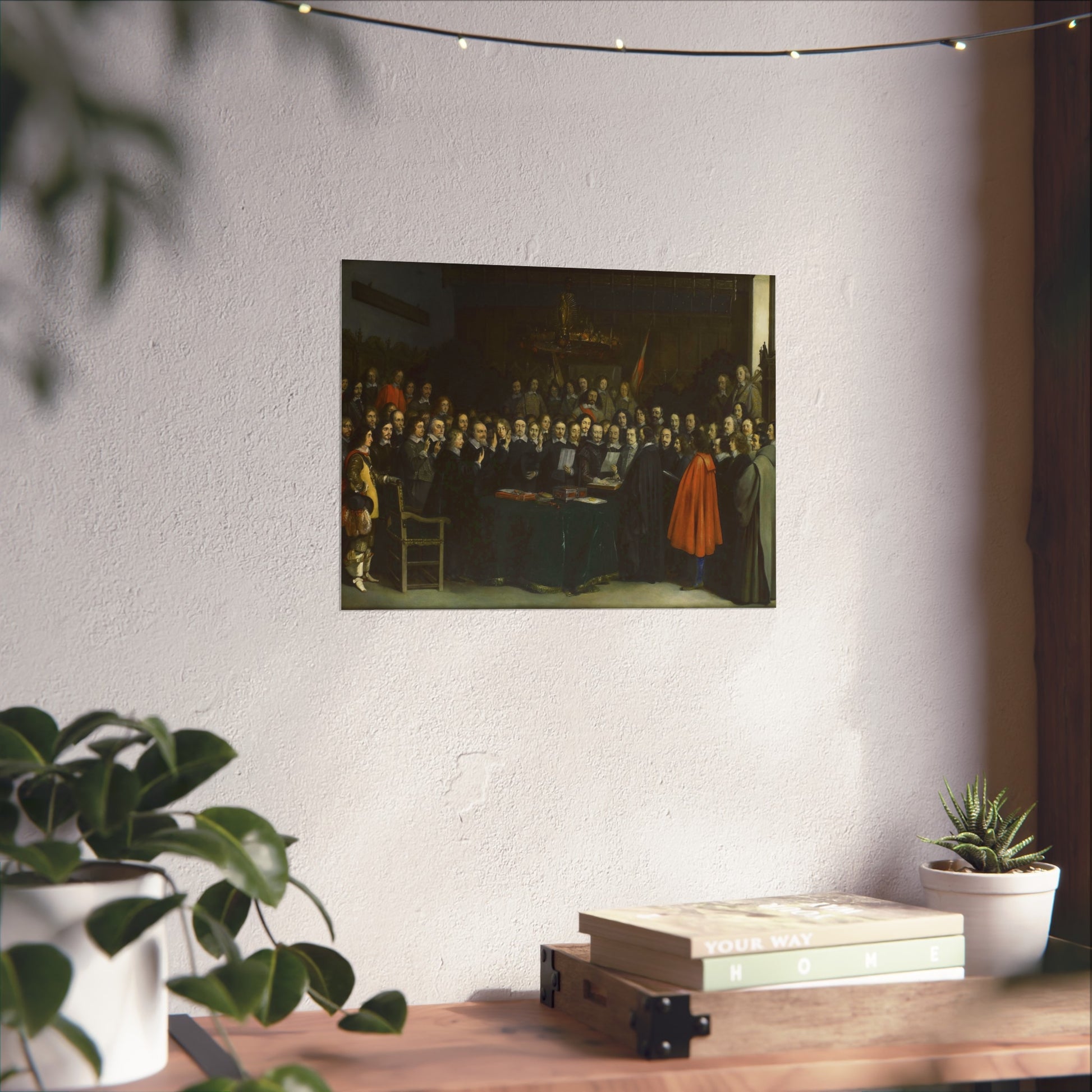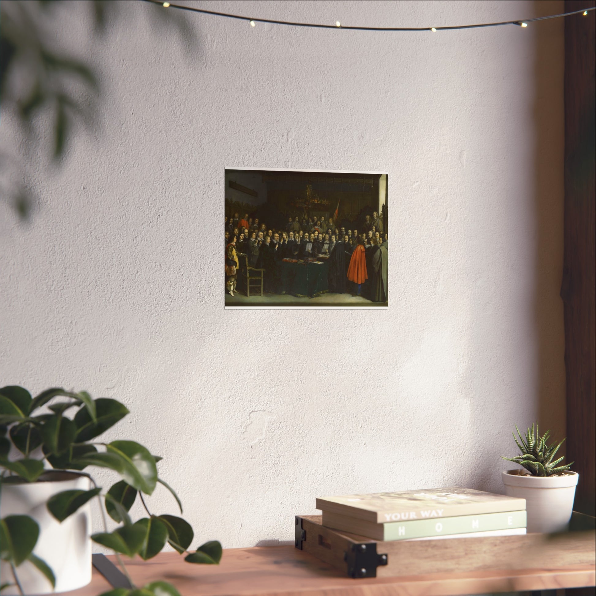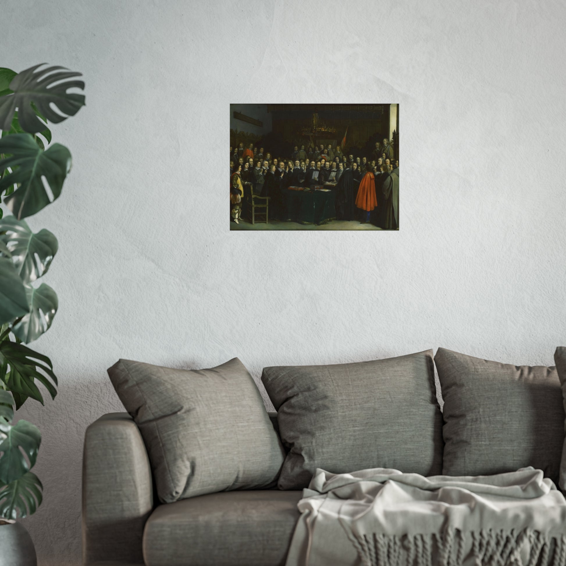 This momentous painting depicts the signing of the peace treaty between Spain and the United Netherlands in the town hall of Münster on May 15, 1648. The scene is centered around a table where the representatives from both nations stand. These include notable figures such as Gaspar de Bracamonte y Guzman, Count of Peñaranda, Antoine Brun, Barthold van Gent, Lord of Meynerswijck, Johan van Mathenes, Adriaen Pauw, Frans van Donia, Willem van Ripperda, and Adriaen Clant. Interestingly, the artist has included a self-portrait on the far left of the painting.