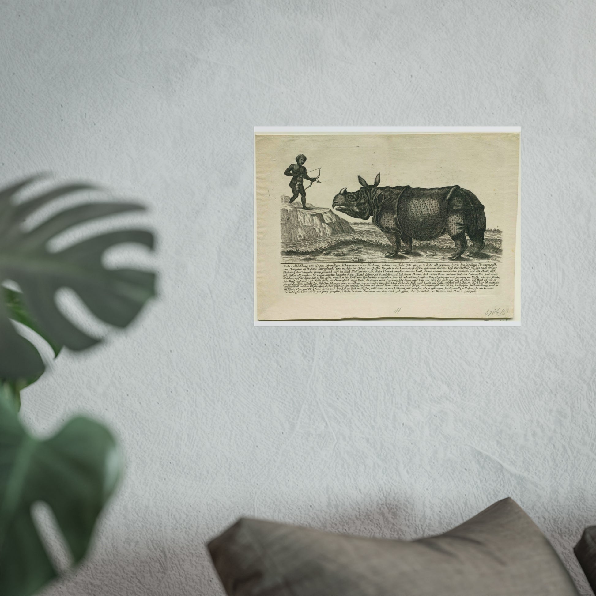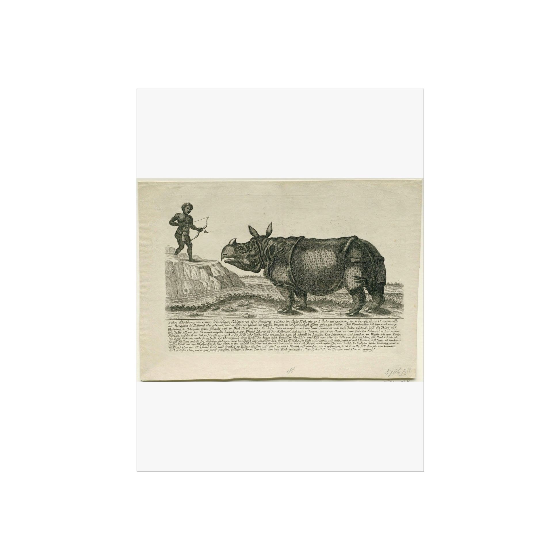 A majestic rhinoceros stands proudly against a lush landscape. To the left, a man of African descent is depicted with a bow and arrow. This rhinoceros, named Clara, was captured in 1738 and sold to VOC captain Douwe Mout in 1740. From 1746 onwards, Clara was showcased to the European public. This painting includes a German inscription.