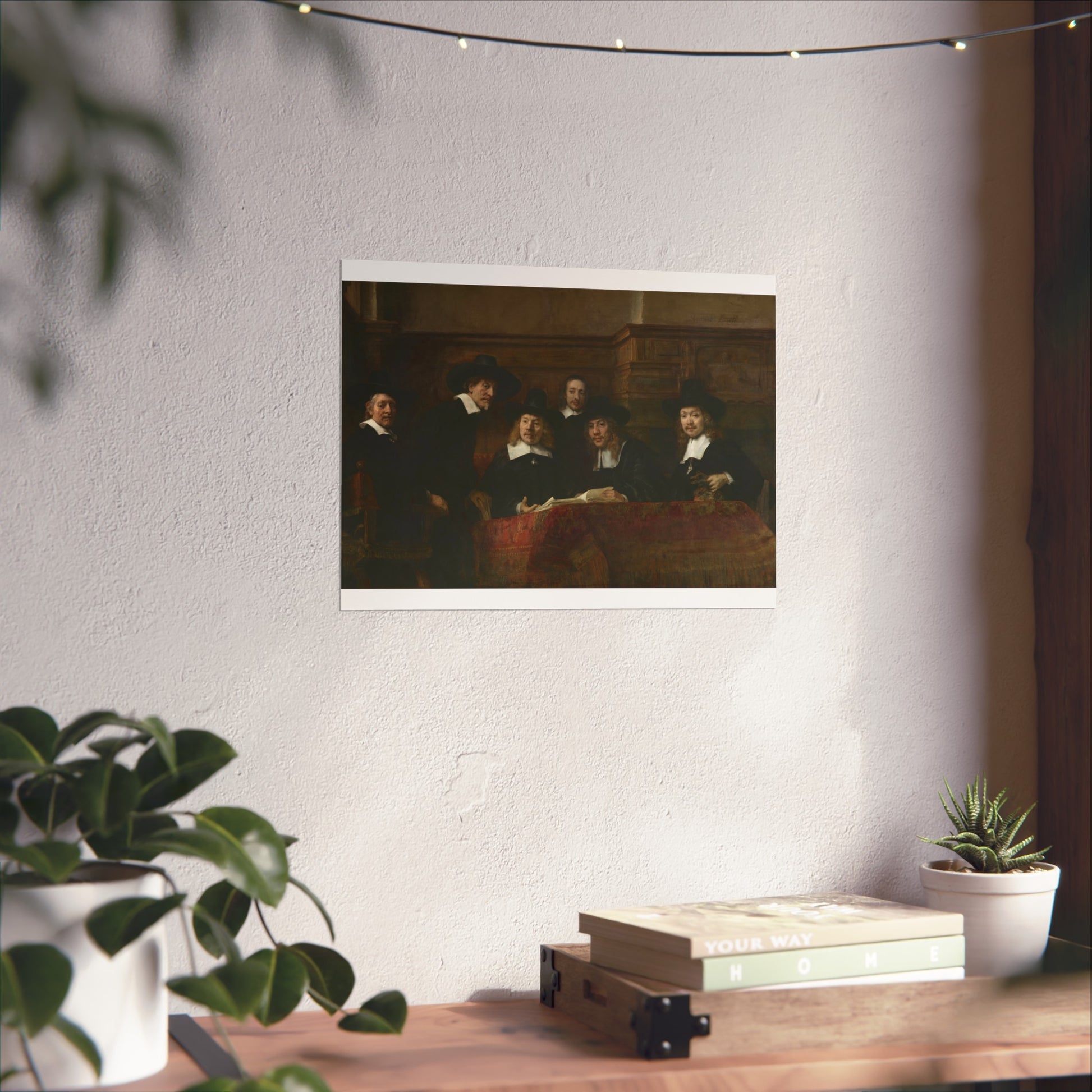 Gathered around a table adorned with a Persian rug, the sampling officials of the Amsterdam Drapers’ Guild, known as 'The Syndics', examine their open sample book. Depicted from left to right are Jacob van Loon (1595-1674), Volckert Jansz (1605/10-1681), Willem van Doeyenburg (c. 1616-1687), the assistant Frans Hendricksz Bel (1629-1701), Aernout van der Mye (c. 1625-1681), and Jochem de Neve (1629-1681). Above the fireplace on the right hangs a painting of a burning beacon.