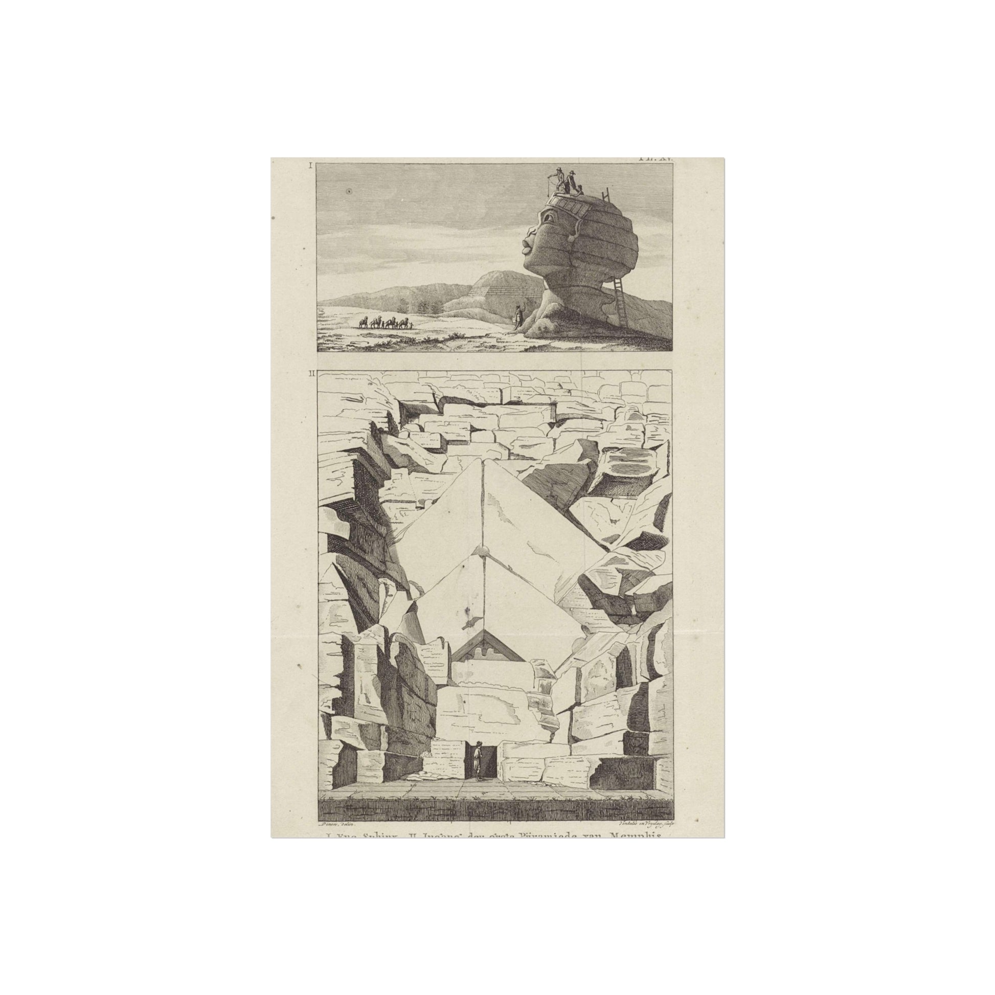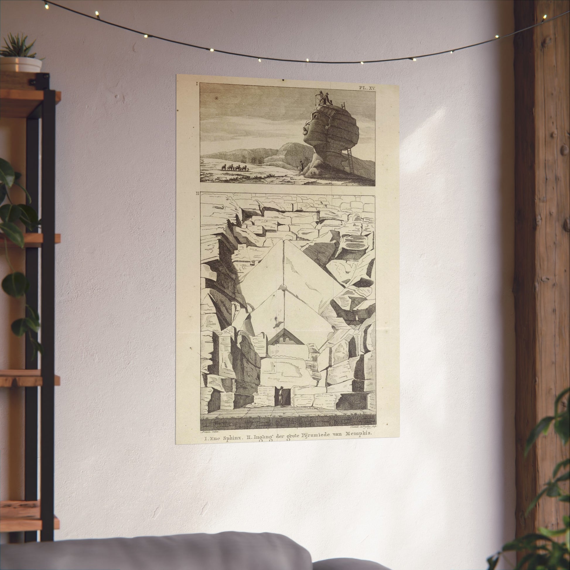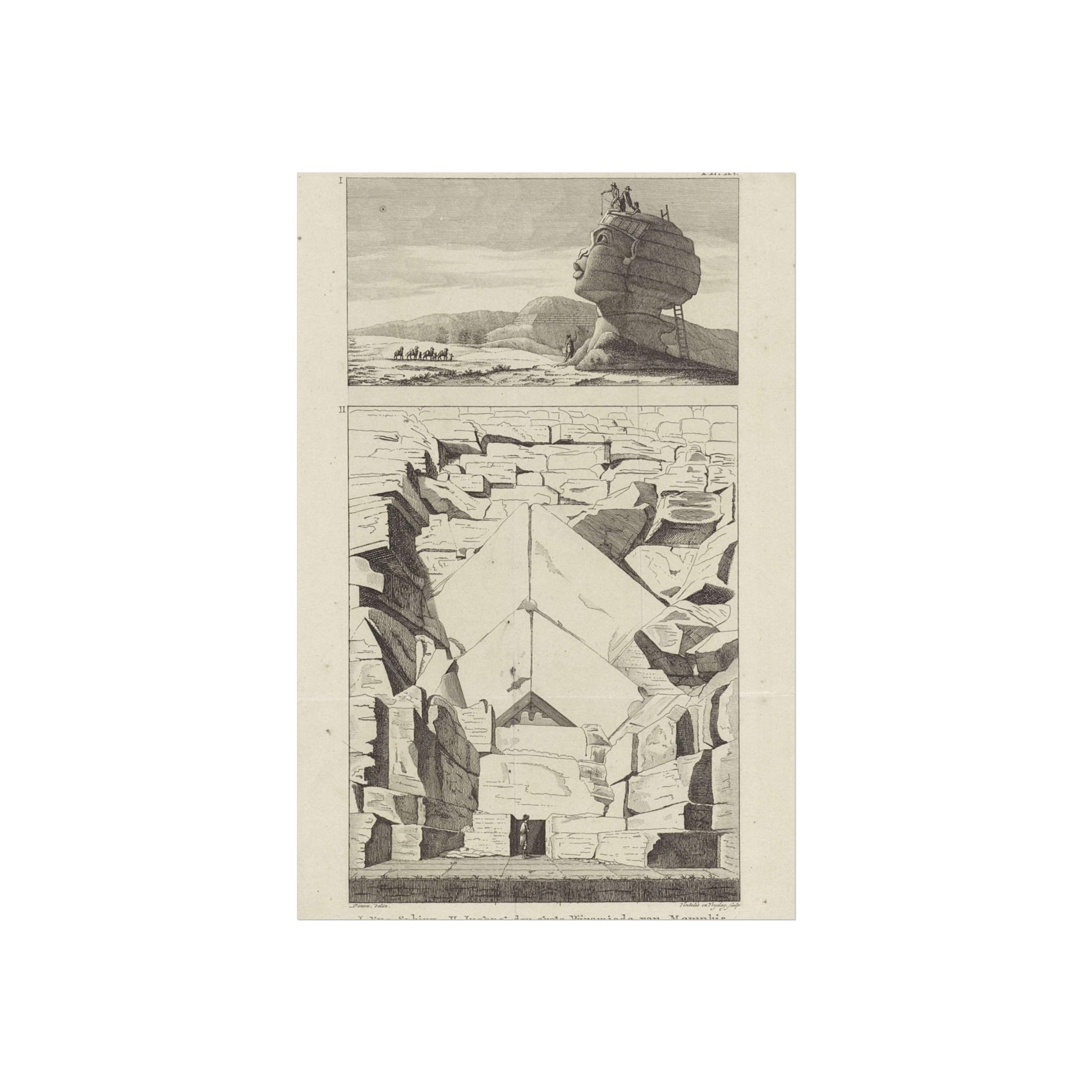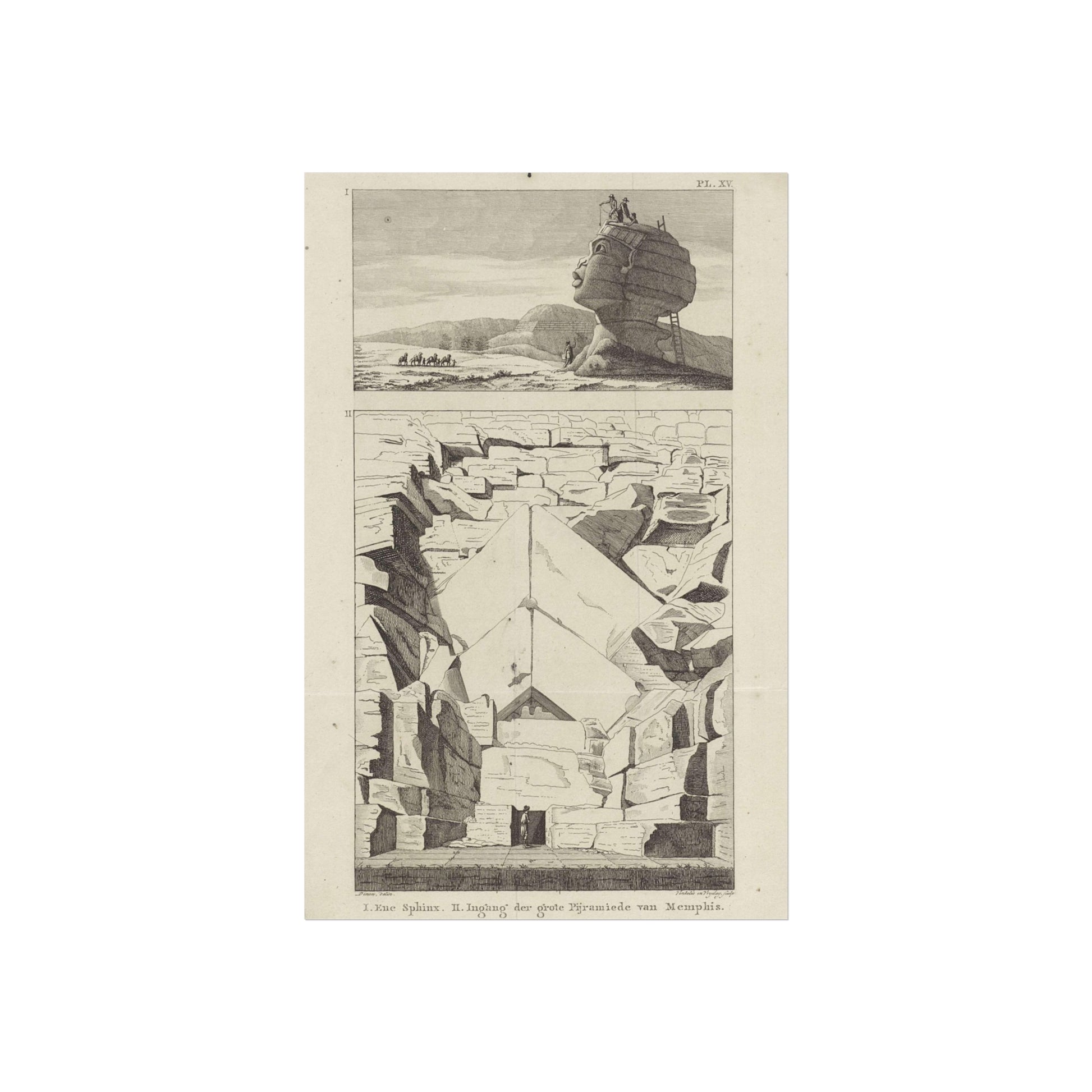 This captivating piece of art features two scenes on a single canvas. The top scene showcases figures marvelling at the grandeur of the Sphinx of Giza, while the bottom scene offers a glimpse of the entrance to the Pyramid of Memphis in Egypt. A small detail to note is 'Pl.XV' inscribed in the upper right corner.