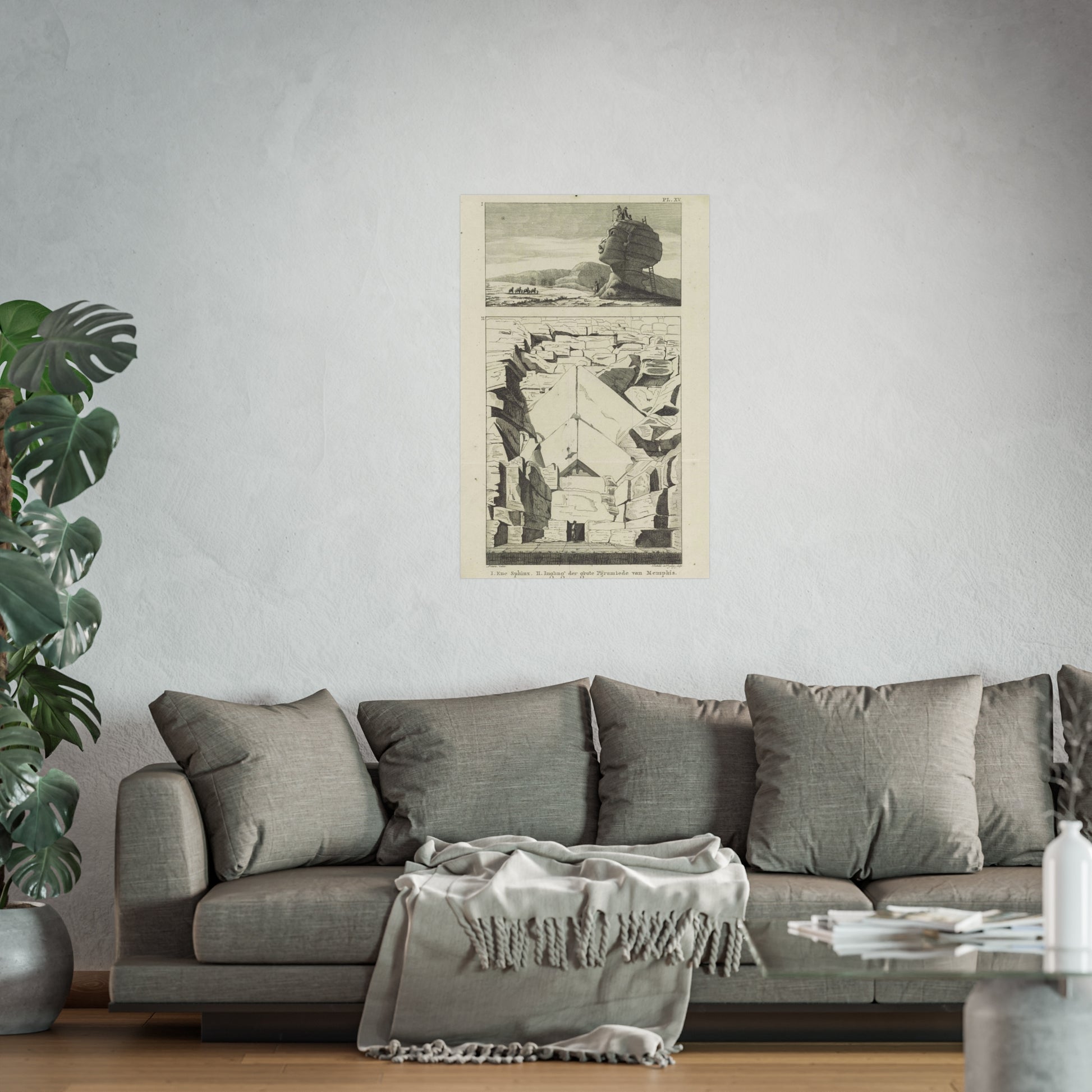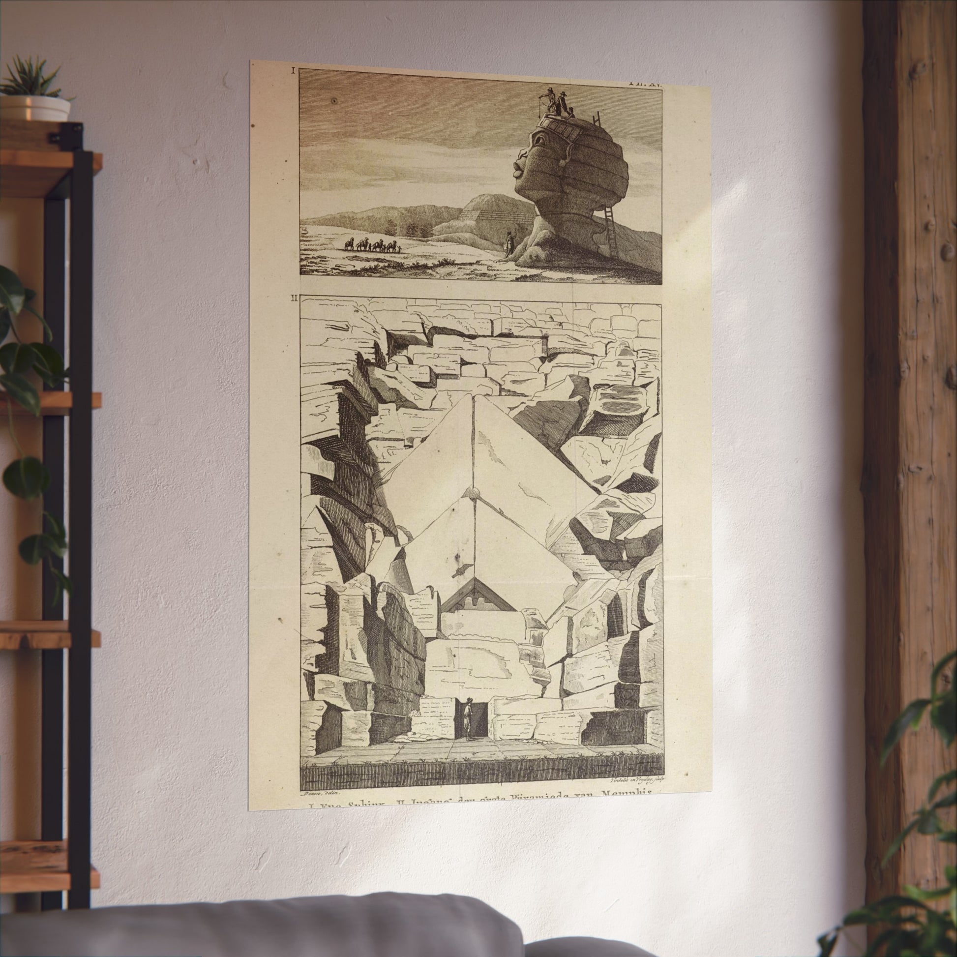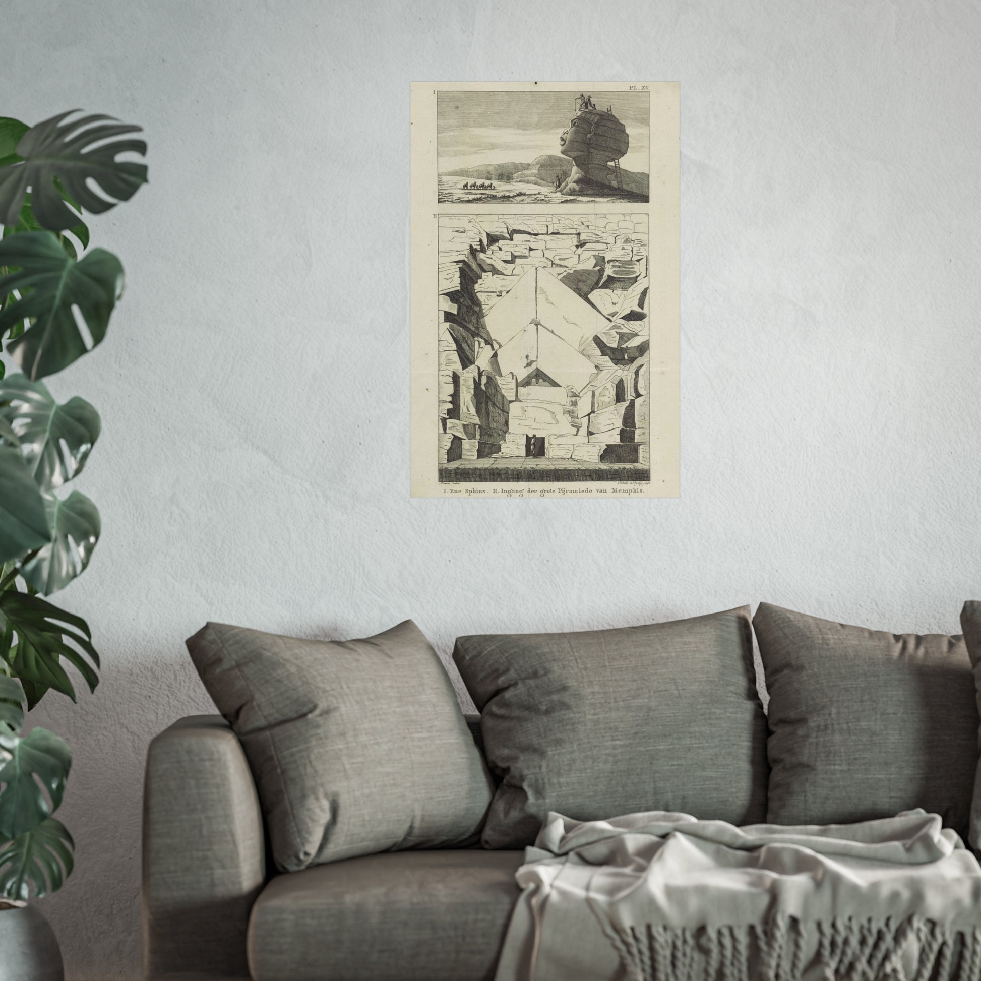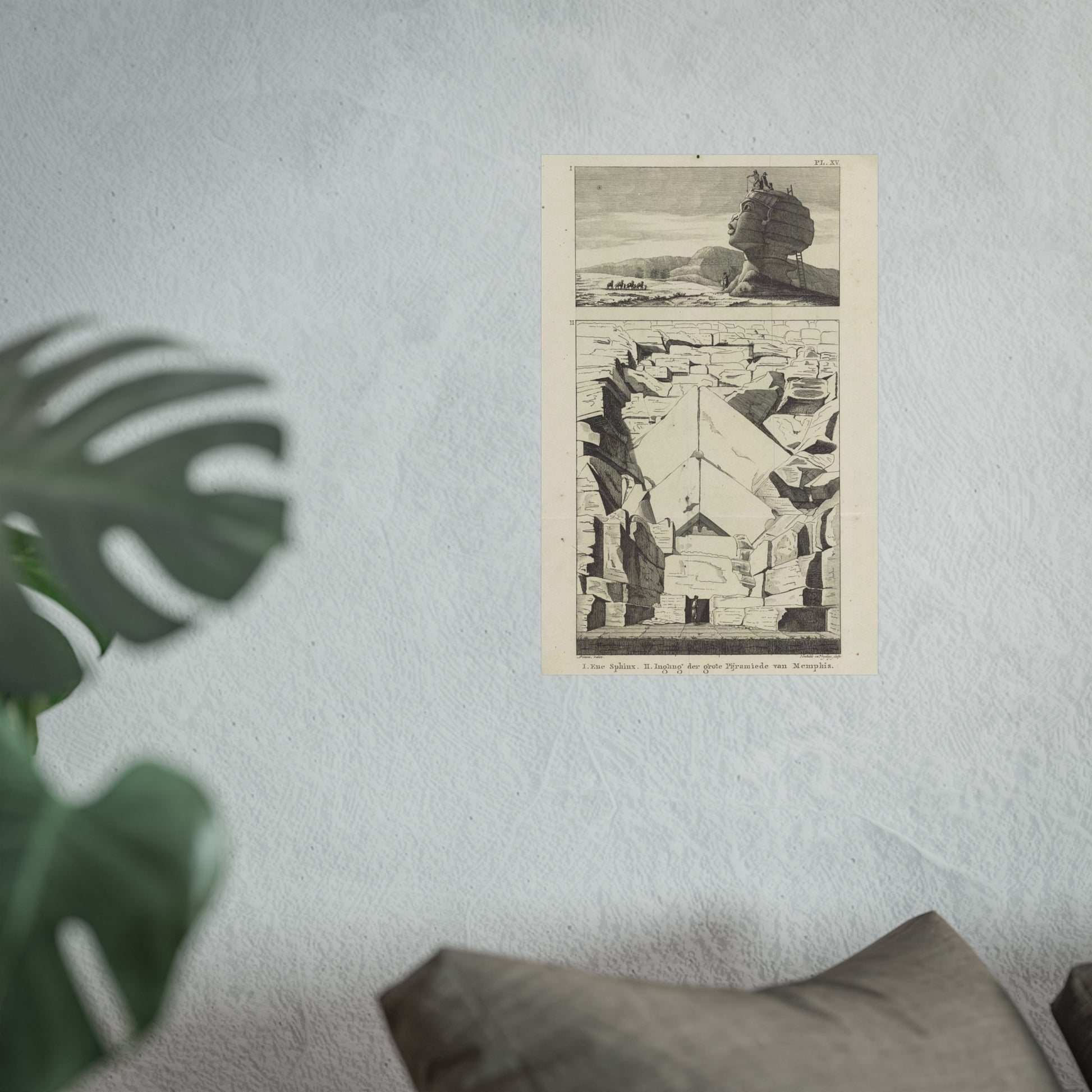 This captivating piece of art features two scenes on a single canvas. The top scene showcases figures marvelling at the grandeur of the Sphinx of Giza, while the bottom scene offers a glimpse of the entrance to the Pyramid of Memphis in Egypt. A small detail to note is 'Pl.XV' inscribed in the upper right corner.