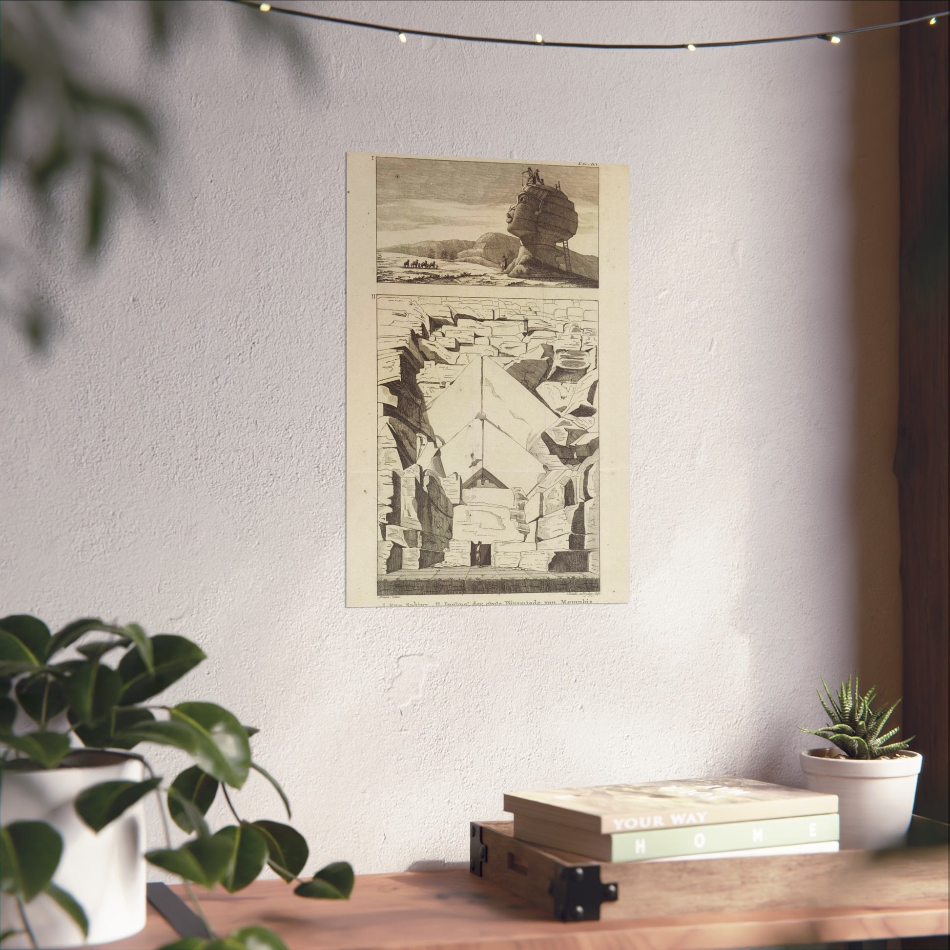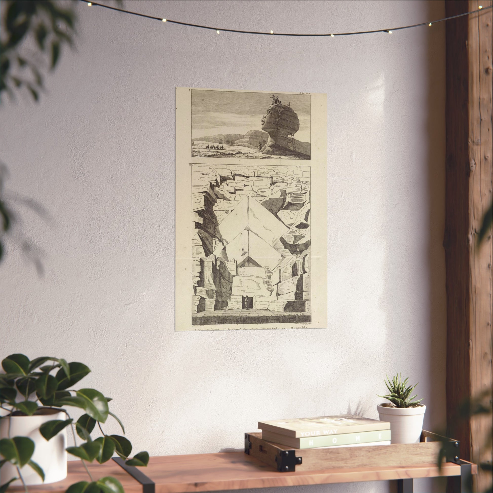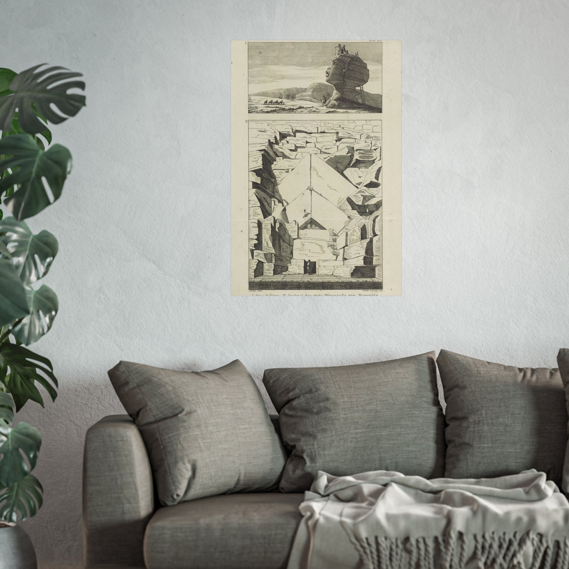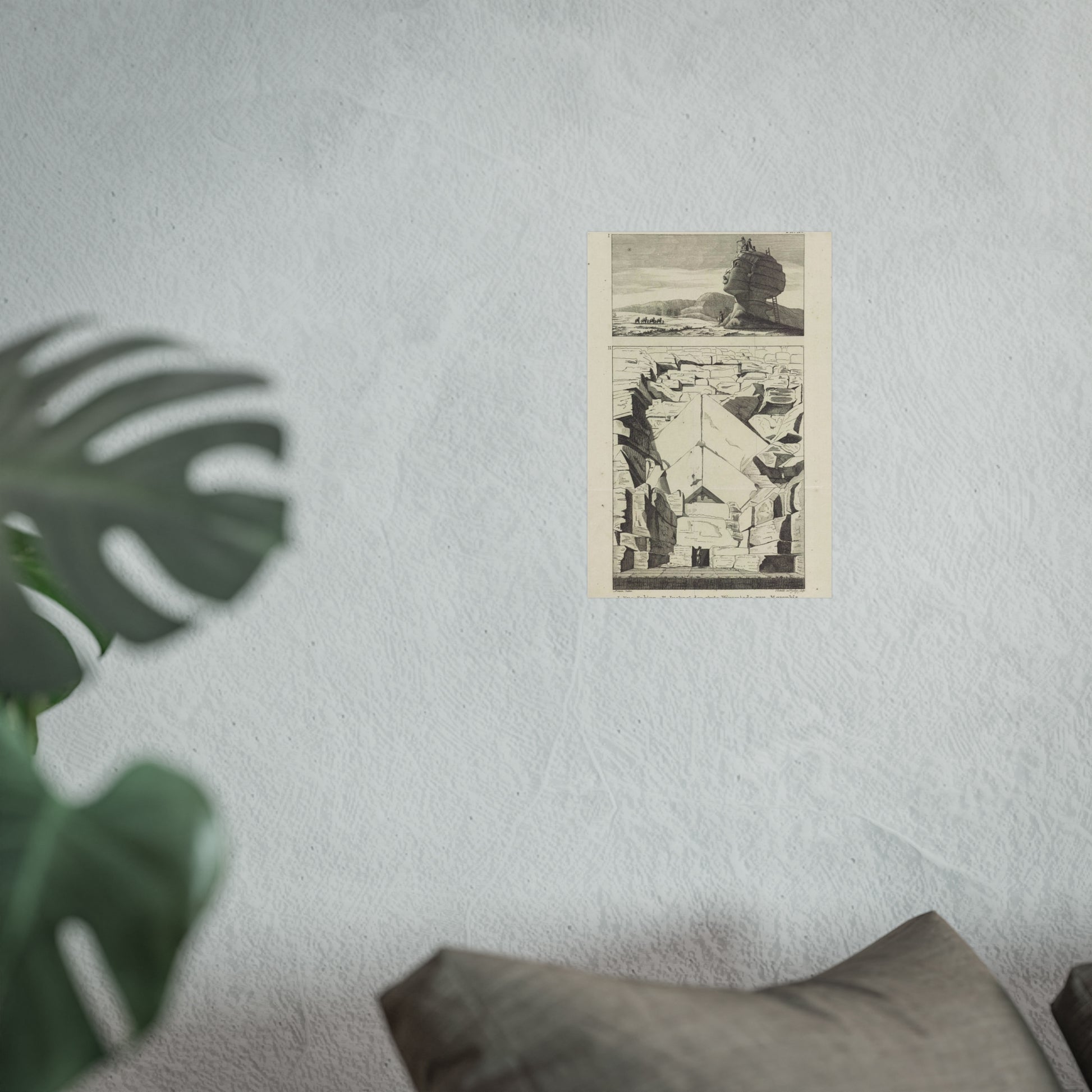 This captivating piece of art features two scenes on a single canvas. The top scene showcases figures marvelling at the grandeur of the Sphinx of Giza, while the bottom scene offers a glimpse of the entrance to the Pyramid of Memphis in Egypt. A small detail to note is 'Pl.XV' inscribed in the upper right corner.