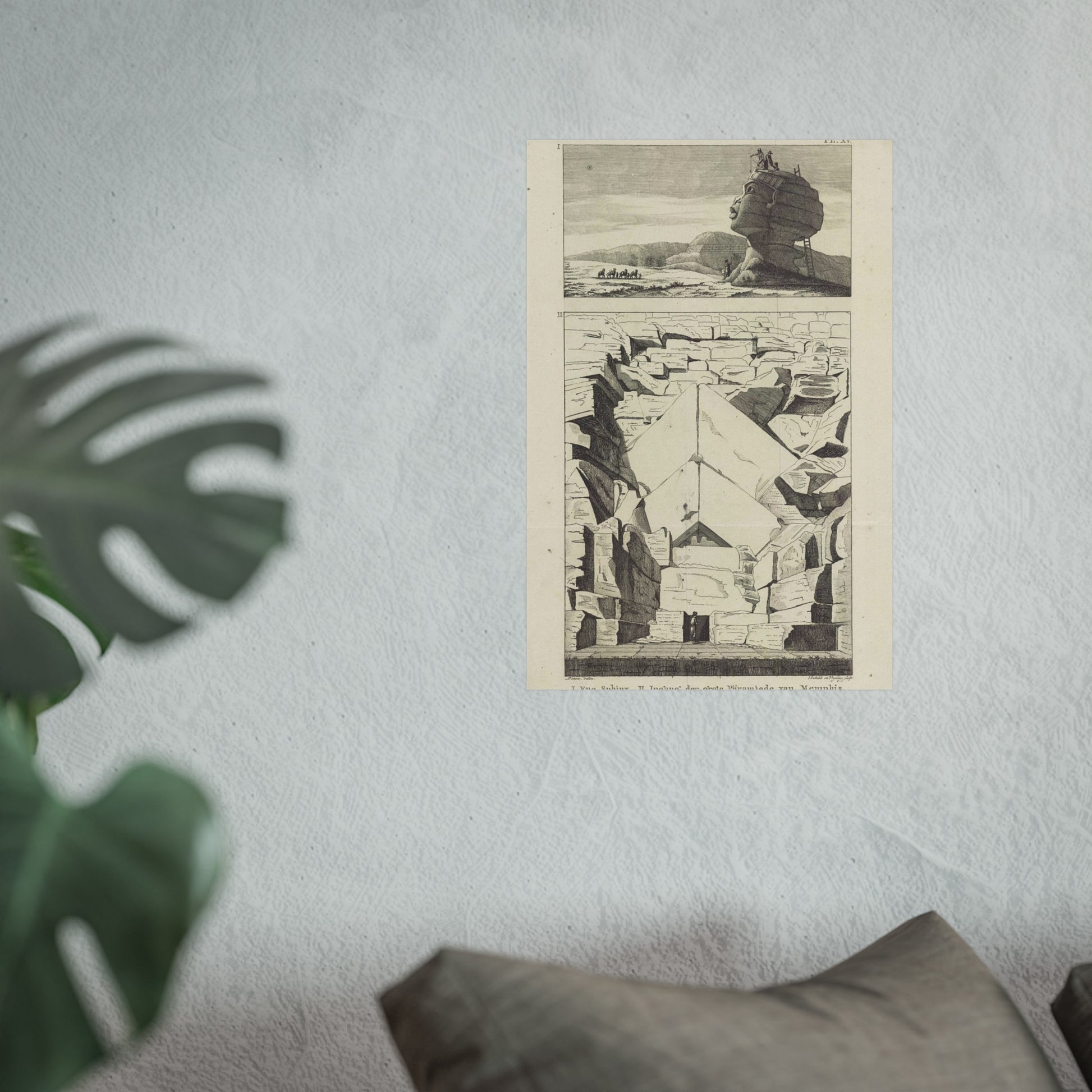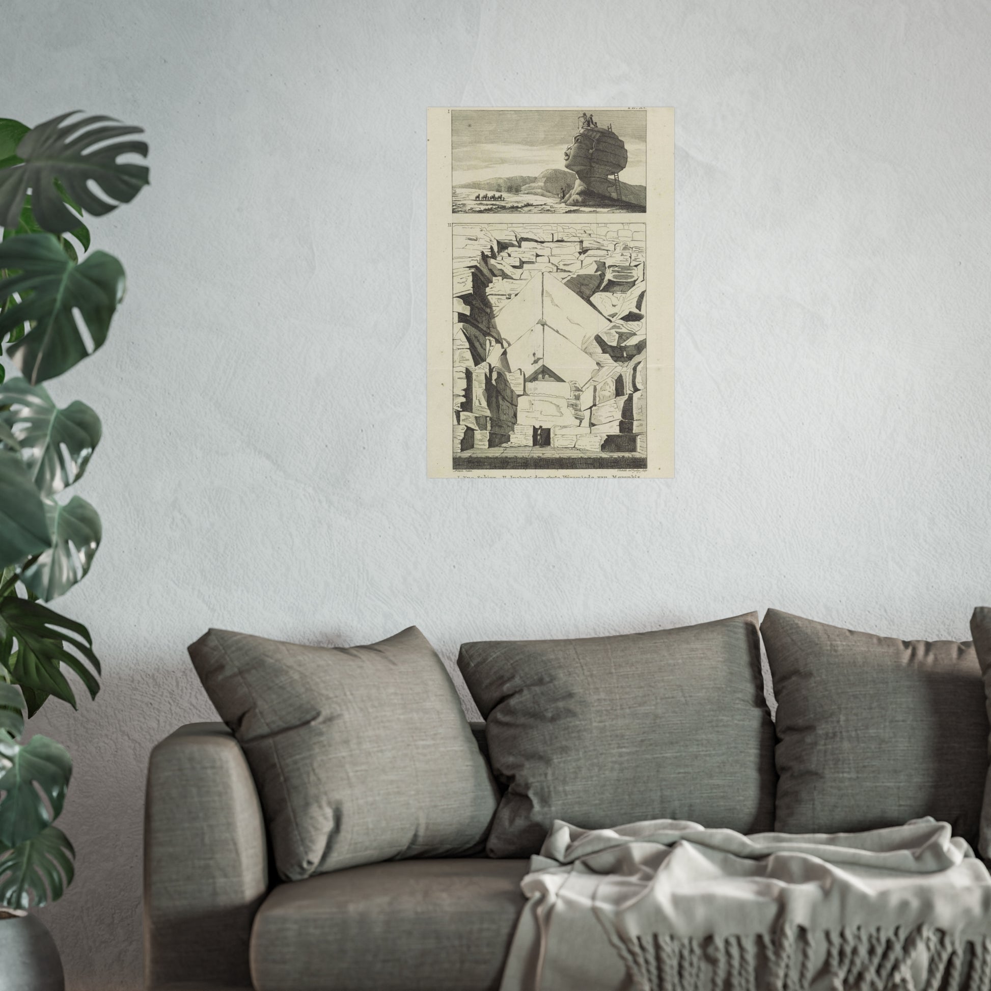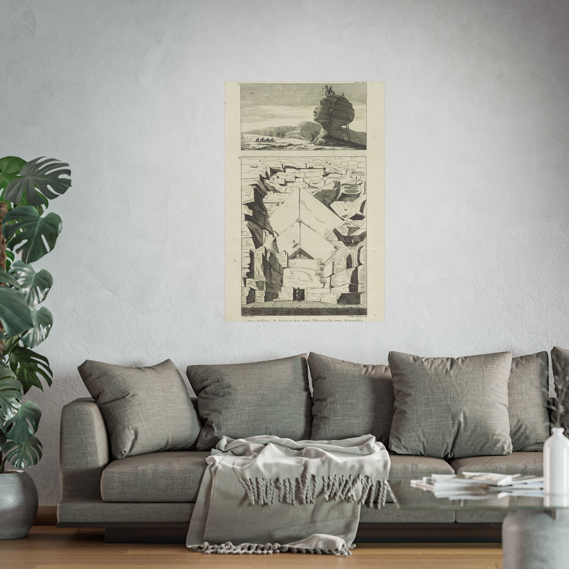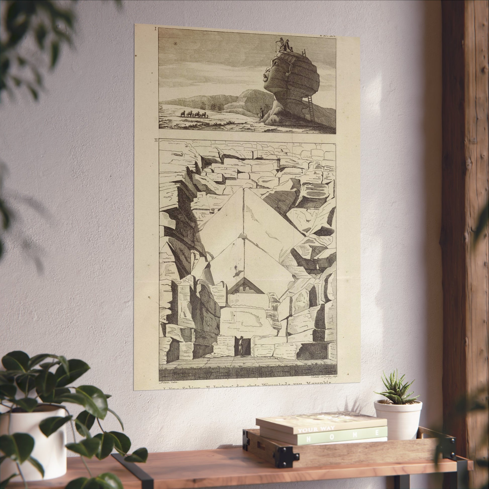 This captivating piece of art features two scenes on a single canvas. The top scene showcases figures marvelling at the grandeur of the Sphinx of Giza, while the bottom scene offers a glimpse of the entrance to the Pyramid of Memphis in Egypt. A small detail to note is 'Pl.XV' inscribed in the upper right corner.