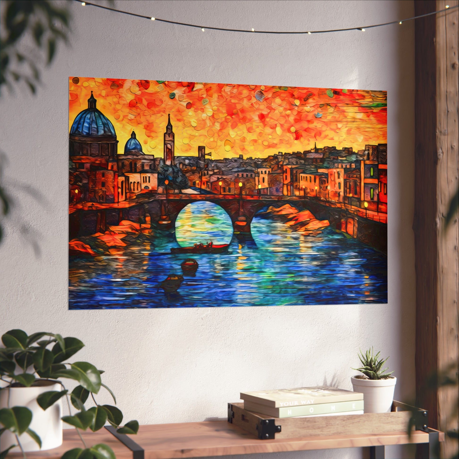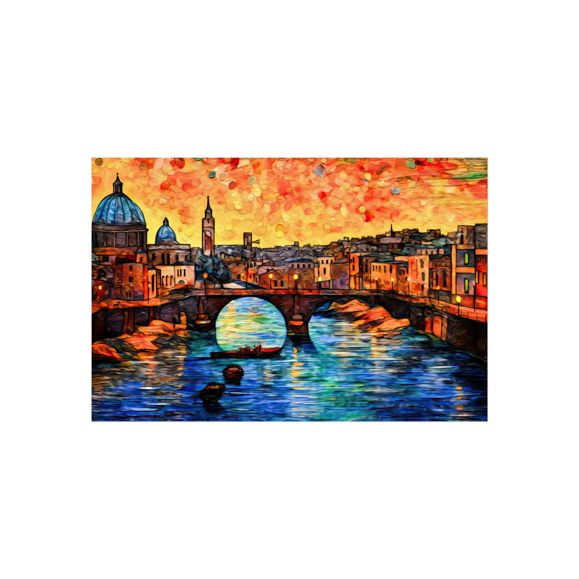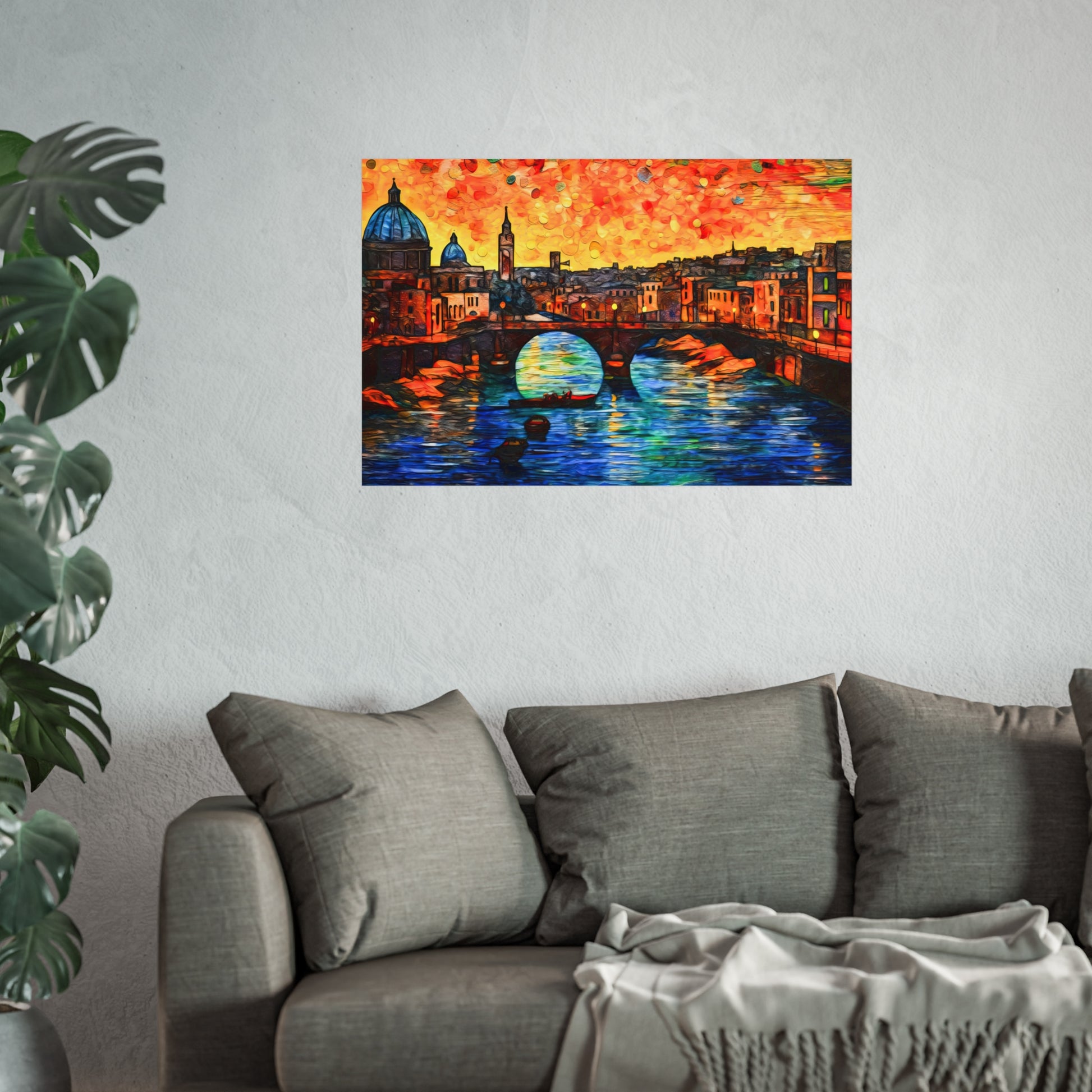 Within the artistic labyrinth of 'The Sun Burns: Our Technology', The Curator weaves a tale that captivates abstract art lovers and lovers of colour. The painting, adorned with domes and a bridge and a stained-glass sky, evoking a 'climate change hot' atmosphere, is a testament to the timeless allure of the unexplored.