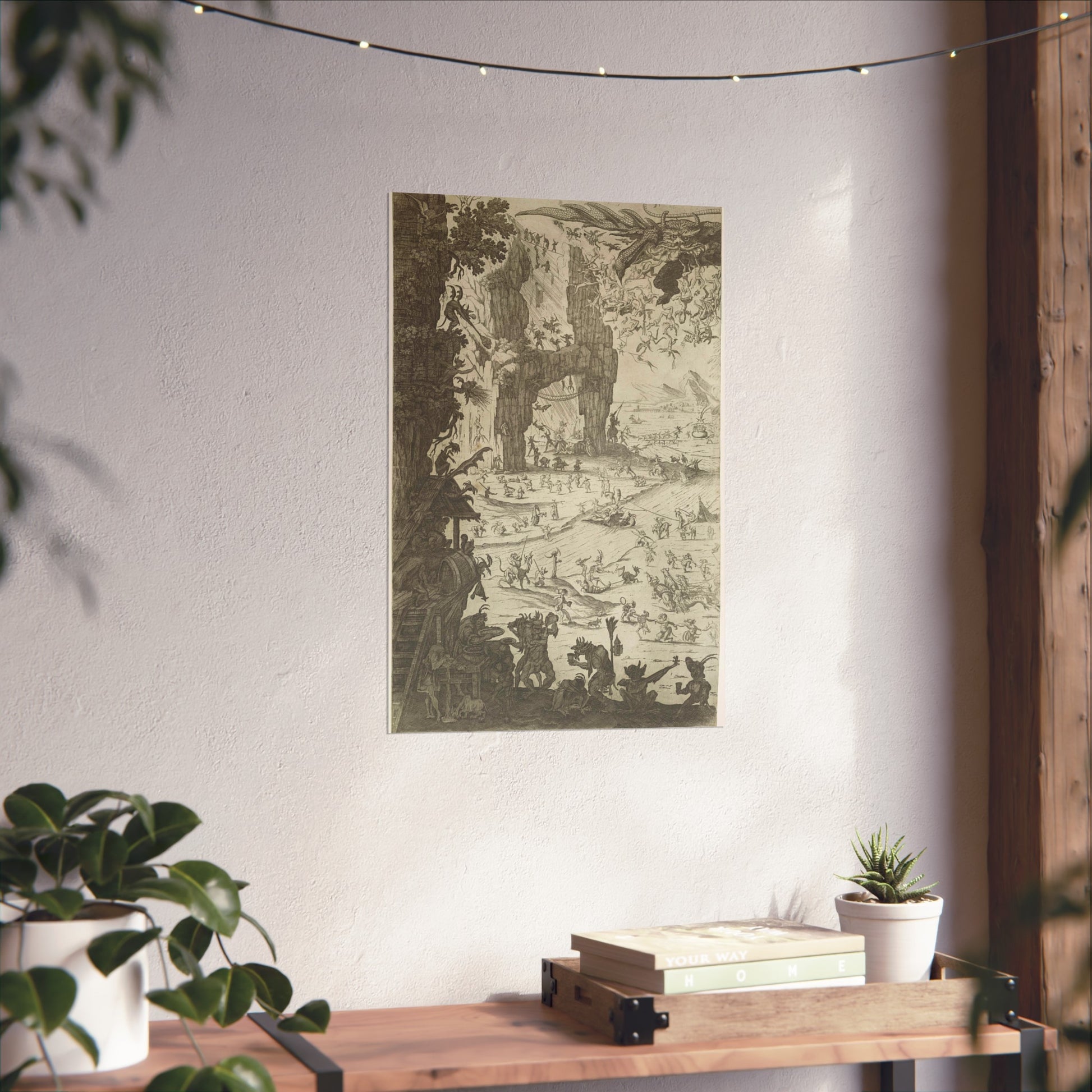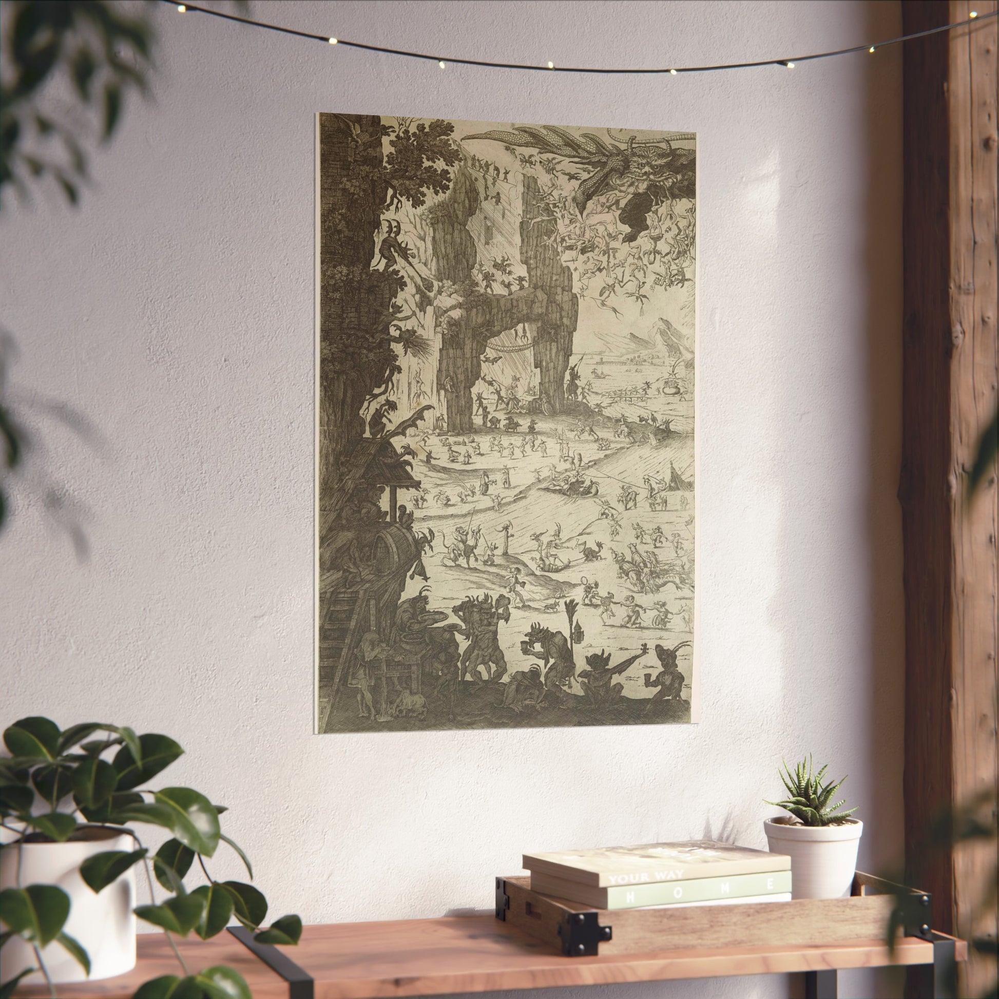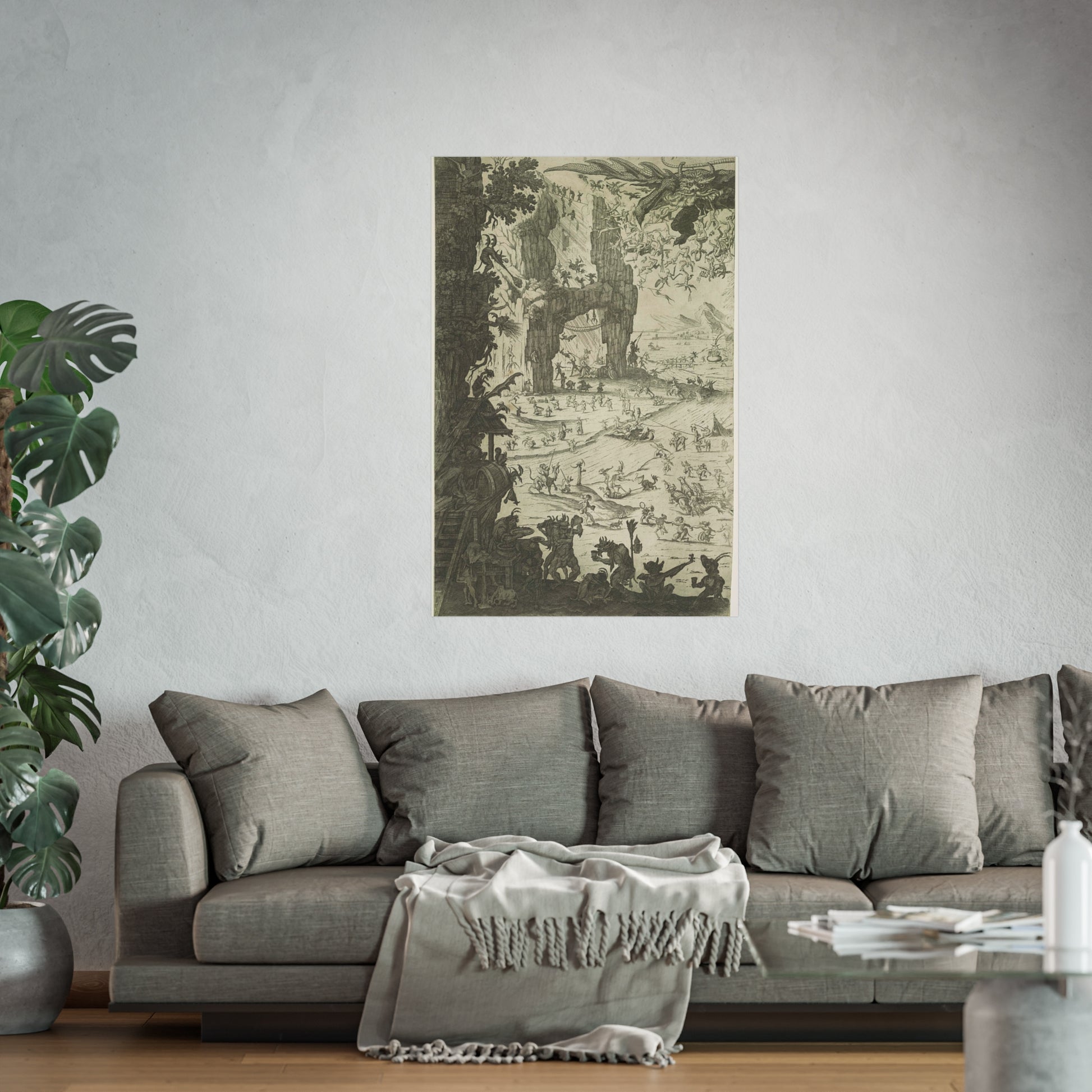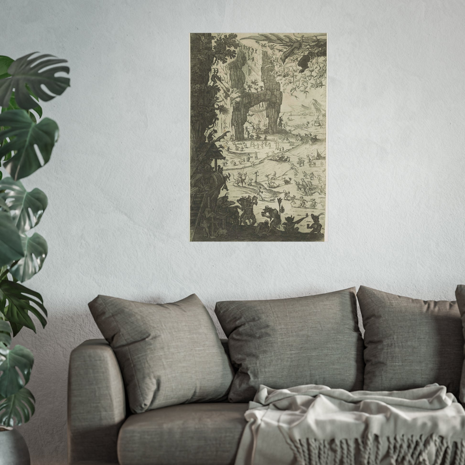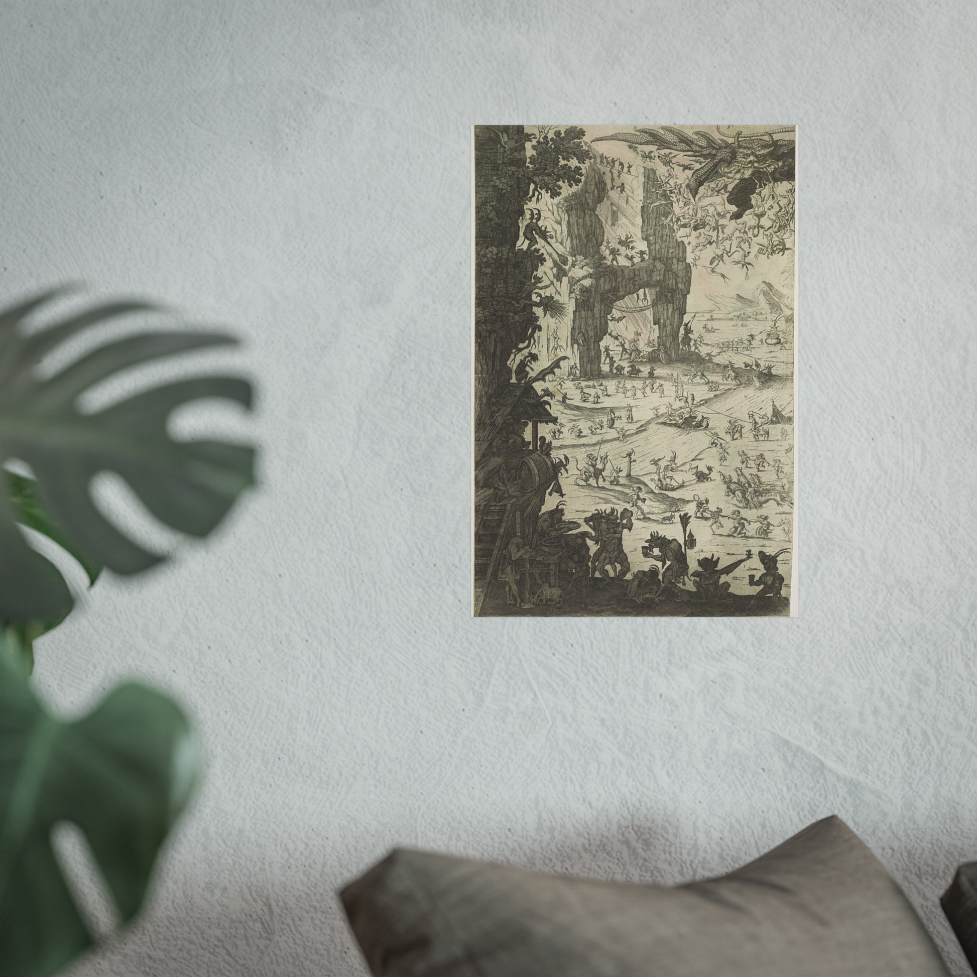 Immerse yourself in this haunting depiction of a rocky landscape teeming with demonic creatures. The scene is dominated by an imposing beast spewing smoke at the center. Tucked away on the left, amidst the craggy terrain, is Saint Anthony, tormented by demons.