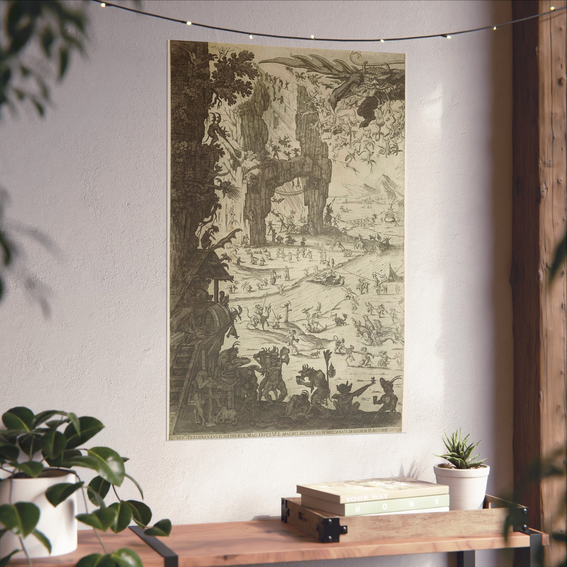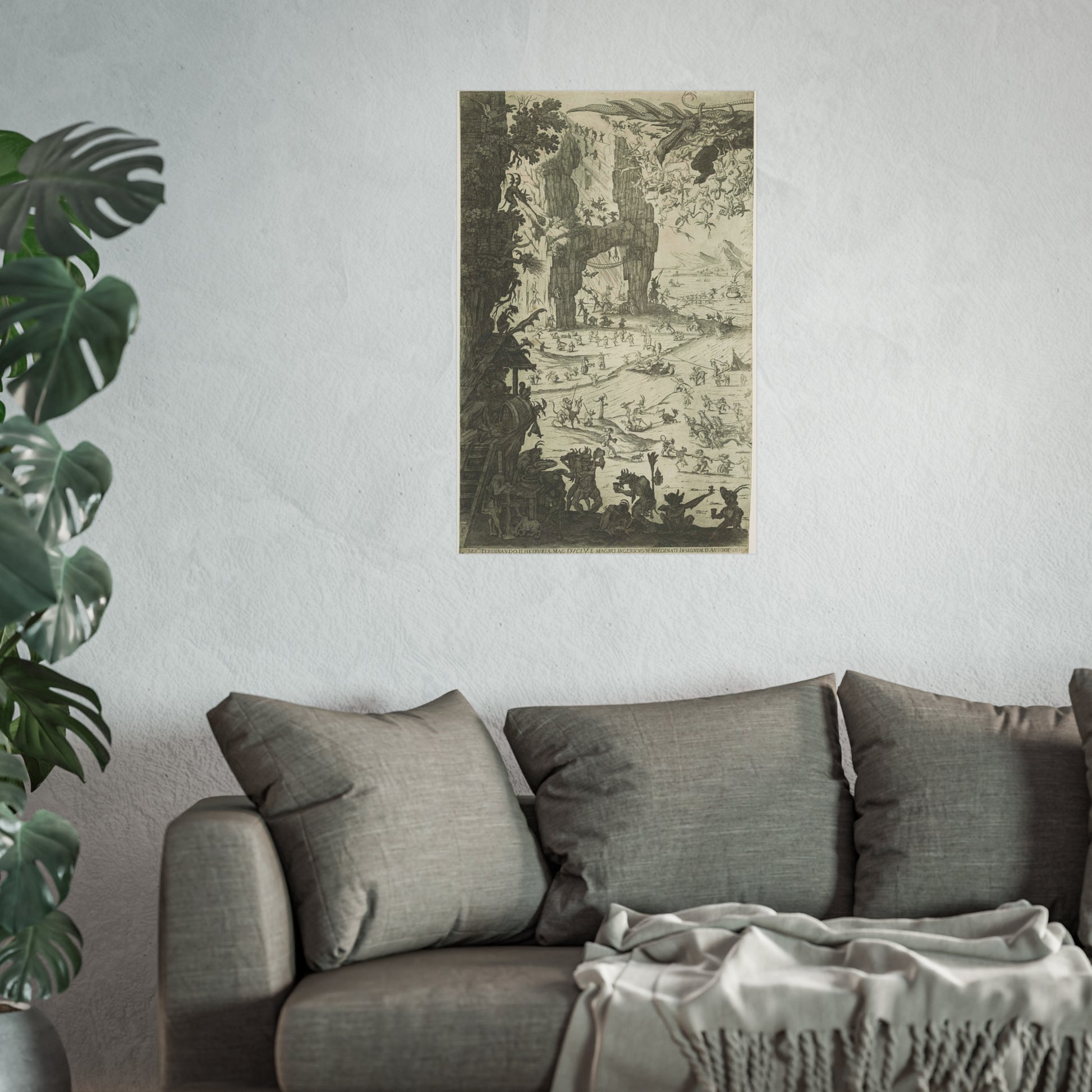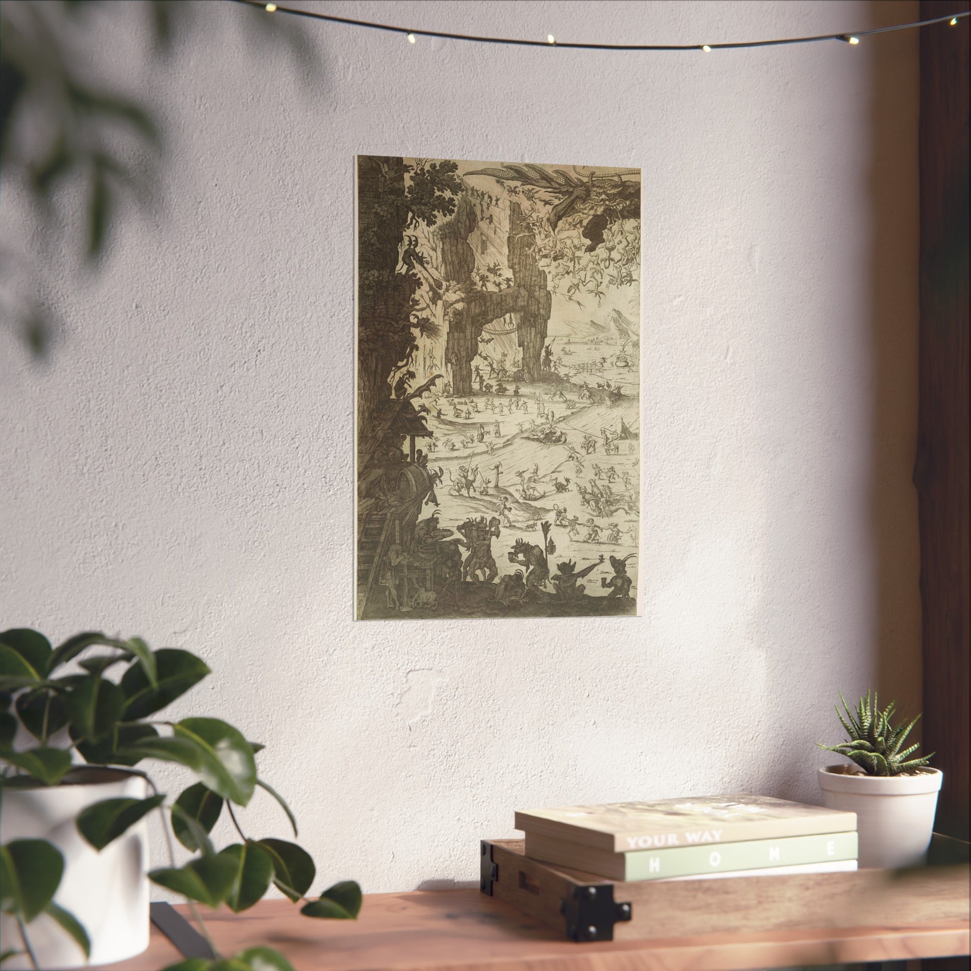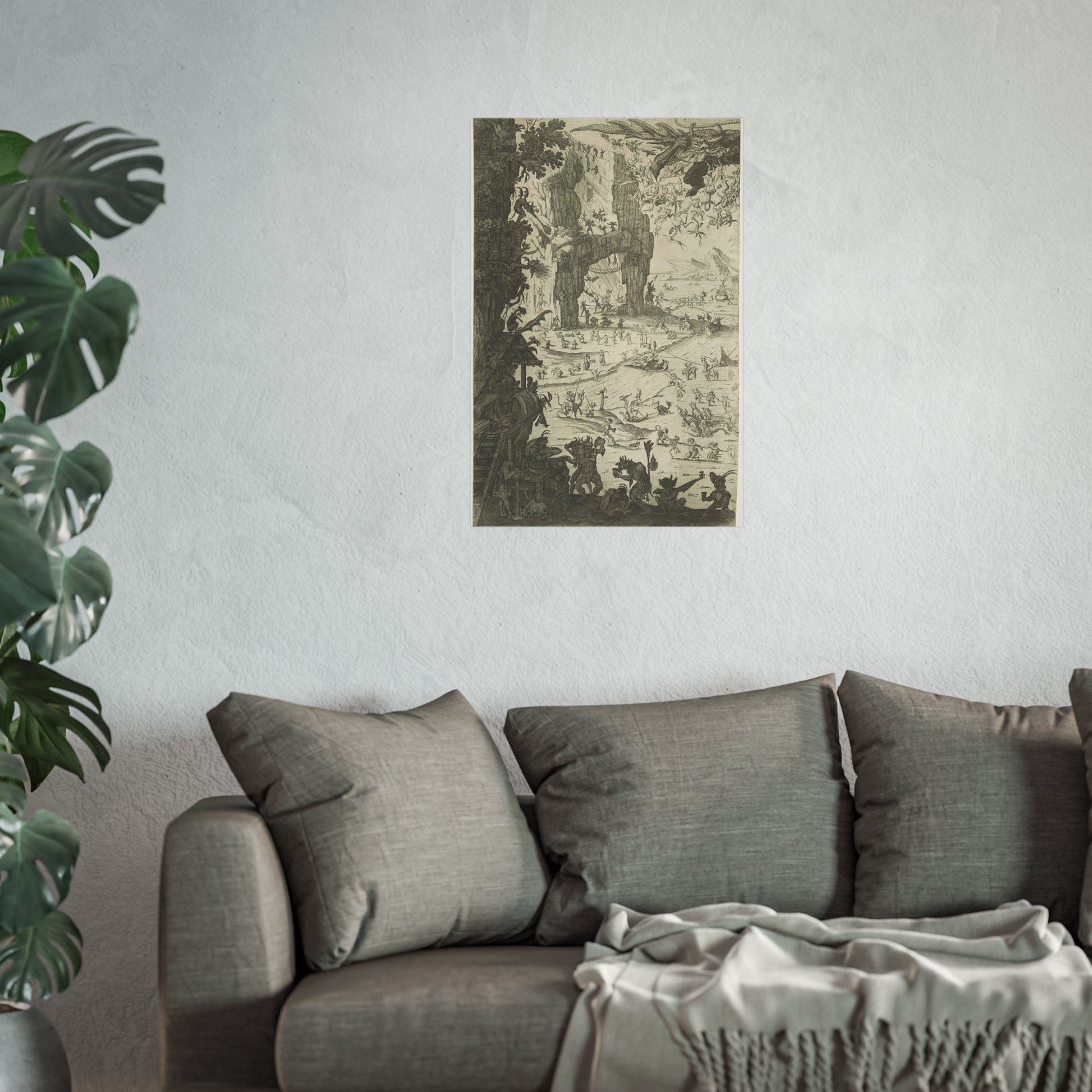 Immerse yourself in this haunting depiction of a rocky landscape teeming with demonic creatures. The scene is dominated by an imposing beast spewing smoke at the center. Tucked away on the left, amidst the craggy terrain, is Saint Anthony, tormented by demons.