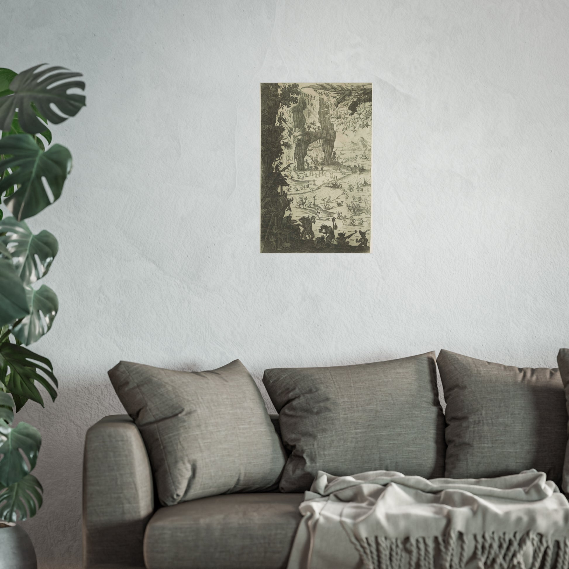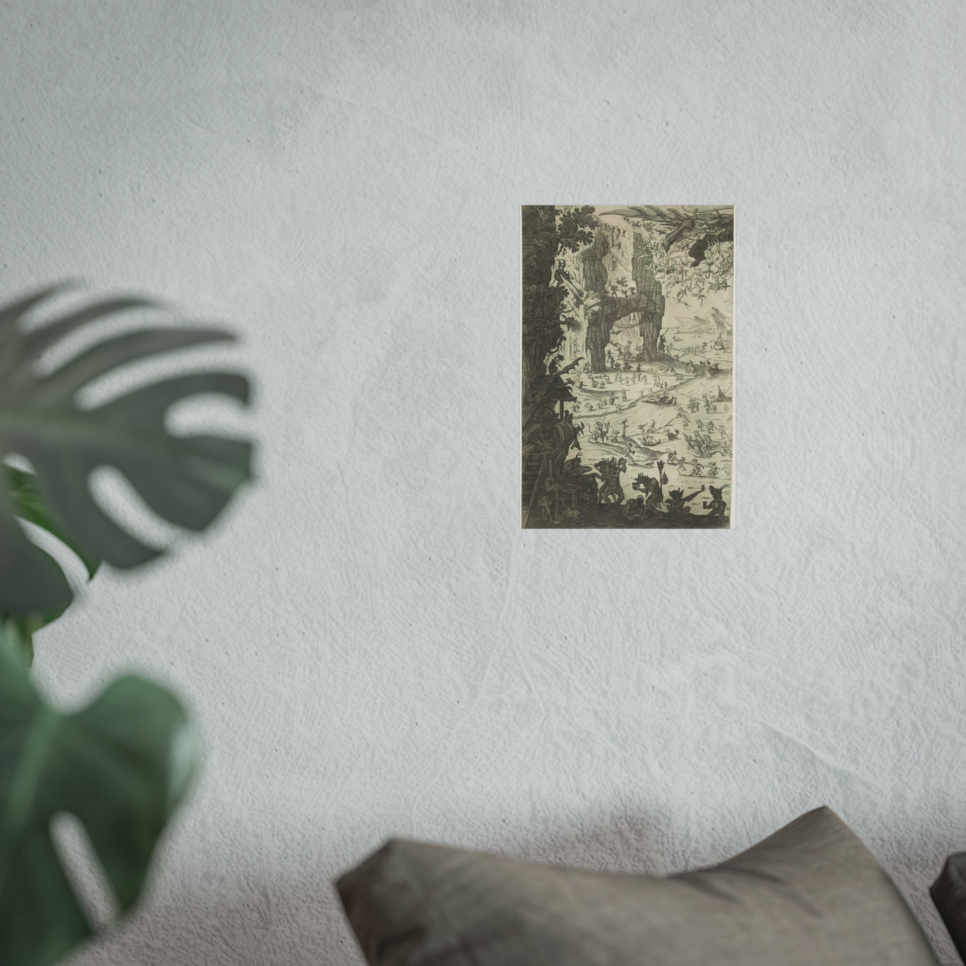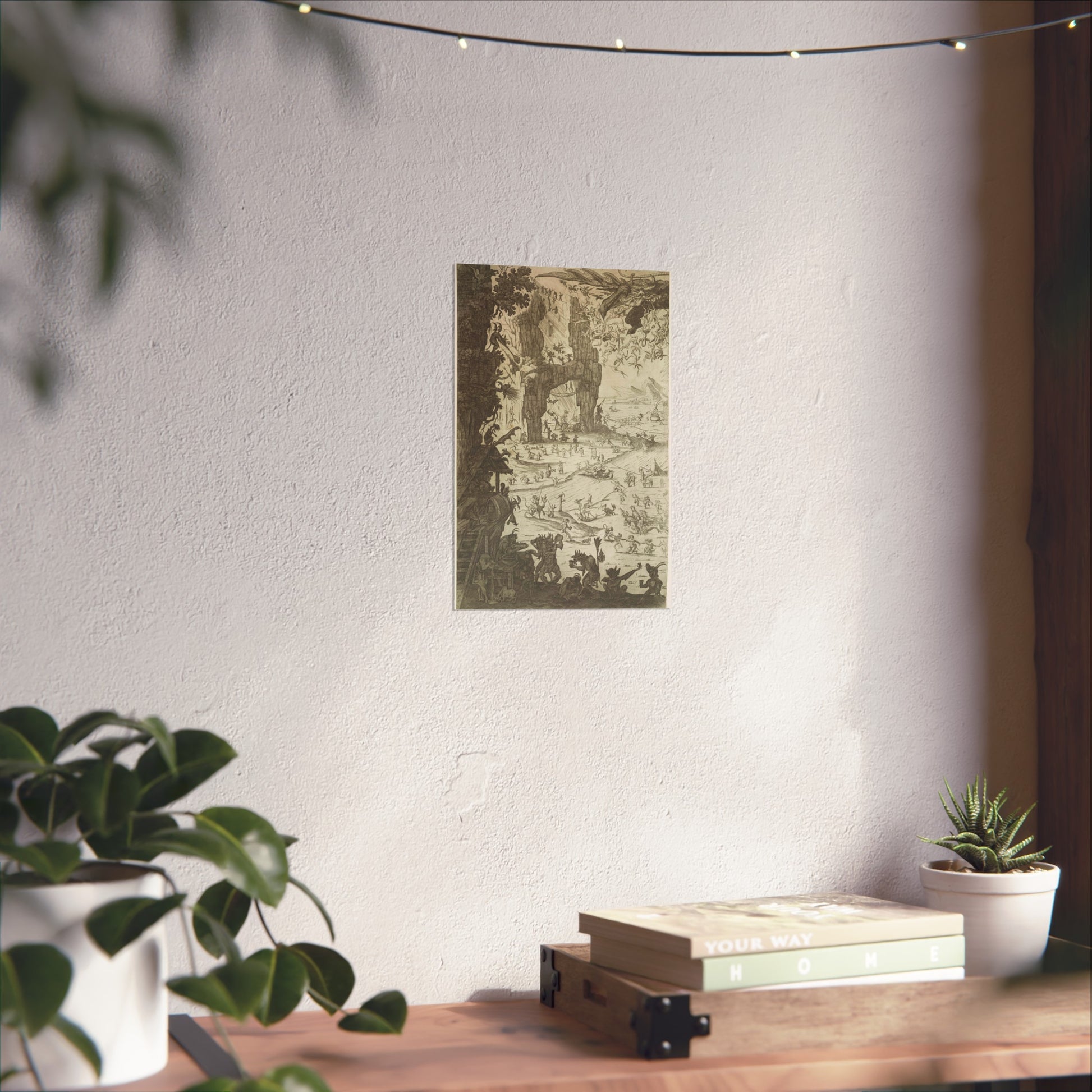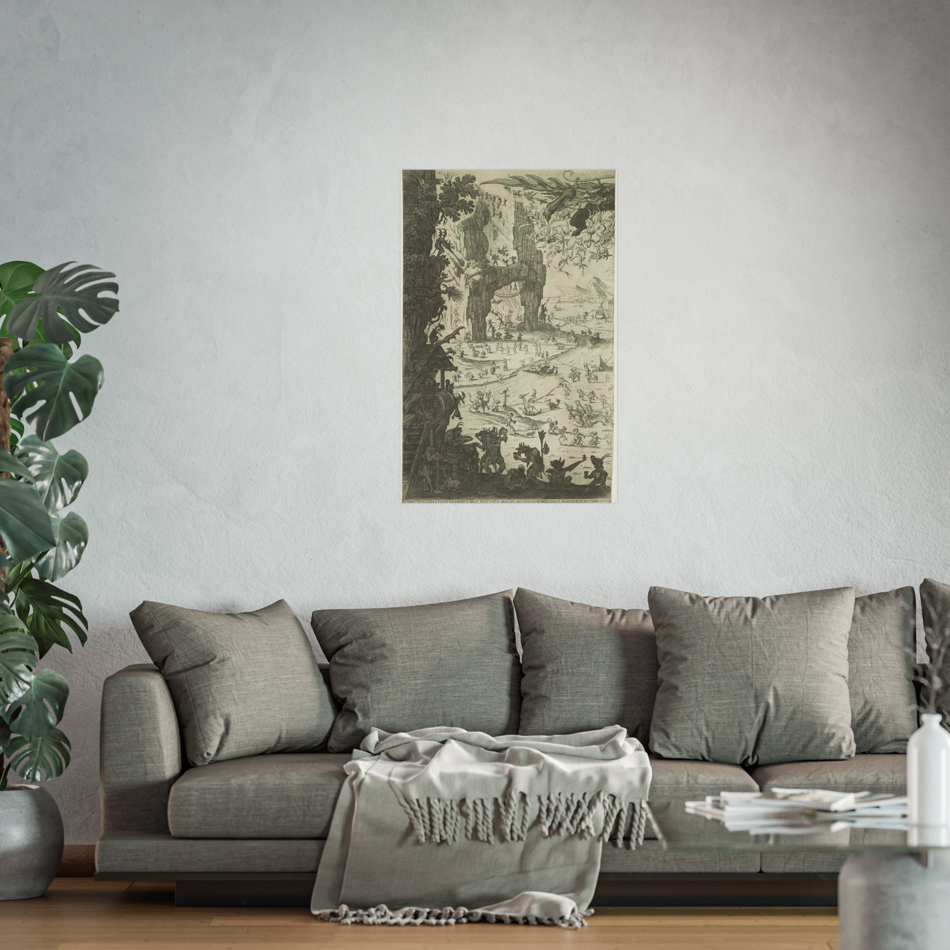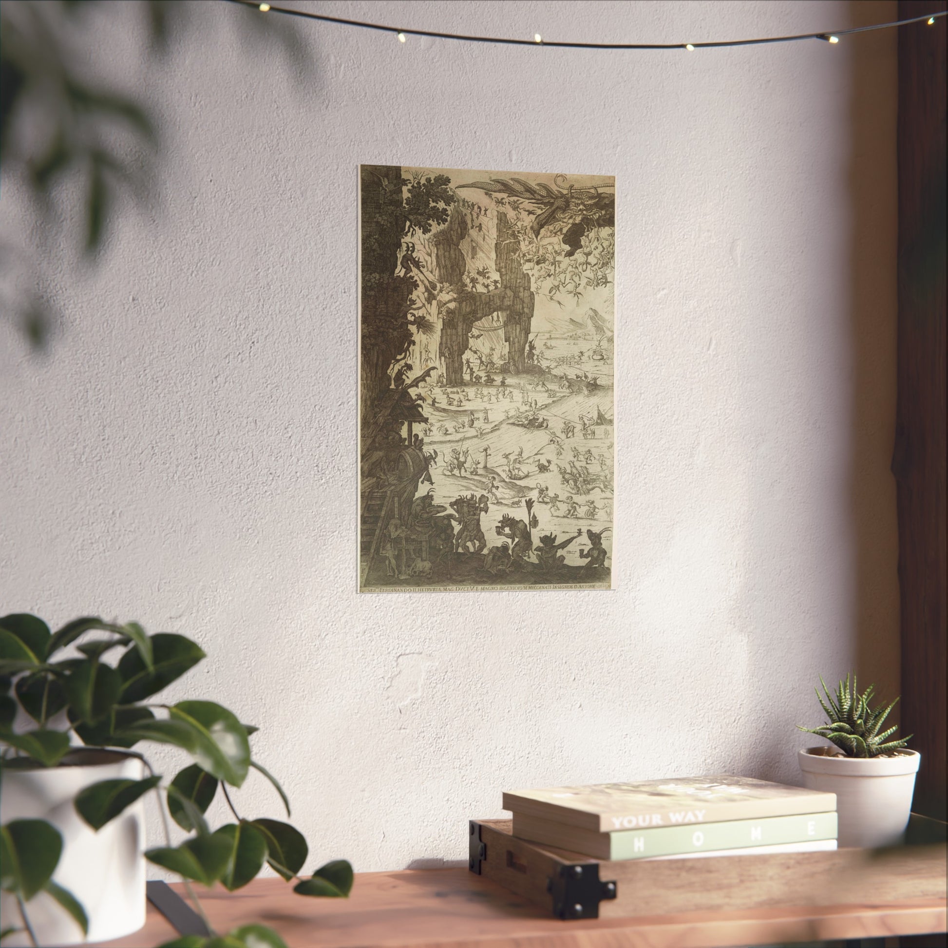 Immerse yourself in this haunting depiction of a rocky landscape teeming with demonic creatures. The scene is dominated by an imposing beast spewing smoke at the center. Tucked away on the left, amidst the craggy terrain, is Saint Anthony, tormented by demons.