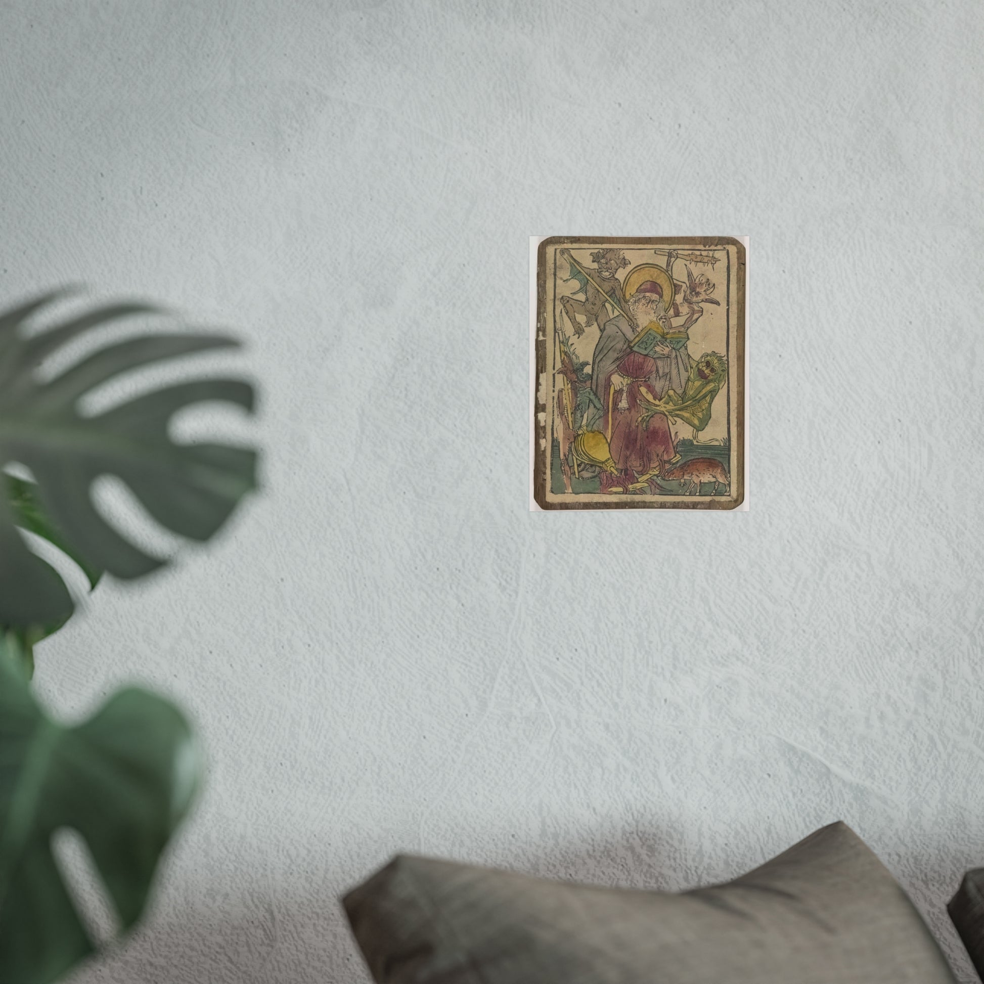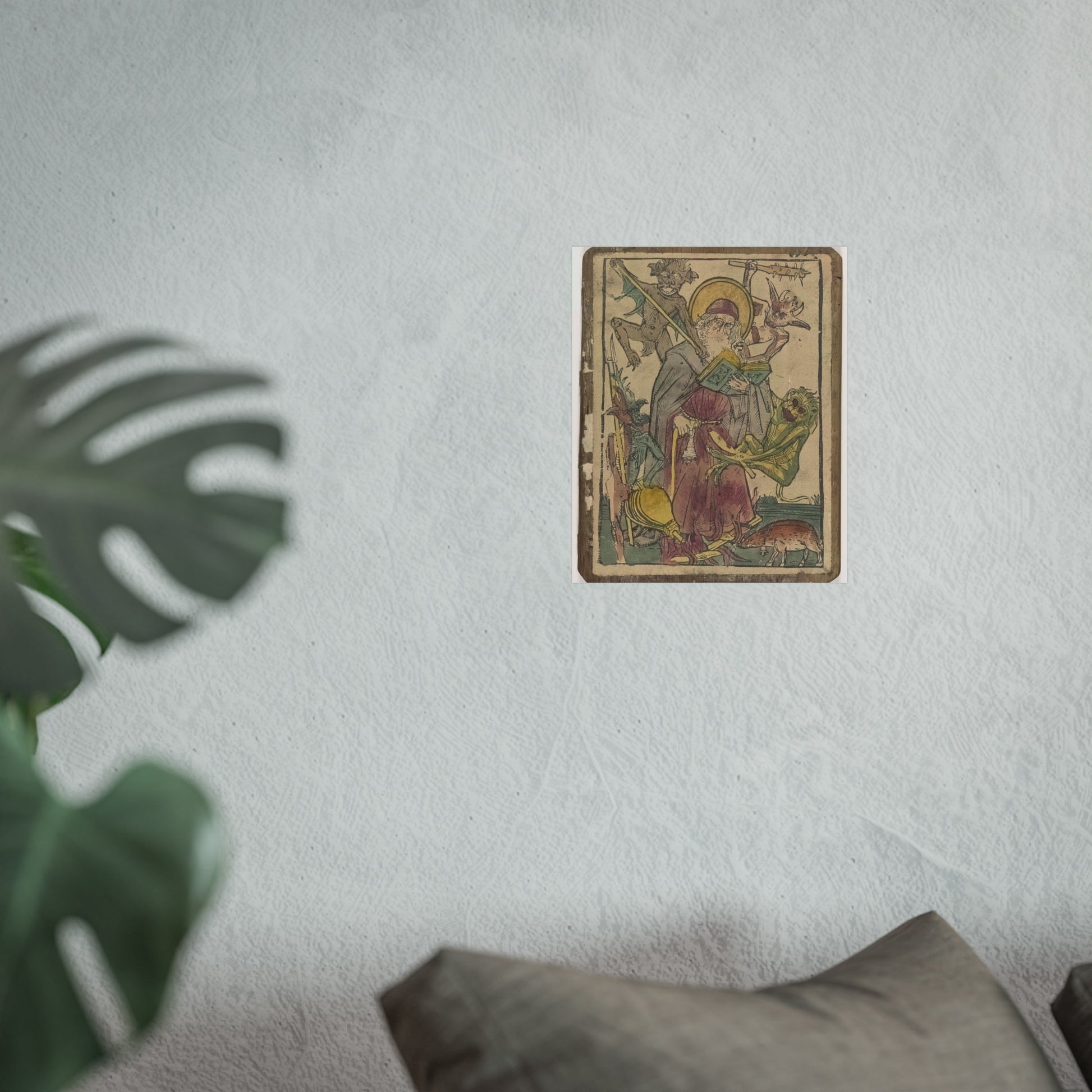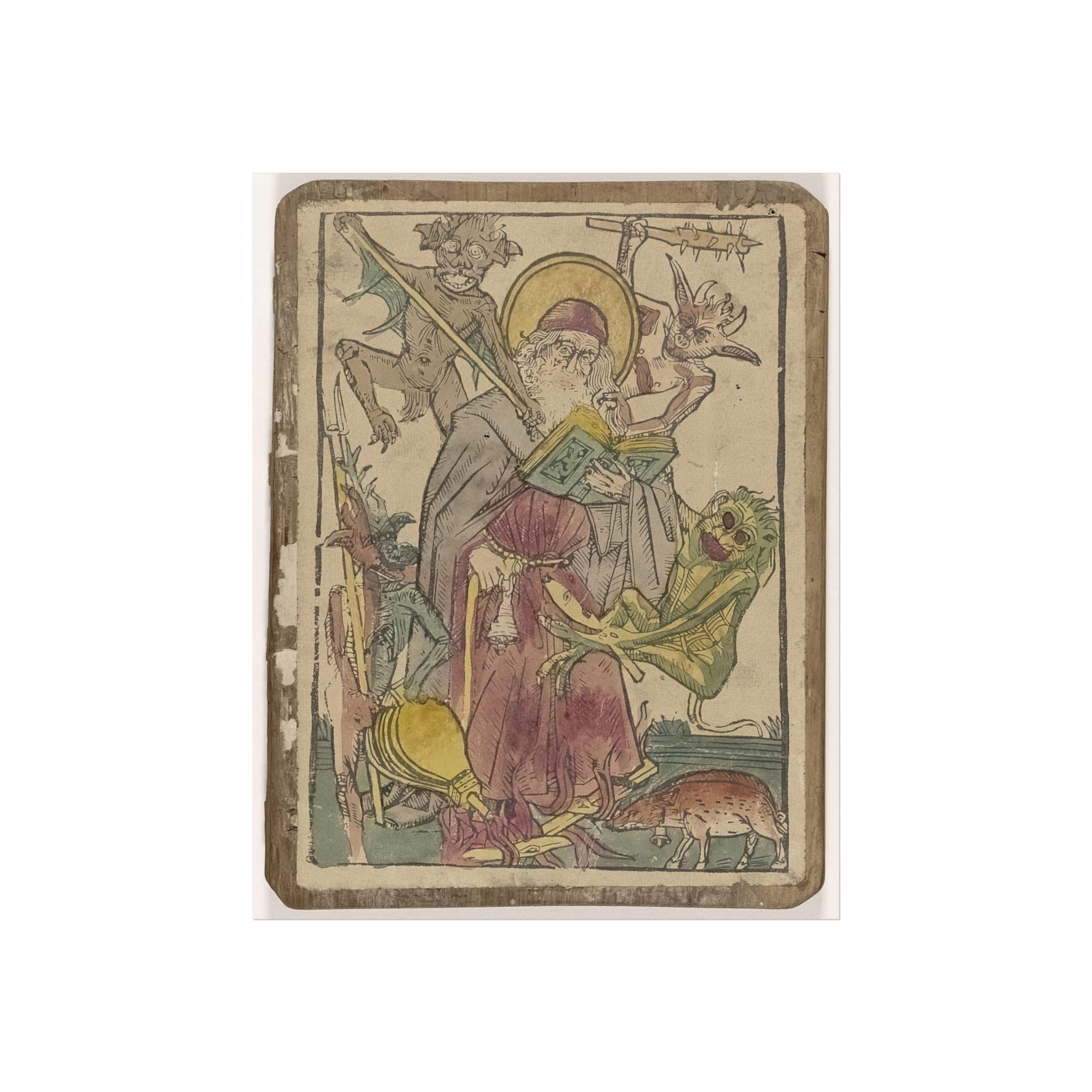 The depiction showcases the revered Saint Anthony, accompanied by a pig, both bearing bells. Engrossed in reading the Scriptures, Saint Anthony is besieged by four devilish tormentors who assault him with sticks and clubs, yank his hair, and ignite a fire beneath his feet.
