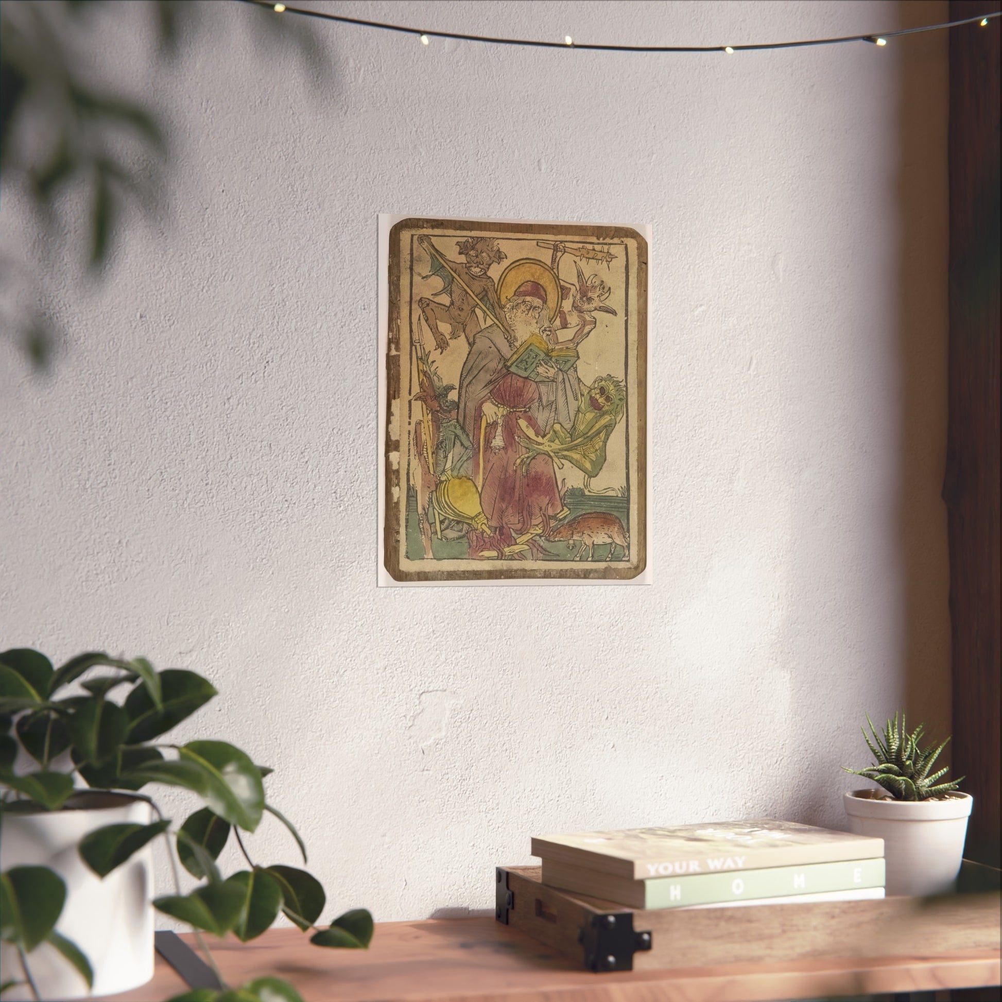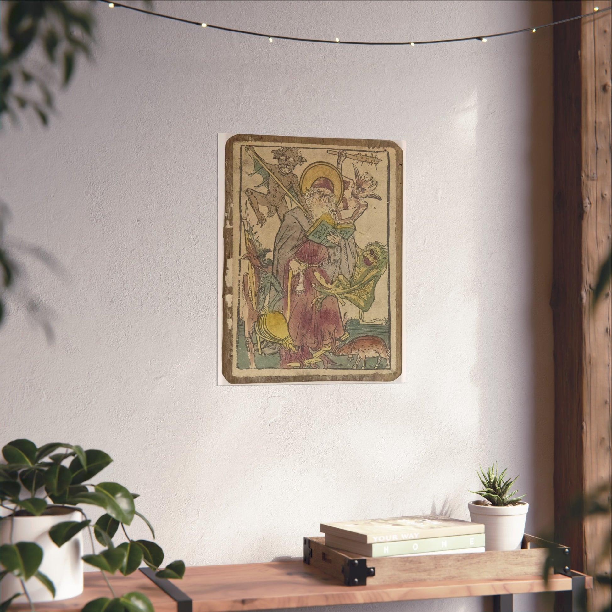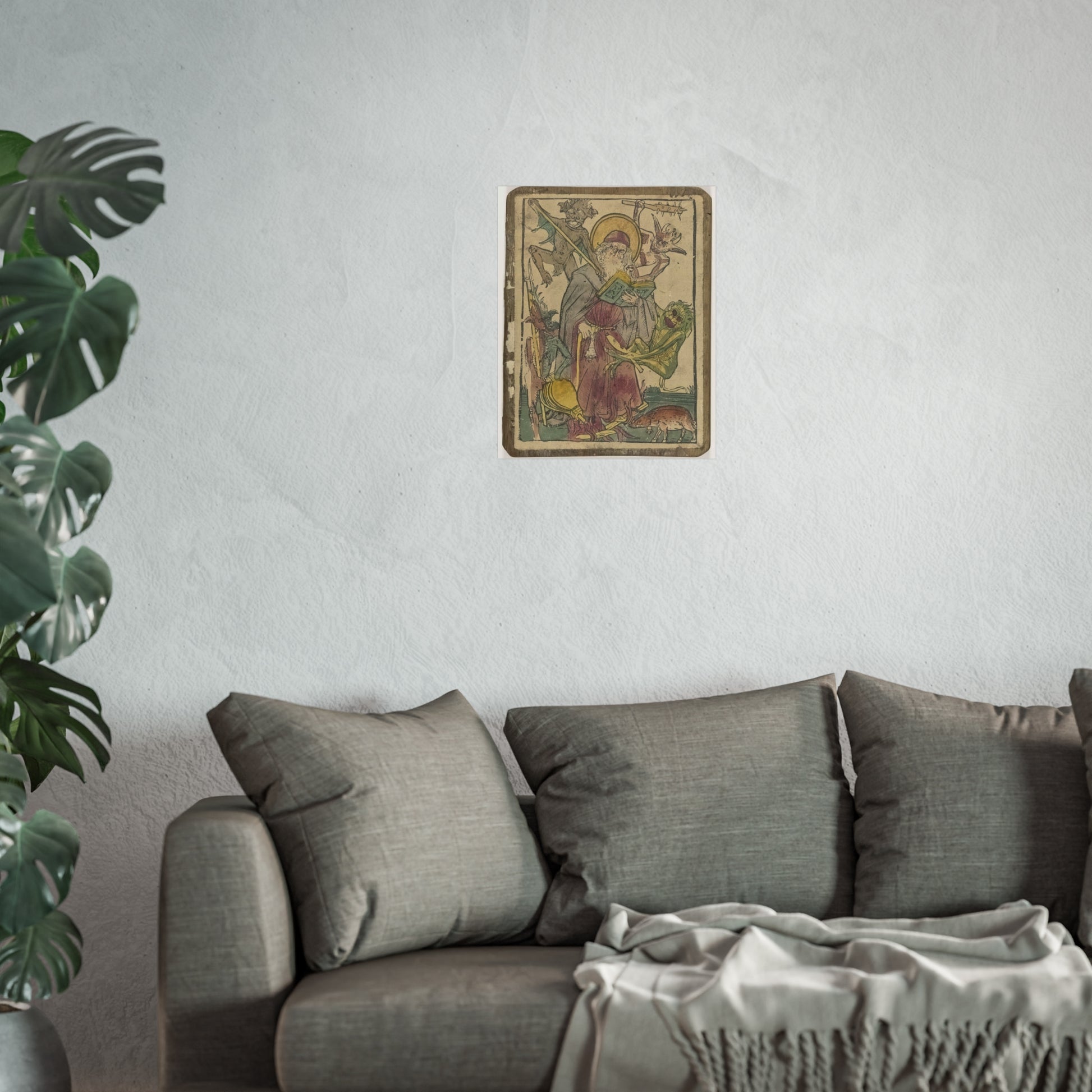 The depiction showcases the revered Saint Anthony, accompanied by a pig, both bearing bells. Engrossed in reading the Scriptures, Saint Anthony is besieged by four devilish tormentors who assault him with sticks and clubs, yank his hair, and ignite a fire beneath his feet.