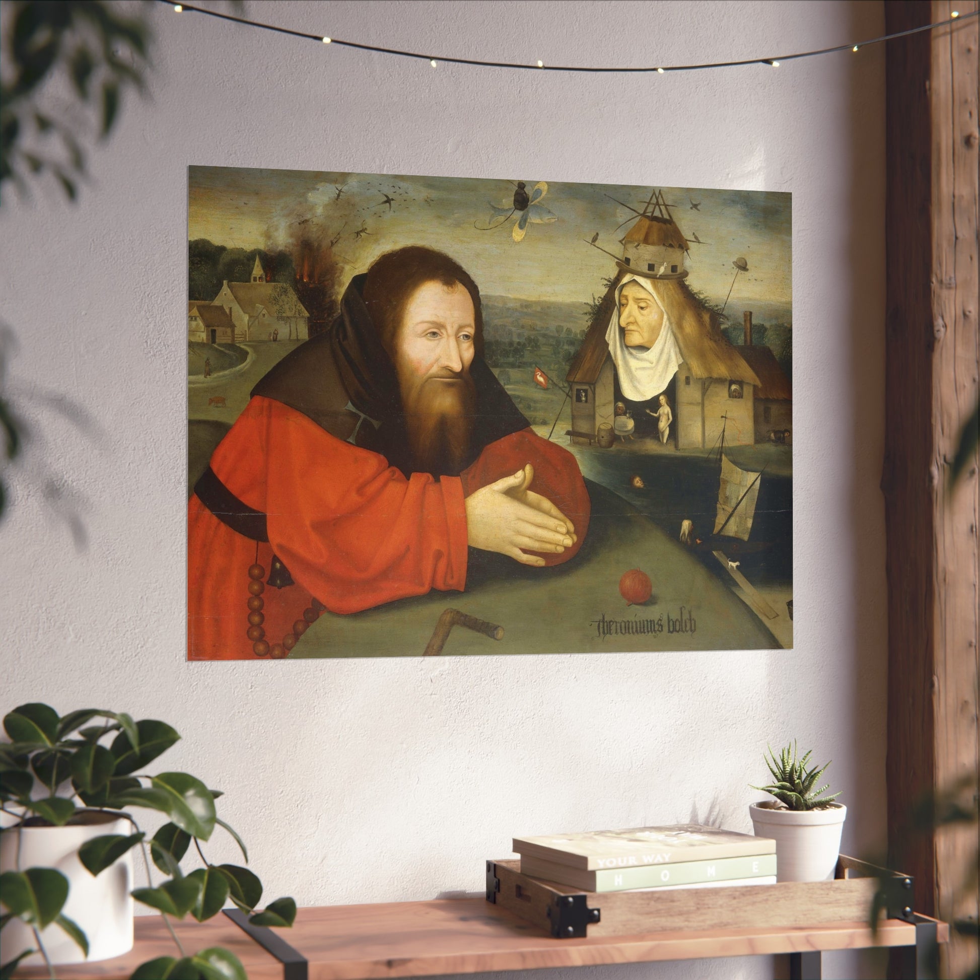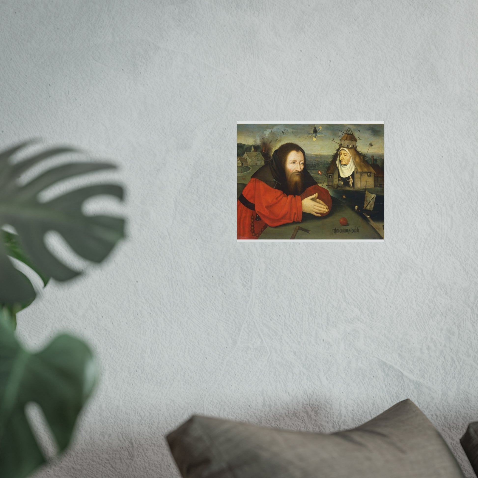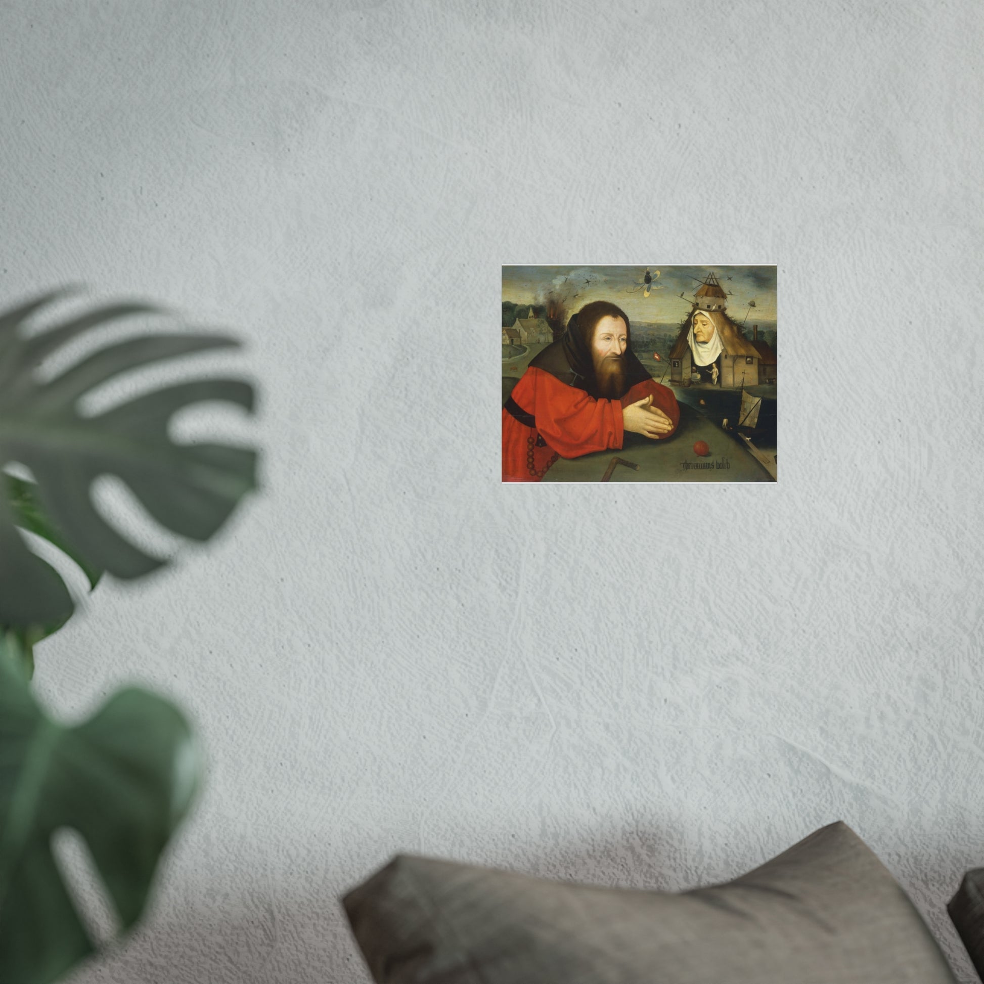 In this dramatic scene, we encounter the devout hermit, St. Anthony, deep in prayer in the foreground. To the right, an inn sports a roof shaped like an old woman's head, while a seductive young woman stands nude at the door, embodying temptation. The left background is dominated by a monastery engulfed in flames, with a swarm of fantastical monsters soaring through the sky, adding to the chaotic and surreal atmosphere.