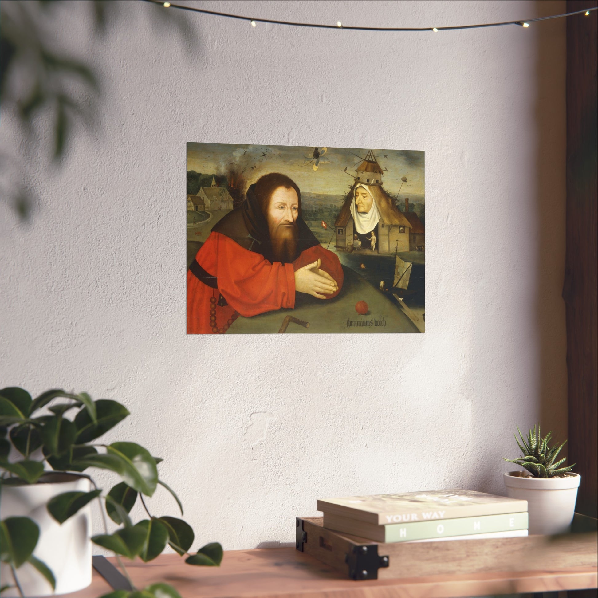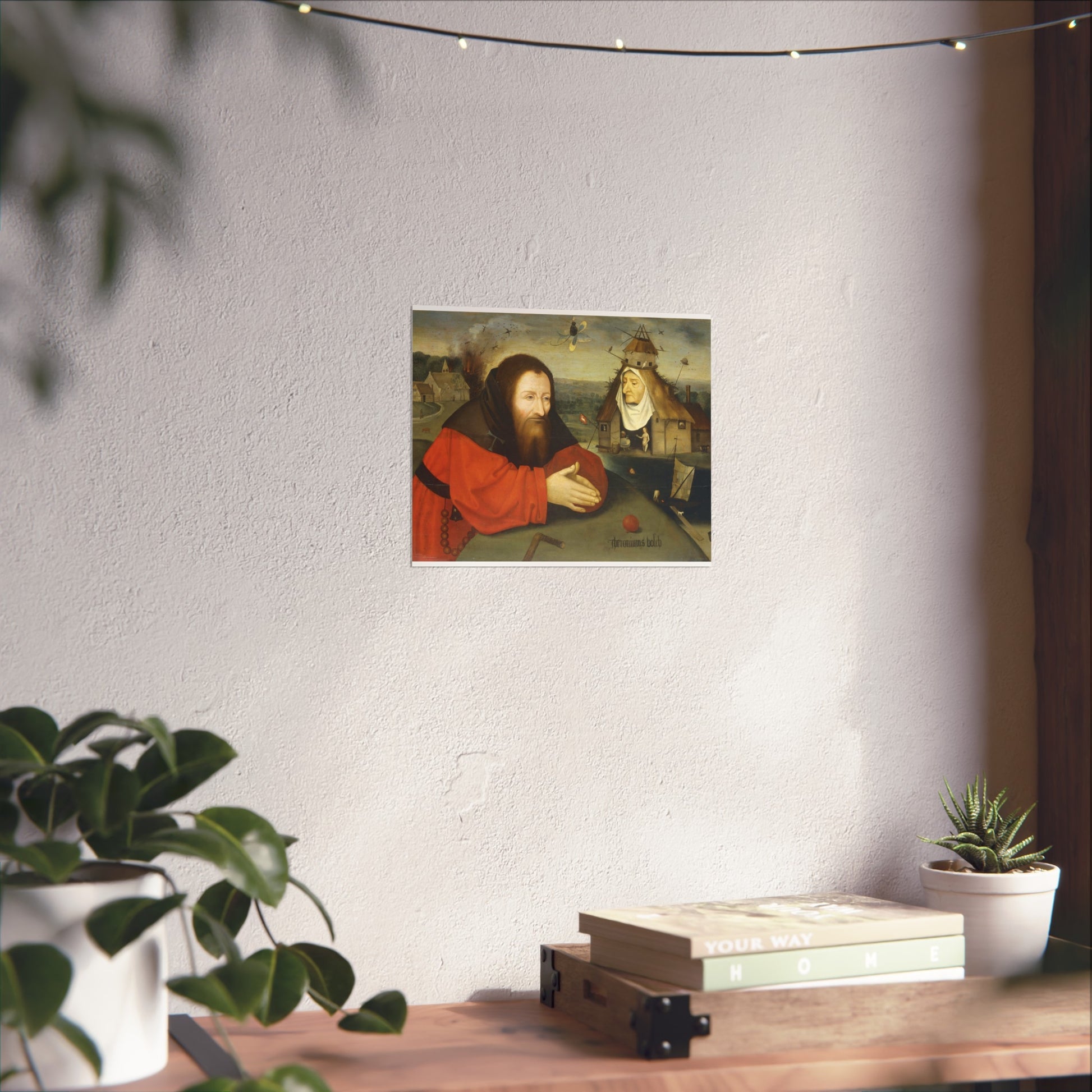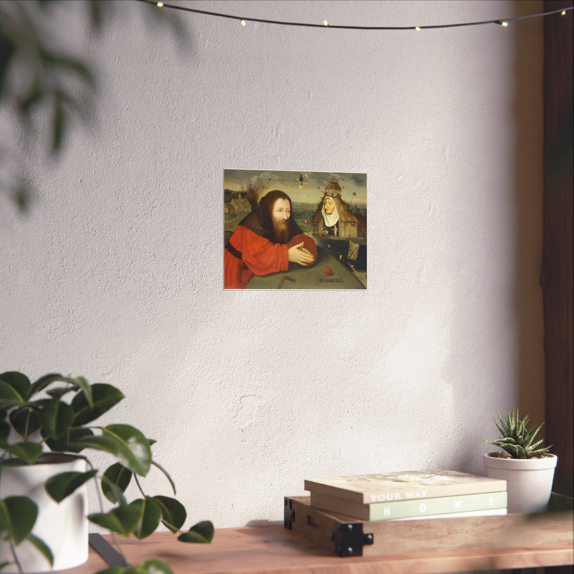 In this dramatic scene, we encounter the devout hermit, St. Anthony, deep in prayer in the foreground. To the right, an inn sports a roof shaped like an old woman's head, while a seductive young woman stands nude at the door, embodying temptation. The left background is dominated by a monastery engulfed in flames, with a swarm of fantastical monsters soaring through the sky, adding to the chaotic and surreal atmosphere.