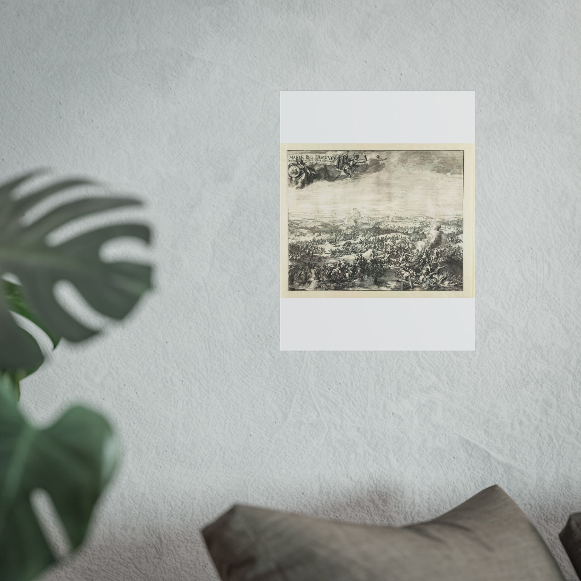 The Victory of William III at the Boyne, 1690. This composition is a remarkable assembly of three separate prints and two text sheets. The right half of the main illustration offers a vivid depiction of the battlefield. Above, in the clouds, part of the dedication can be seen accompanied by allegorical figures.