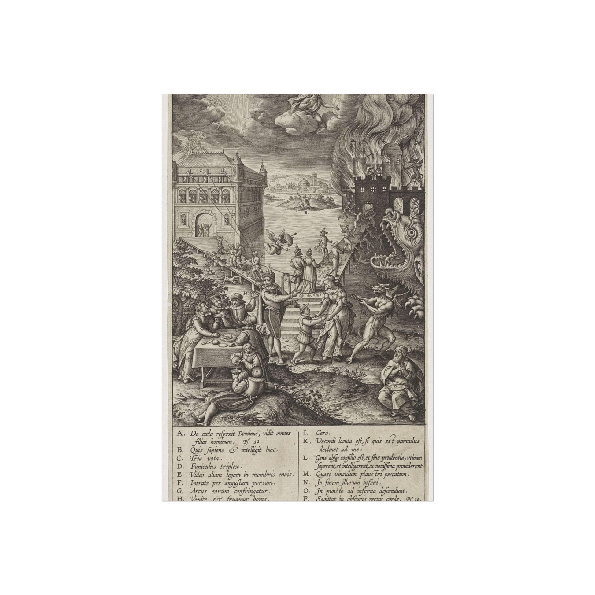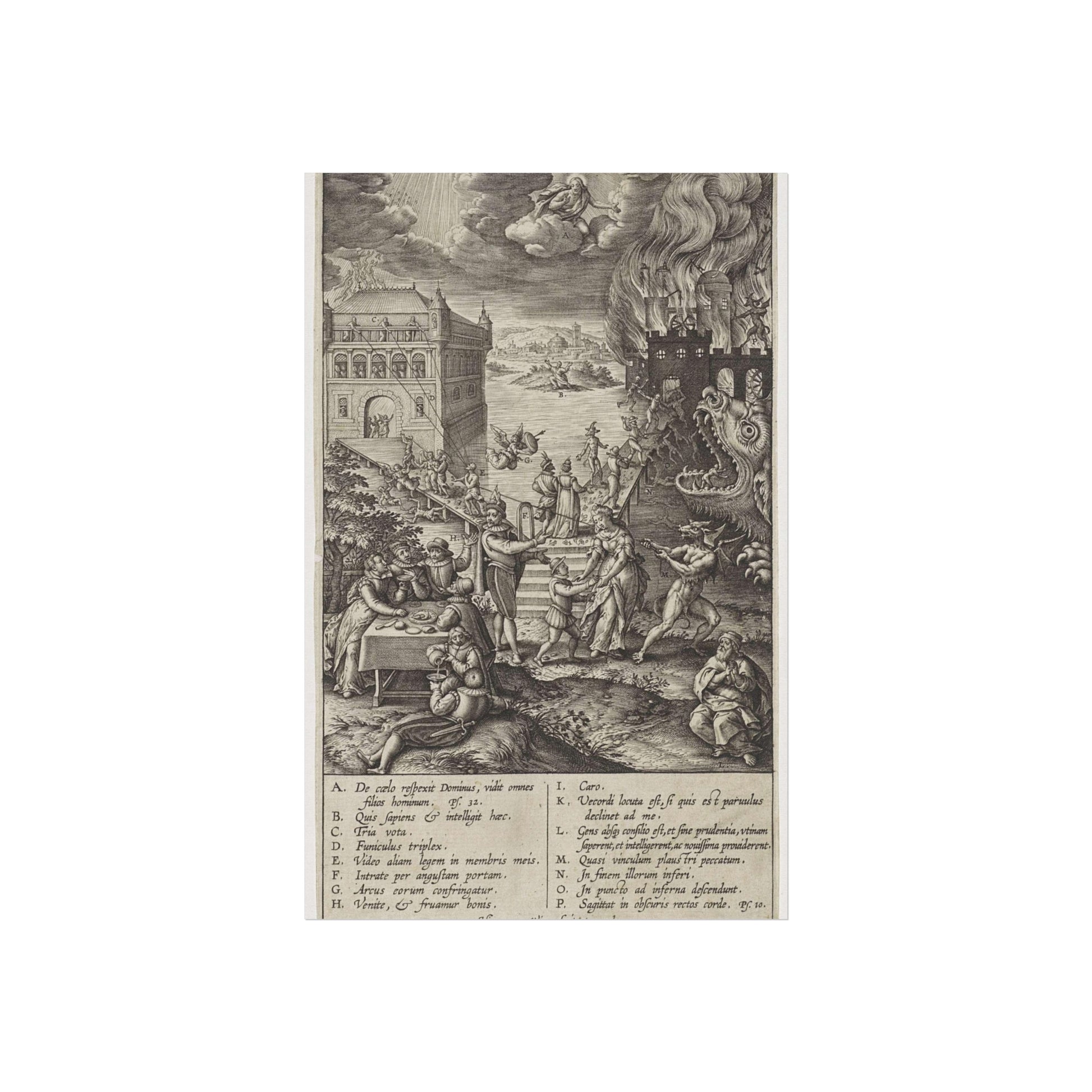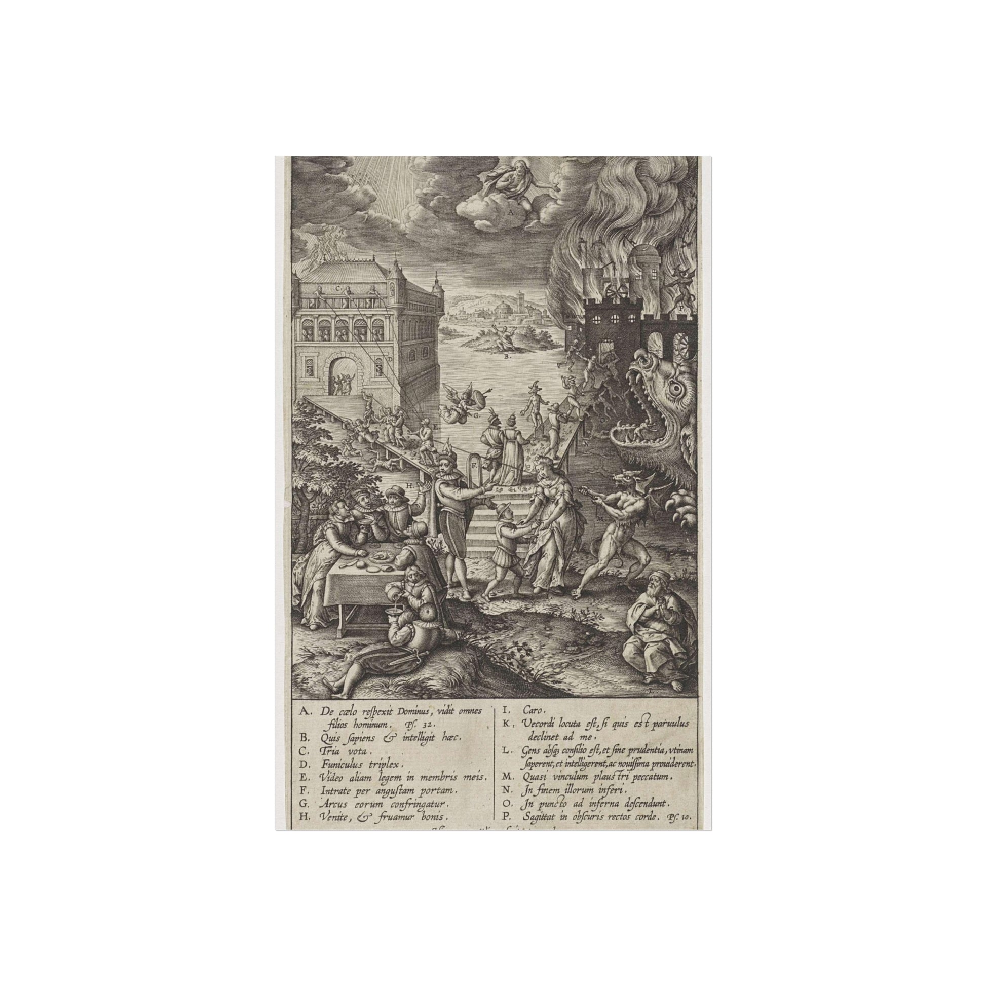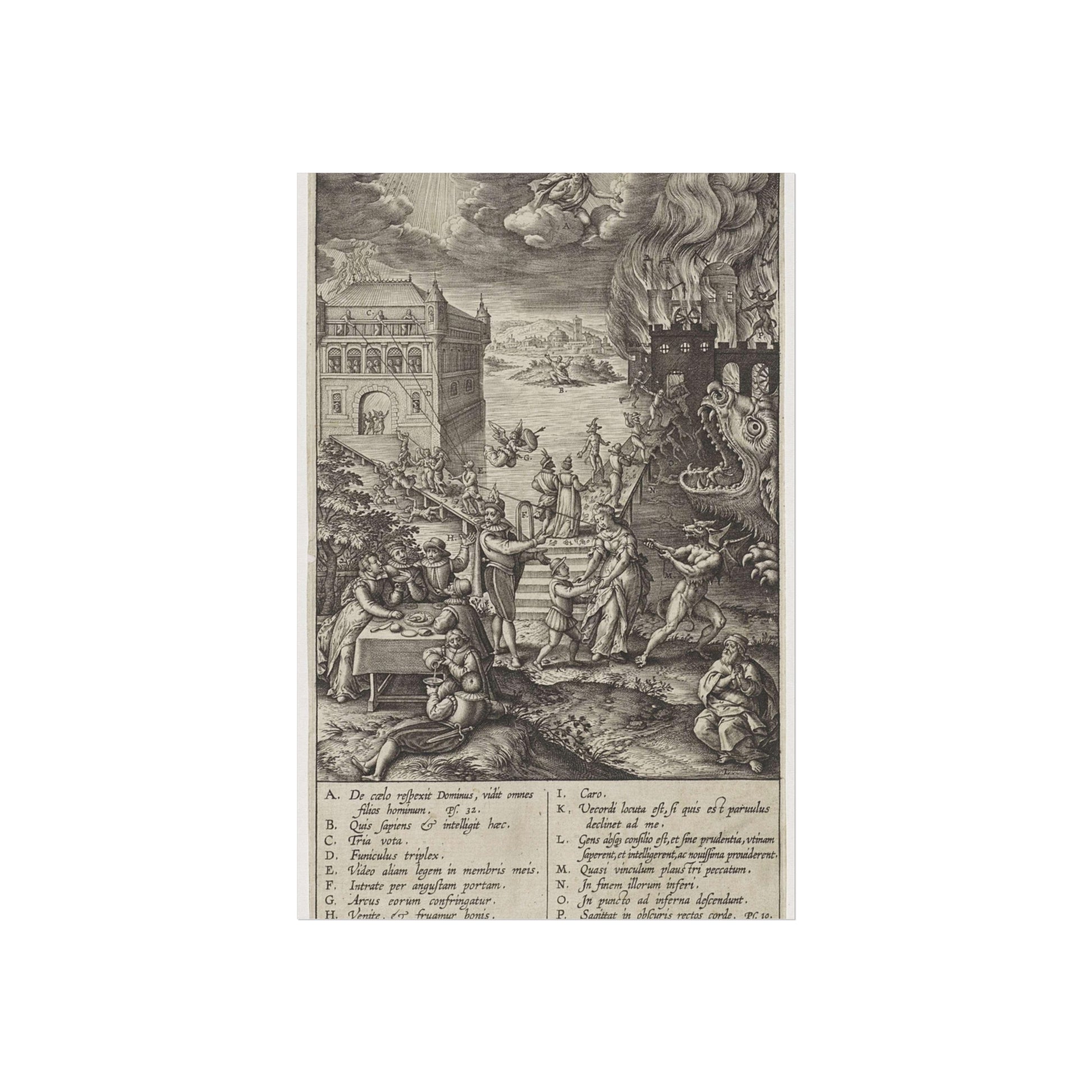 In the foreground, a lively party is seen at a table on the left, contrasted by a praying man on the right. A narrow path leads to heaven, depicted as a palace bathed in divine light, while a wide road directs to hell, represented as a burning castle with a monstrous gaping maw in its moat. A devil in the foreground attempts to pull a man from the righteous path with a rope. Christ watches over the scene from a cloud. Various figures and scenes are marked with letters A-P, referencing the legend in the margin.