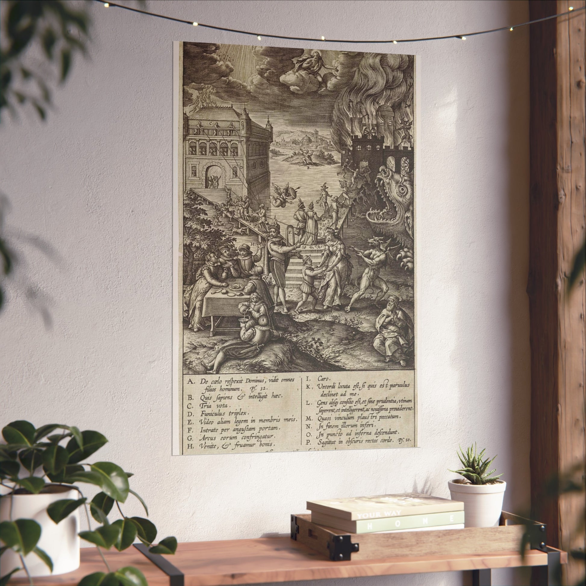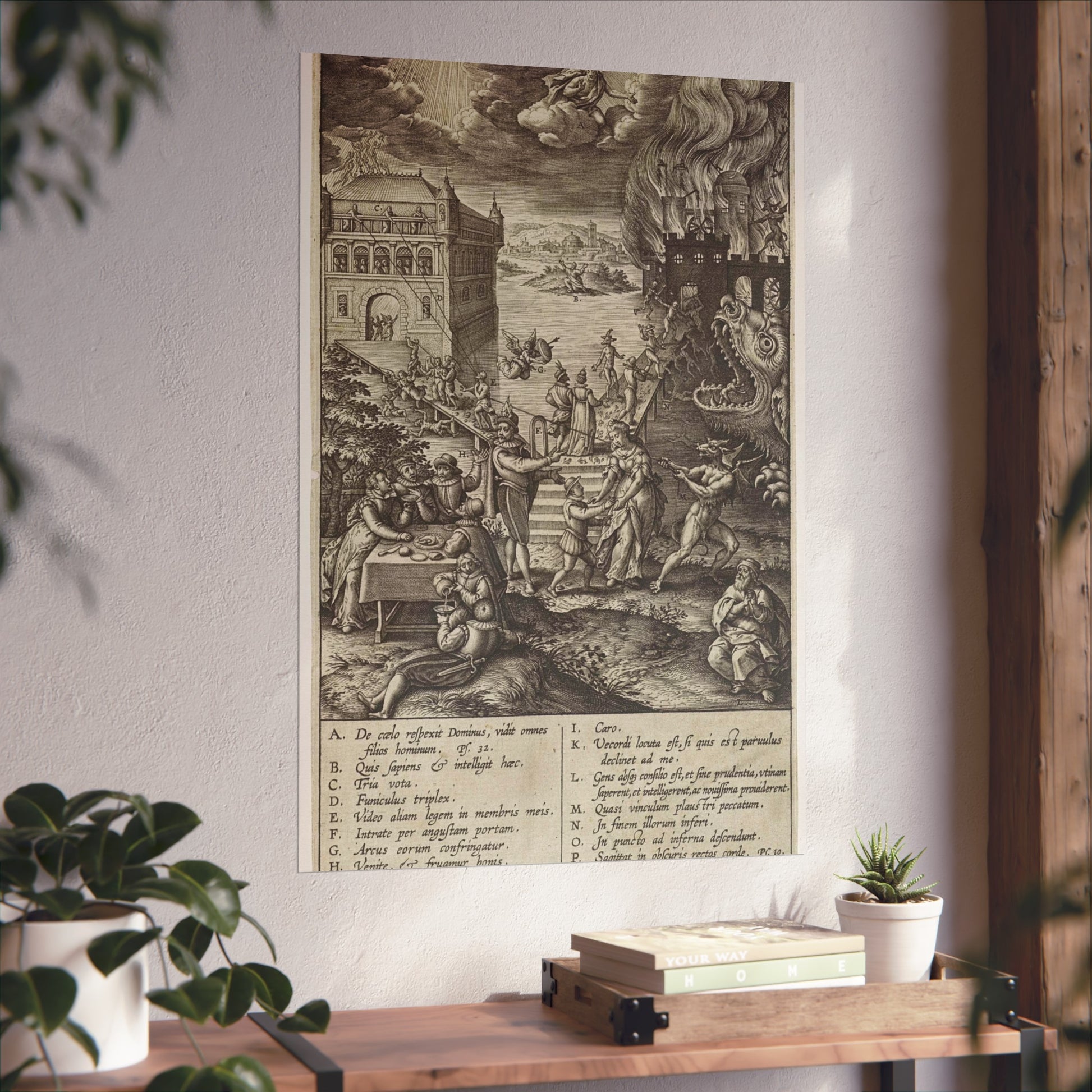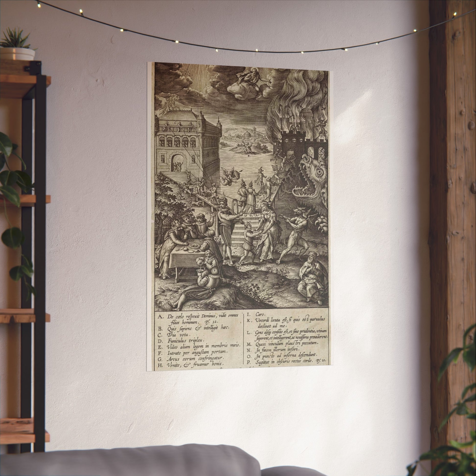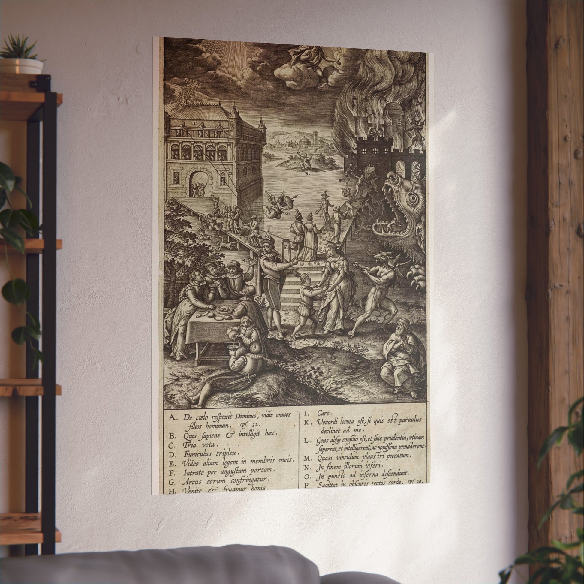 In the foreground, a lively party is seen at a table on the left, contrasted by a praying man on the right. A narrow path leads to heaven, depicted as a palace bathed in divine light, while a wide road directs to hell, represented as a burning castle with a monstrous gaping maw in its moat. A devil in the foreground attempts to pull a man from the righteous path with a rope. Christ watches over the scene from a cloud. Various figures and scenes are marked with letters A-P, referencing the legend in the margin.