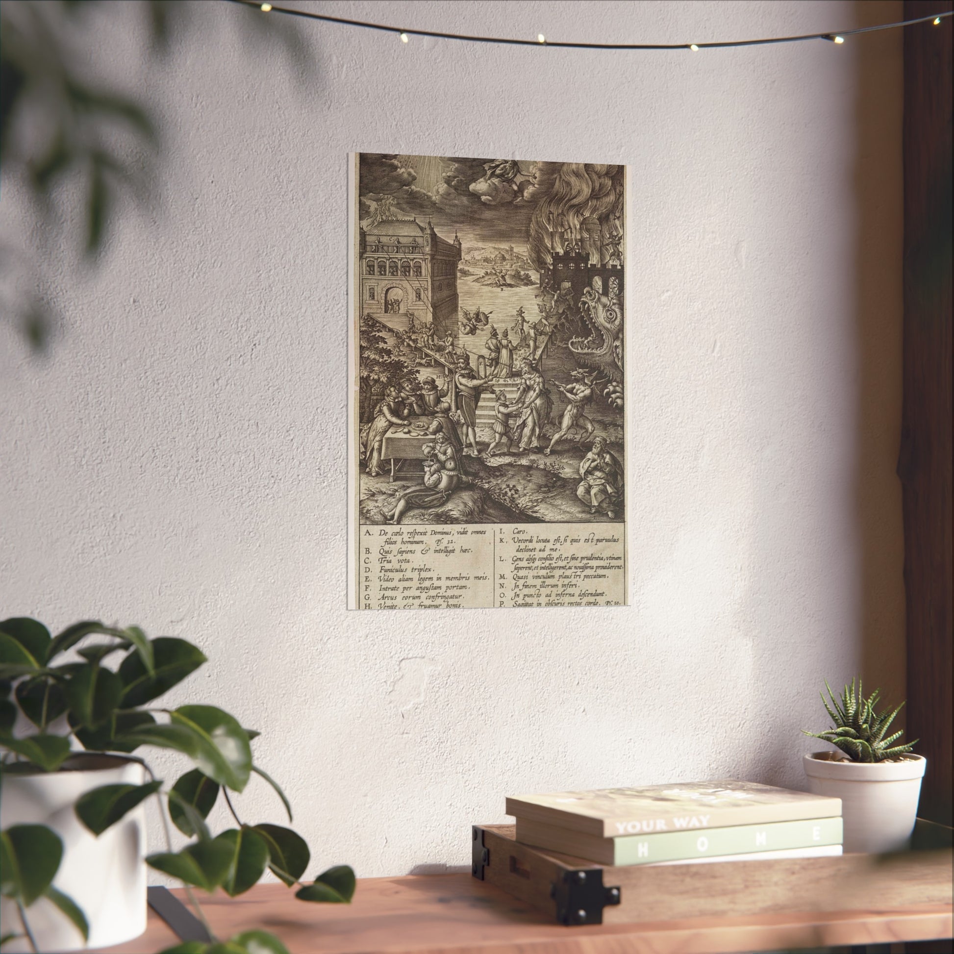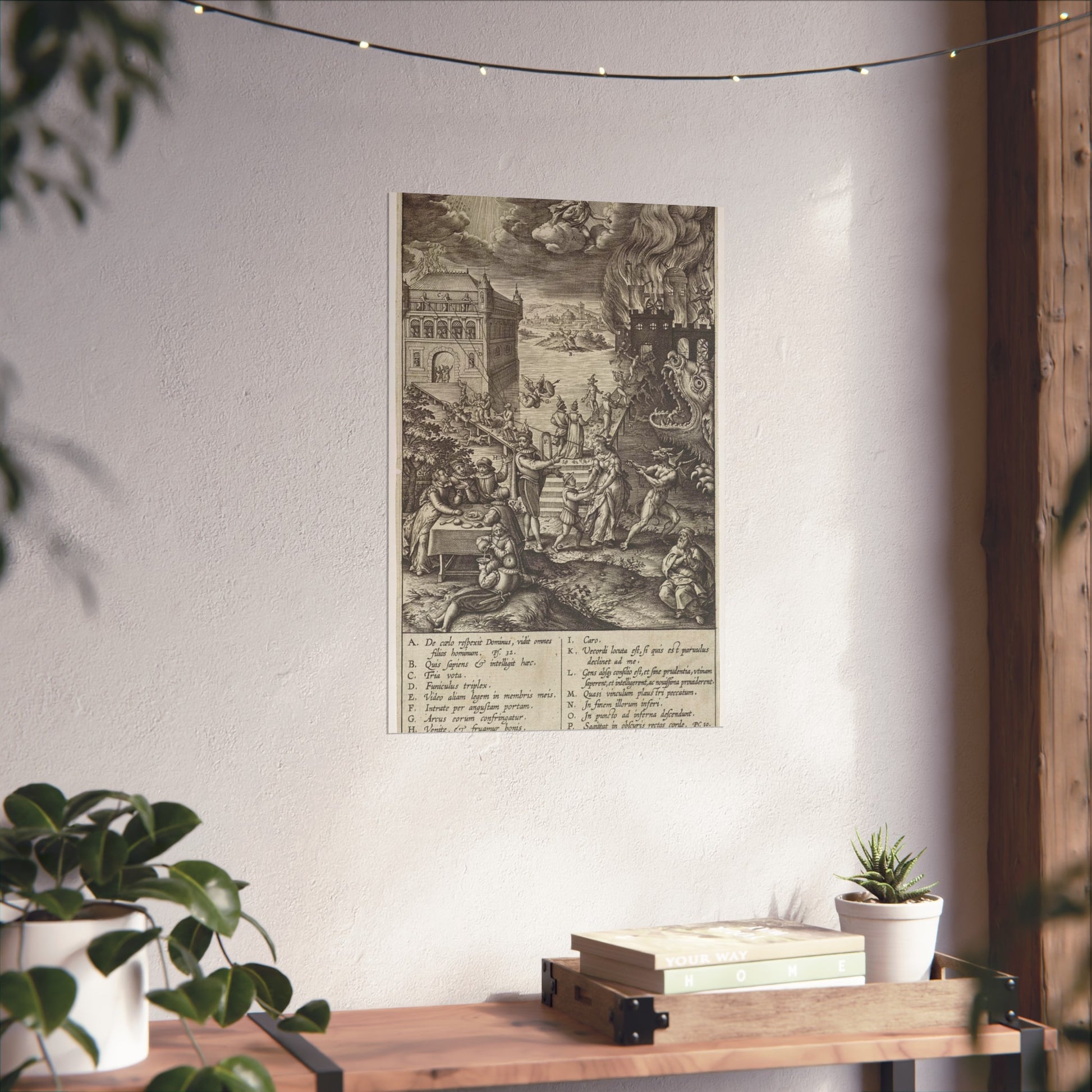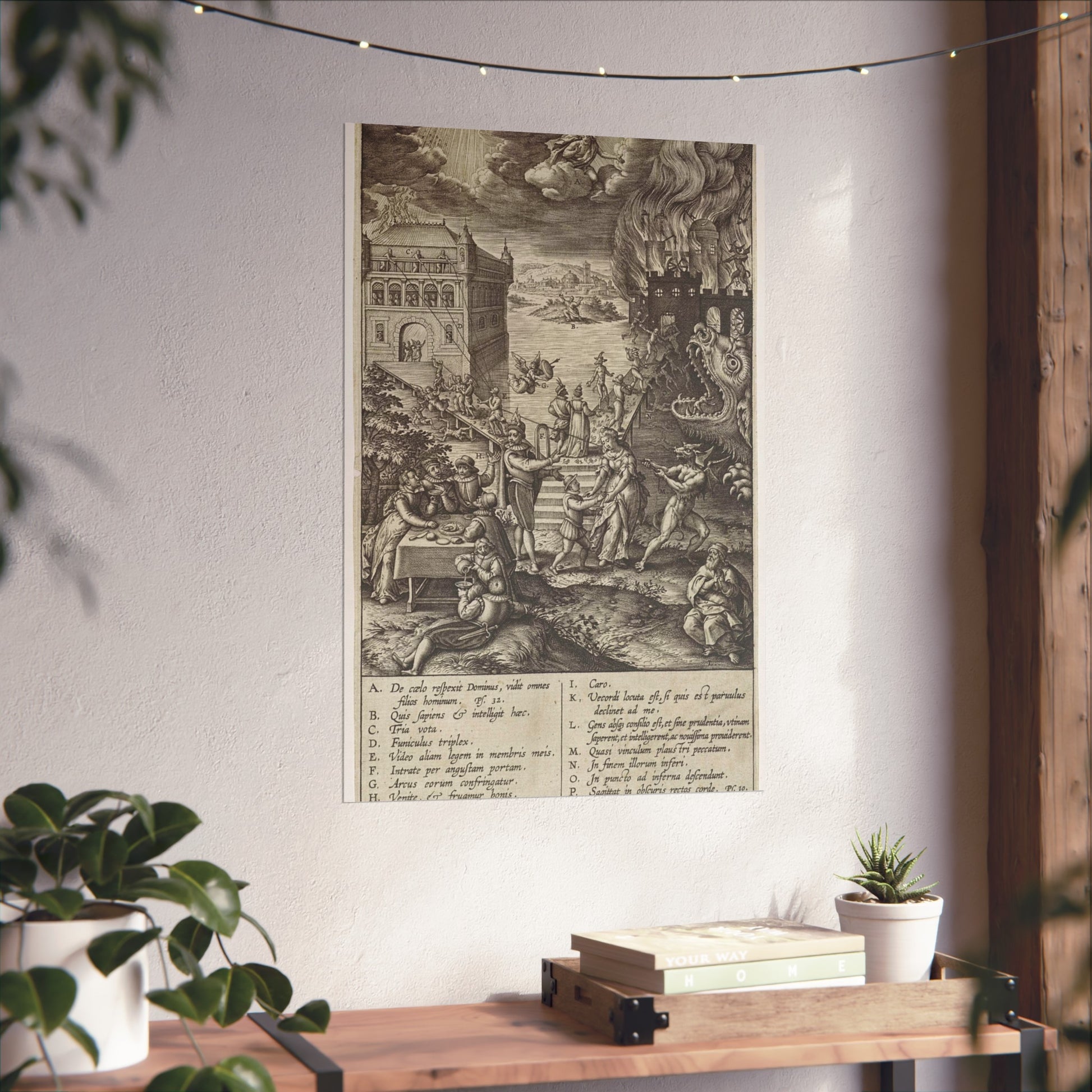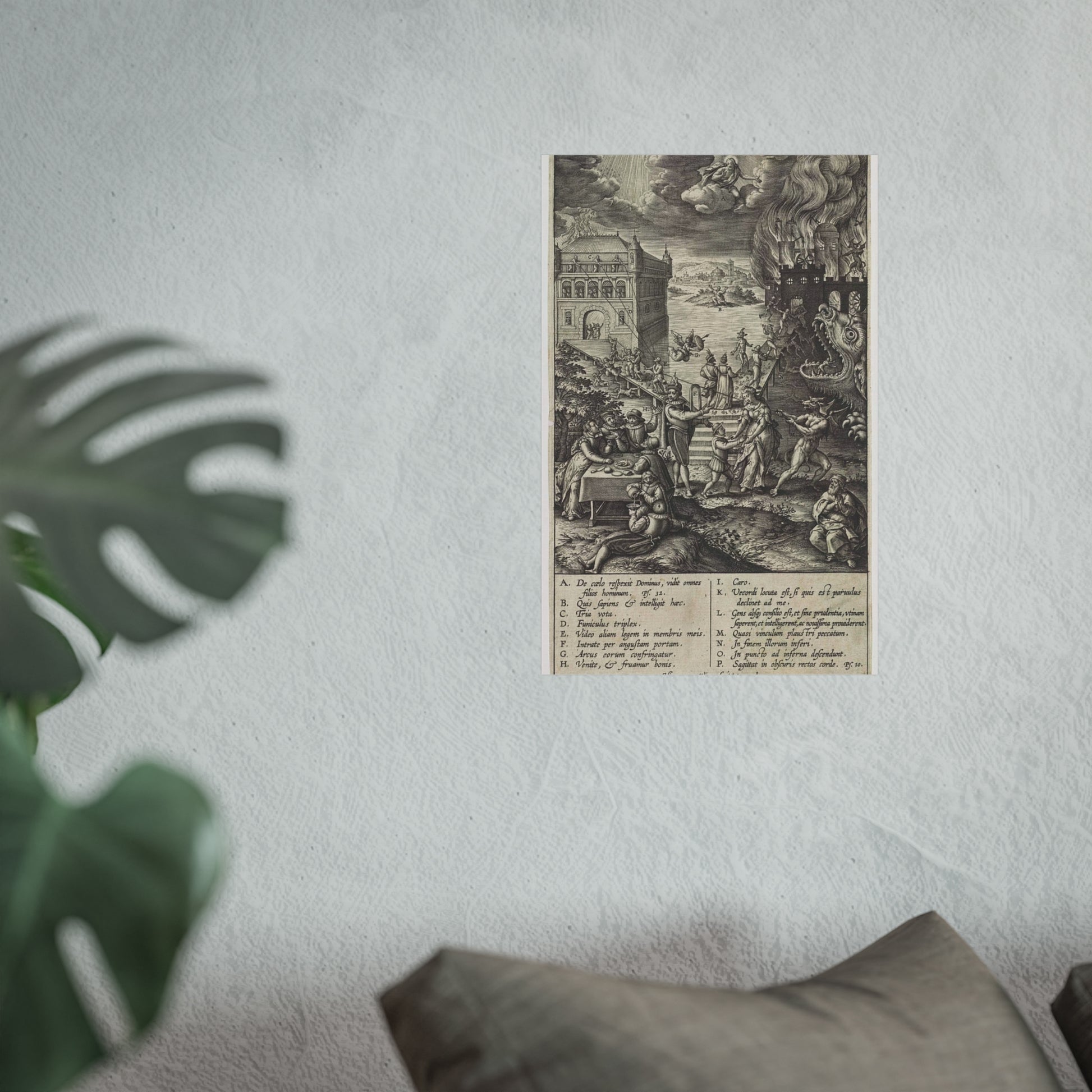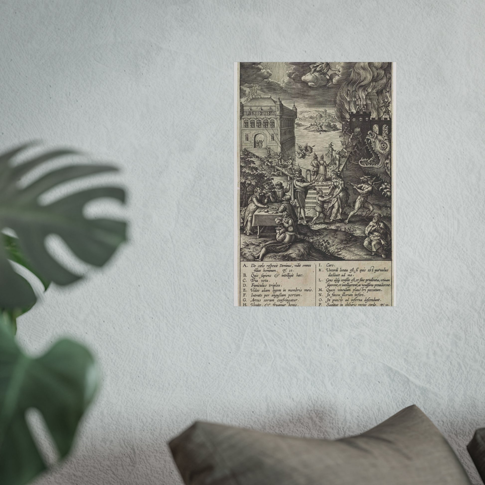 In the foreground, a lively party is seen at a table on the left, contrasted by a praying man on the right. A narrow path leads to heaven, depicted as a palace bathed in divine light, while a wide road directs to hell, represented as a burning castle with a monstrous gaping maw in its moat. A devil in the foreground attempts to pull a man from the righteous path with a rope. Christ watches over the scene from a cloud. Various figures and scenes are marked with letters A-P, referencing the legend in the margin.
