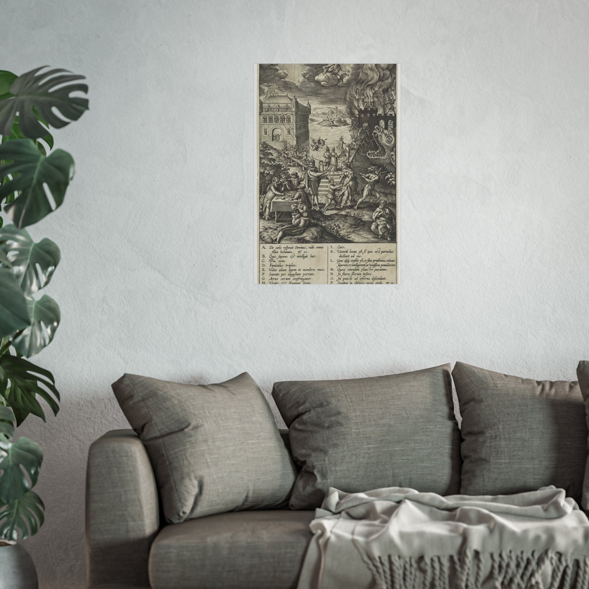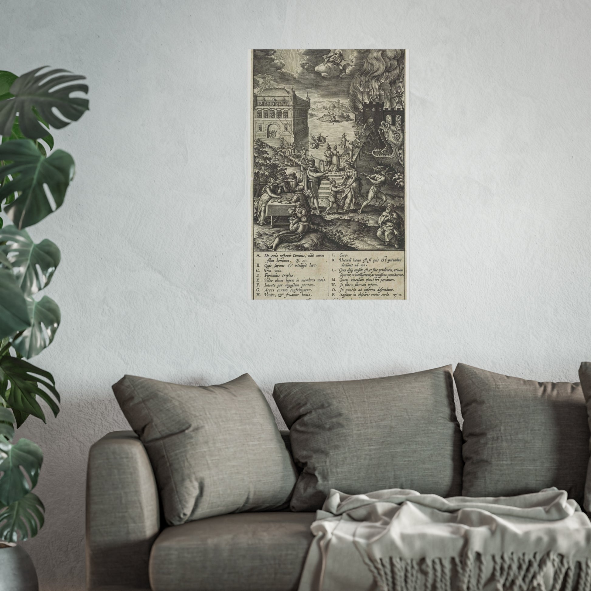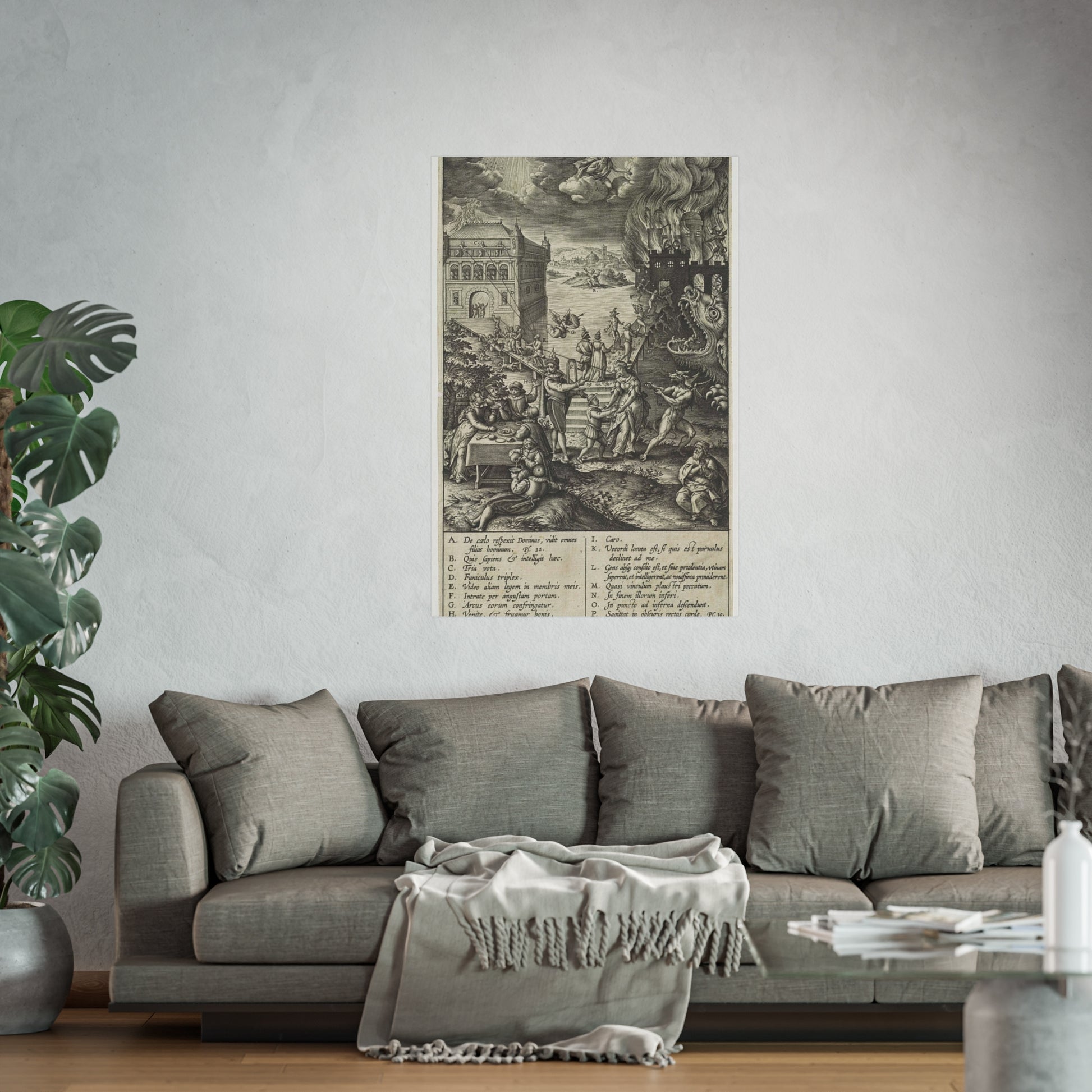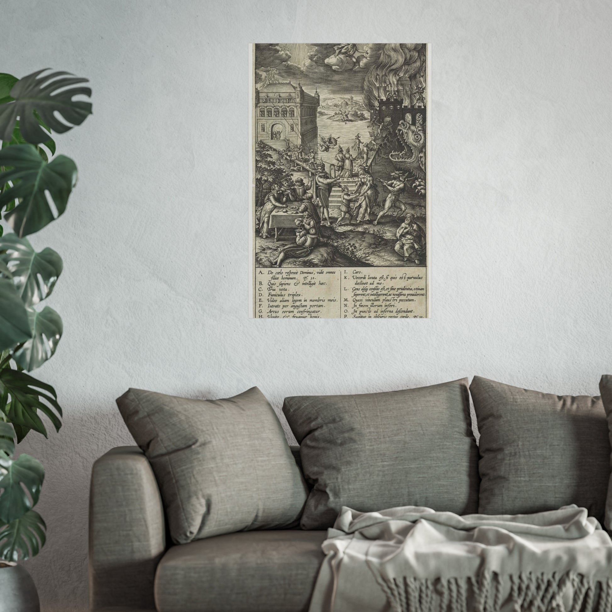 In the foreground, a lively party is seen at a table on the left, contrasted by a praying man on the right. A narrow path leads to heaven, depicted as a palace bathed in divine light, while a wide road directs to hell, represented as a burning castle with a monstrous gaping maw in its moat. A devil in the foreground attempts to pull a man from the righteous path with a rope. Christ watches over the scene from a cloud. Various figures and scenes are marked with letters A-P, referencing the legend in the margin.