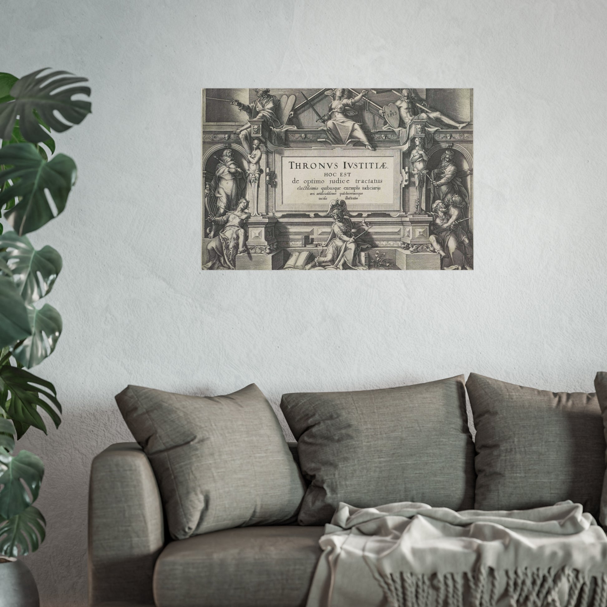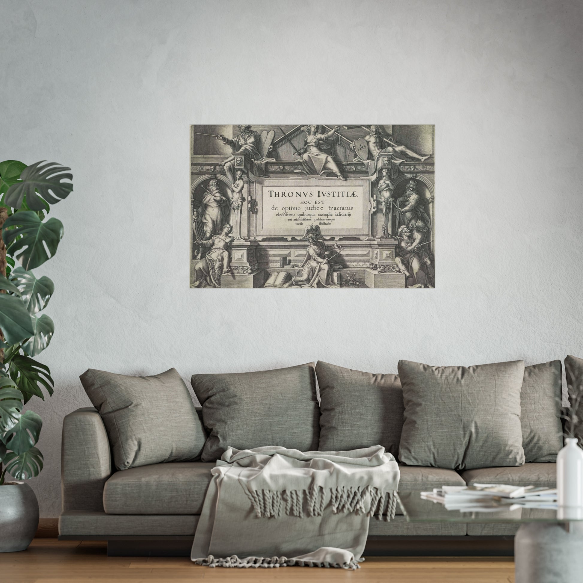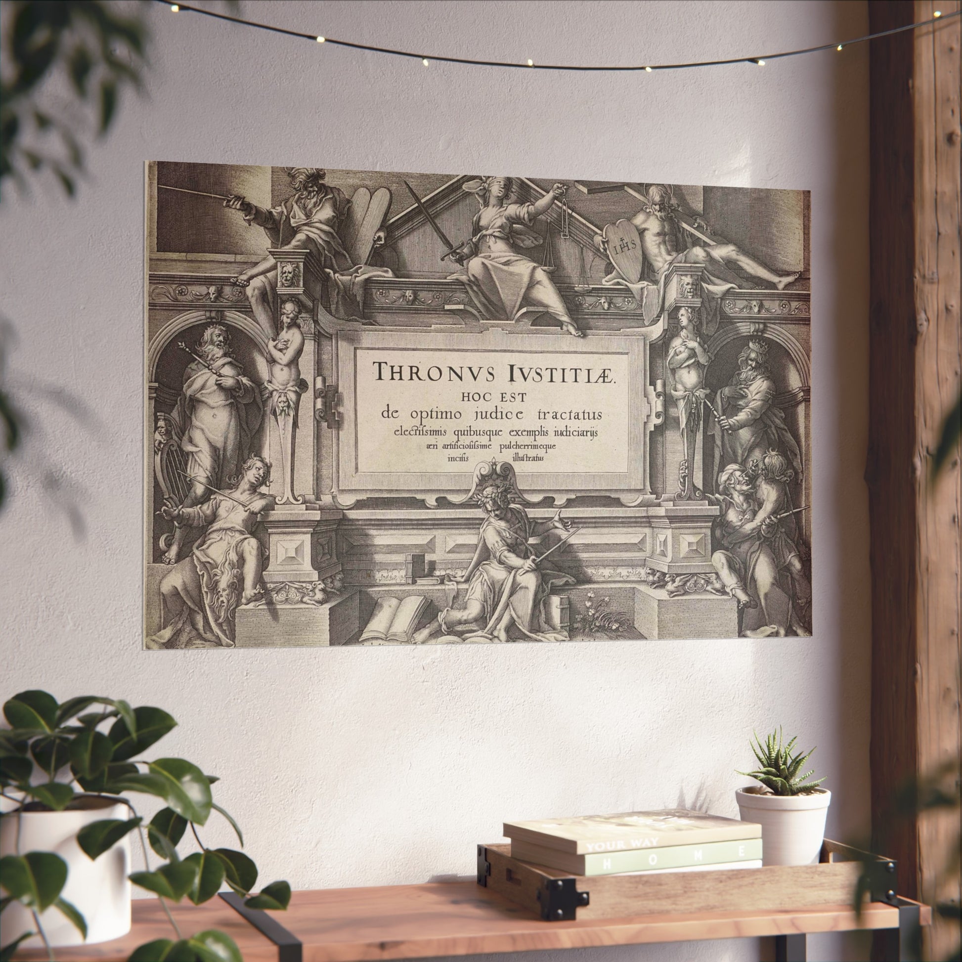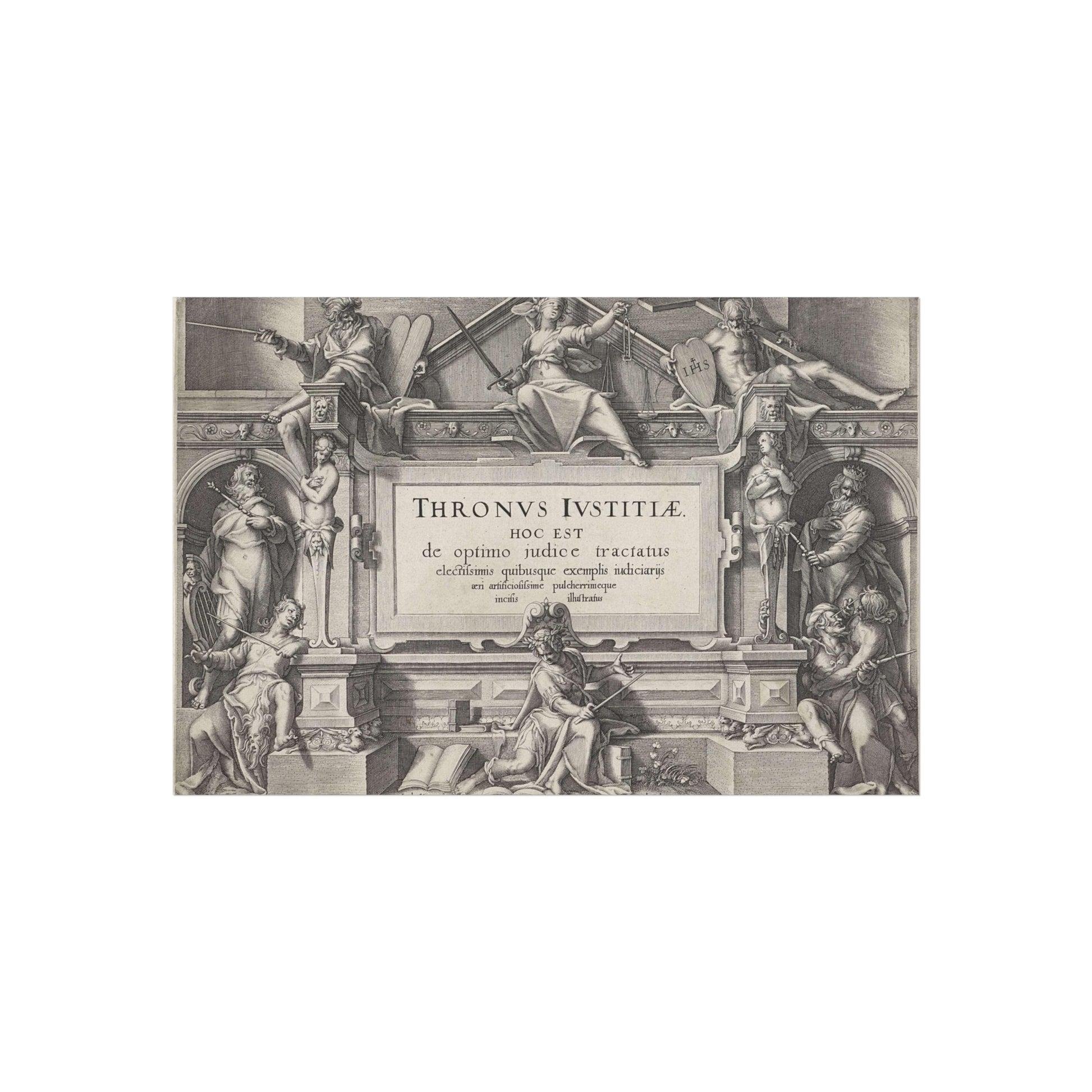 The artwork features a magnificent architectural structure adorned with an ornamental cartouche titled 'Throne of Justice'. Various figures associated with the judiciary are present, with the central figure being a judge seated on the throne, surrounded by law books and a staff. In the niches to the left and right, we find King David with his harp and King Solomon. Above them, Justice is personified, wielding a sword and scales. She is flanked by Moses, holding the tablets of law representing the Old Covenant, and Christ bearing a cross and a heart with his monogram symbolizing the New Covenant. In the lower left corner sits Judge Otanes with his father Sisamnes' skin, while in the lower right, Zaleucus' eye is being gouged out.