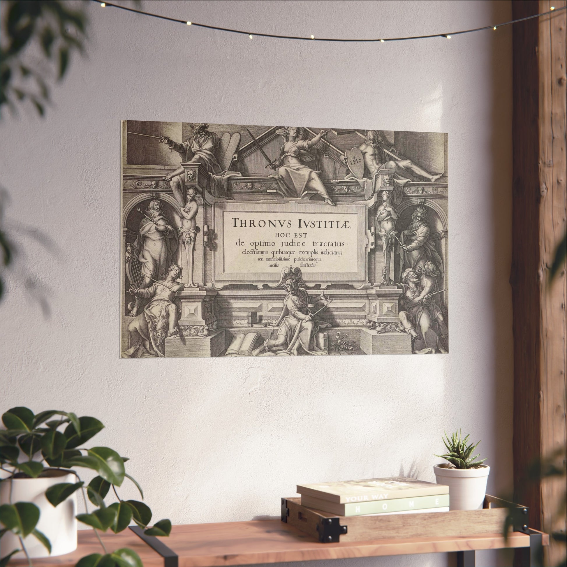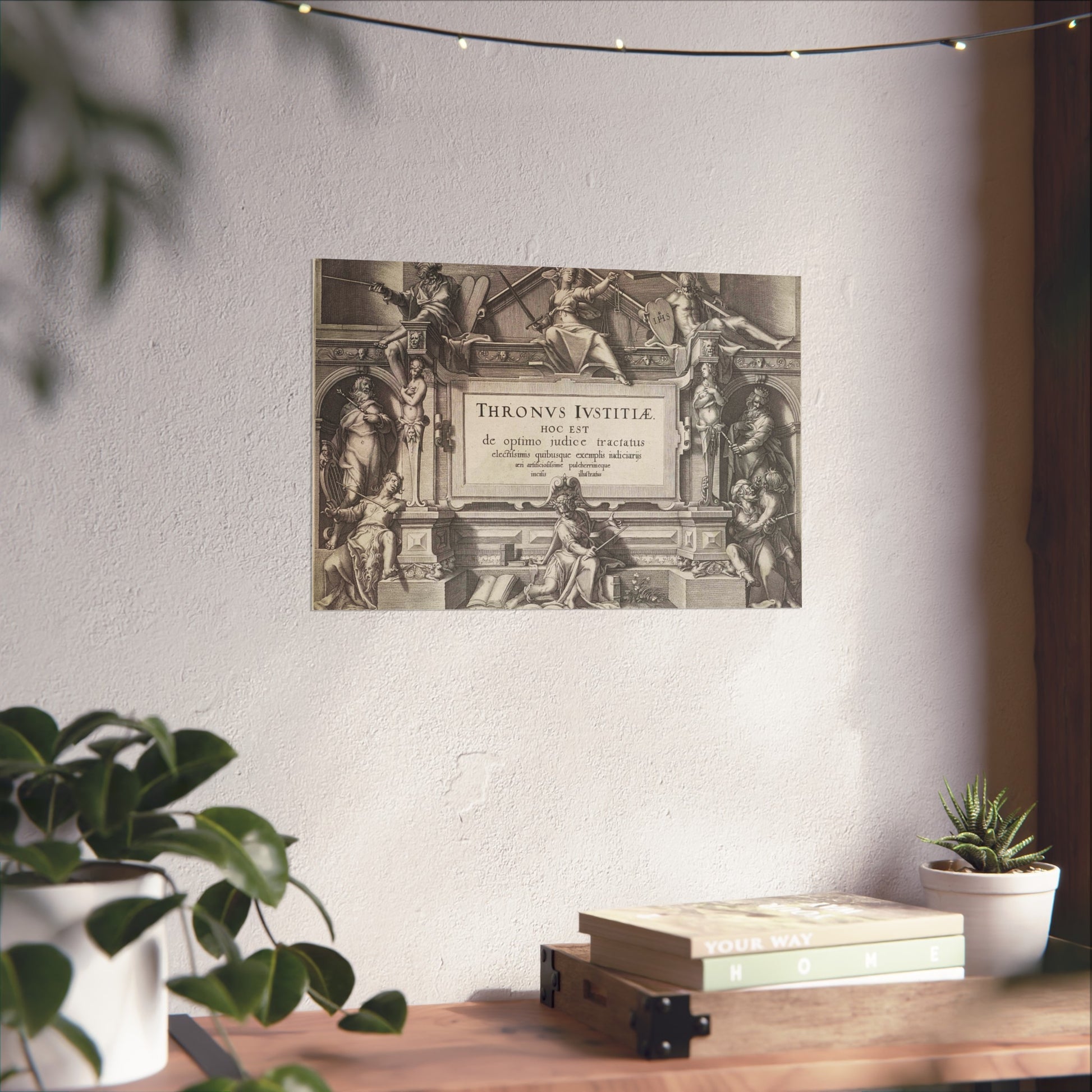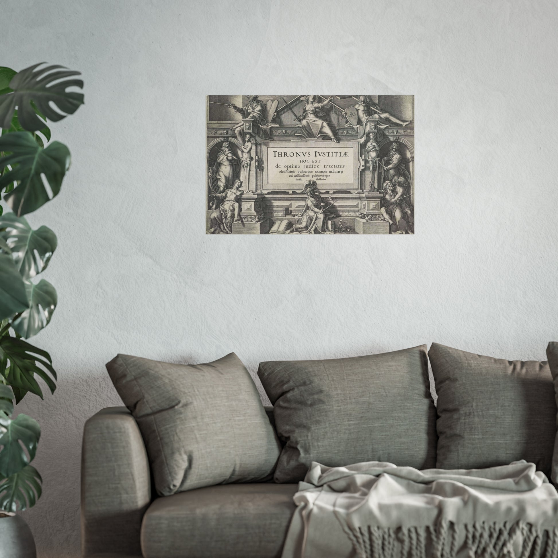 The artwork features a magnificent architectural structure adorned with an ornamental cartouche titled 'Throne of Justice'. Various figures associated with the judiciary are present, with the central figure being a judge seated on the throne, surrounded by law books and a staff. In the niches to the left and right, we find King David with his harp and King Solomon. Above them, Justice is personified, wielding a sword and scales. She is flanked by Moses, holding the tablets of law representing the Old Covenant, and Christ bearing a cross and a heart with his monogram symbolizing the New Covenant. In the lower left corner sits Judge Otanes with his father Sisamnes' skin, while in the lower right, Zaleucus' eye is being gouged out.