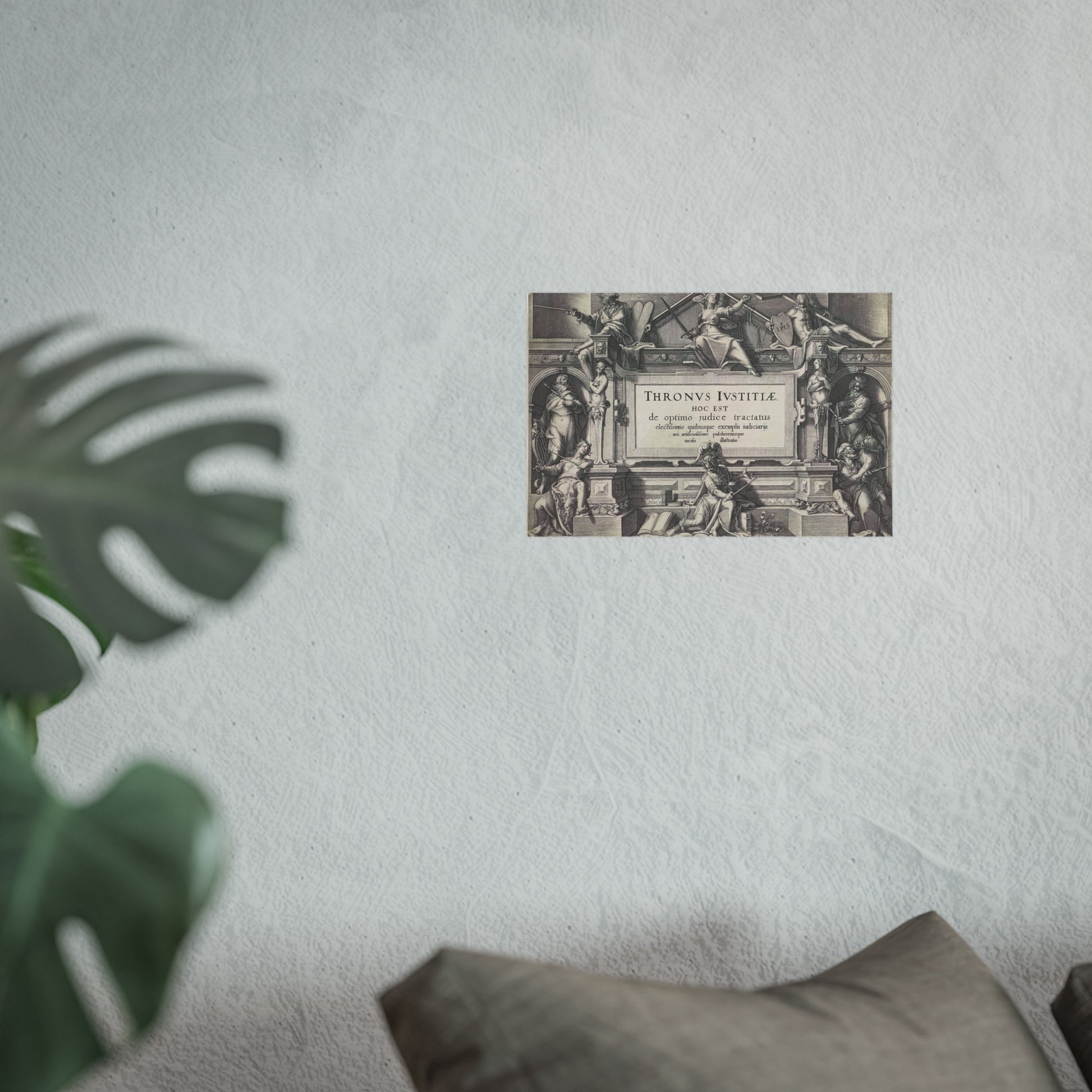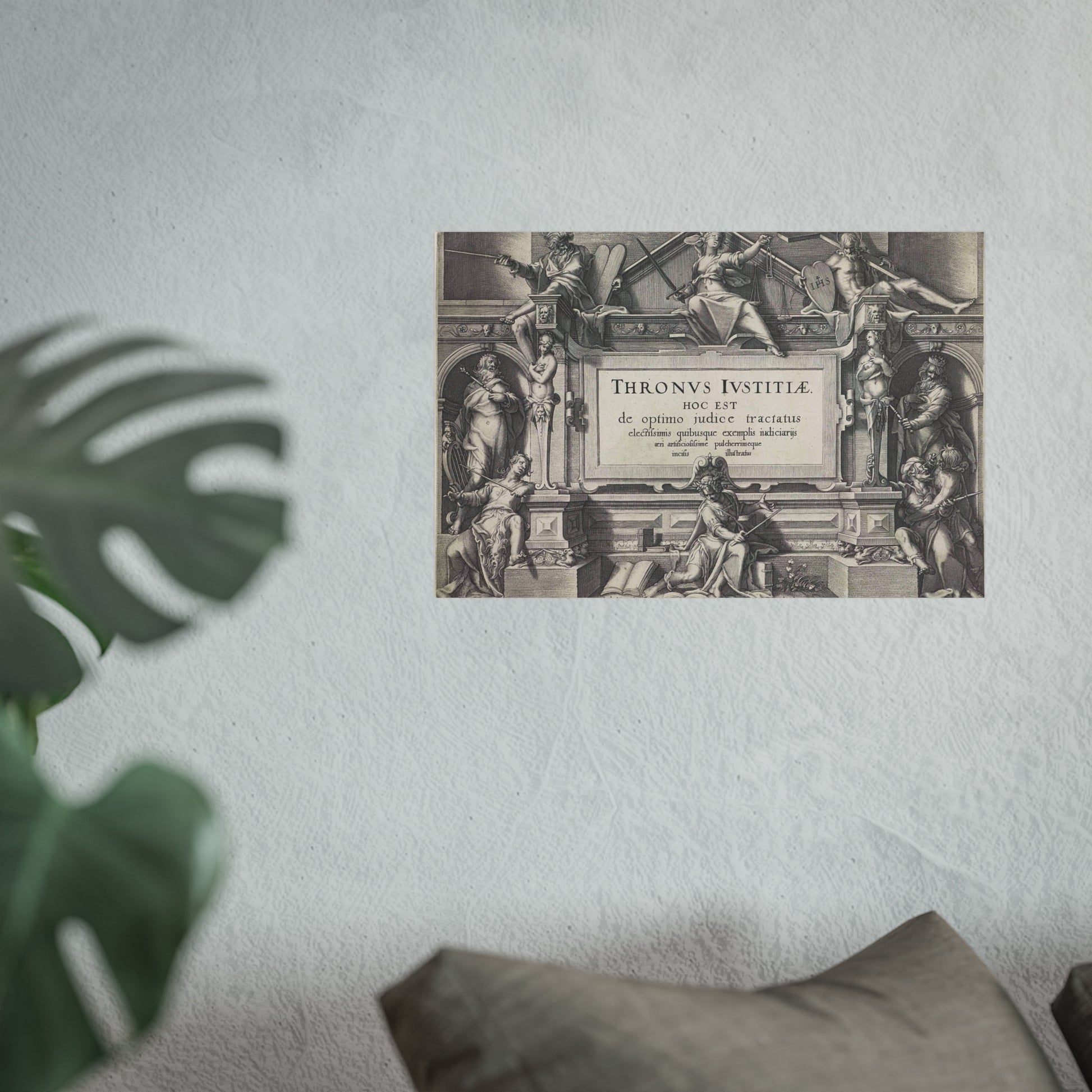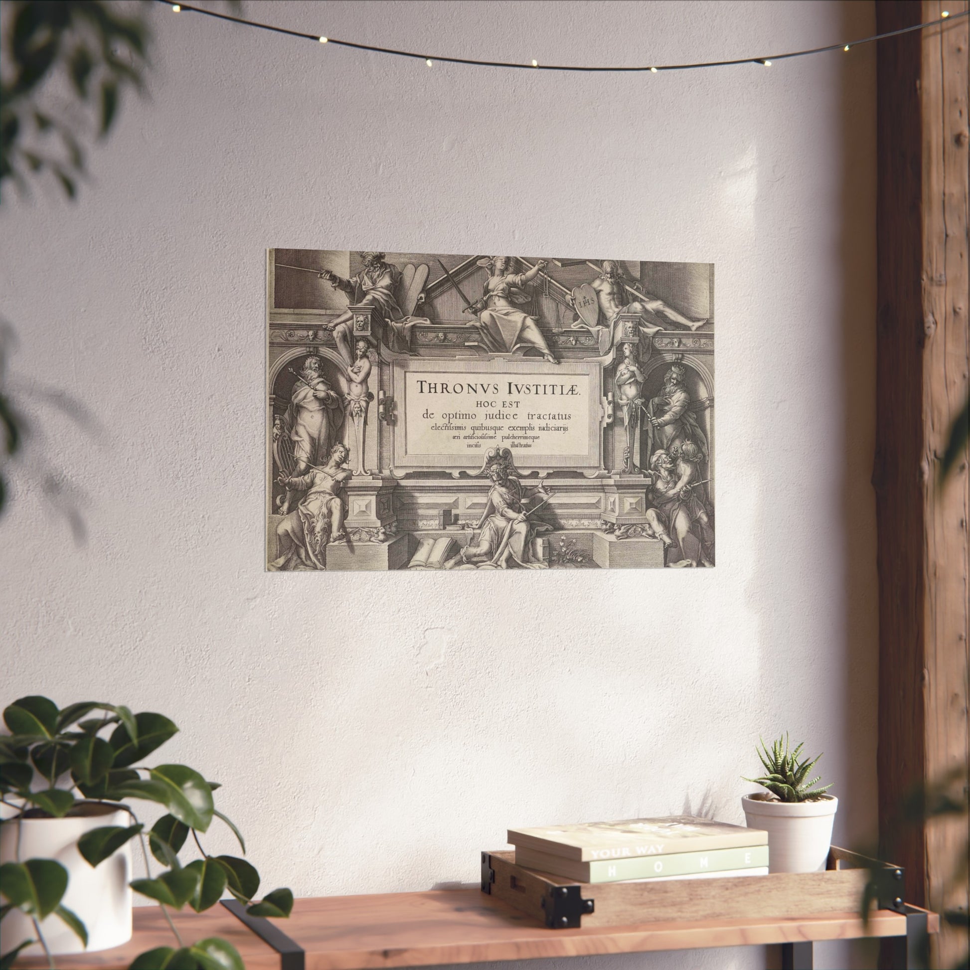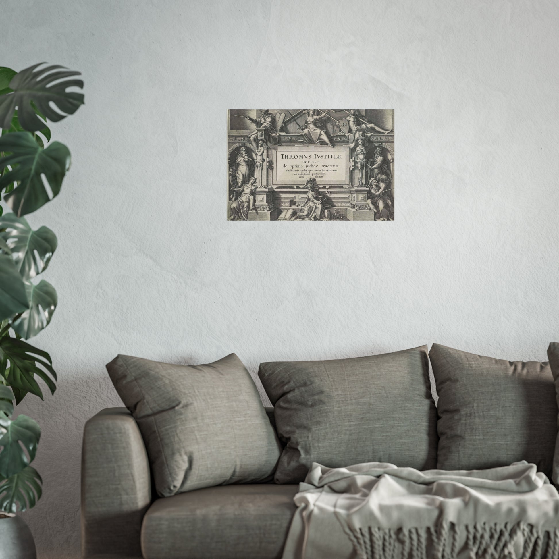 The artwork features a magnificent architectural structure adorned with an ornamental cartouche titled 'Throne of Justice'. Various figures associated with the judiciary are present, with the central figure being a judge seated on the throne, surrounded by law books and a staff. In the niches to the left and right, we find King David with his harp and King Solomon. Above them, Justice is personified, wielding a sword and scales. She is flanked by Moses, holding the tablets of law representing the Old Covenant, and Christ bearing a cross and a heart with his monogram symbolizing the New Covenant. In the lower left corner sits Judge Otanes with his father Sisamnes' skin, while in the lower right, Zaleucus' eye is being gouged out.