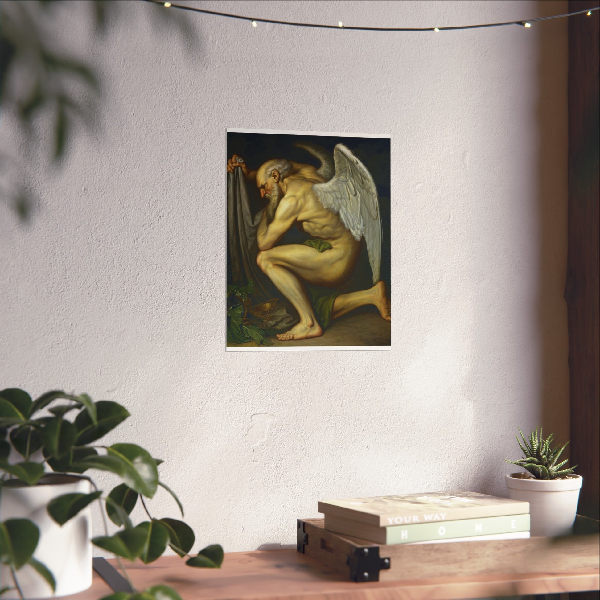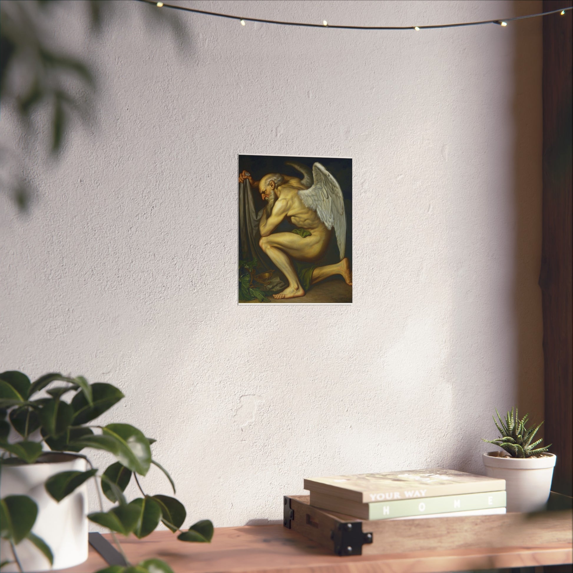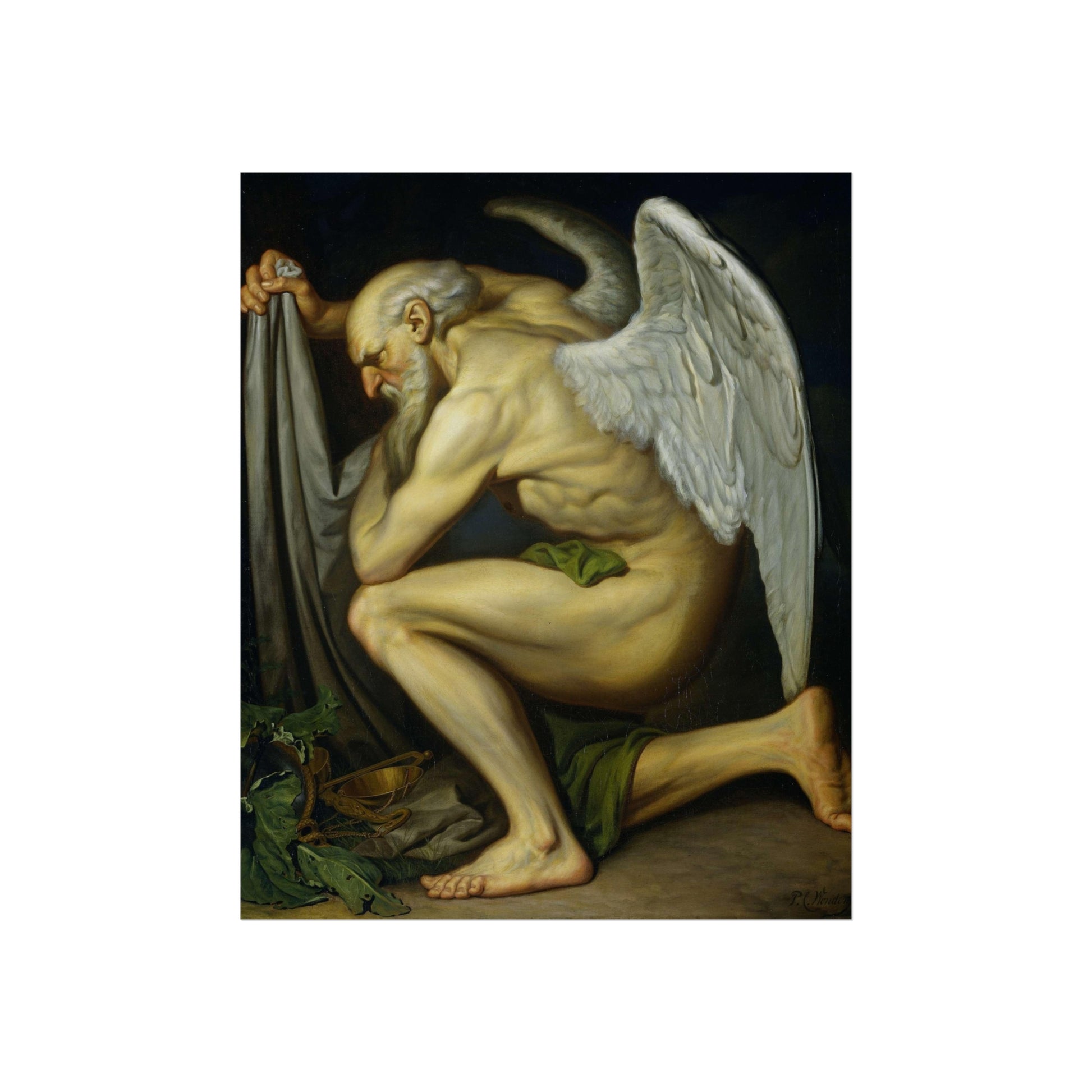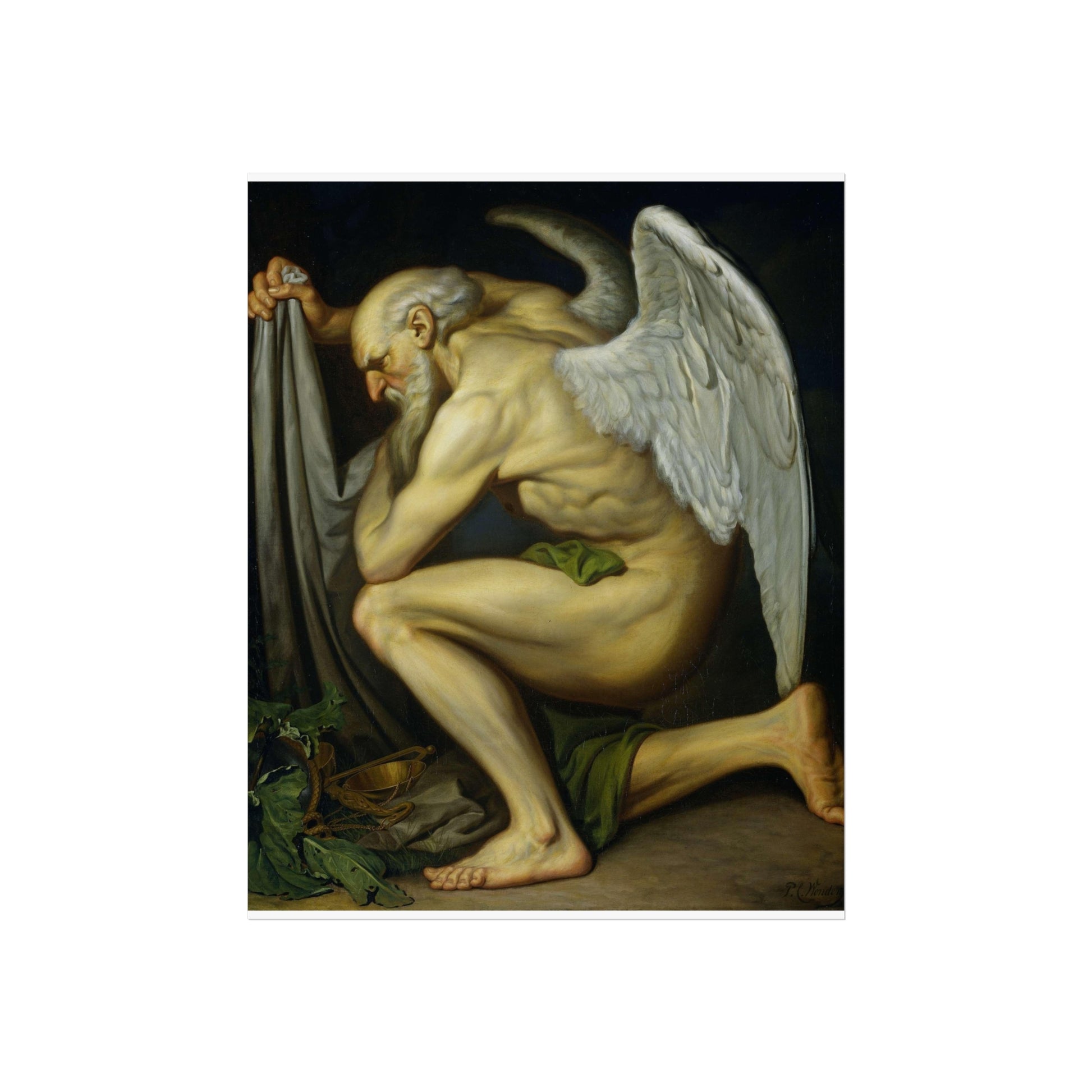 Behold Father Time, depicted in his naked glory with wings adorning his back. He kneels on his right knee, captured in a leftward profile. In his right hand, he holds aloft a cloth, while a golden scale rests among leaves on the ground.