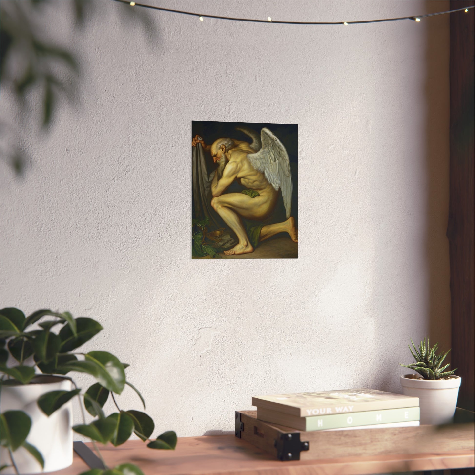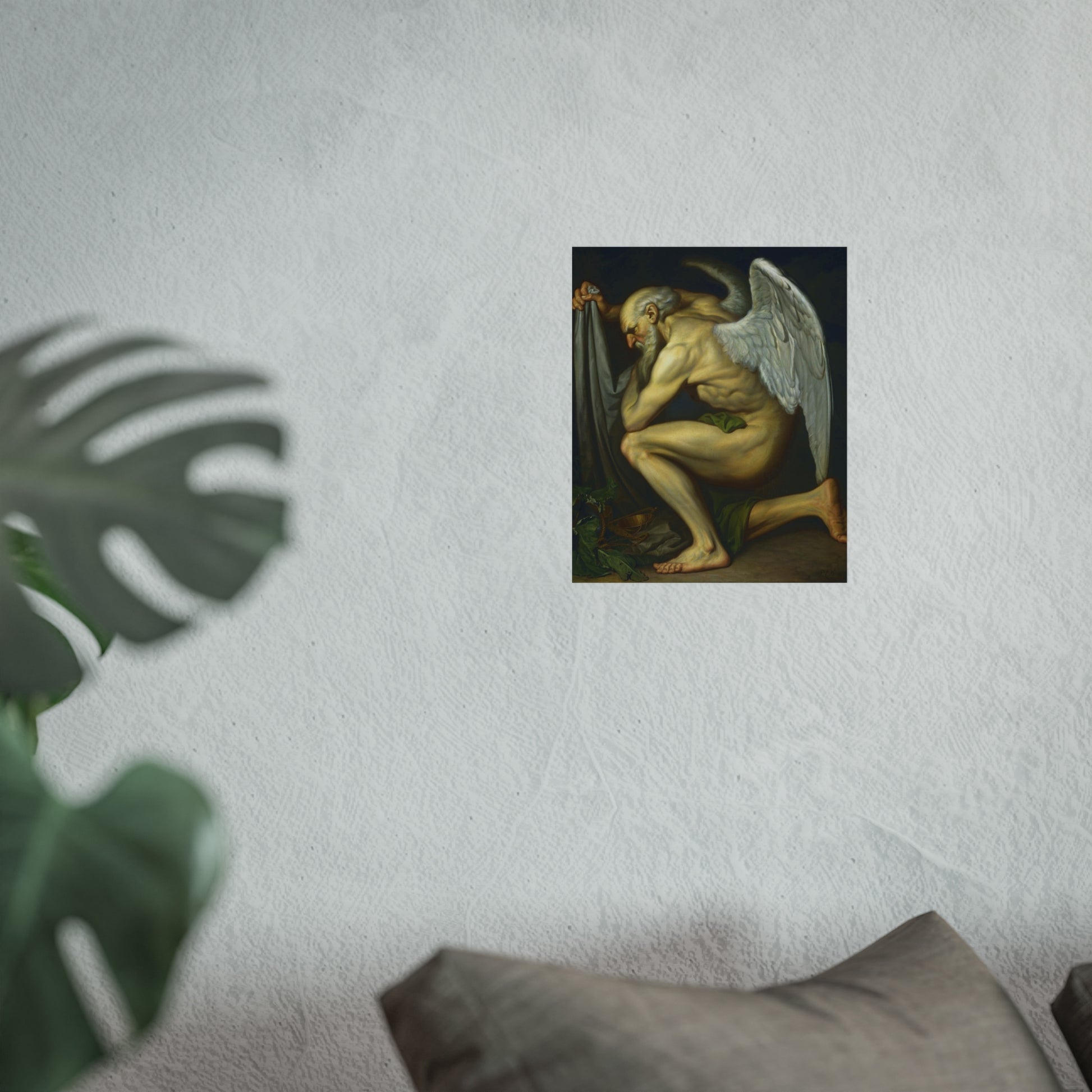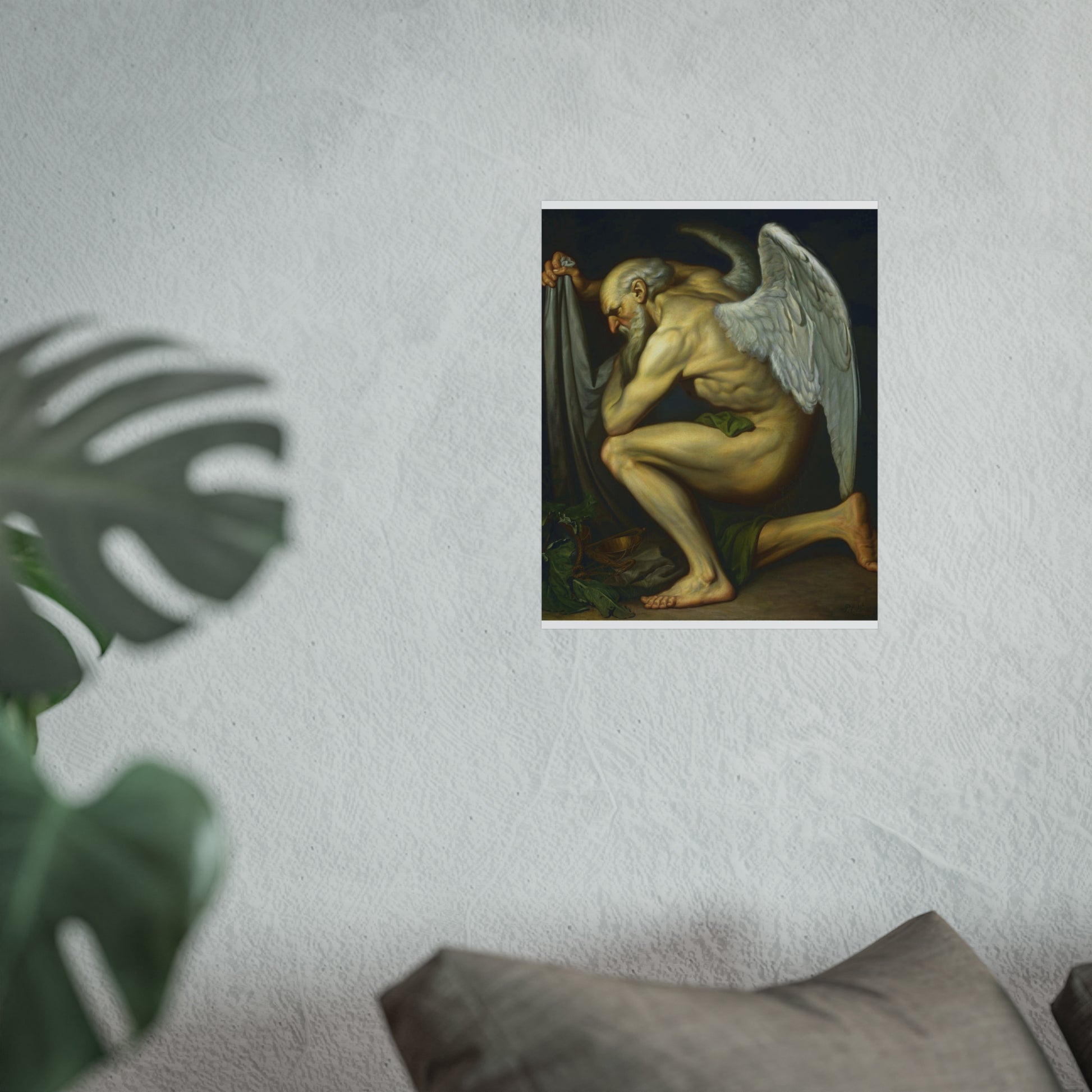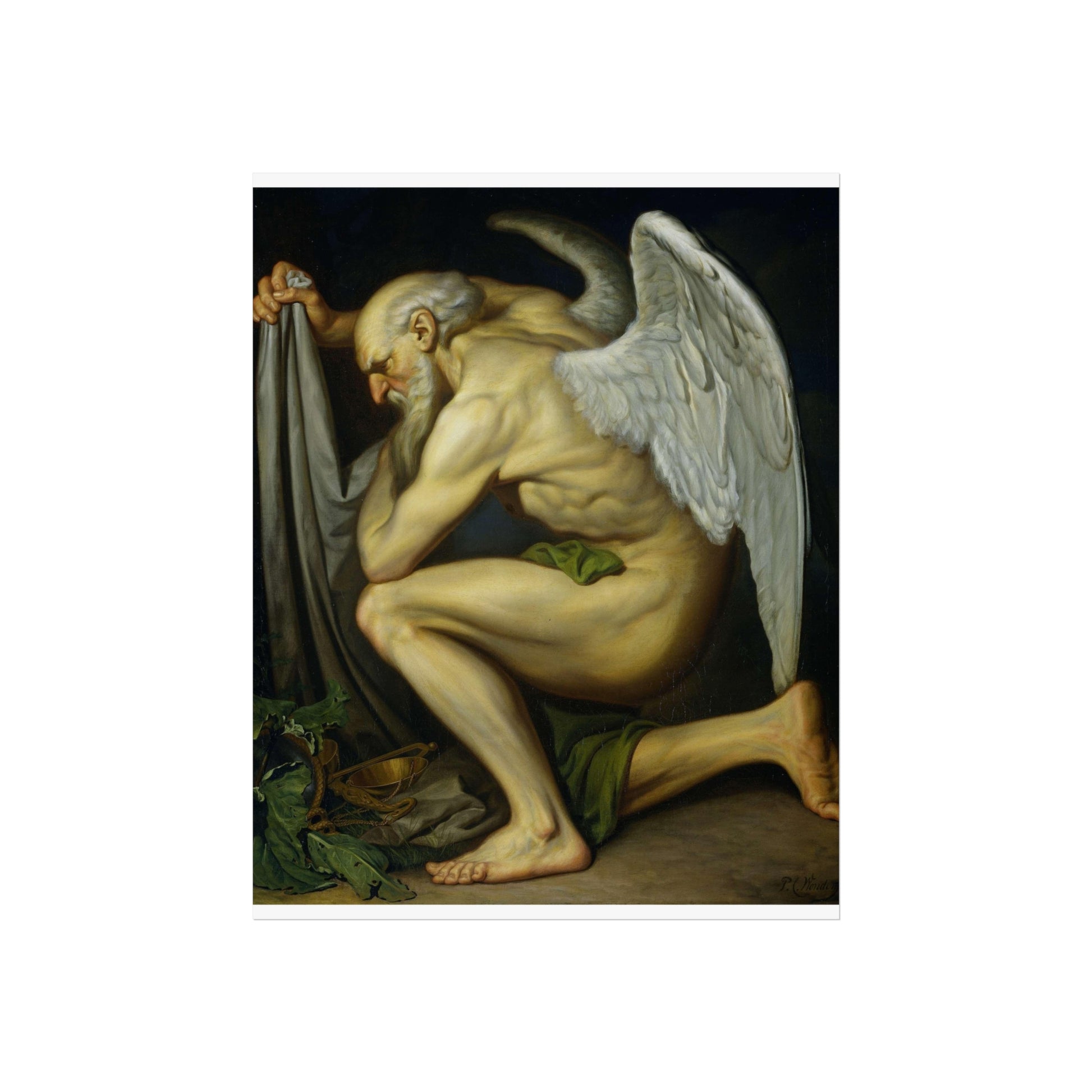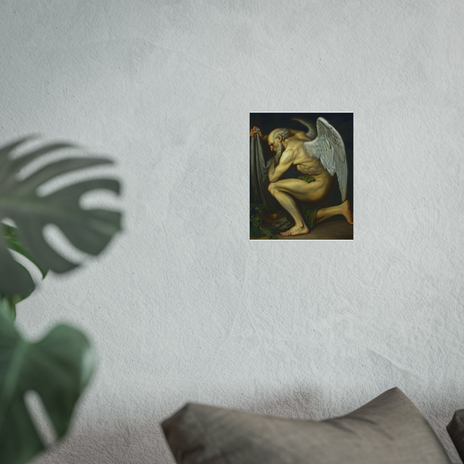 Behold Father Time, depicted in his naked glory with wings adorning his back. He kneels on his right knee, captured in a leftward profile. In his right hand, he holds aloft a cloth, while a golden scale rests among leaves on the ground.