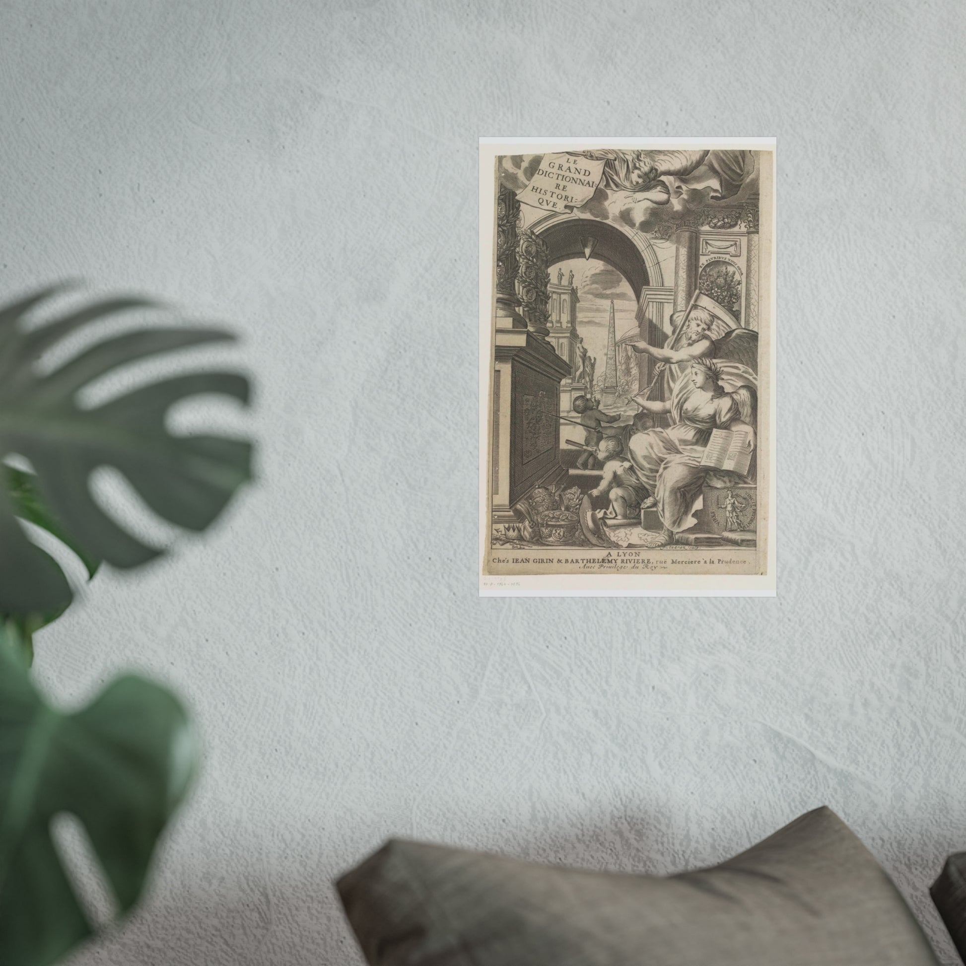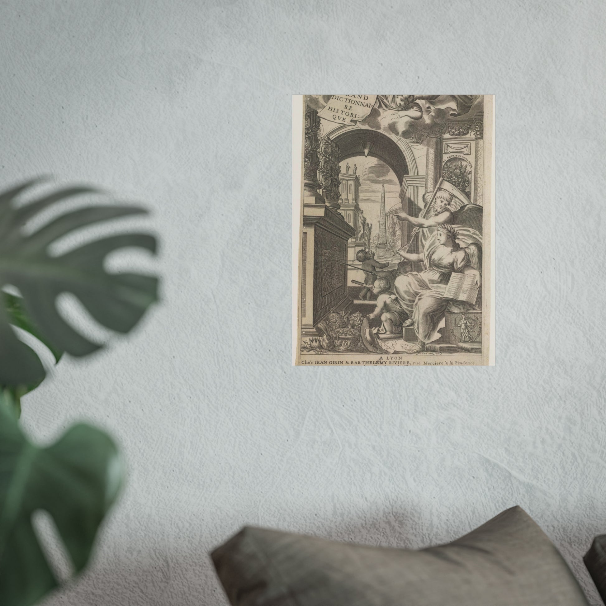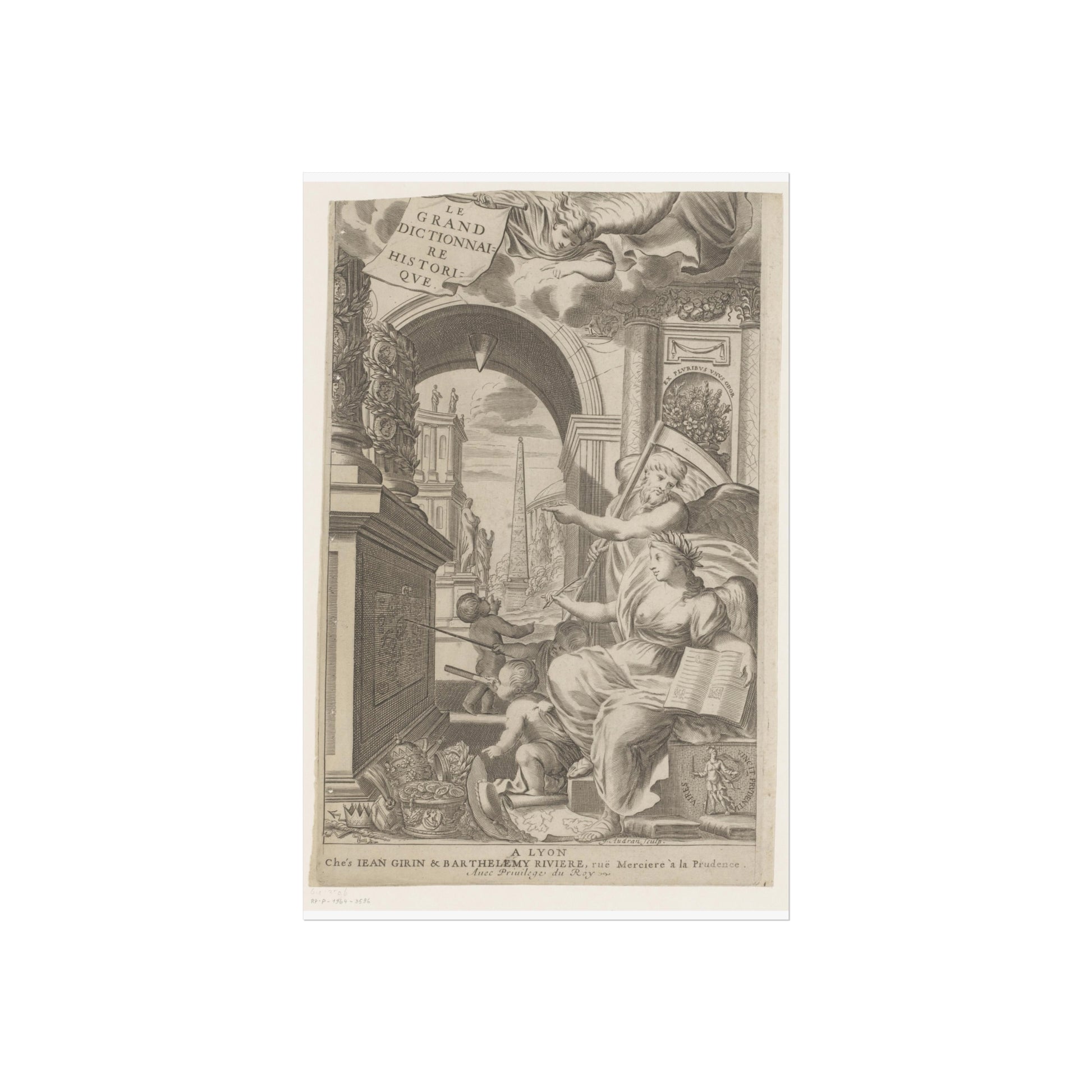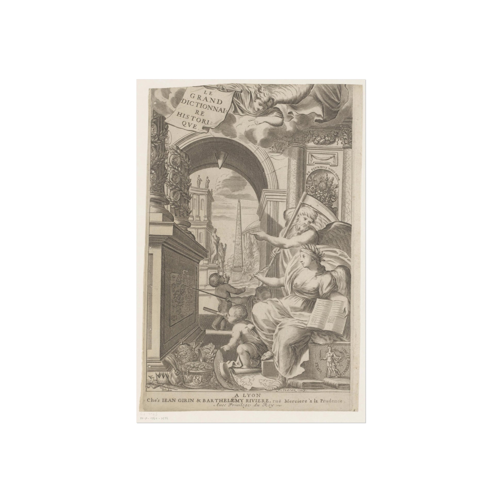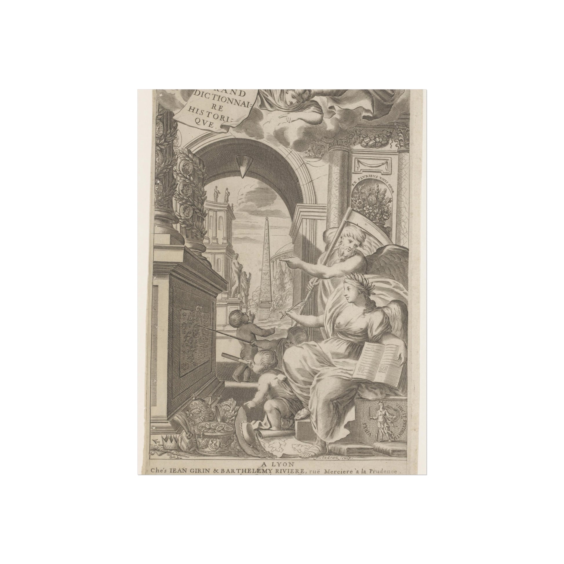 In the foreground, Chronos and History point towards an altar adorned with medallions of ancient rulers. At the base of this altar, cherubic figures study a drawing intently. Scattered in front are royal and religious headdresses, stacked haphazardly. Through a gap, a square unfolds, dominated by an obelisk and sprinkled with ancient statues.
