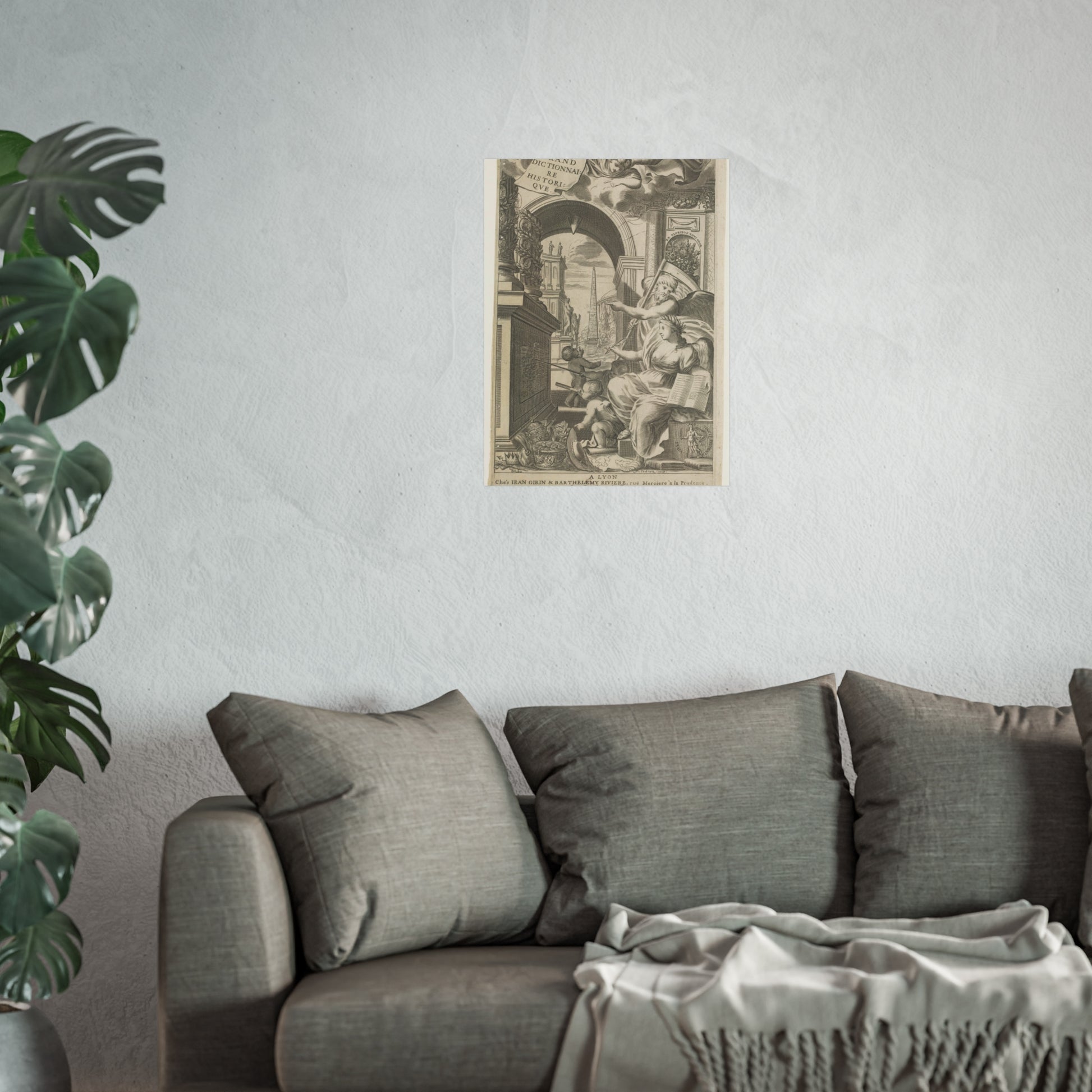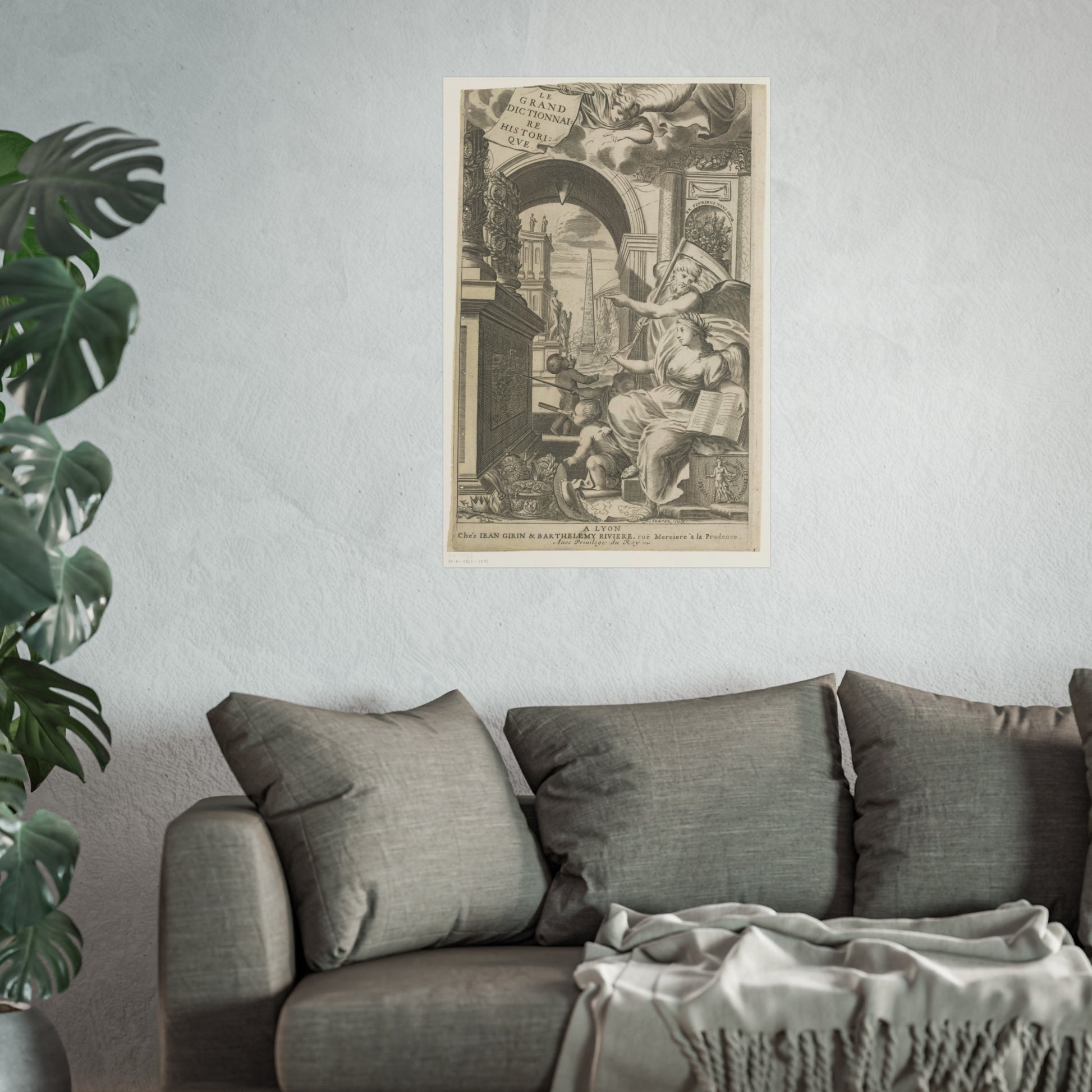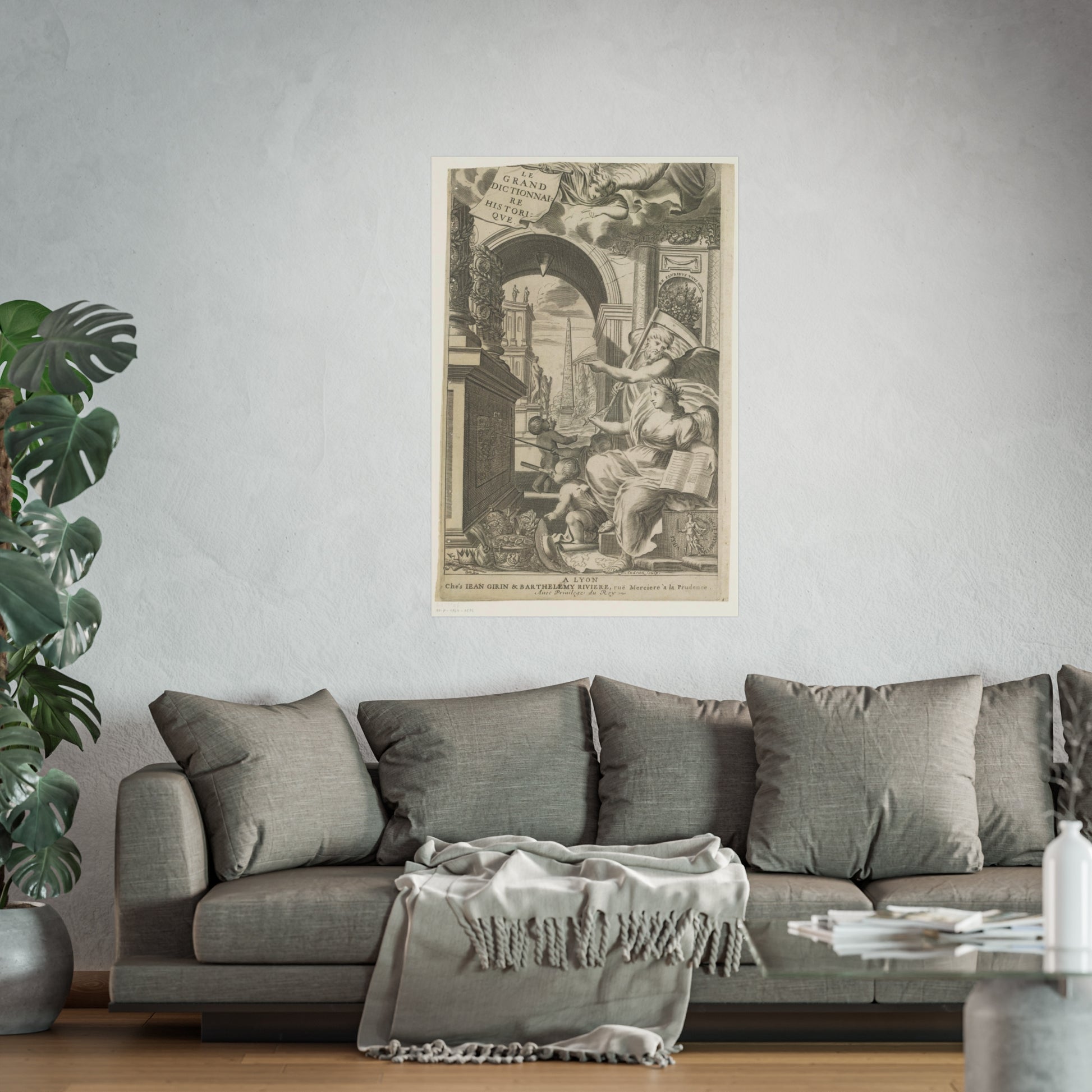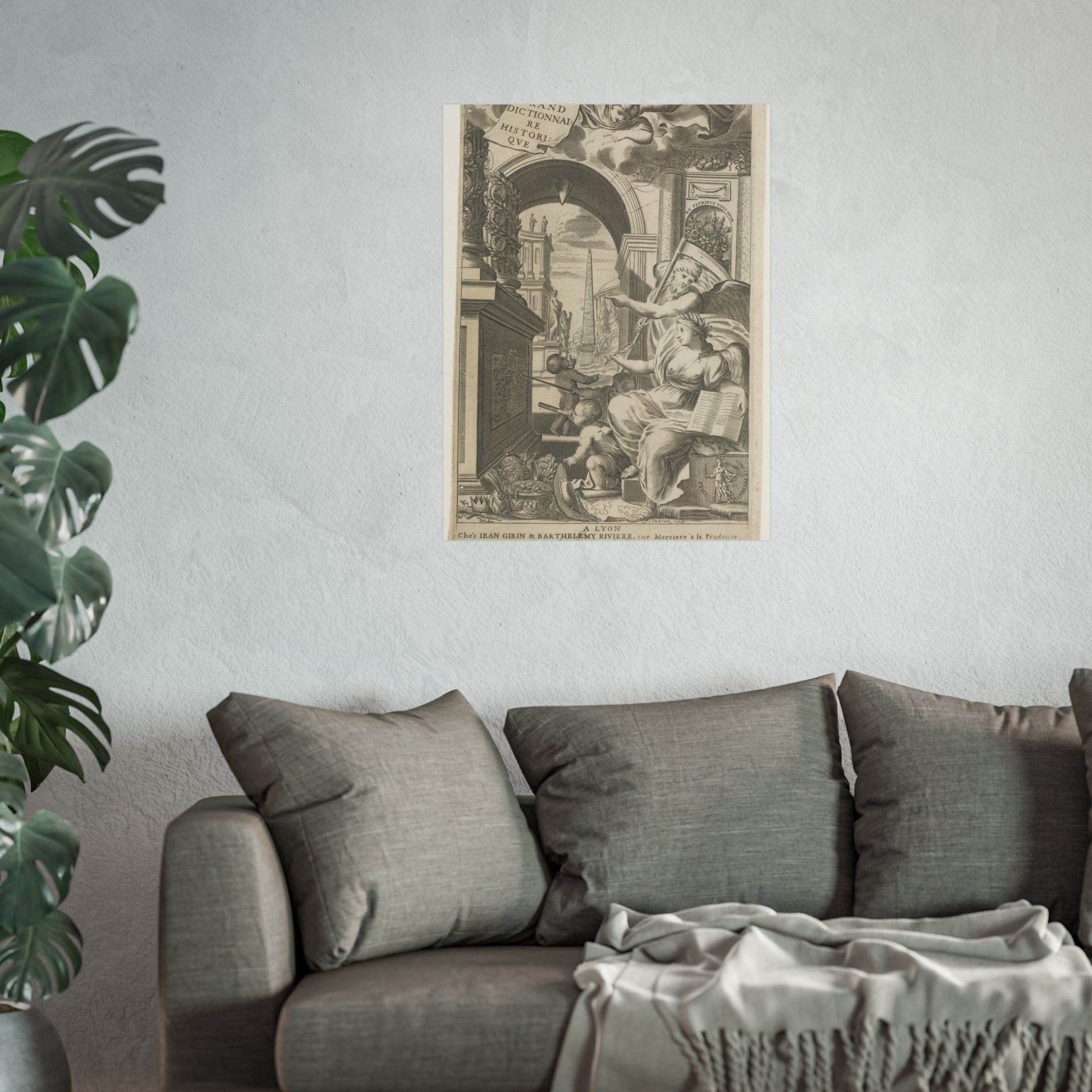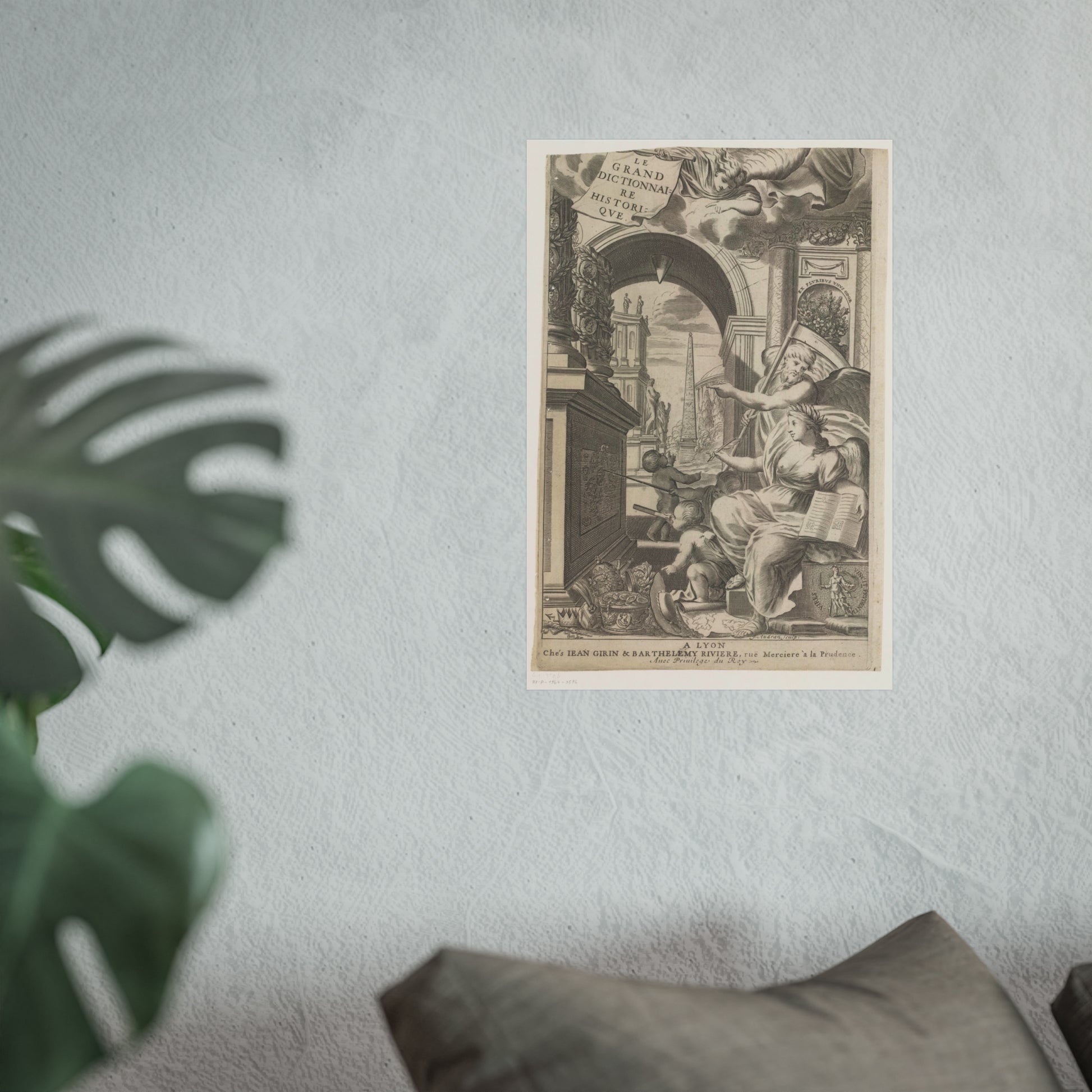 In the foreground, Chronos and History point towards an altar adorned with medallions of ancient rulers. At the base of this altar, cherubic figures study a drawing intently. Scattered in front are royal and religious headdresses, stacked haphazardly. Through a gap, a square unfolds, dominated by an obelisk and sprinkled with ancient statues.