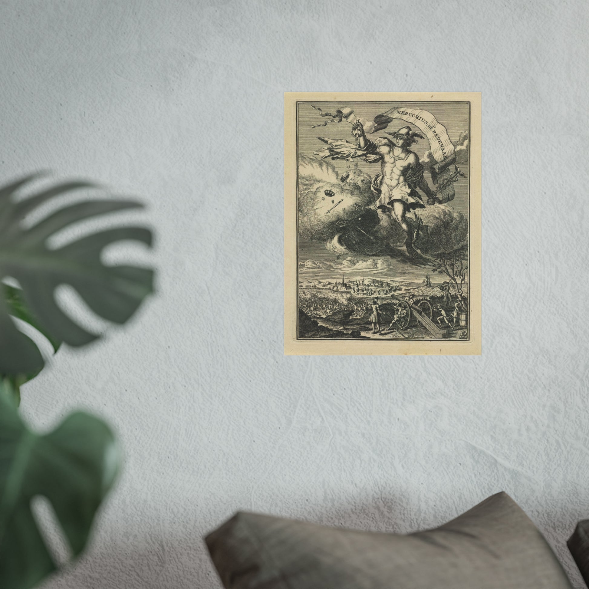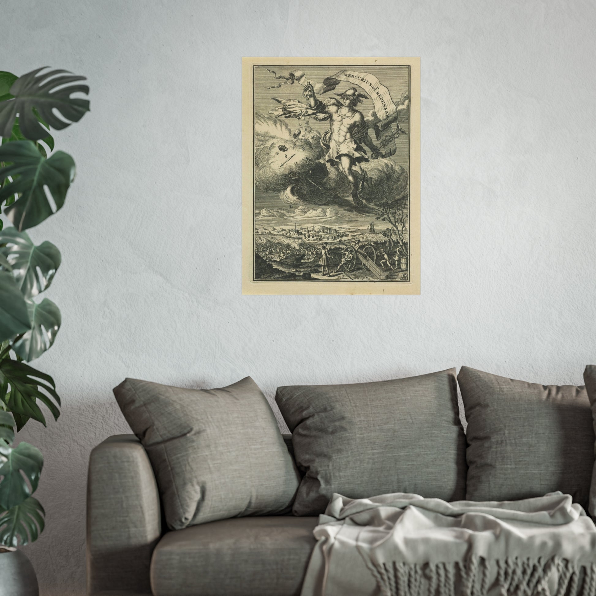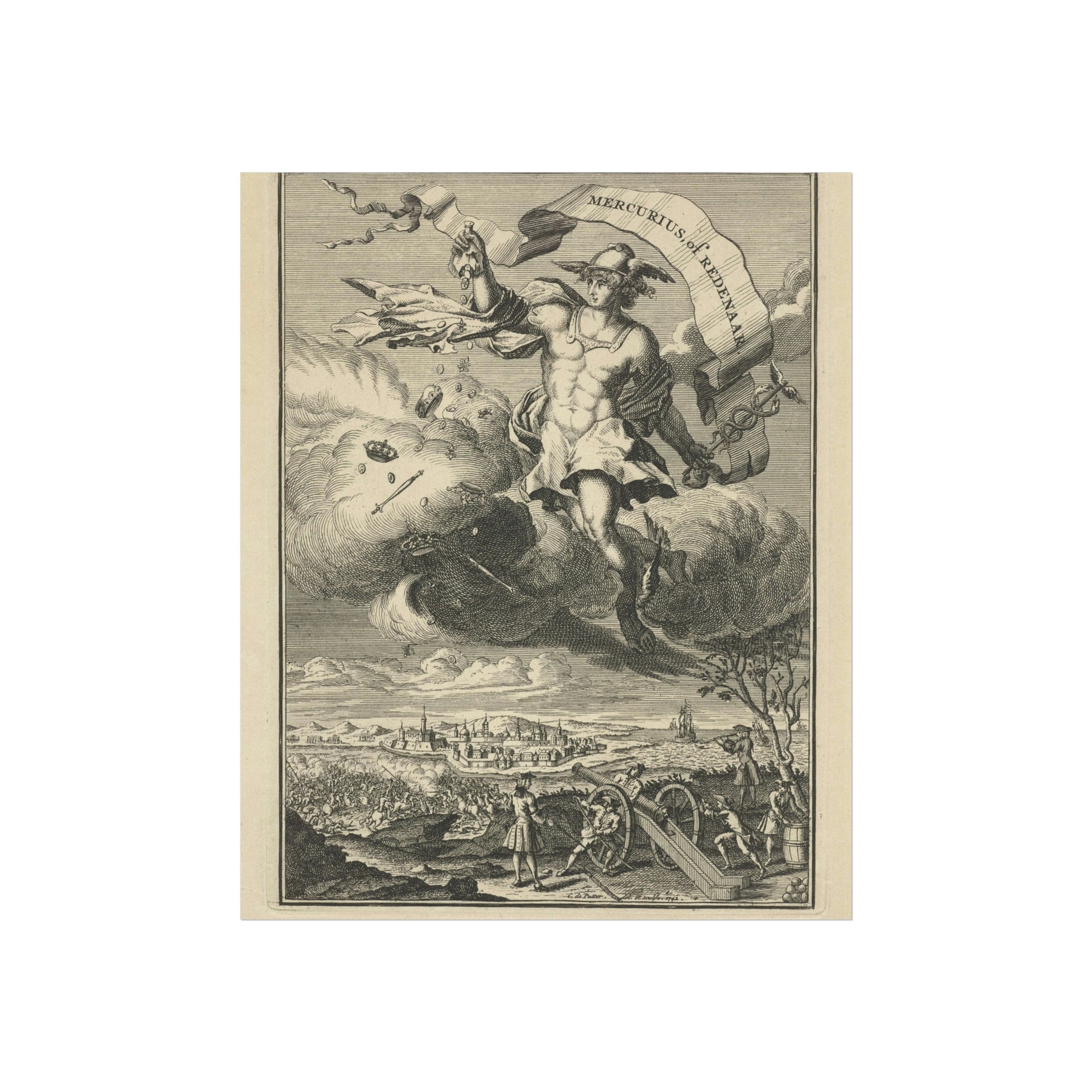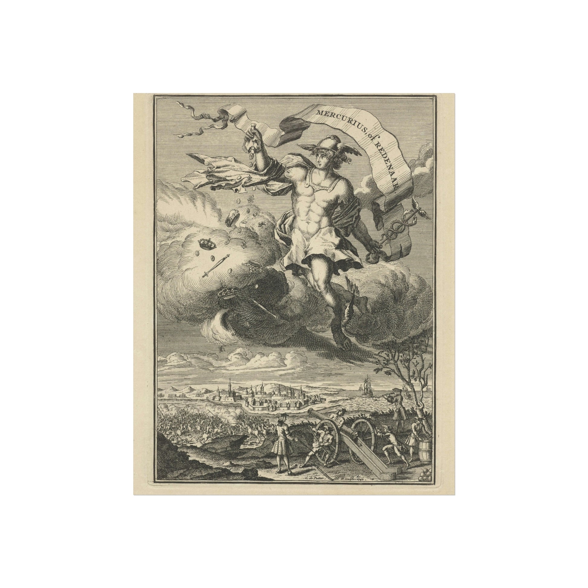 This captivating piece showcases Mercury, the messenger of the gods, suspended in mid-air, scattering a torn bundle of money over the battlefield beneath him. In the background, a fortified city and the sea add depth and context to this dramatic scene.