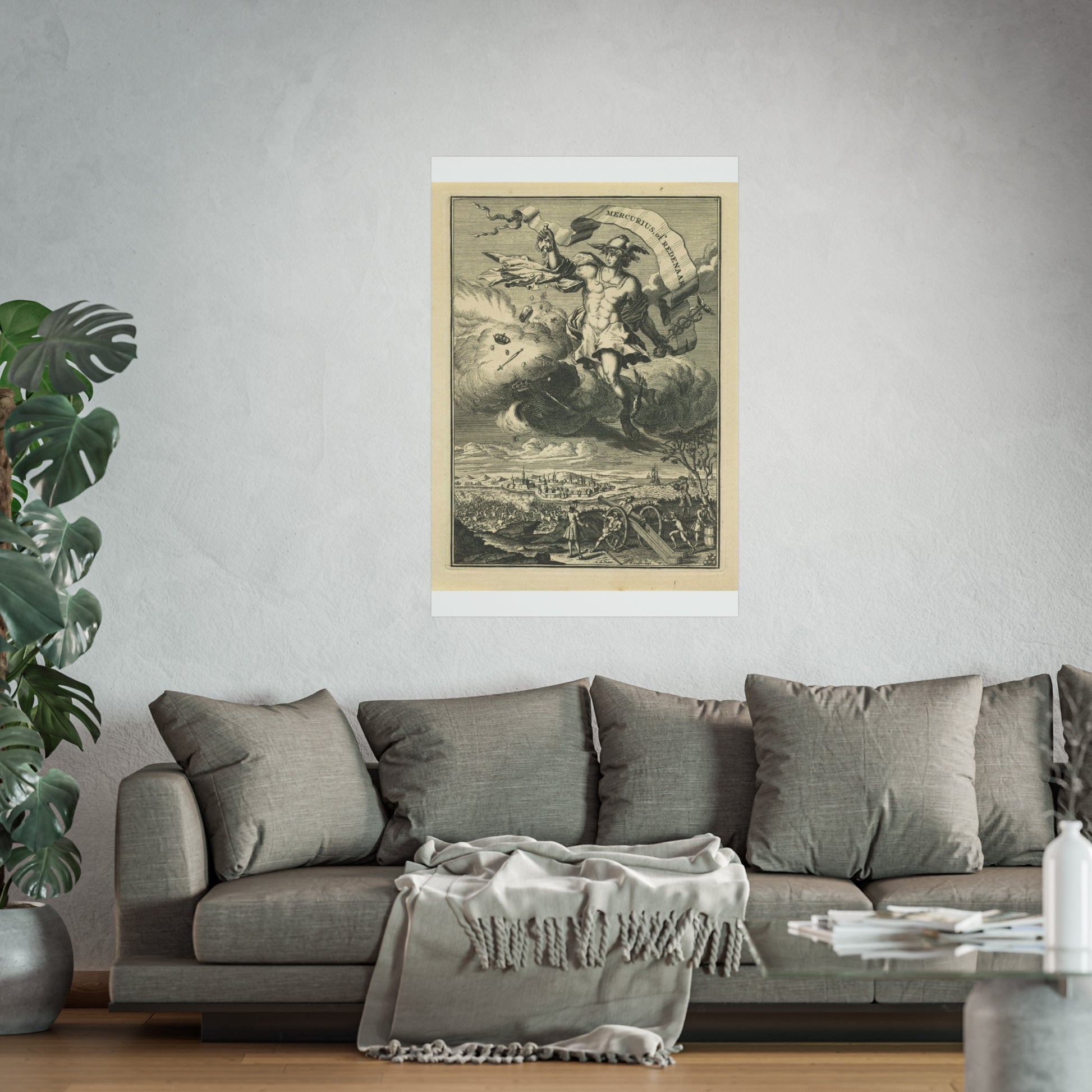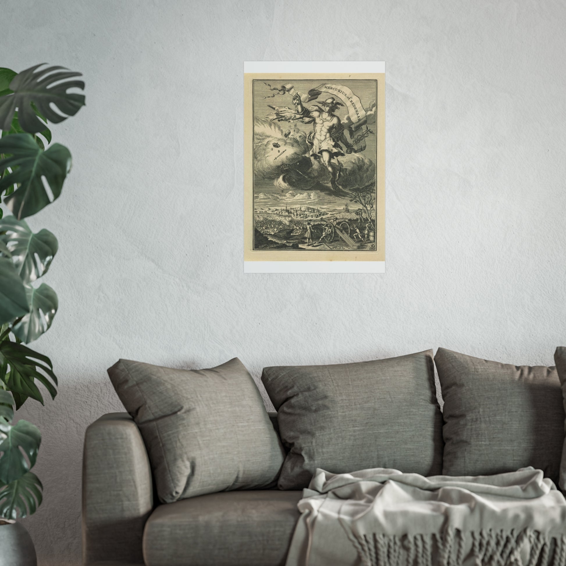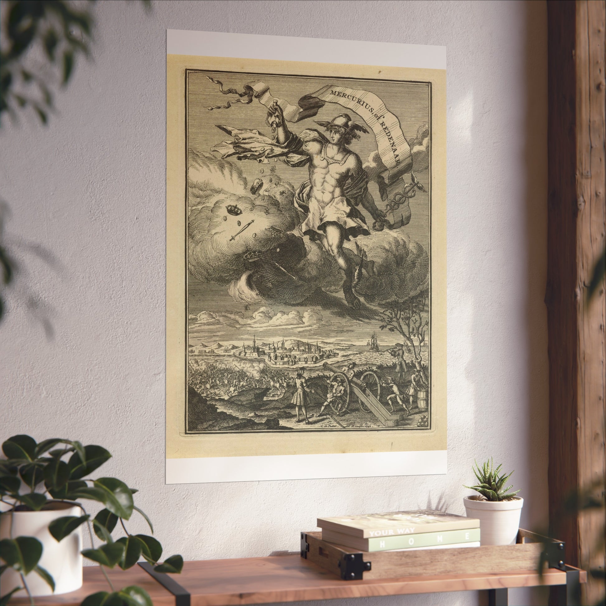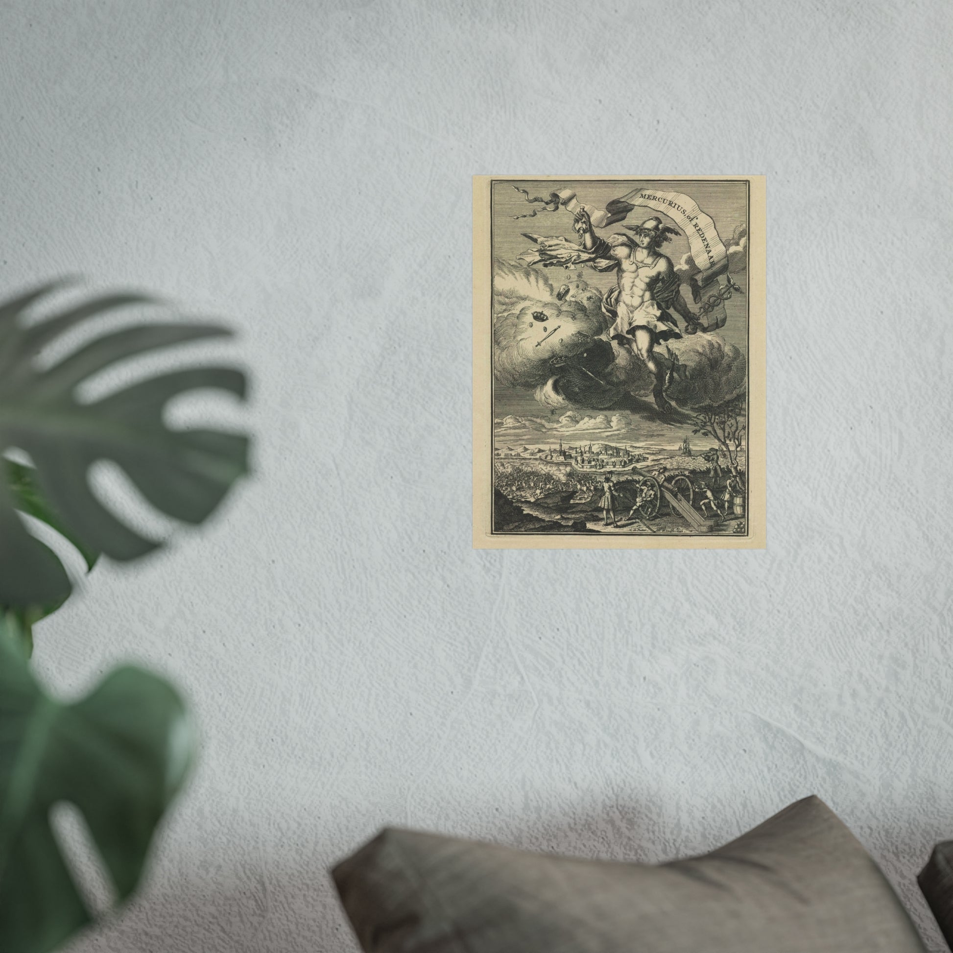 This captivating piece showcases Mercury, the messenger of the gods, suspended in mid-air, scattering a torn bundle of money over the battlefield beneath him. In the background, a fortified city and the sea add depth and context to this dramatic scene.