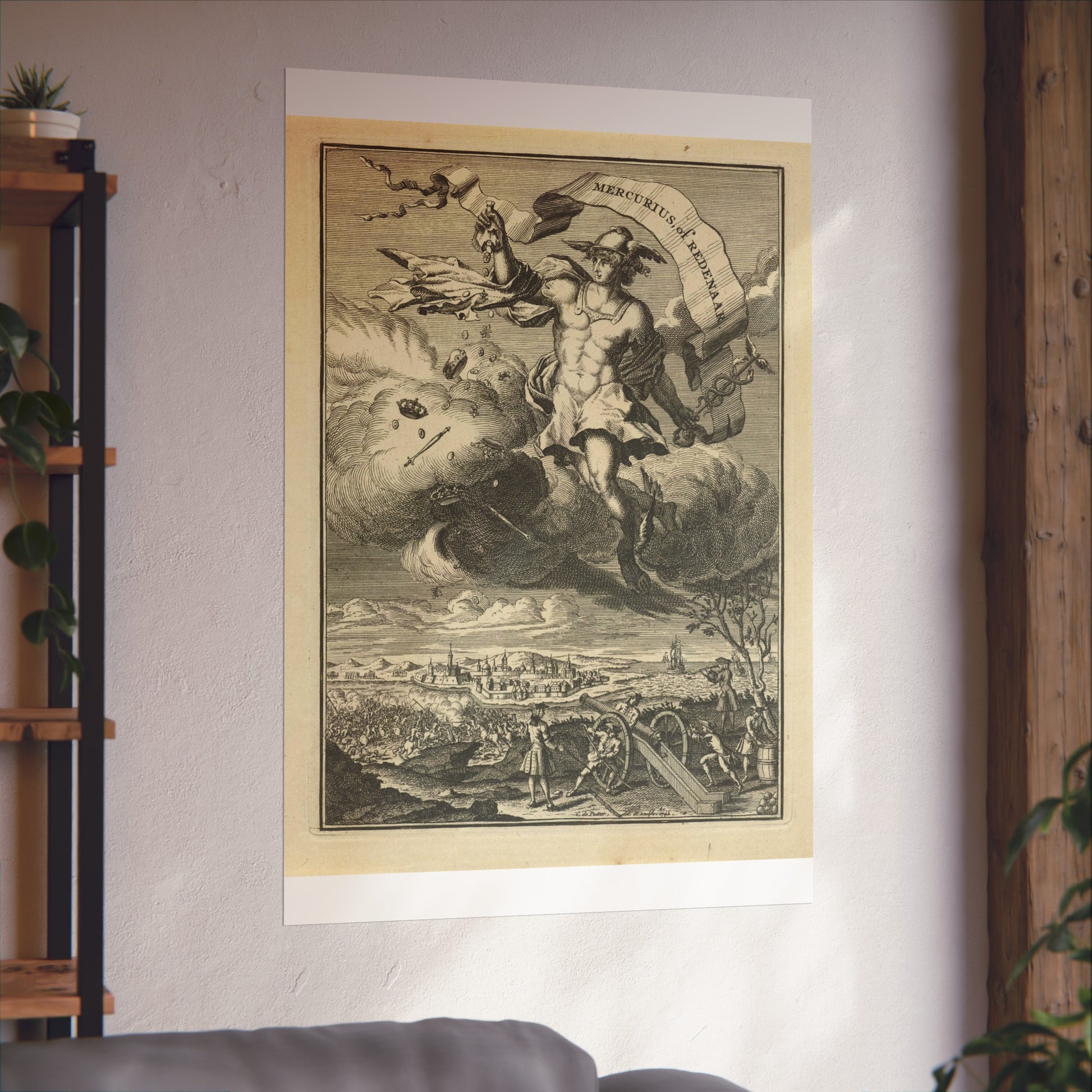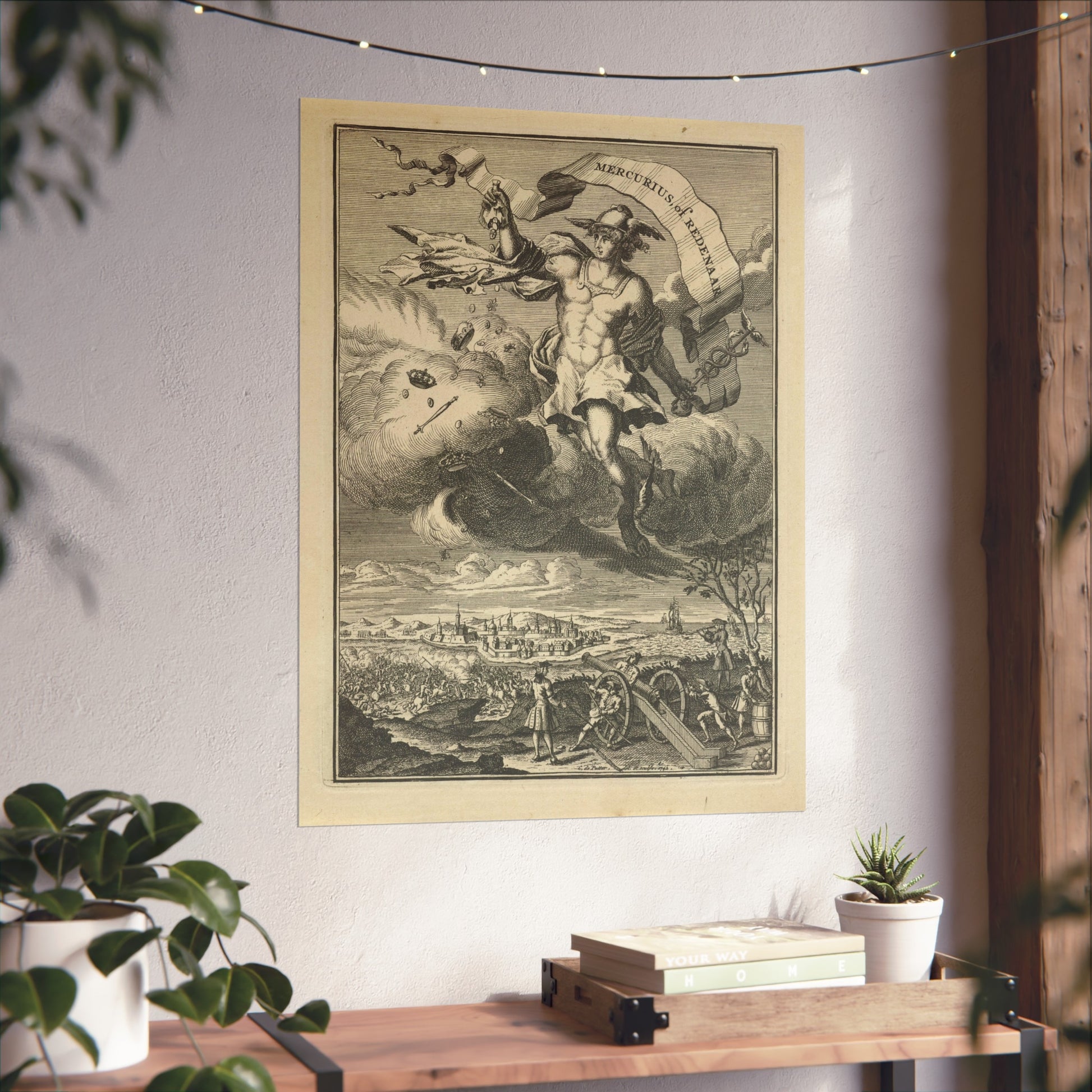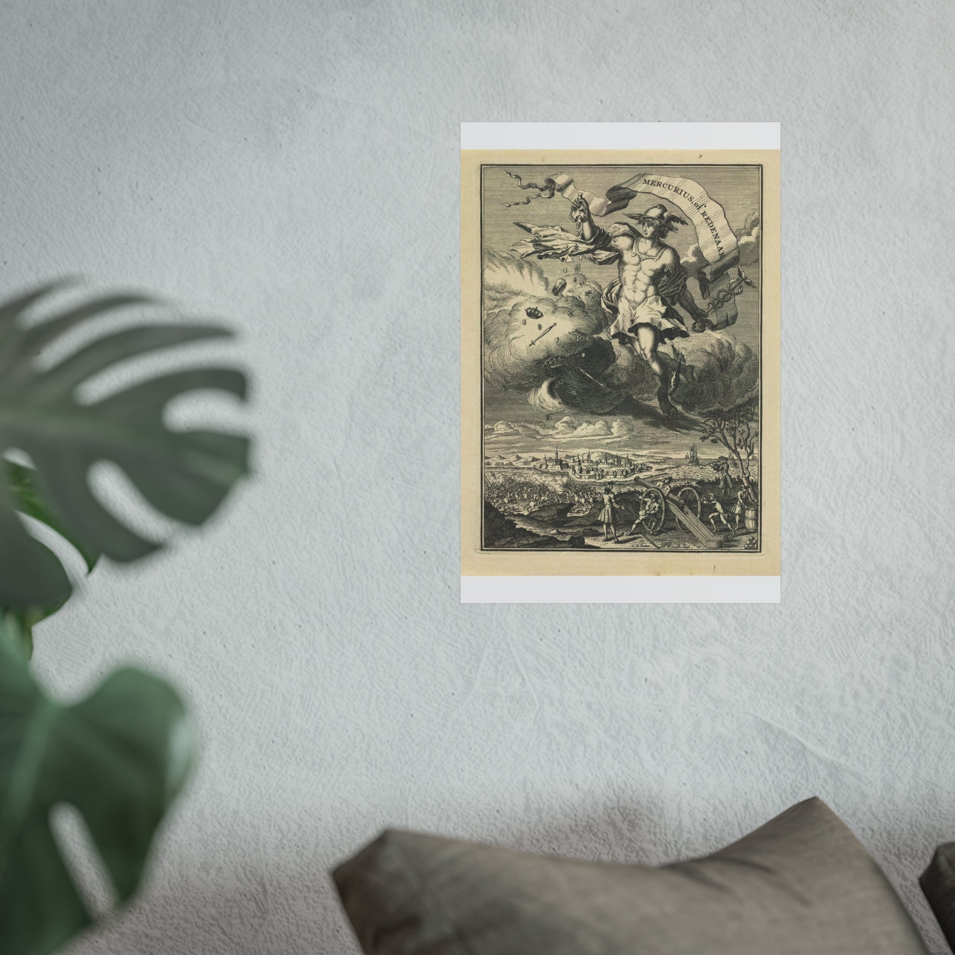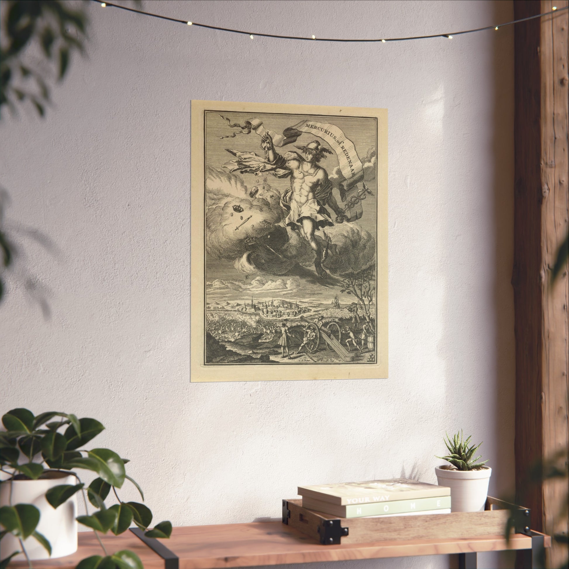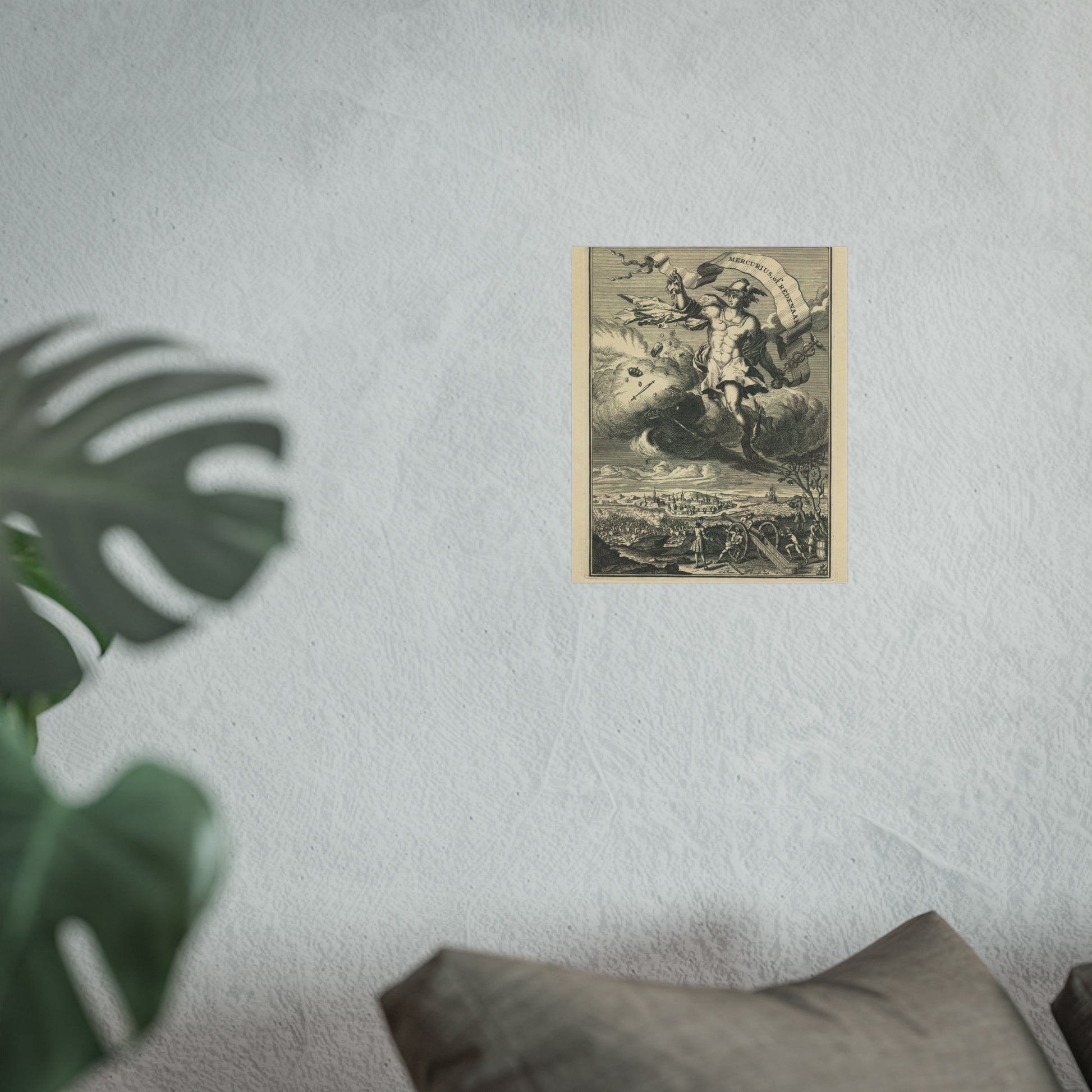 This captivating piece showcases Mercury, the messenger of the gods, suspended in mid-air, scattering a torn bundle of money over the battlefield beneath him. In the background, a fortified city and the sea add depth and context to this dramatic scene.