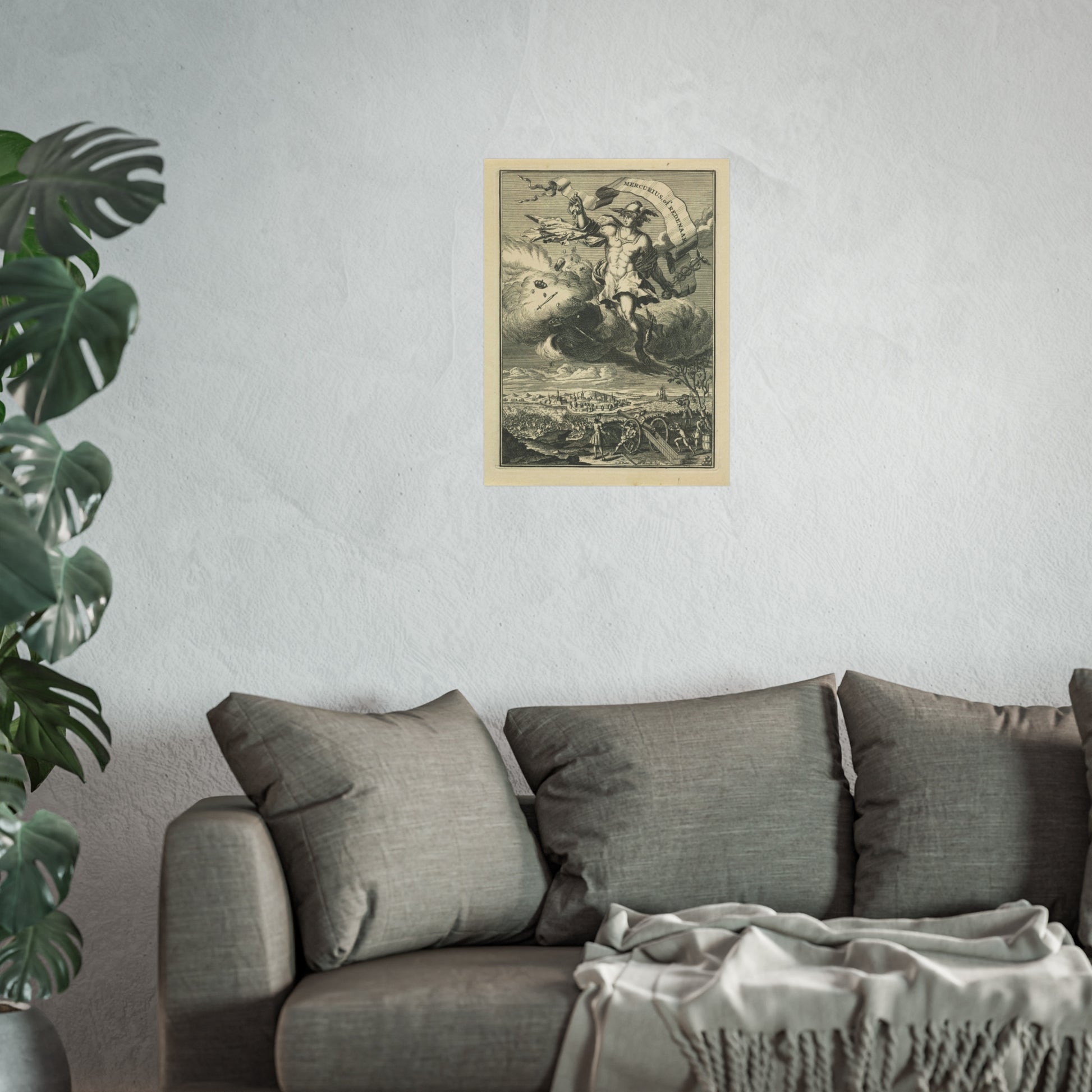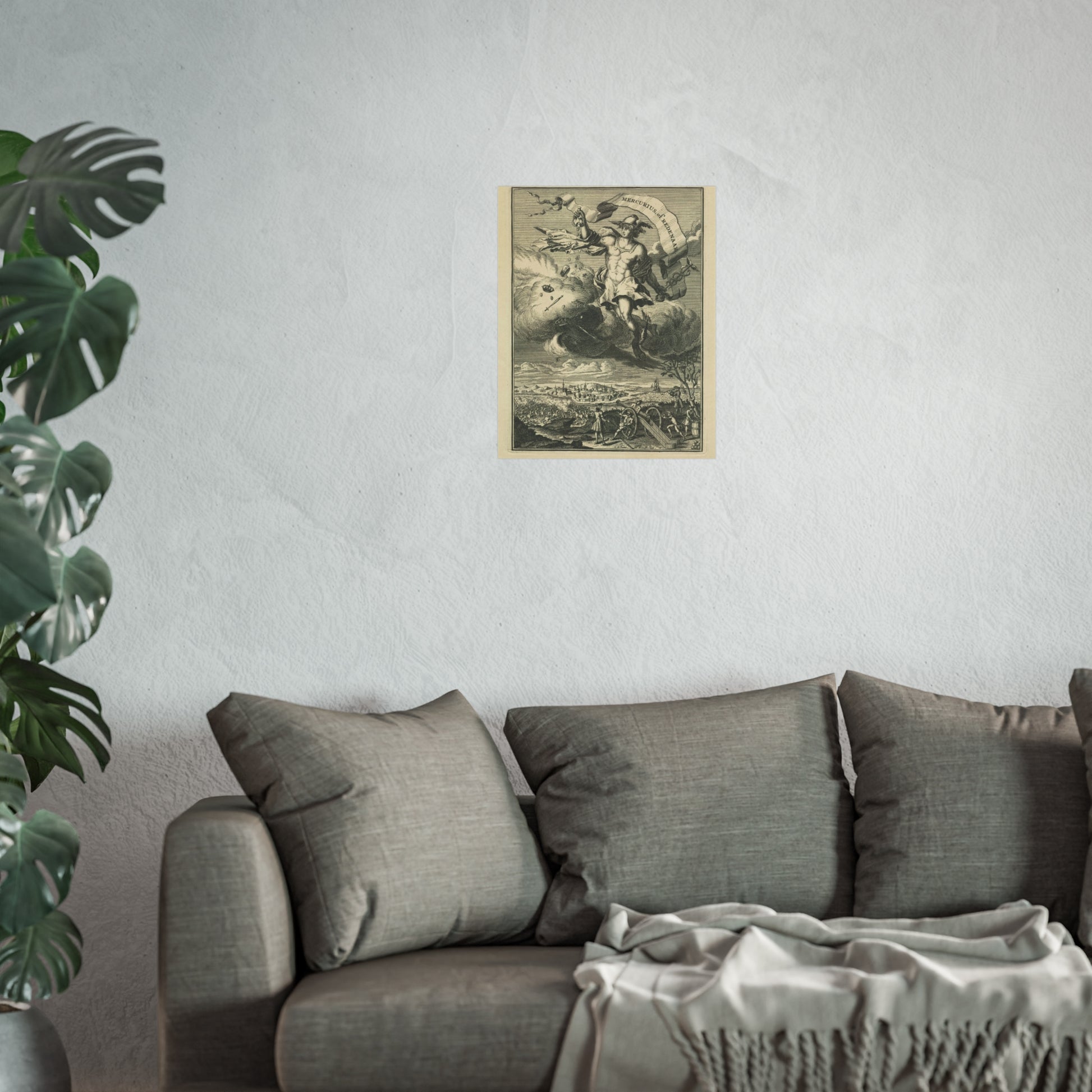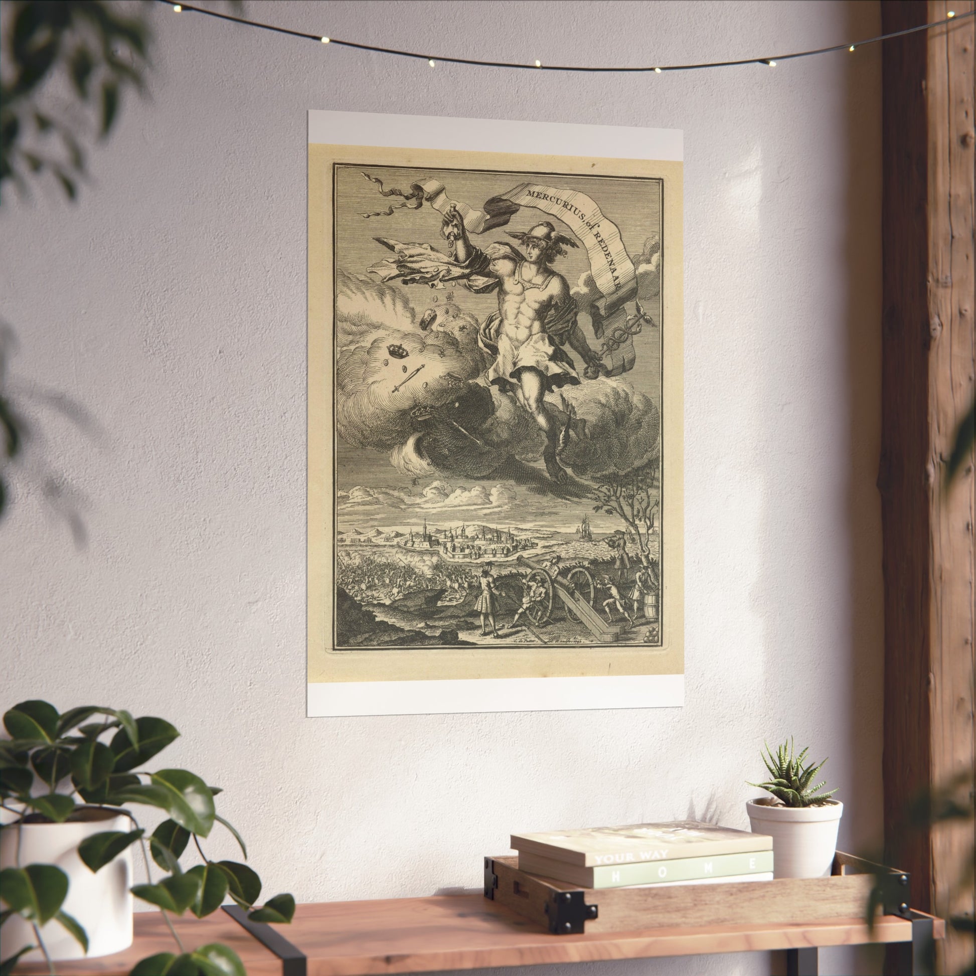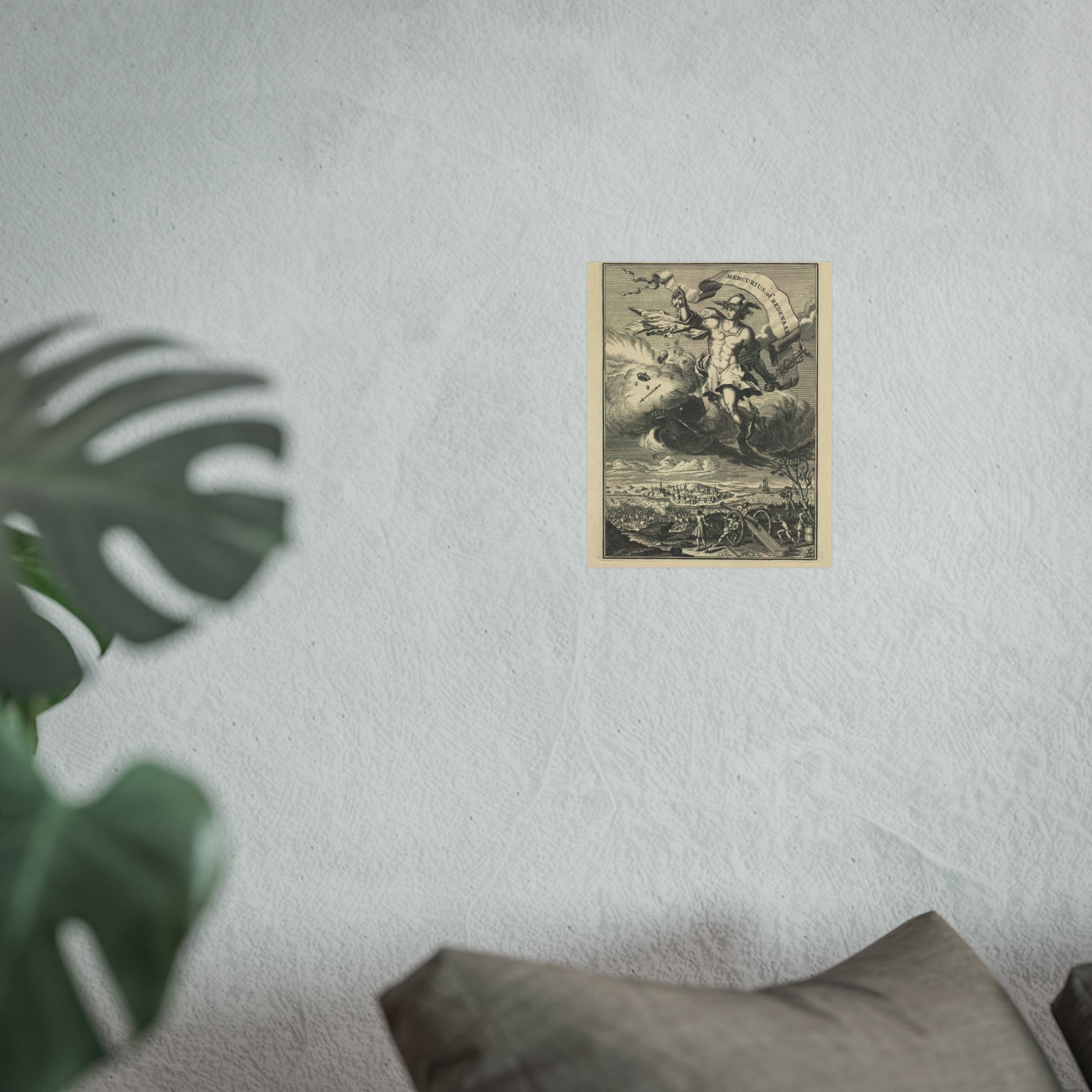This captivating piece showcases Mercury, the messenger of the gods, suspended in mid-air, scattering a torn bundle of money over the battlefield beneath him. In the background, a fortified city and the sea add depth and context to this dramatic scene.