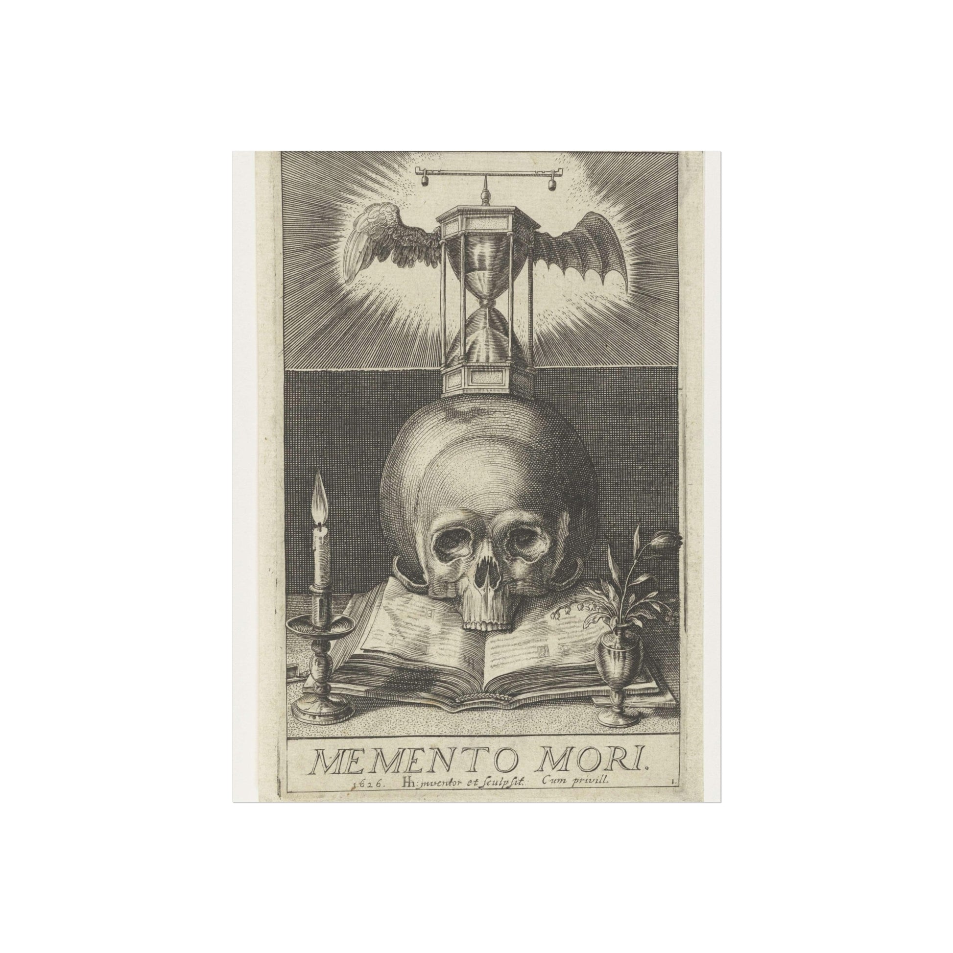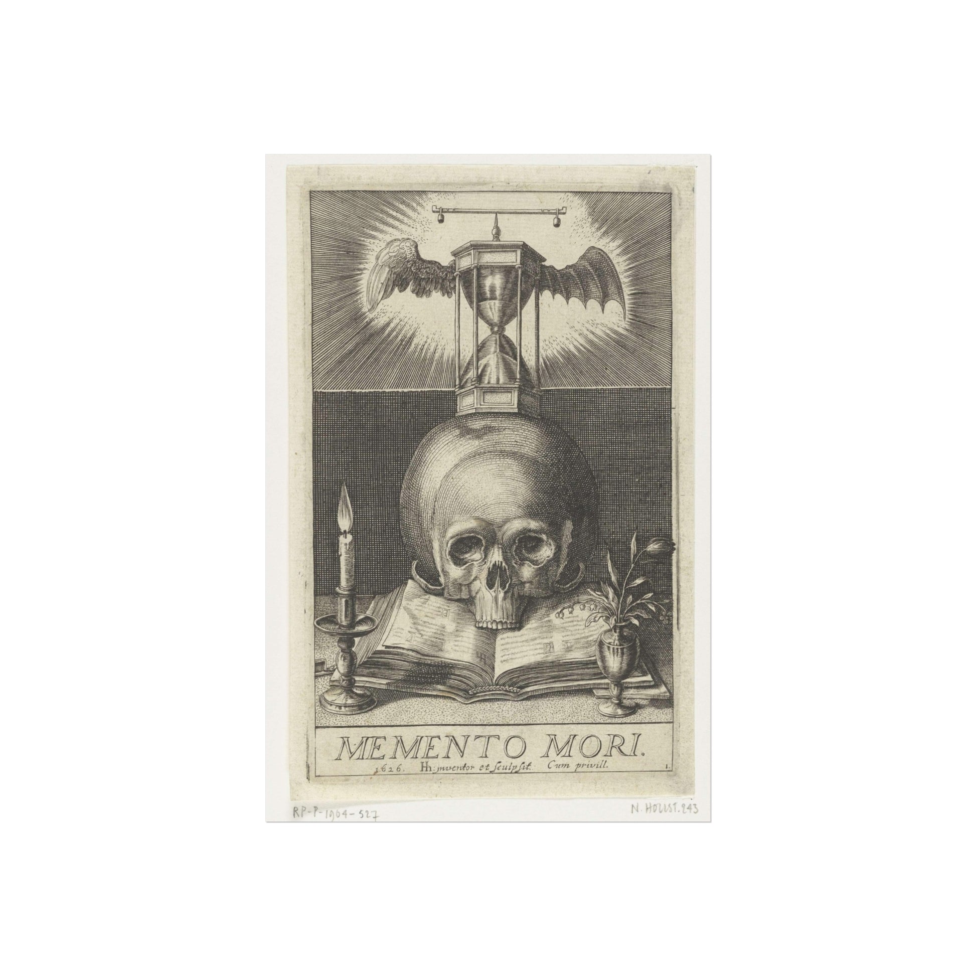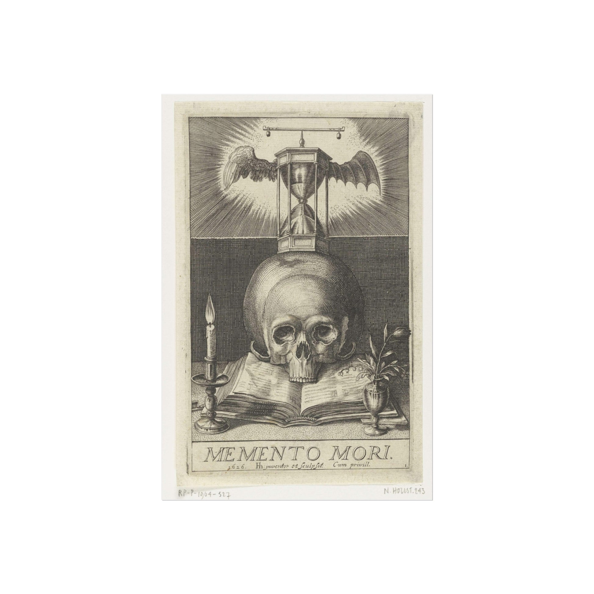 The artwork presents a captivating scene of a skull resting on an open book, nestled between a flower in a vase and a flickering candle. A winged hourglass with balance adorns the skull, adding an element of mystery. This is the first print from a series of 23 featuring animal skeletons, fifteen of which were crafted by Hendrick Hondius I, with the remaining pieces created by Andries Jacobsz. Stock and Simon Frisius.