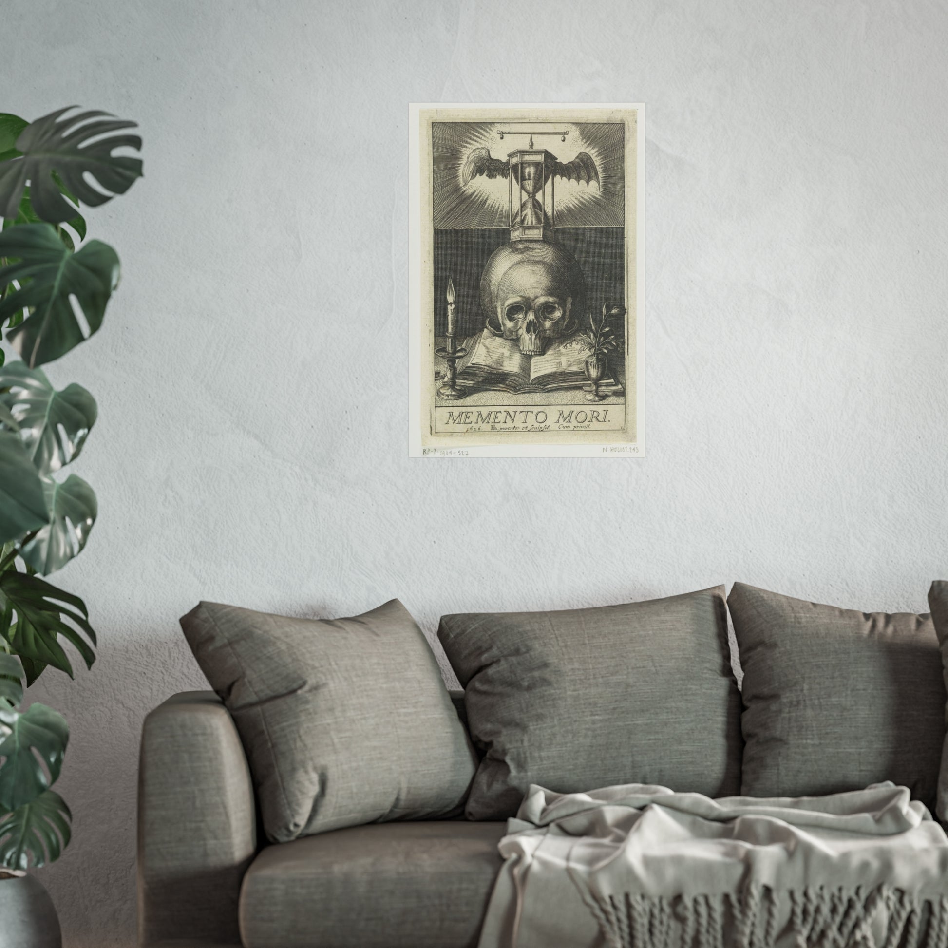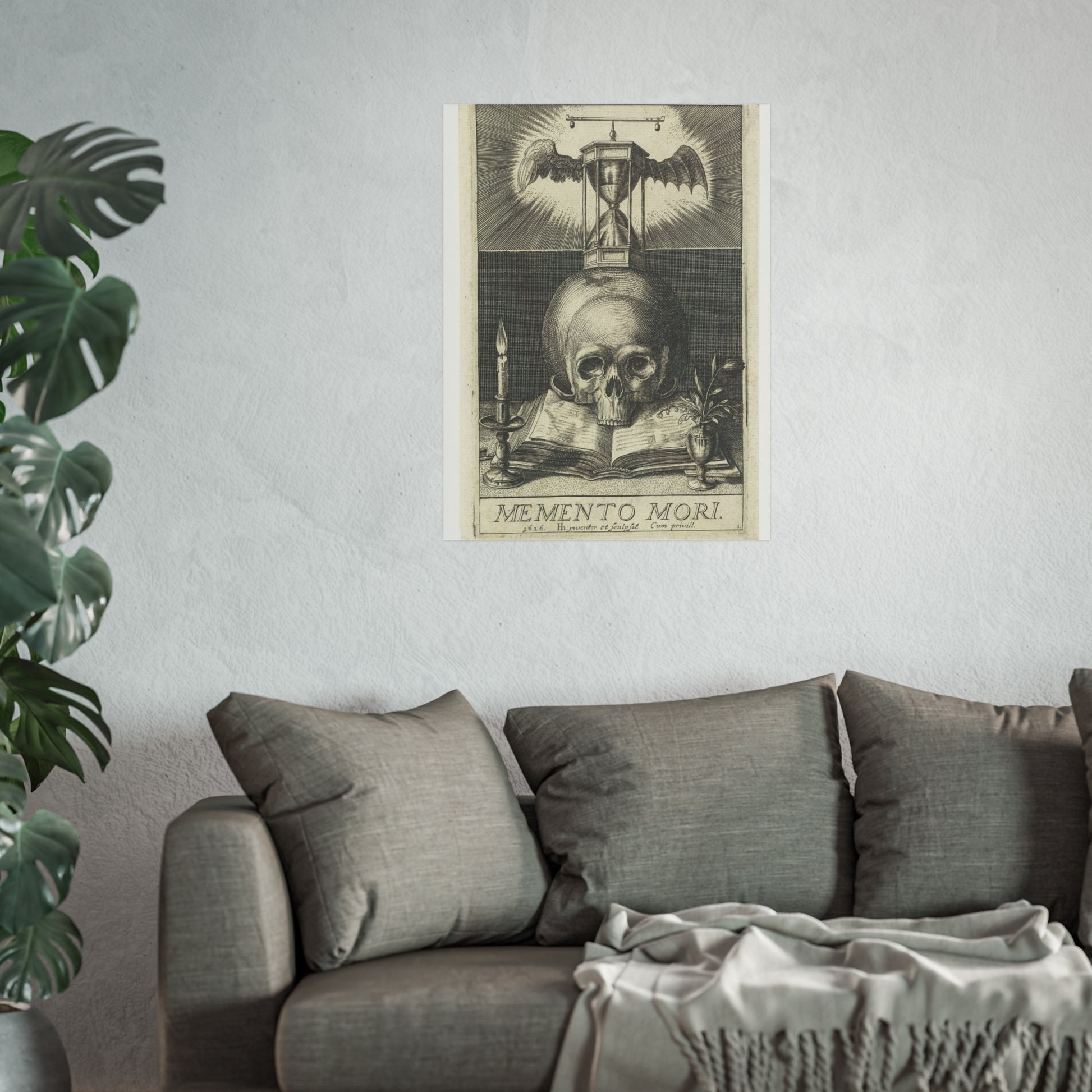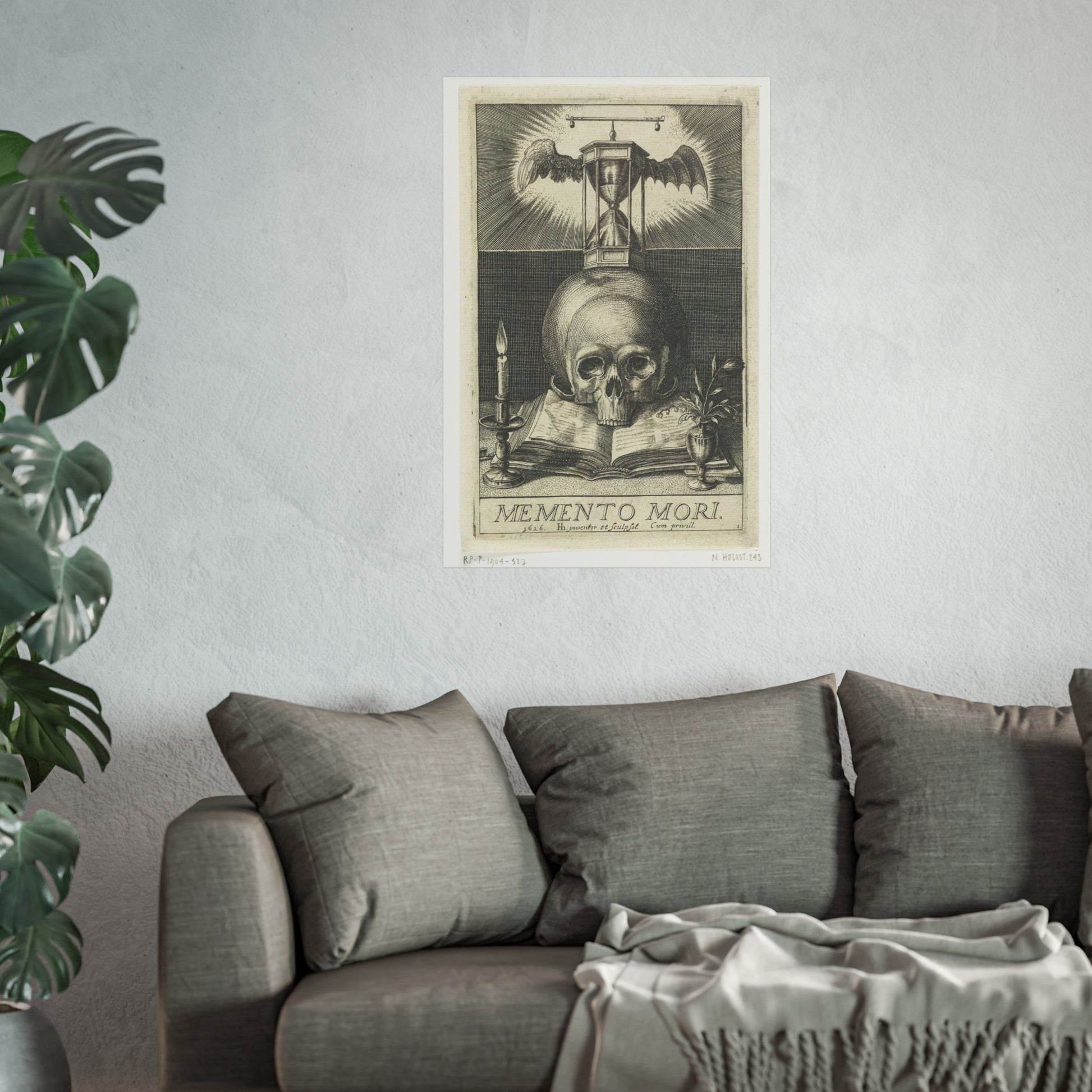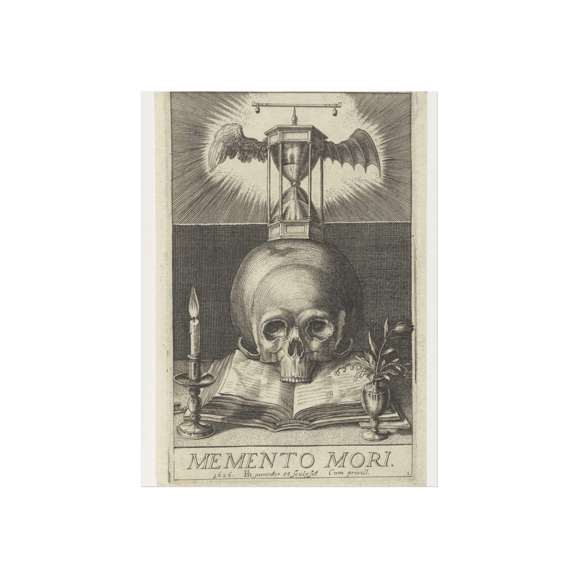 The artwork presents a captivating scene of a skull resting on an open book, nestled between a flower in a vase and a flickering candle. A winged hourglass with balance adorns the skull, adding an element of mystery. This is the first print from a series of 23 featuring animal skeletons, fifteen of which were crafted by Hendrick Hondius I, with the remaining pieces created by Andries Jacobsz. Stock and Simon Frisius.