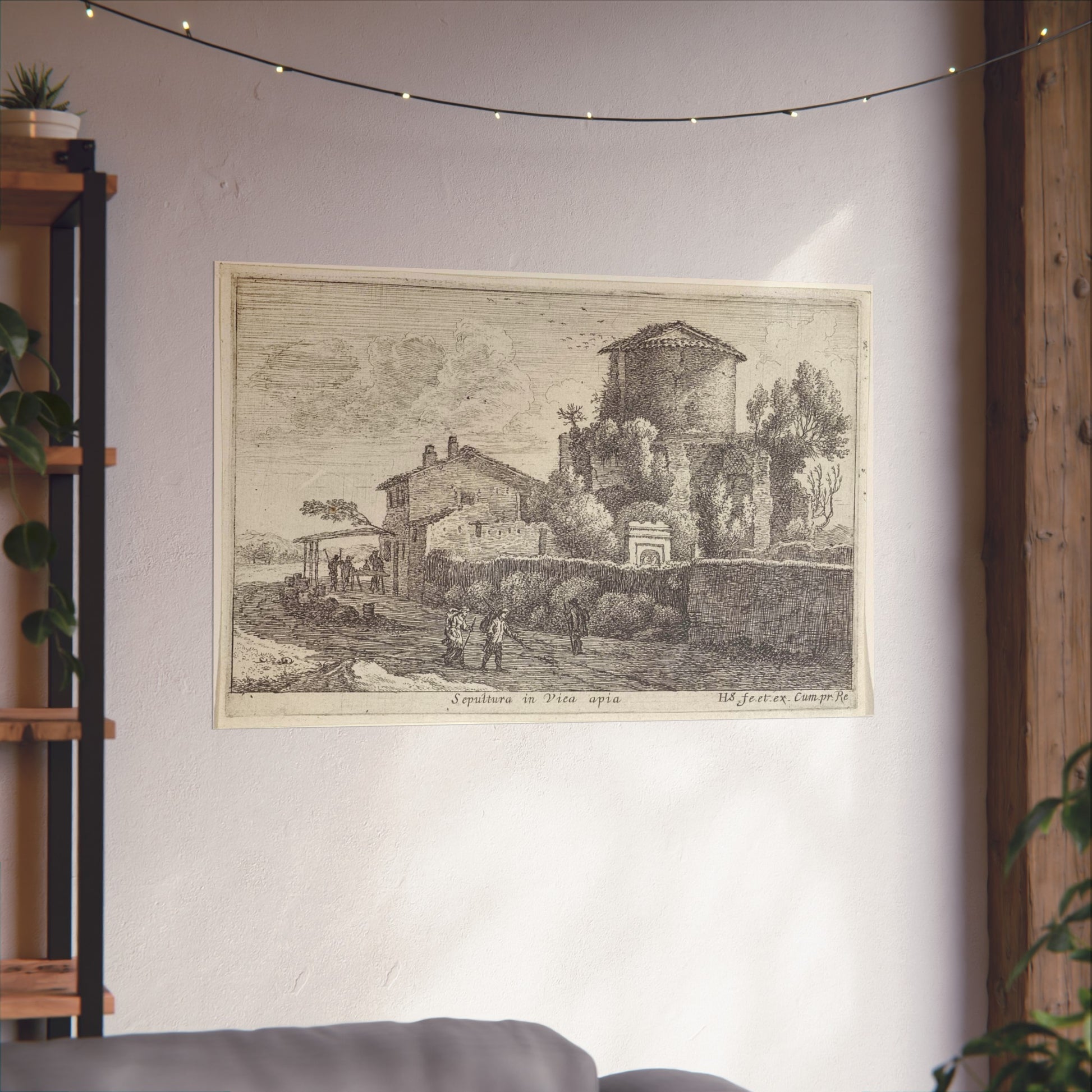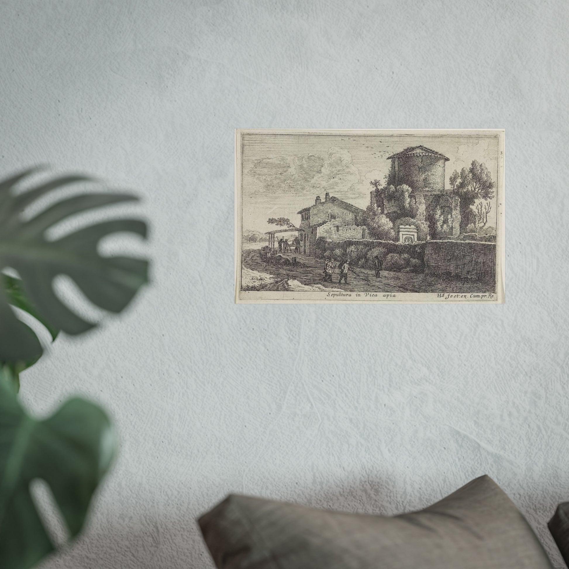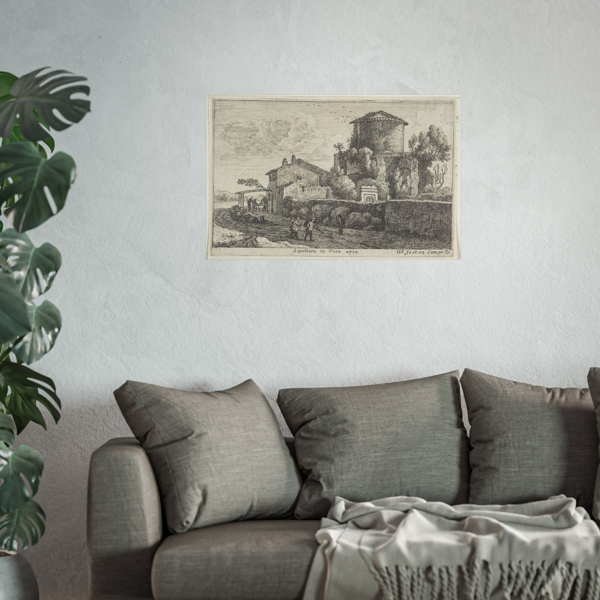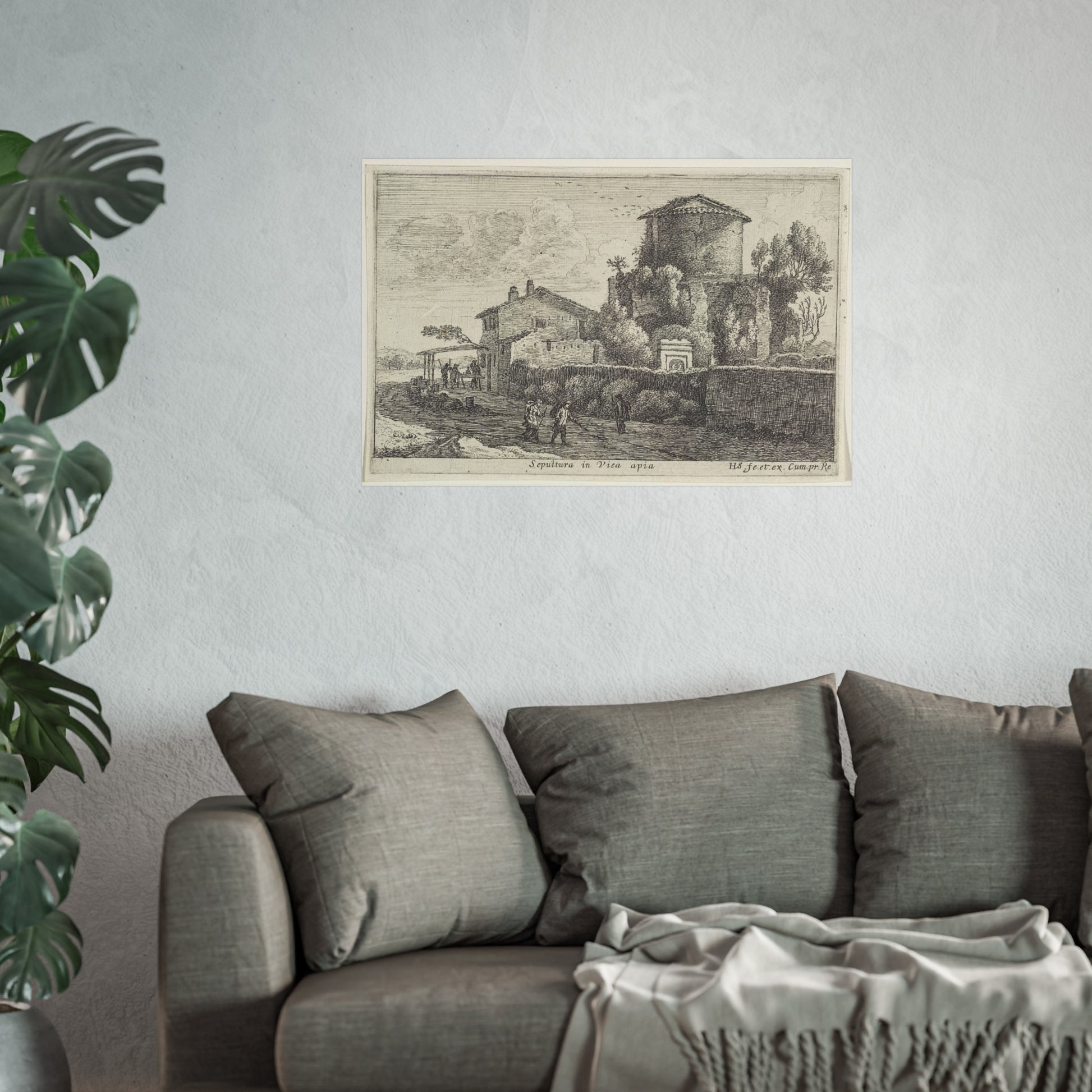 Several figures stand before a house adjacent to a tomb, while three travelers stroll down the Via Appia, passing by the walled cemetery. The scene is tranquil yet full of life, capturing the essence of everyday existence in the vicinity of this ancient Roman road.
