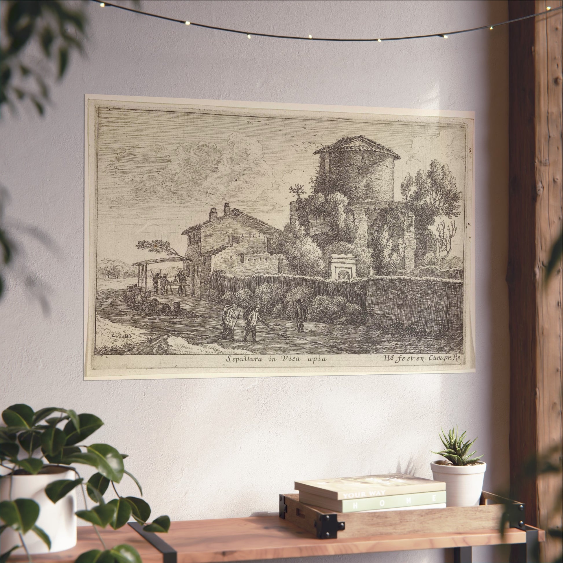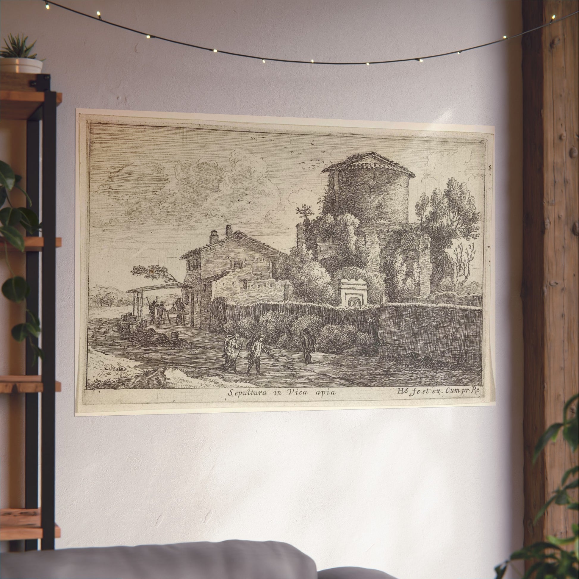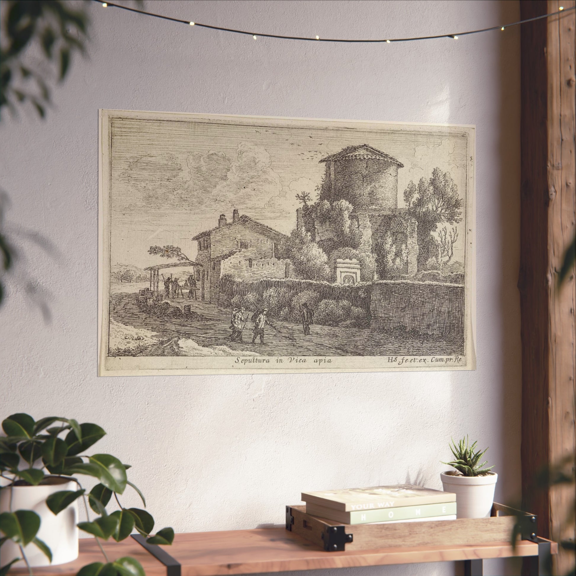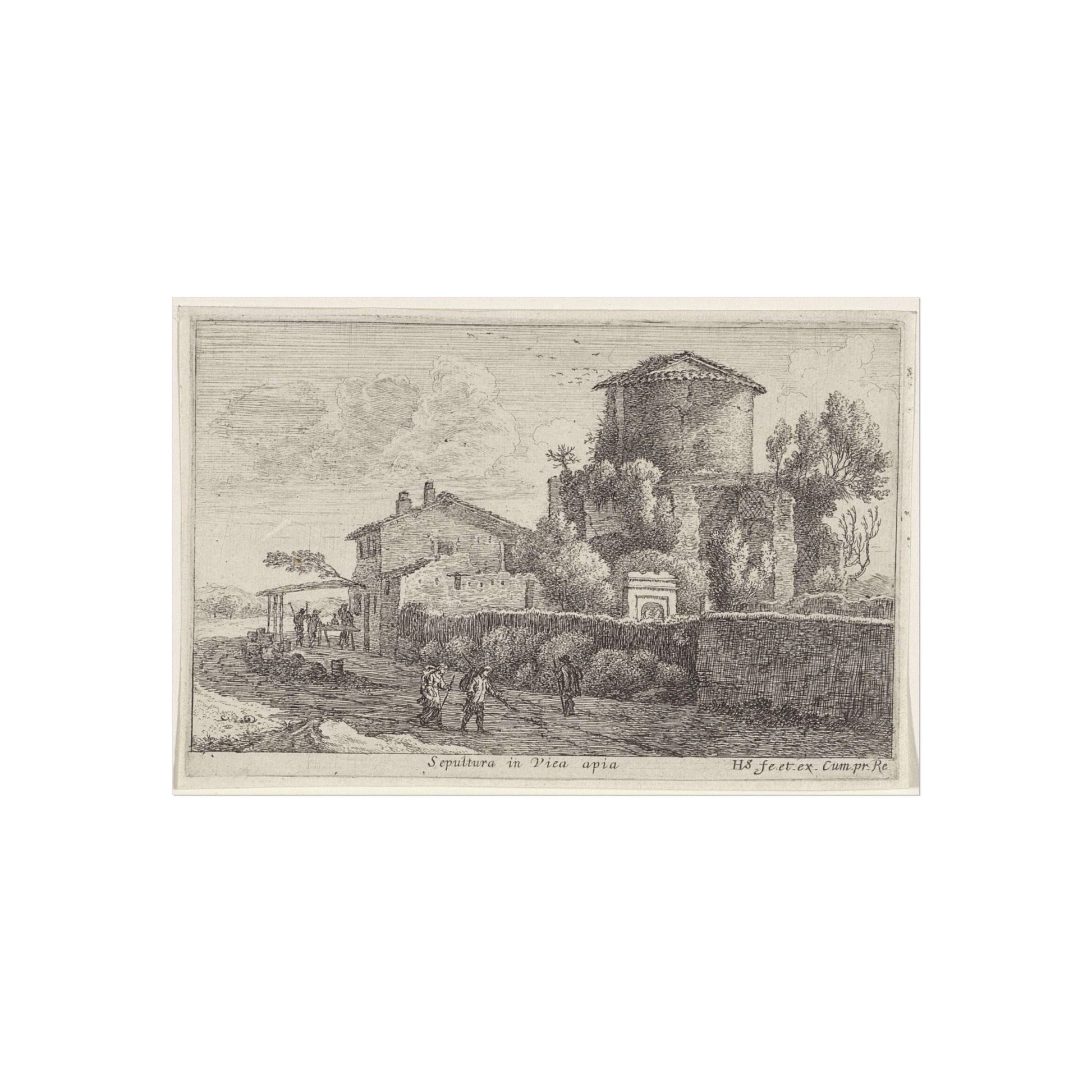 Several figures stand before a house adjacent to a tomb, while three travelers stroll down the Via Appia, passing by the walled cemetery. The scene is tranquil yet full of life, capturing the essence of everyday existence in the vicinity of this ancient Roman road.