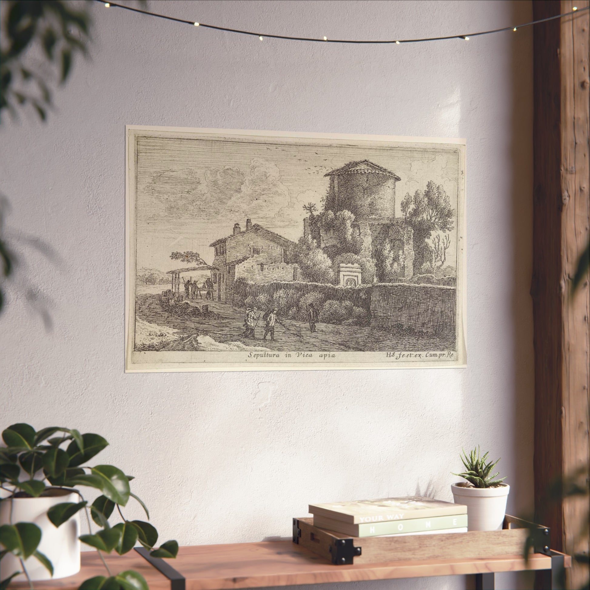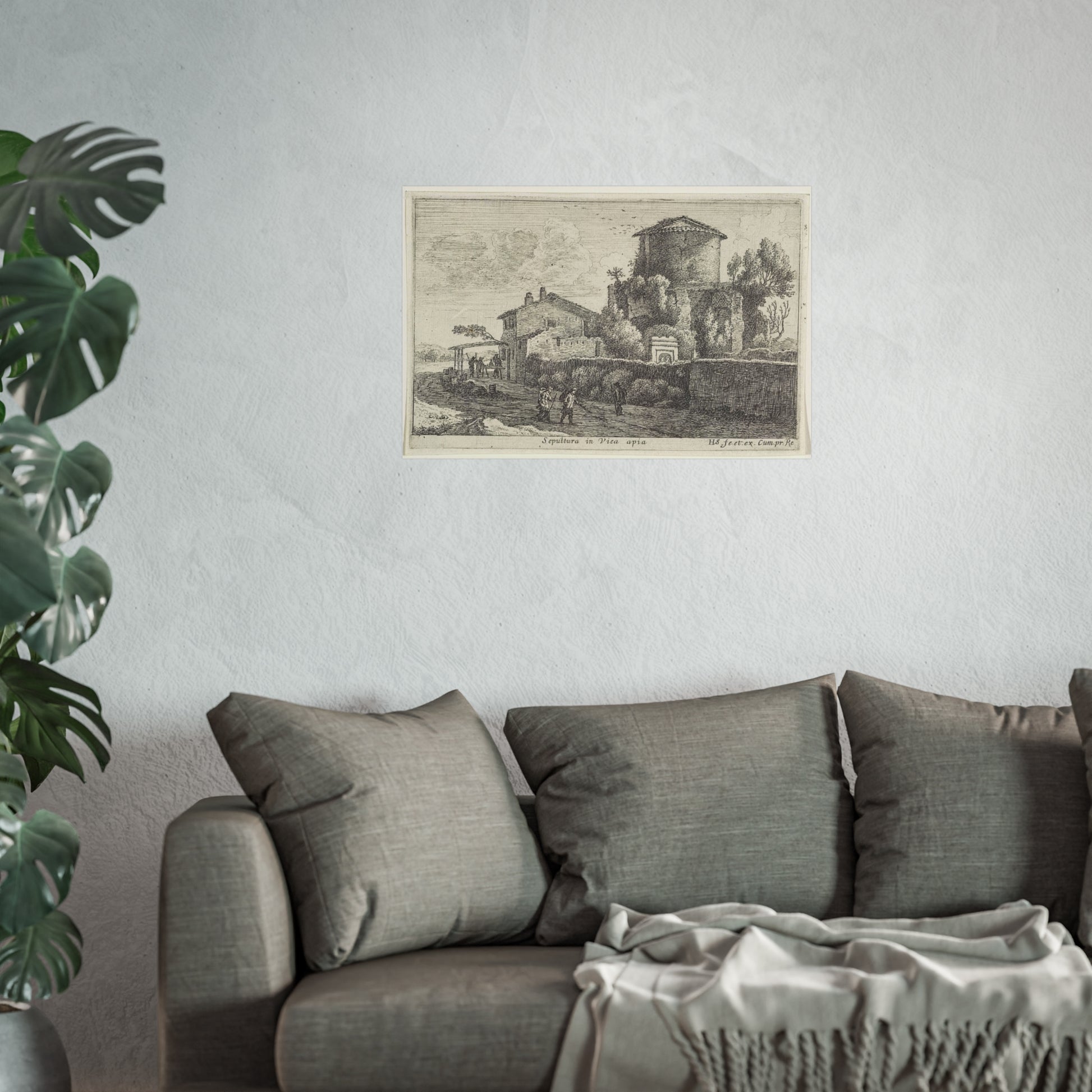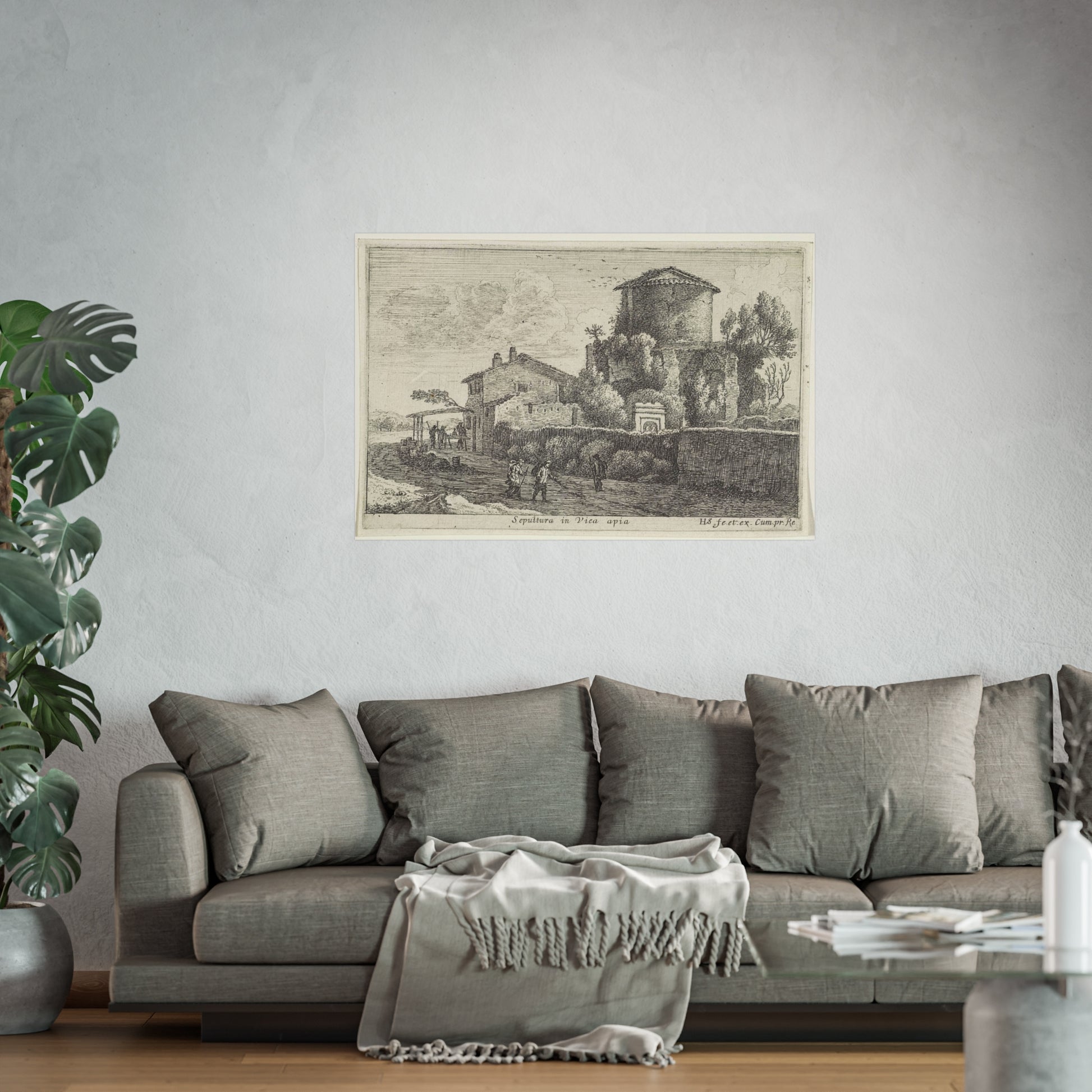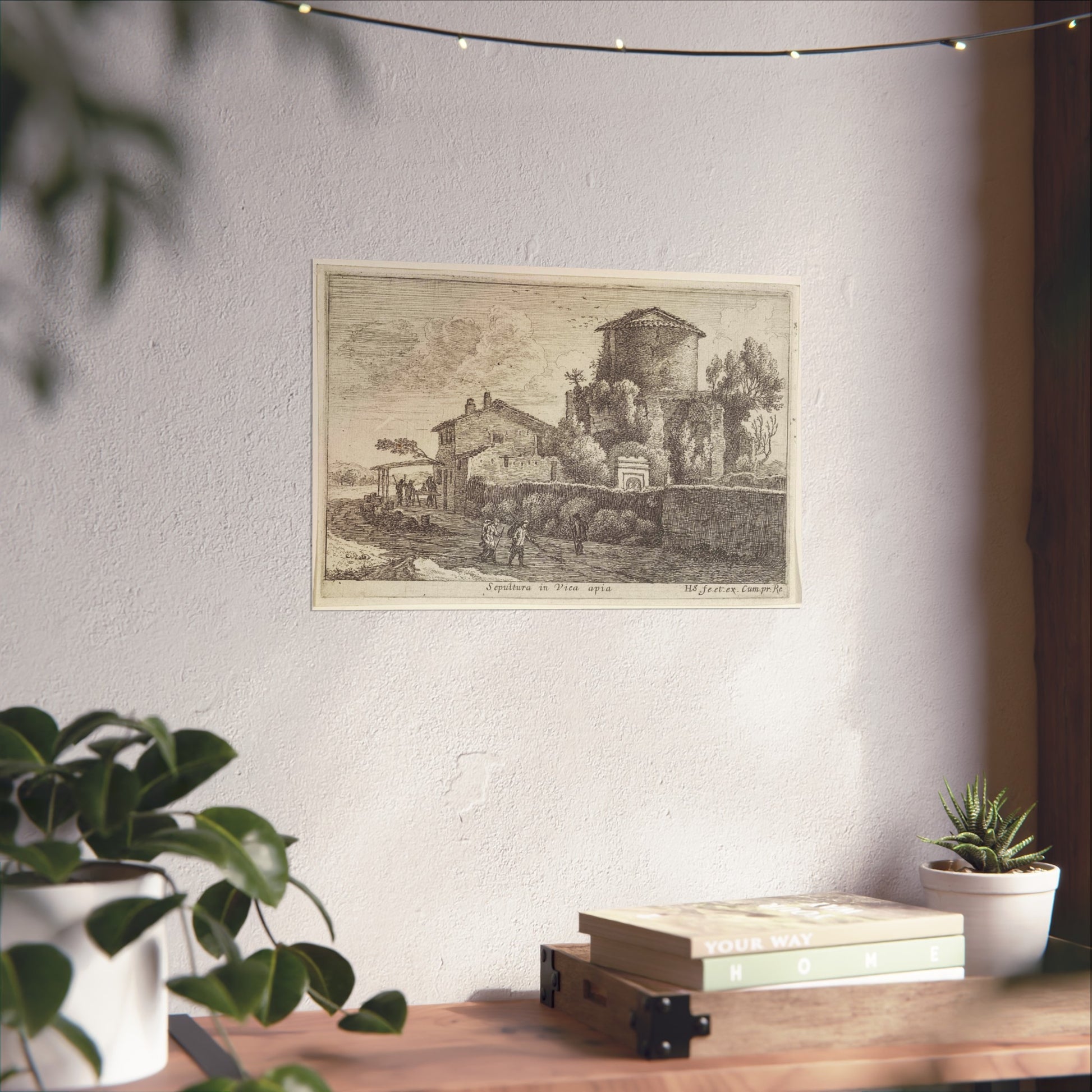 Several figures stand before a house adjacent to a tomb, while three travelers stroll down the Via Appia, passing by the walled cemetery. The scene is tranquil yet full of life, capturing the essence of everyday existence in the vicinity of this ancient Roman road.