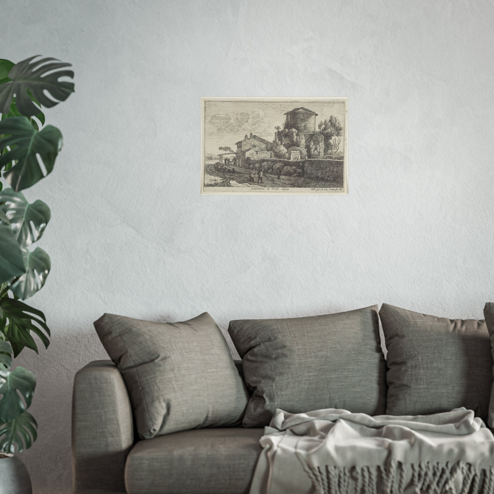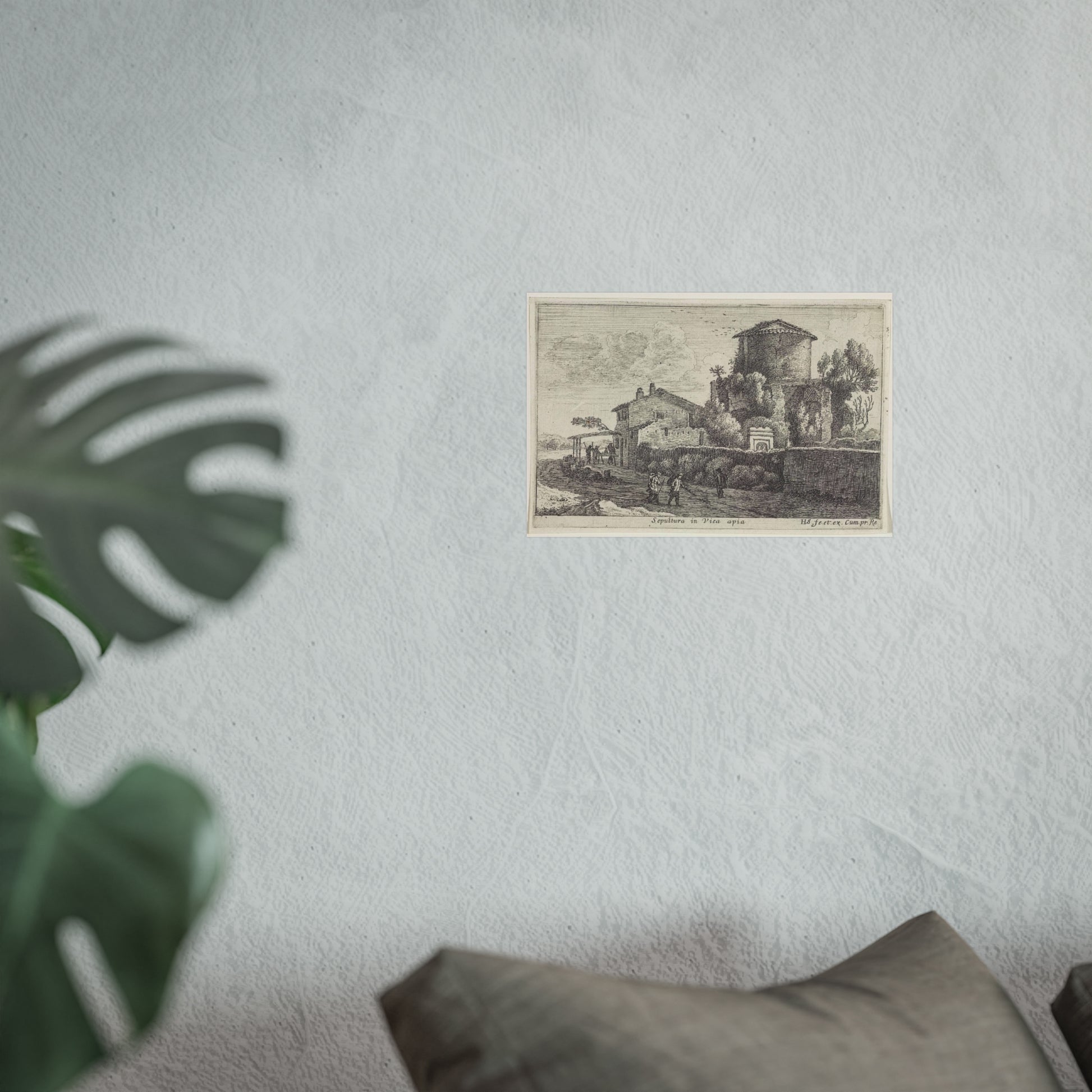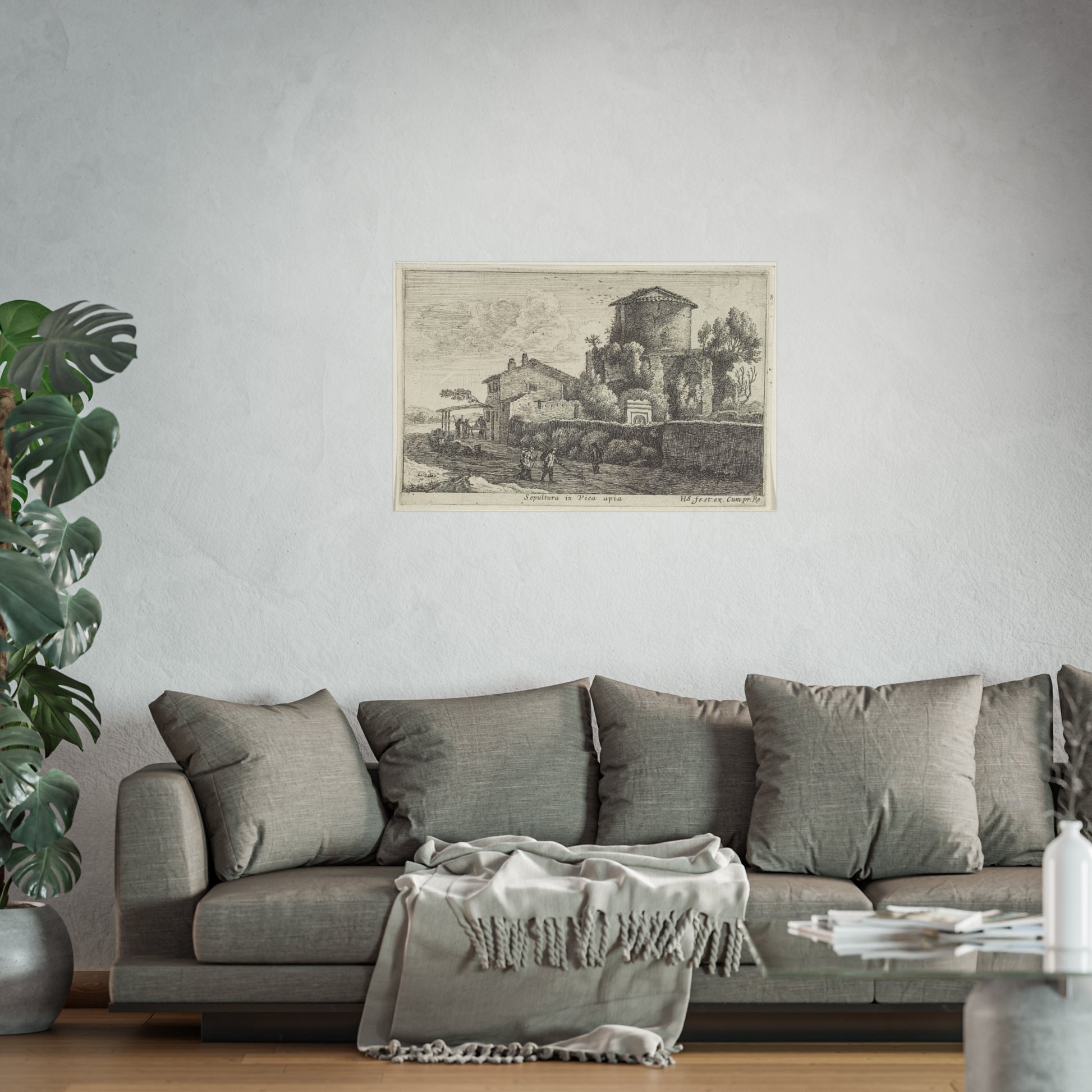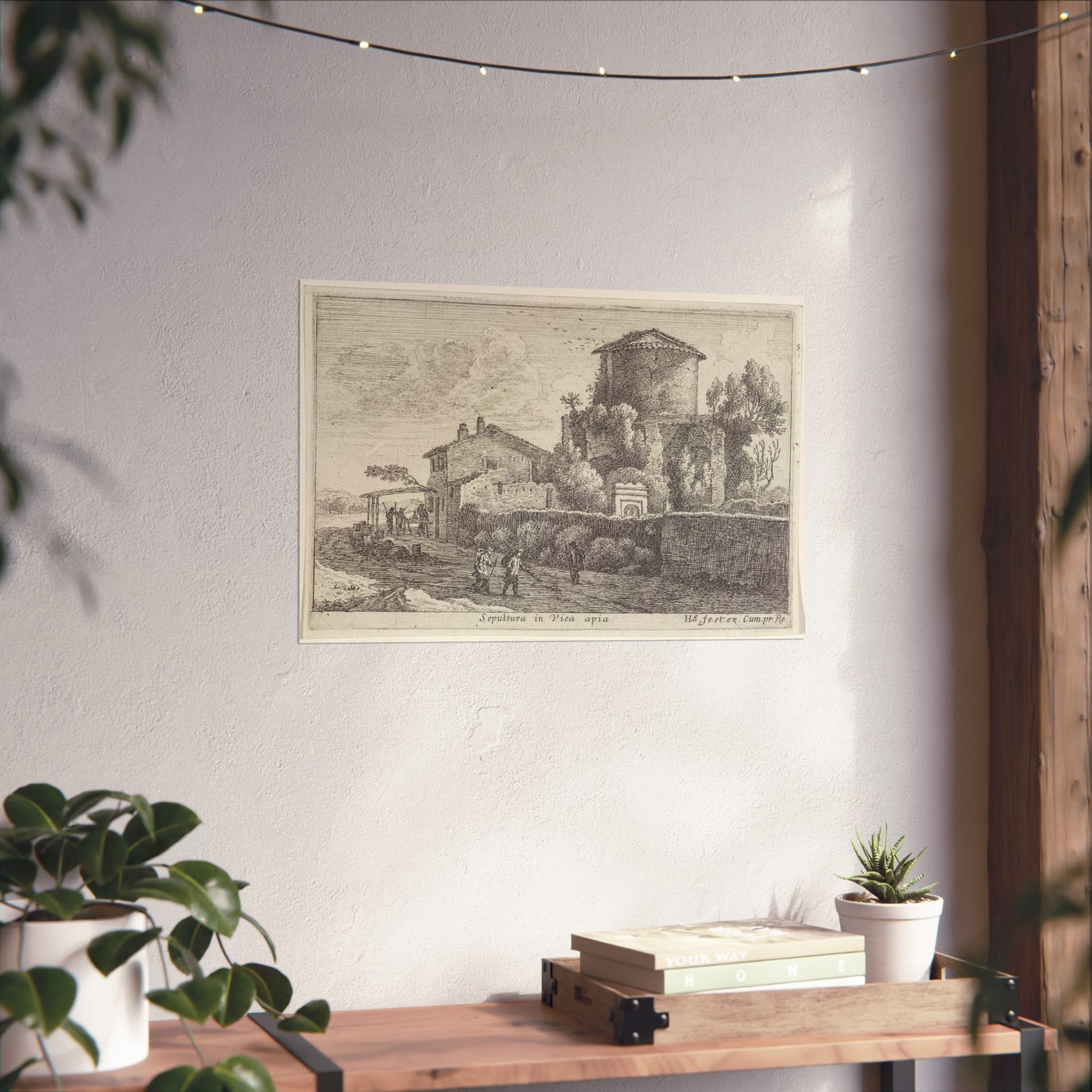 Several figures stand before a house adjacent to a tomb, while three travelers stroll down the Via Appia, passing by the walled cemetery. The scene is tranquil yet full of life, capturing the essence of everyday existence in the vicinity of this ancient Roman road.